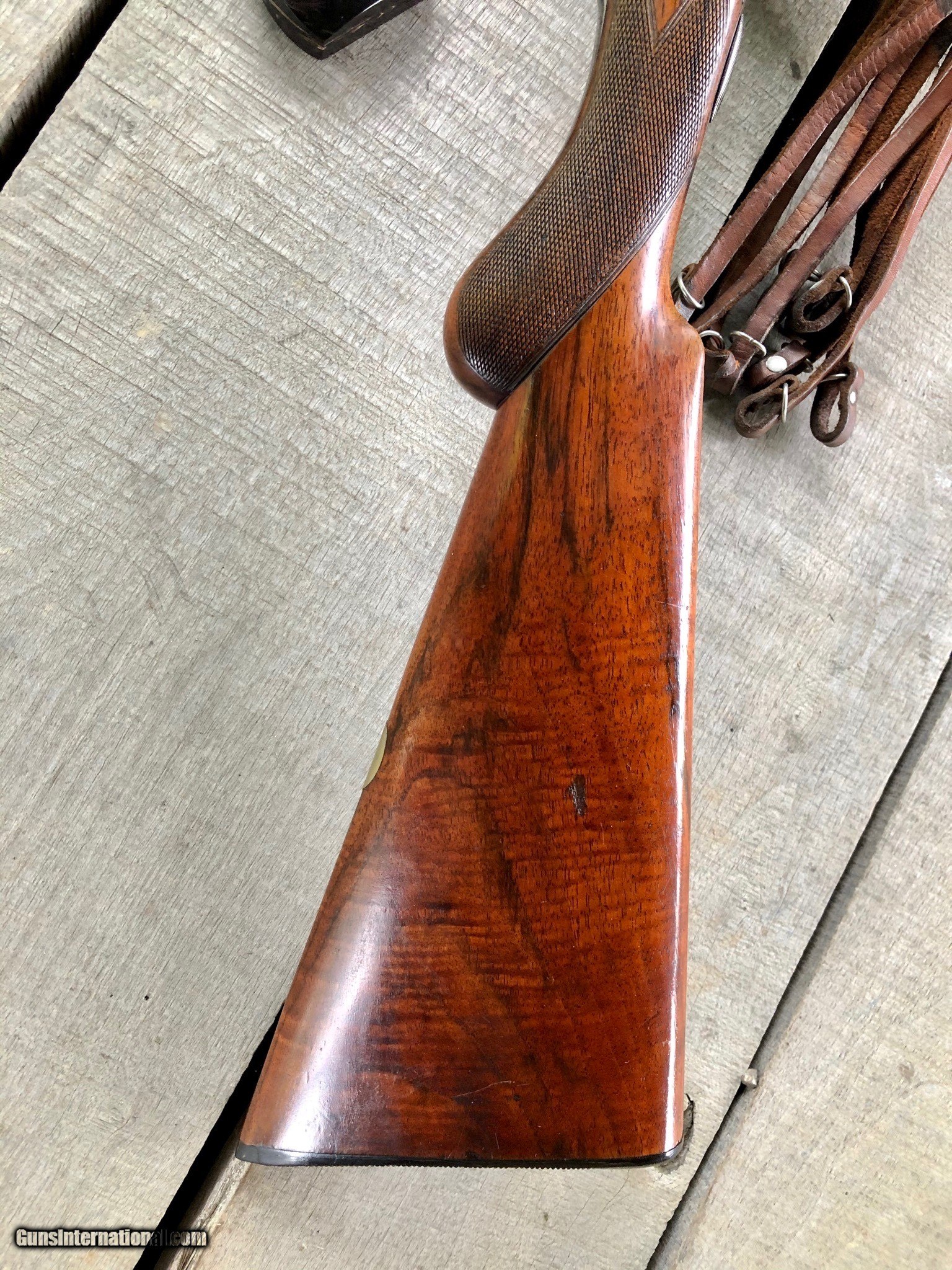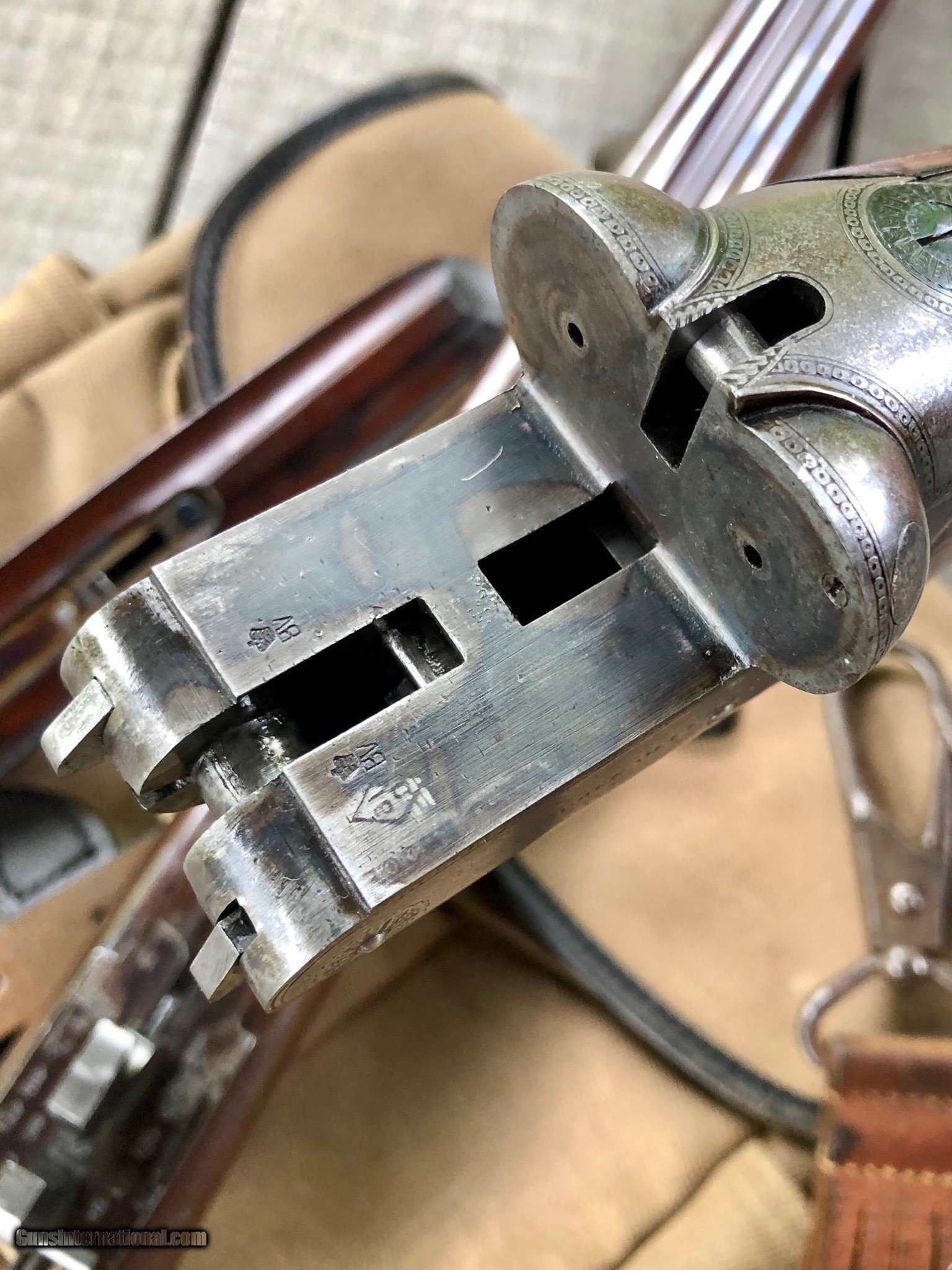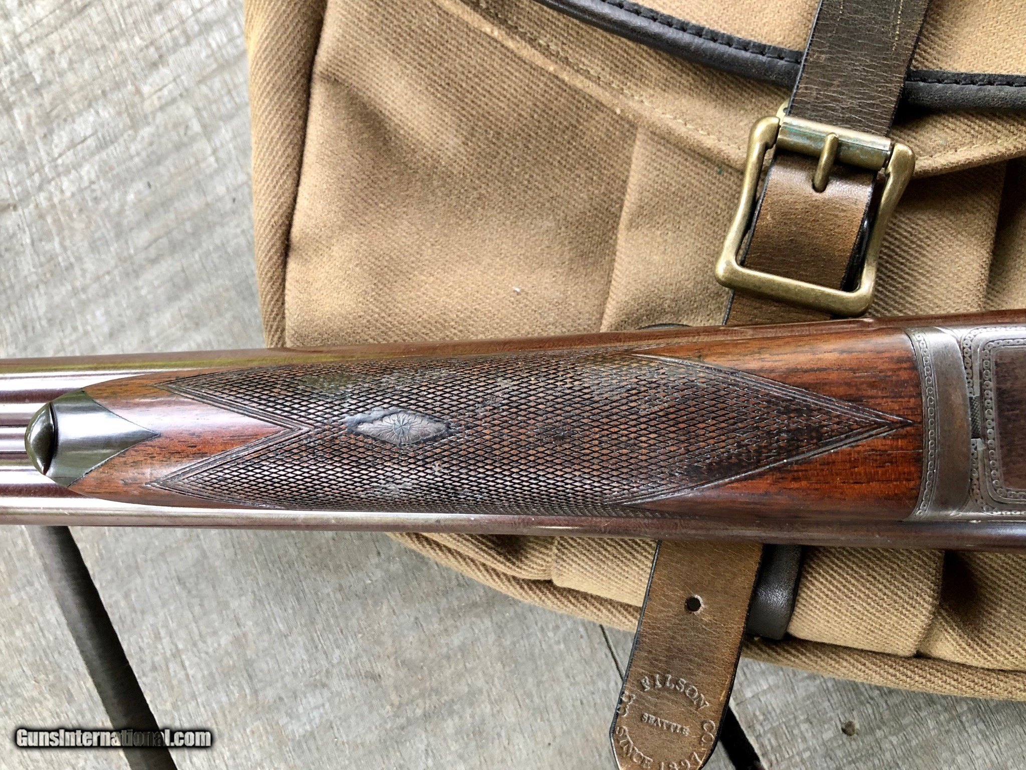 Description: A very good lightweight Lincoln Jeffries Jnr boxlock double 16 bore nitro proofed damascus sporting gun. I love the beauty of Damascus barrels but with the functionality of nitro proofing! This lovely little Anson & Deeley boxlock gun has a diminutive frame and wrist. It weighs just 5lbs 14ozs. The beautiful Damascus barrels are 30" long, have mint bores, cylinder on the right and the left choked light modified or, as the English put it, between 1/4 and 1/2, 2 1/2" chambers, and are nitro proofed. The barrels are fast to the gun with double lumps and grips and a rib extension cross-bolt similar to Greener's Wedge-fast. The configuration is thus similar to Greener's patented Treble Wedge-fast or Facile Princeps but it is an Anson & Deeley action with a cross-bolt. The gun has extractors but no ejectors. It is stocked in a Prince of Wales fashion in English walnut showing considerable curl at the butt and some interesting dark streak graining throughout, particularly through the left side of the wrist making one wonder if the wrist has been broken and repaired. It has not. The fine flat top checkering is in near excellent condition at the wrist but could stand to be freshened on the forearm. The stock has the usual bumps and bruises. The butt plate is horn. Lincoln Jeffries Jnr was in business at 120 Steelhouse Lane in Birmingham from 1917 to about 1939 making this a late Damascus barreled gun but again, it is nitro proofed. If your looking for a light and lively English side-by-side bird gun with beautiful Damascus barrels but nitro proofed to take to the field, this gun should be a contender. SOLD Curio/Relic: Yes Manufacturer: Lincoln Jeffries Jnr Model: double 16 bore sporting Serial Number: none Bore: 16 Chambers: 2 1/2” Ejectors: none Condition: very good Bore Condition: mint Barrels: Damascus Barrel Type: Damascus Action: Anson & Deeley Triggers: double Gauge Info: 16 Stock: English walnut Stock Drop: 1 3/4” Stock Heel: 2 9/16” Stock Cast: for right hand shooter Butt Pad: horn LOP: 14 1/4 Rib: game Weight: 5lbs 14 ozs Sights: brass bead Manufacture Date: 1917-1939 Choke Left: light modified or between 1/4 and 1/2 Choke Right: cylinder Extras: nitro proofed Damascus barrels Proof:Nitro: yes |