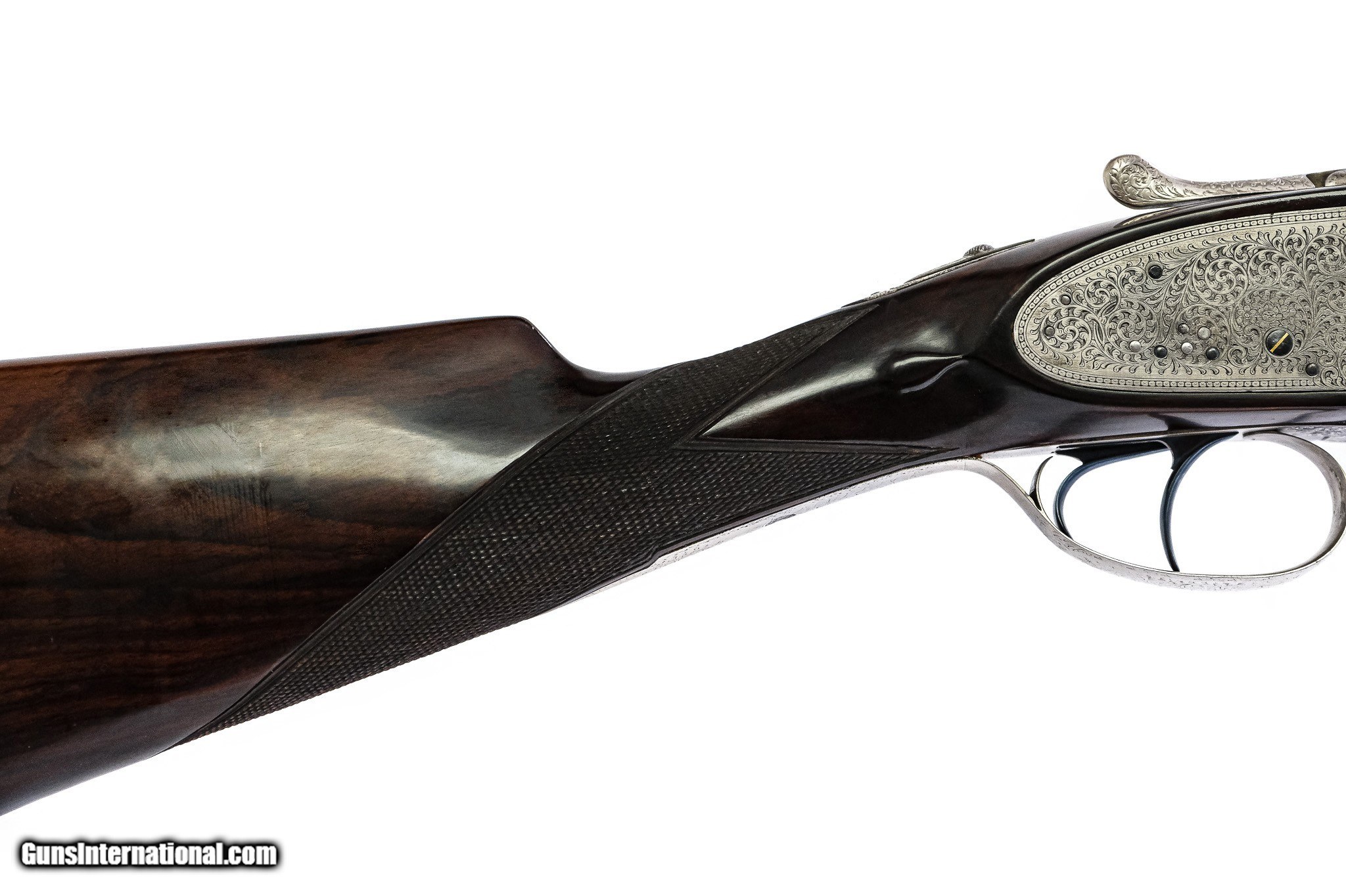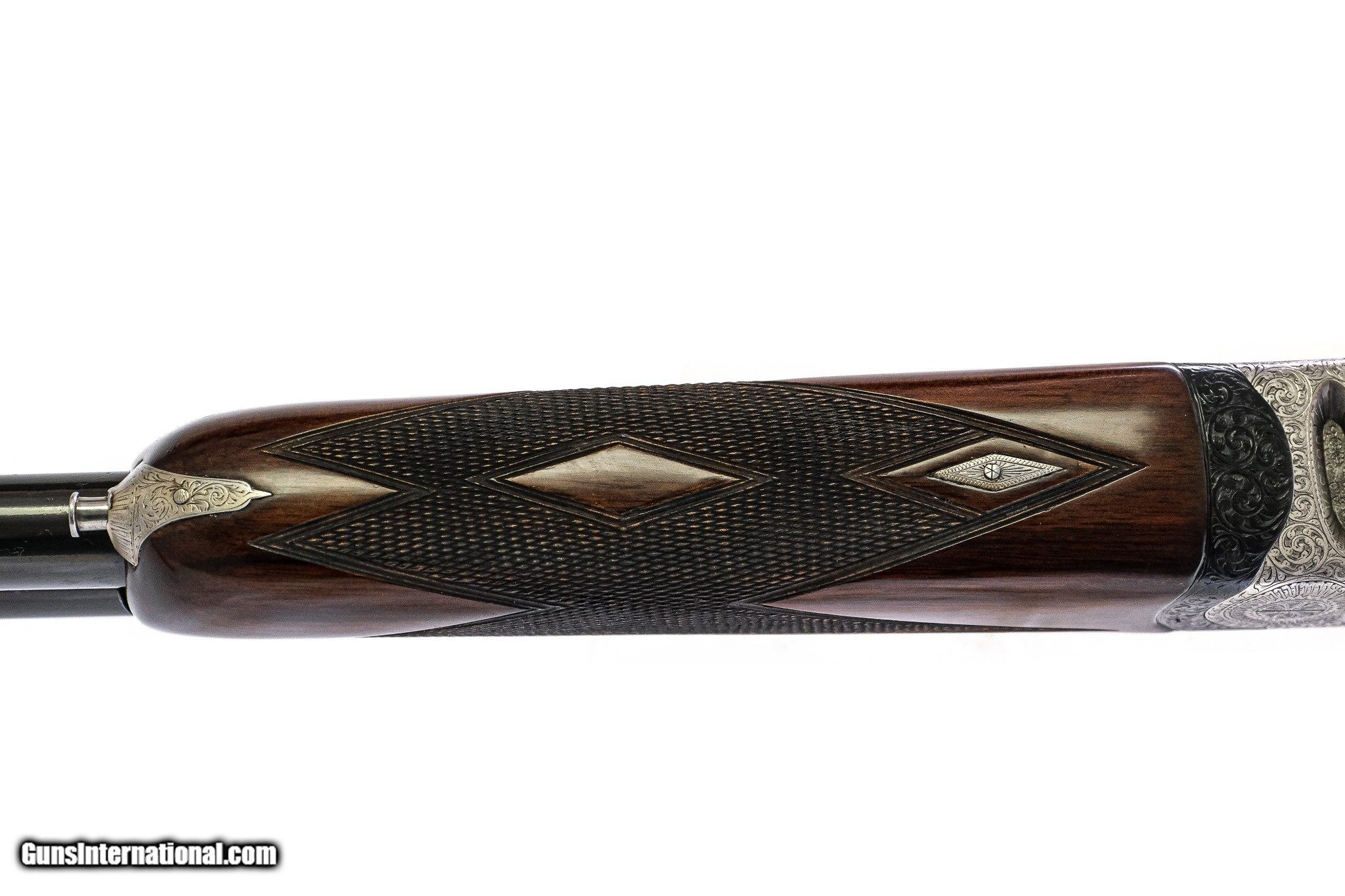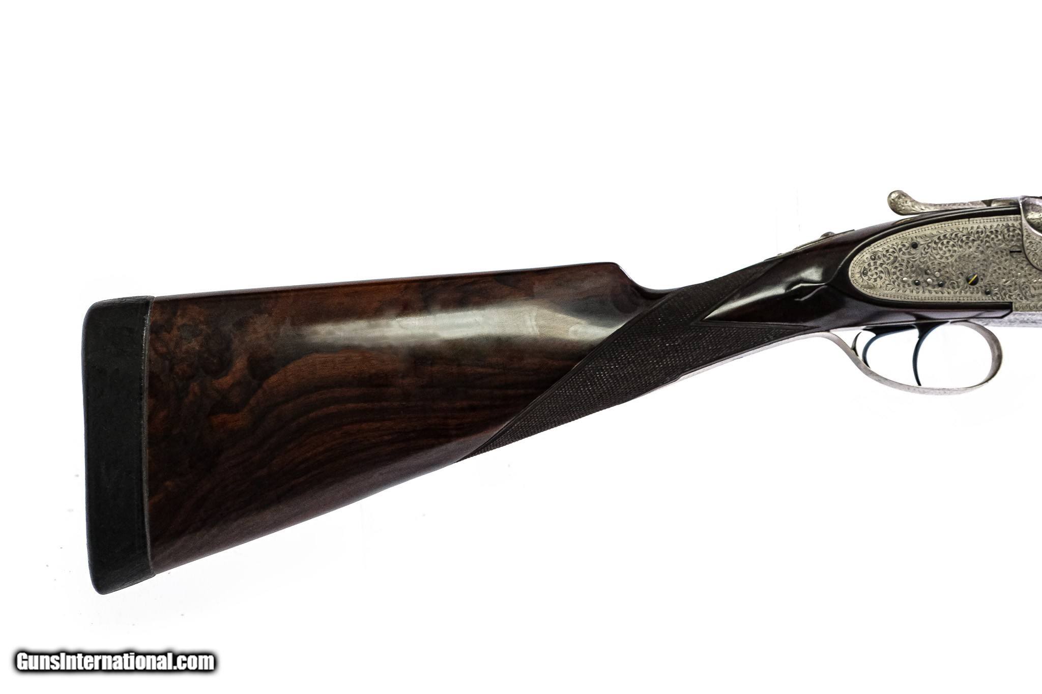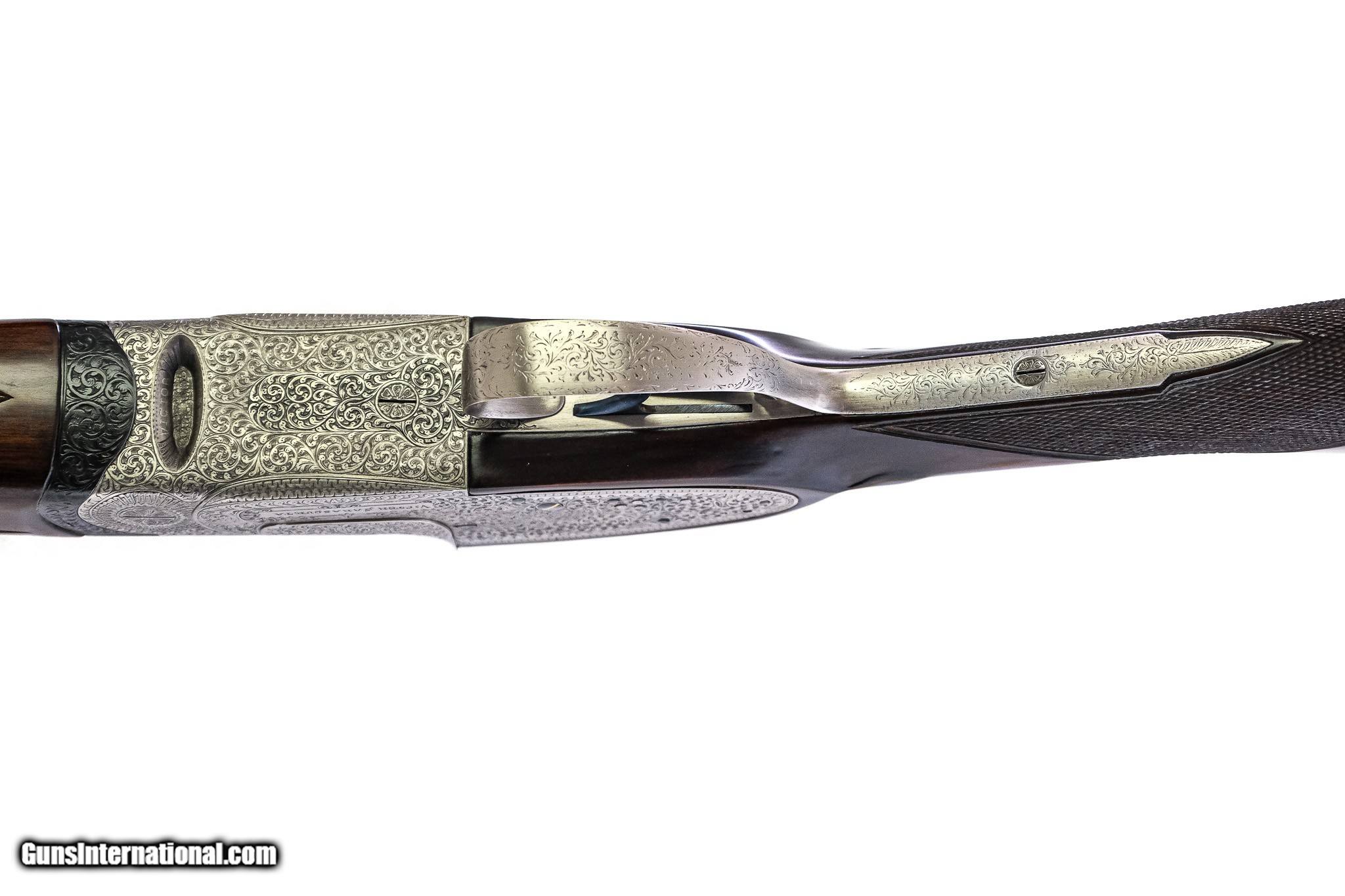 Description: Victor Sarasqueta - #14, O/U, 12ga. 28 ¾" Barrels Choked M/M. An exact copy of a Woodward shotgun made in England, 28 ¾" choked M/M solid rib, double trigger, hinged front, straight grip, silvers pad, drop point stock, Woodward type wings over the forend, perfect screws, leather covered pad, complete English style refinish, with most of the case color, with extreme high quality ornamental and bouquet engraved, automatic ejector, wonderfully straight Turkish walnut stock. This is an extremely full sidelock high grade/ high quality gun. Which are very seldom seen! Inv: 67840 7 lbs. 5 oz. 14 ¼” x 1 ½" x 2 ¼" $7,995.00 SOLD |