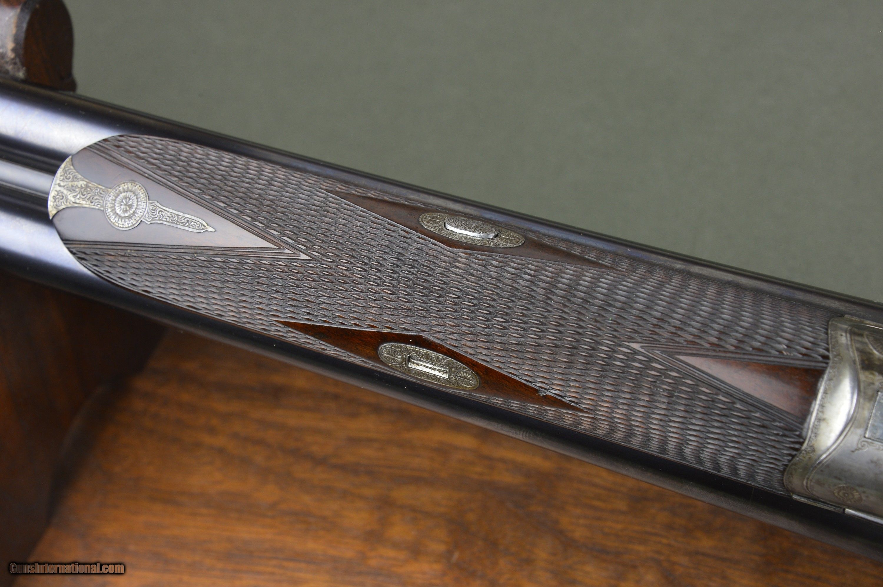 Description: Beautifully engraved W&C Scott hammer game gun with game scene engraving and lots of residual case coloring. This 12 bore Scott, no. 2040, was made in 1872 with non-rebounding hammers, extractors, and double triggers. It has been restocked in highly figured European walnut with a hand rubber oil finish. Cased in its period leather case with straps, turnscrews, cleaning rod and snap caps. Weighs 6lb 11 oz. *** The 28” sleeved nitro steel barrels are proofed for 2-3/4” shotshells. They are topped by a raised solid concave gamestyle rib. The rib is inscribed “W&C Scott & Son, Patentees. Dorset Place Pall Mall London”. The right barrel is bored 0.728 with a constriction of 0.005 for Skeet choke. Minimum wall thickness is a robust 0.034. The left barrel is also bored 0.728 and has a constriction of 0.010 for Improved Cylinder choke. Minimum wall thickness is 0.033. *** The straighthand stock and splinter forearm are made of a majestic piece of European walnut. Checkering has been refreshed and is crisp. A wedge fastener secures the forearm. Stock dimensions are 14-1/4” including a thin horn buttplate by 1-7/8” by 3”. Cast off for righthand shot. *** Please note that the photographs are part of the description. Not for sale where prohibited by state or local laws. Buyer is responsible for all shipping, insurance, and any other related charges. I give a 3-day non-firing inspection period which begins when it arrives at the buyer’s FFL or specified address if the gun is classified as an Antique. Returns at buyer’s expense. SOLD Antique: Yes |
