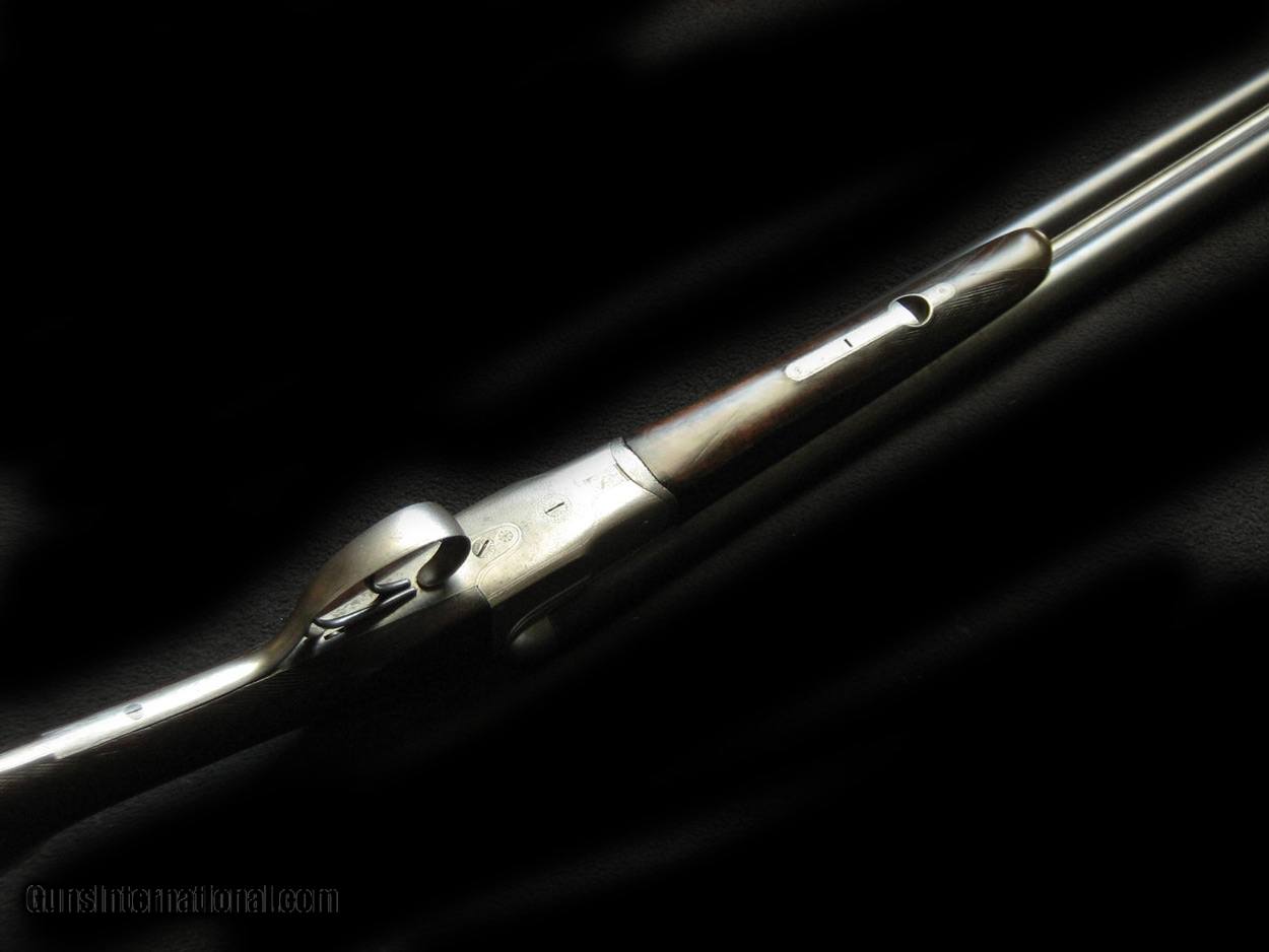 Description: The good news, this 6.5lb A&D steel-barreled gun is all original with a rare tang safety, surprisingly tight, and is no 2 of a pair (in gold inlay). Sound but worn wood, 14 3/4" thru original horn plate, 1 1/2 and 2 1/4" drops with moderate cast off. However, it's gray with extensive fine pitting on the external metal surfaces, and while the bores are shiny and in proof, R min 25 732/725 sk L 735/693 F min 30, there is deep scattered pitting toward the muzzles. Probably still safe to shoot , NP for 2 1/2" ctgs. 1 1/4 oz. A restoration candidate in my mind. SOLD |