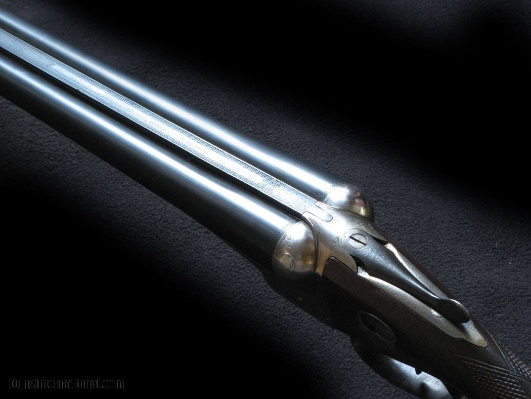 Description: This antique Facile Princeps gun has been given a new lease on life with English sleeved 28" x 2 3/4" steel meaty nitro proof barrels with excellent bores choked 715/705 IC and 715 685 F. Tight as rejointed. Forend is original, buttstock has been refinished and recheckered, has a scratch along the comb. Original buttplate, nice. Action has about 25% coverage English scroll. Floorplate has been reblacked, floorplate screw is a correctly fitted and engraved replacement. LOP 14", drops 1 7/8" and 2 3/4", 5/16" cast off. A nice 7lb English double that will shoot modern ammo all day long and serve another 100 years with continued care . SOLD |