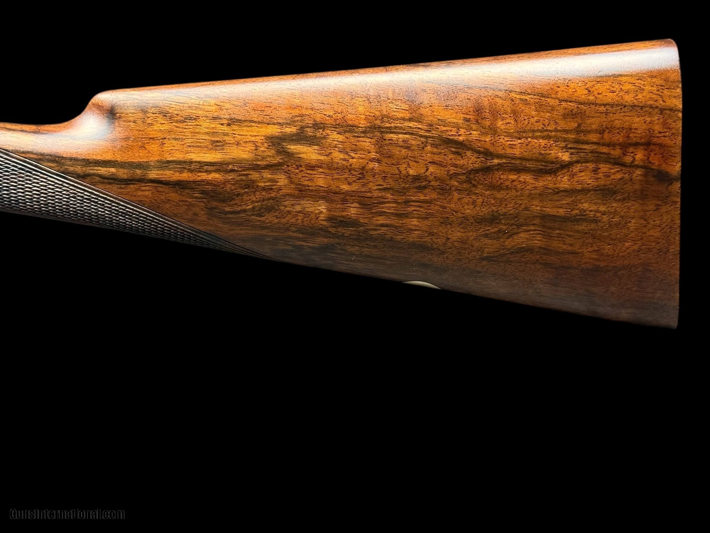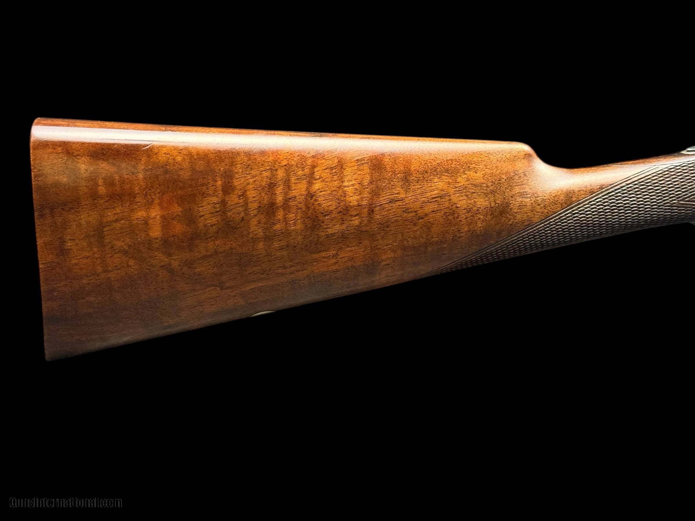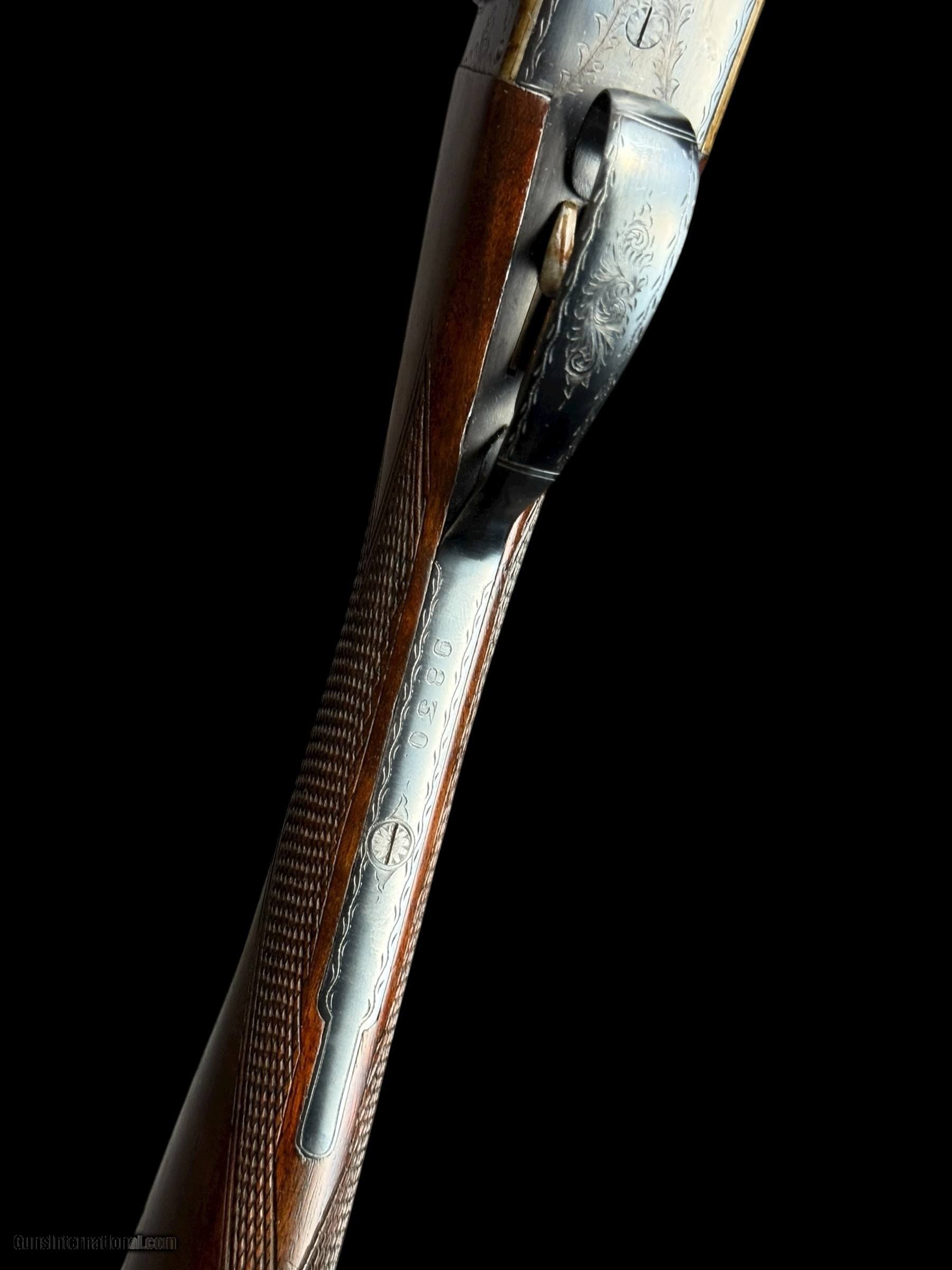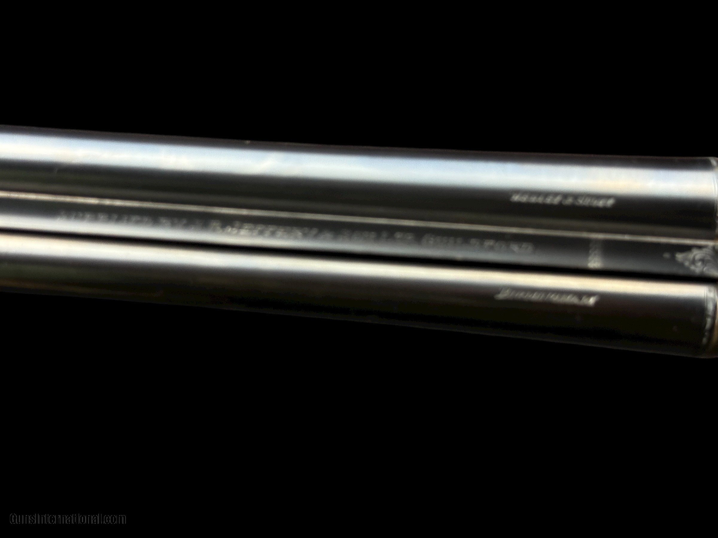 Description: WEBLEY & SCOTT - BIRMINGHAM, ENGLAND - MODEL 700 SXS GAME GUN - “SUPPLIED BY S.R. JEFFERY & SON LTD - GUILDFORD” 20GA - 2 3/4" PROOFS CASE COLOURED AND SCROLL ENGRAVED BOXLOCK ACTION - 26" BARRELS - CHOKES: .003 / .026 EJECTORS - DOUBLE TRIGGERS - AUTOMATIC SAFETY - WALNUT STRAIGHT GRIP STOCK AND SPLINTER FOREND - LINE CHECKERED BUTT - DIMS: LOP: 14 ¾" | DAC: 1 3/8" | DAH: 2 1/4" - WEIGHT: 5LBS 13 OZ NEW LEATHER AND CANVAS “TOE-UNDER” COMPACT CASE WITH MAKER'S LABEL - CONDITION: GUN IS IN EXCELLENT OVERALL ORIGINAL, POSSIBLY UNFIRED, CONDITION. 100% CASE COLORS REMAIN. ACTION TIGHT AND ON-FACE. BORES CLEAR. TRIGGERS CRISP. BLUING AND WOOD FINISH EXCELLENT AS PICTURED. ONE VERY SMALL BLEMISH ON FLOORPLATE AS PICTURED, OTHERWISE PERFECT. CASE AS NEW. GENTLEMEN, THIS IS A FINE AND CLASSIC ENGLISH GAME GUN. PERFECT FOR YOUR NEXT TRIP AFIELD. GREAT DIMENSIONS AND CONDITION. NICELY PRESENTED IN A NEW ENGLISH STYLE CASE. YOU WILL LIKE THIS GUN! FFL REQUIRED FLAT $100 S/H/I CARD FEE APPLIES Shotgun Gauge: 20 Gauge Manufacturer: WEBLEY & SCOTT Model: 700 Serial Number: 143163 Barrel Length: 26 Chambers: 2.75 OR 70MM Ejectors: YES Condition: MINT Metal Condition: MINT Wood Condition: MINT Bore Condition: MINT Action: BOXLOCK EJECTOR Triggers: DOUBLE Price: $4,850.00 Contact Seller |