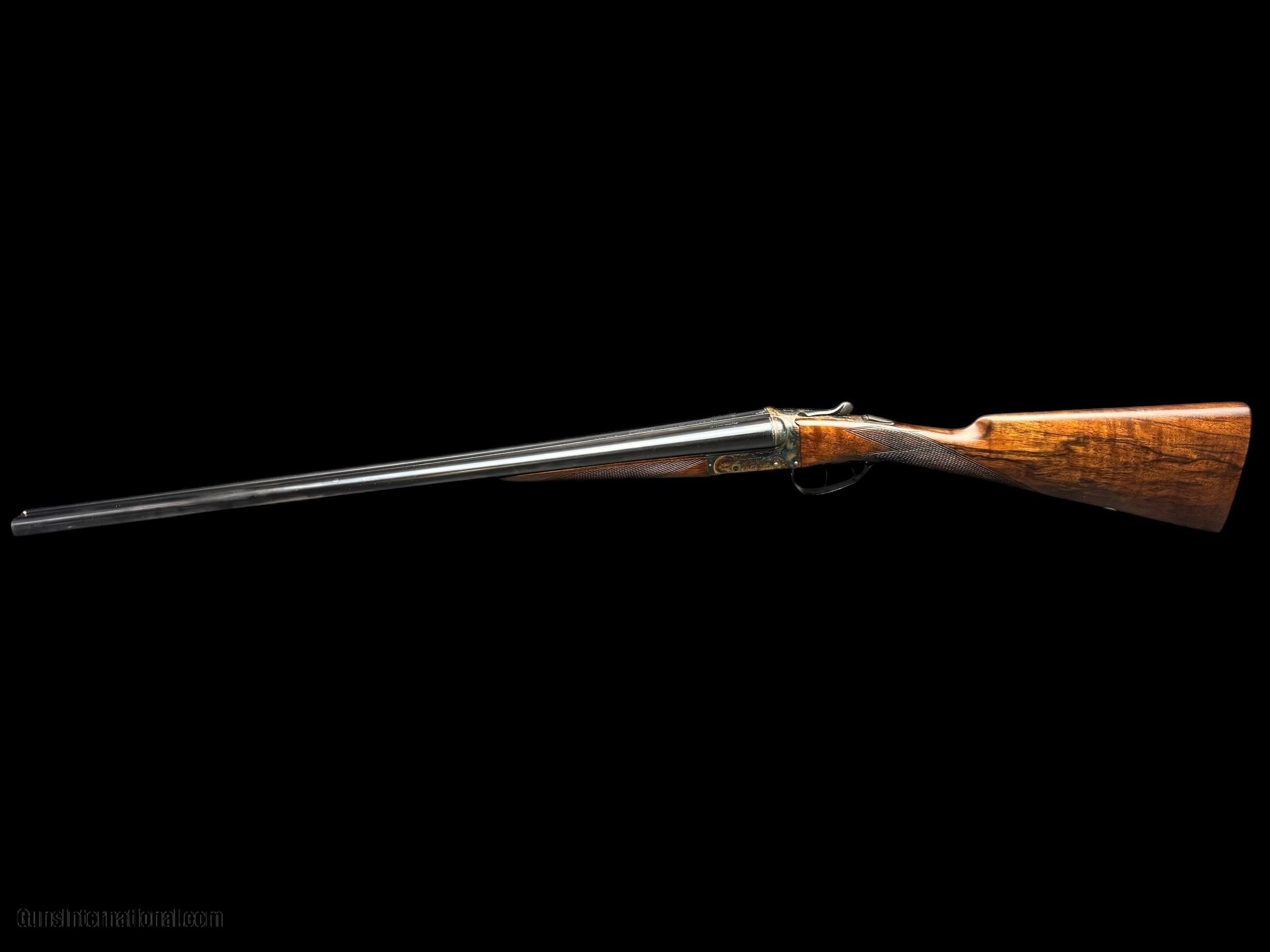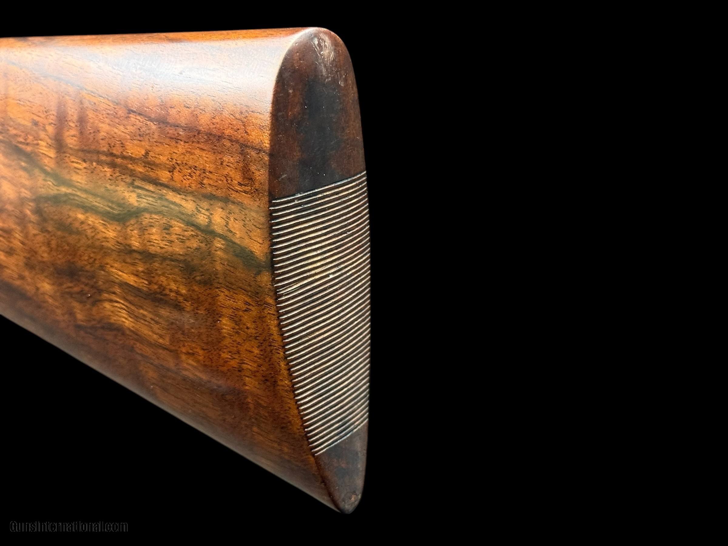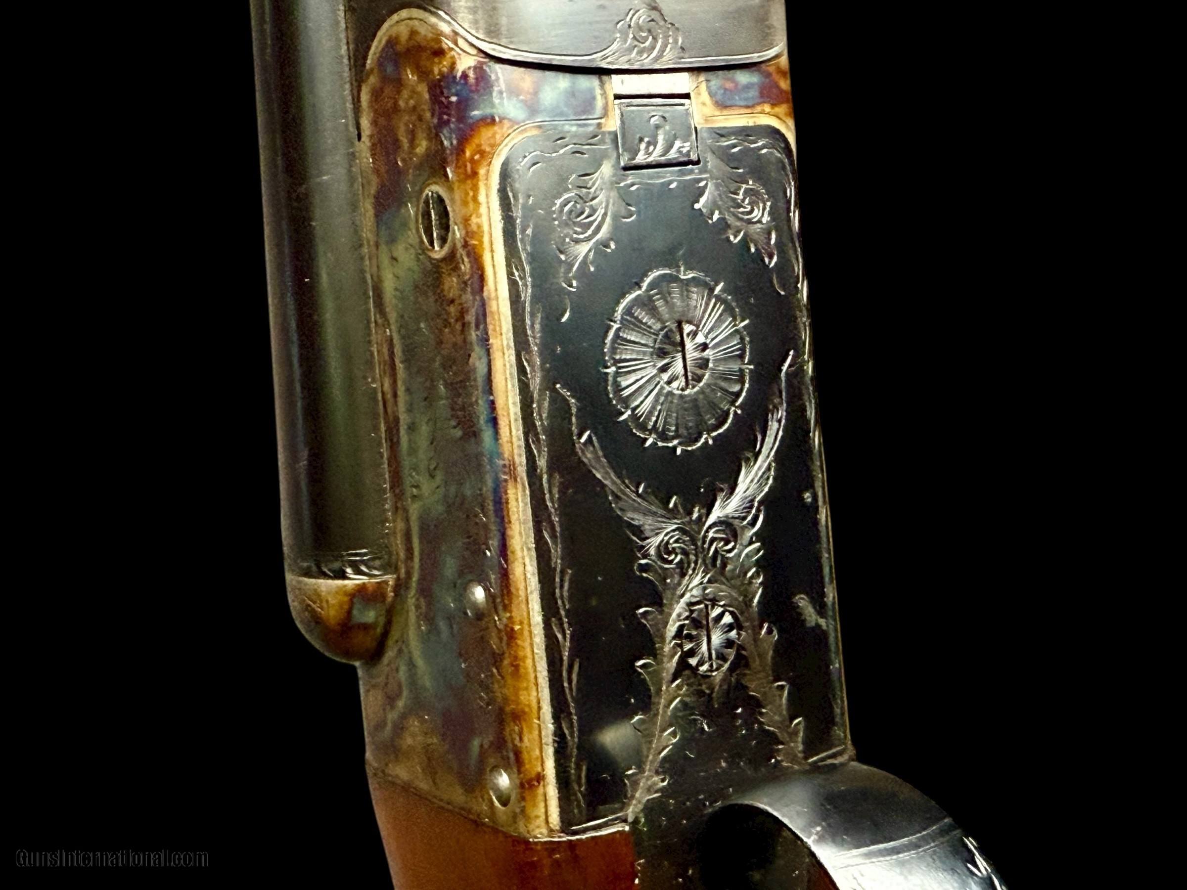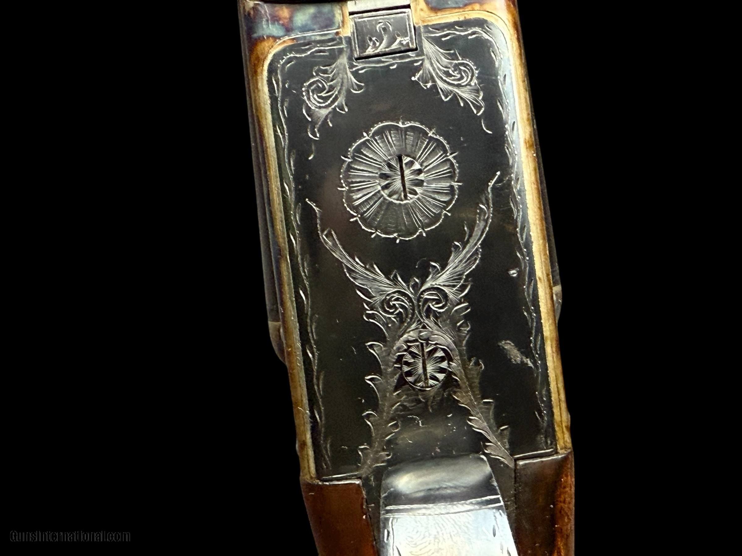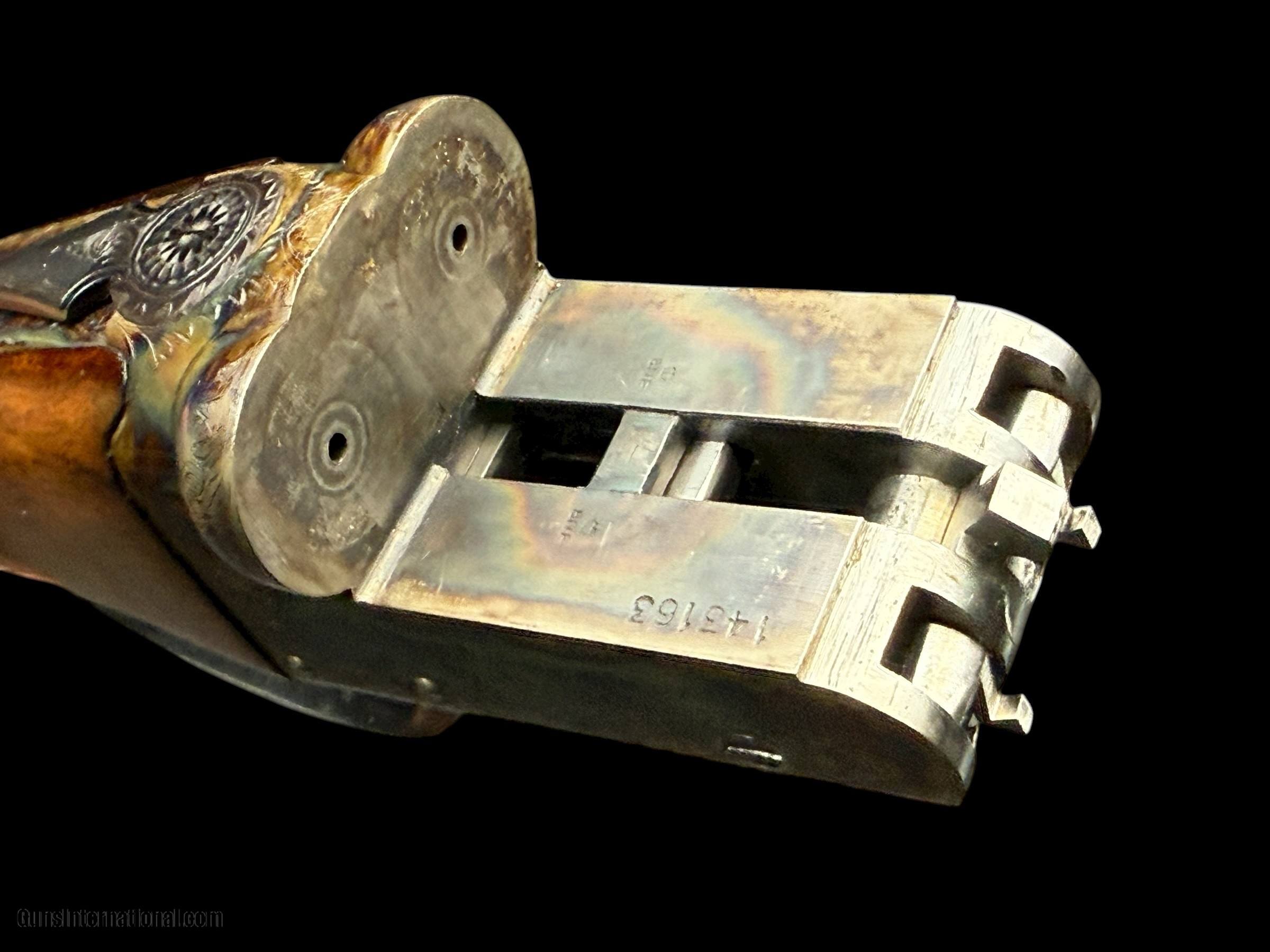 Description: WEBLEY & SCOTT - BIRMINGHAM, ENGLAND - MODEL 700 SXS GAME GUN - “SUPPLIED BY S.R. JEFFERY & SON LTD - GUILDFORD” 20GA - 2 3/4" PROOFS CASE COLOURED AND SCROLL ENGRAVED BOXLOCK ACTION - 26" BARRELS - CHOKES: .003 / .026 EJECTORS - DOUBLE TRIGGERS - AUTOMATIC SAFETY - WALNUT STRAIGHT GRIP STOCK AND SPLINTER FOREND - LINE CHECKERED BUTT - DIMS: LOP: 14 ¾" | DAC: 1 3/8" | DAH: 2 1/4" - WEIGHT: 5LBS 13 OZ NEW LEATHER AND CANVAS “TOE-UNDER” COMPACT CASE WITH MAKER'S LABEL - CONDITION: GUN IS IN EXCELLENT OVERALL ORIGINAL, POSSIBLY UNFIRED, CONDITION. 100% CASE COLORS REMAIN. ACTION TIGHT AND ON-FACE. BORES CLEAR. TRIGGERS CRISP. BLUING AND WOOD FINISH EXCELLENT AS PICTURED. ONE VERY SMALL BLEMISH ON FLOORPLATE AS PICTURED, OTHERWISE PERFECT. CASE AS NEW. GENTLEMEN, THIS IS A FINE AND CLASSIC ENGLISH GAME GUN. PERFECT FOR YOUR NEXT TRIP AFIELD. GREAT DIMENSIONS AND CONDITION. NICELY PRESENTED IN A NEW ENGLISH STYLE CASE. YOU WILL LIKE THIS GUN! FFL REQUIRED FLAT $100 S/H/I CARD FEE APPLIES Shotgun Gauge: 20 Gauge Manufacturer: WEBLEY & SCOTT Model: 700 Serial Number: 143163 Barrel Length: 26 Chambers: 2.75 OR 70MM Ejectors: YES Condition: MINT Metal Condition: MINT Wood Condition: MINT Bore Condition: MINT Action: BOXLOCK EJECTOR Triggers: DOUBLE Price: $4,850.00 Contact Seller |