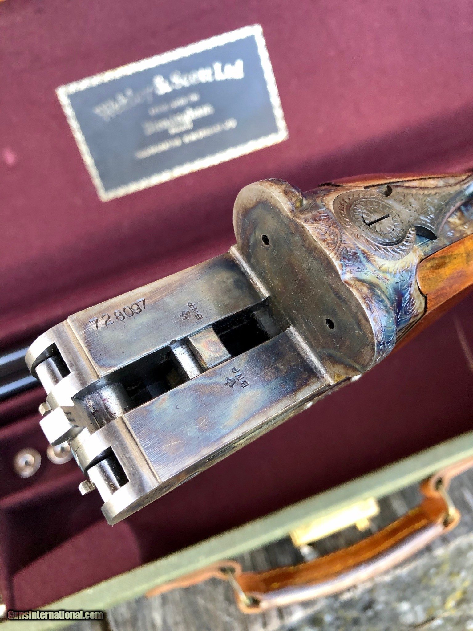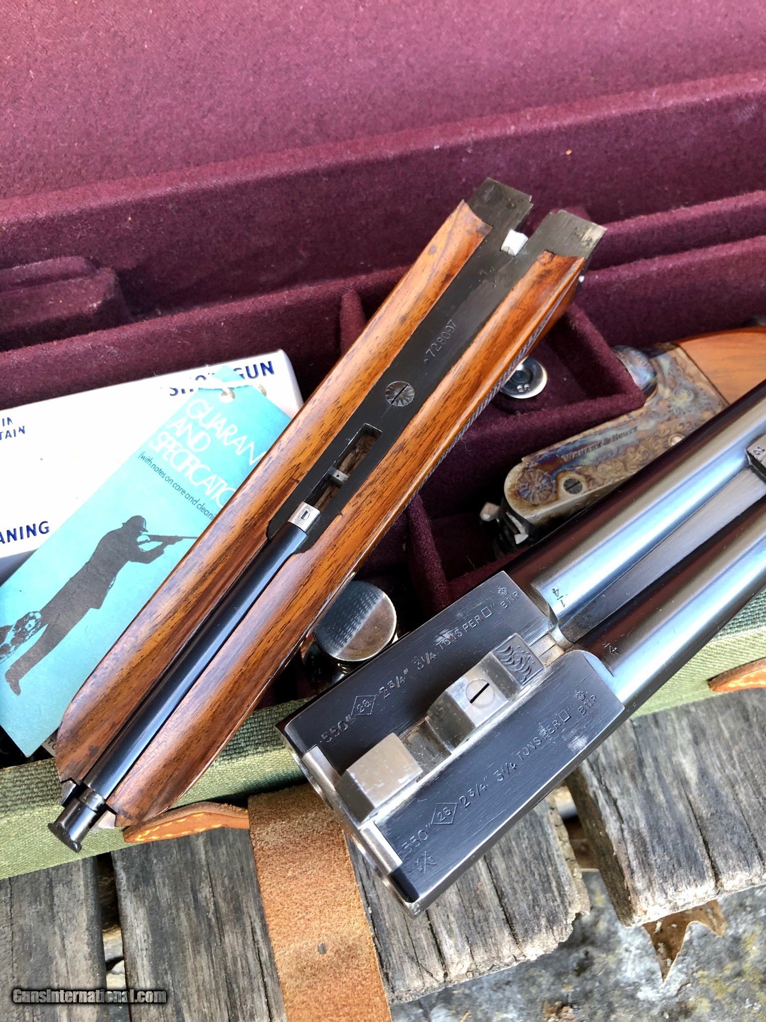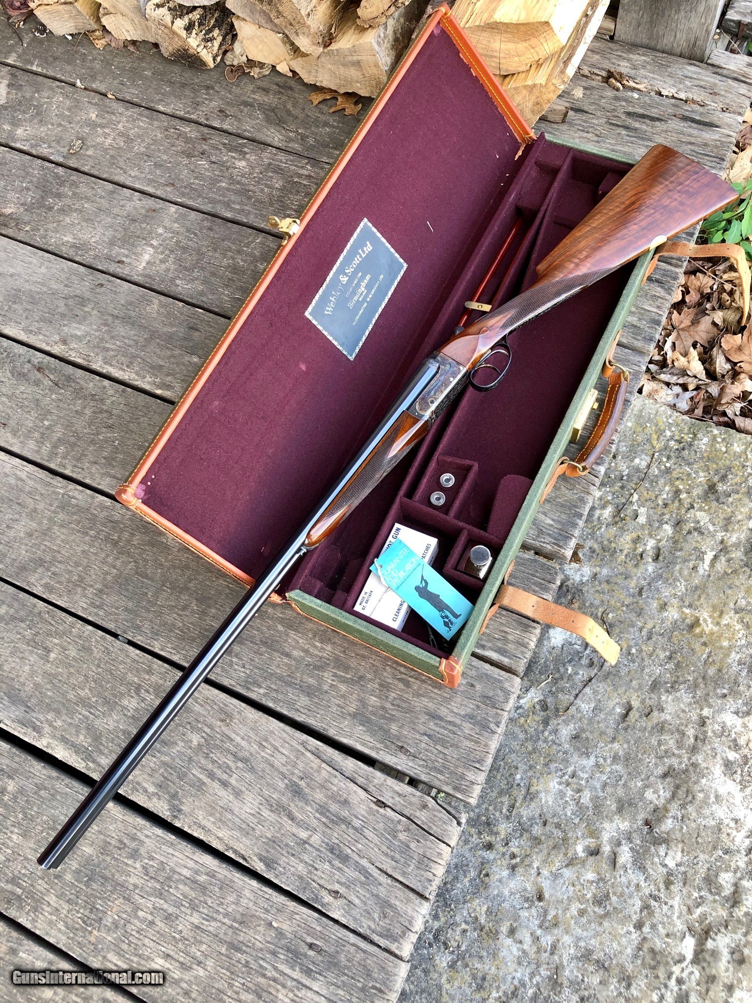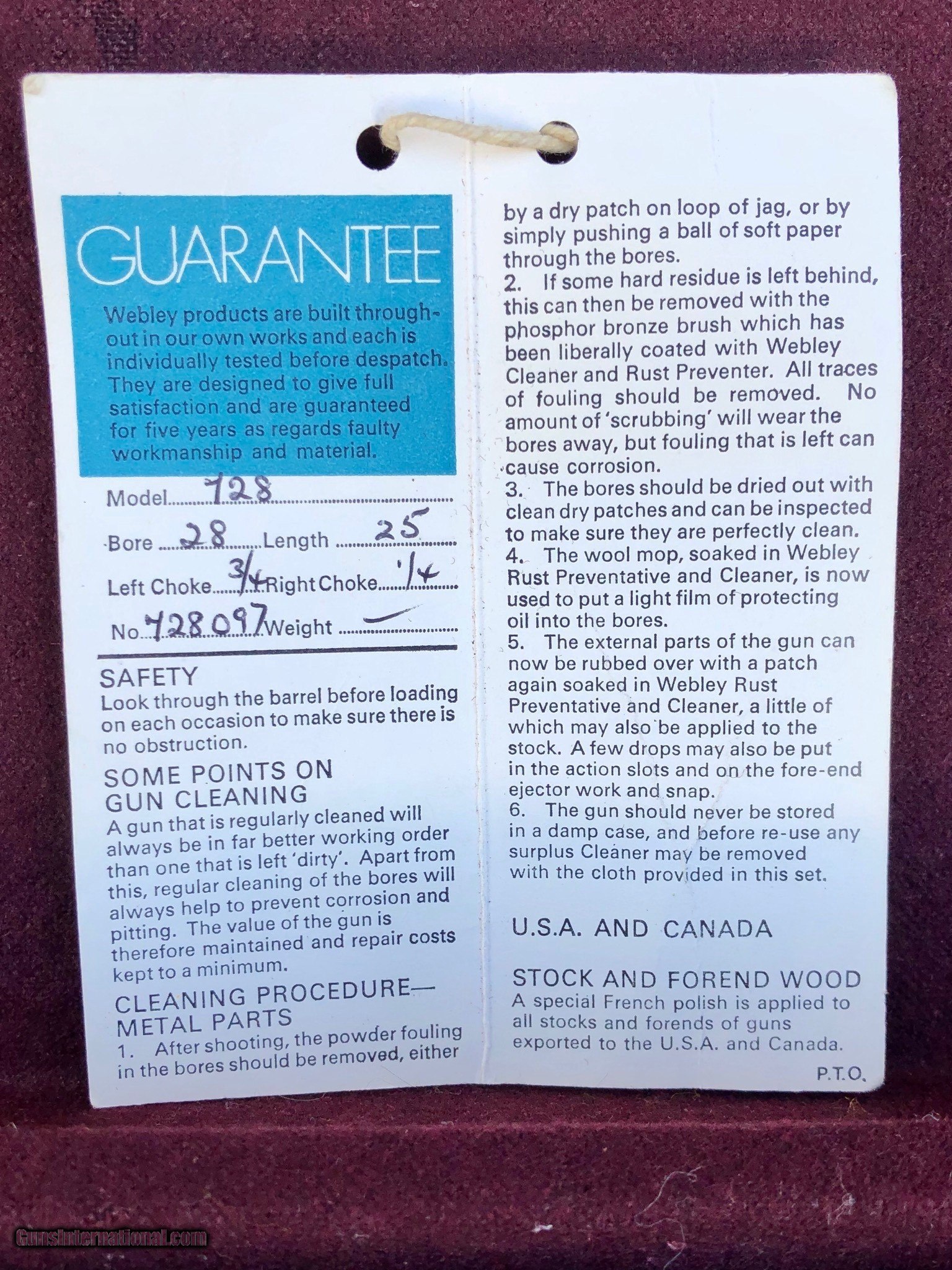 Description: An excellent little Webley & Scott Model 728, a 28 bore double box lock ejector, in the highly desirable Hemingway configuration with 25" barrels choked 3/4 (improved modified) in the left tube and 1/4 (improved cylinder) in the right tube. The gun is ready to go in it's original case complete with trade label and all the original accessories including a pair of snap caps, an oil bottle, a two piece cleaning rod stored under the barrels, a wire brush, a patch swab, a mop, and a box of cleaning patches. Also included is the original hang tag. This particular 728 appears to me to be a little better than usual with highly figured wood and a gold escutcheon on the toe. The Model 728 is a fantastic little English hand made side-by-side gun, made before the days of mass produced CNC machined guns. This gun is gently used - it bagged several quail and a pheasant in its one and only outing this season - but is in excellent condition. The pictures tell the story. I think these guns are a great value and an excellent investment - not bespoke but exhibiting fine English craftsmanship. It's a gun you can be proud of but at a fraction of the cost of a bespoke gun. SOLD Manufacturer: Webley & Scott Model: 728 Serial Number: 728097 Bore: 28 Chambers: 2 3/4” Ejectors: Yes Condition: See photos and description. Metal Condition: See photos and description. Wood Condition: See photos and description. Bore Condition: Excellent Action: Box lock ejector Triggers: Double Gauge Info: 28 Stock: English walnut LOP: 14 3/4” Rib: Game Sights: Bead Choke Left: 3/4 (improved modified) Choke Right: 1/4 (improved cylinder) Extras: See photos and description. Case: Original canvas Proof:Nitro: 3 1/4 ton per square inch |