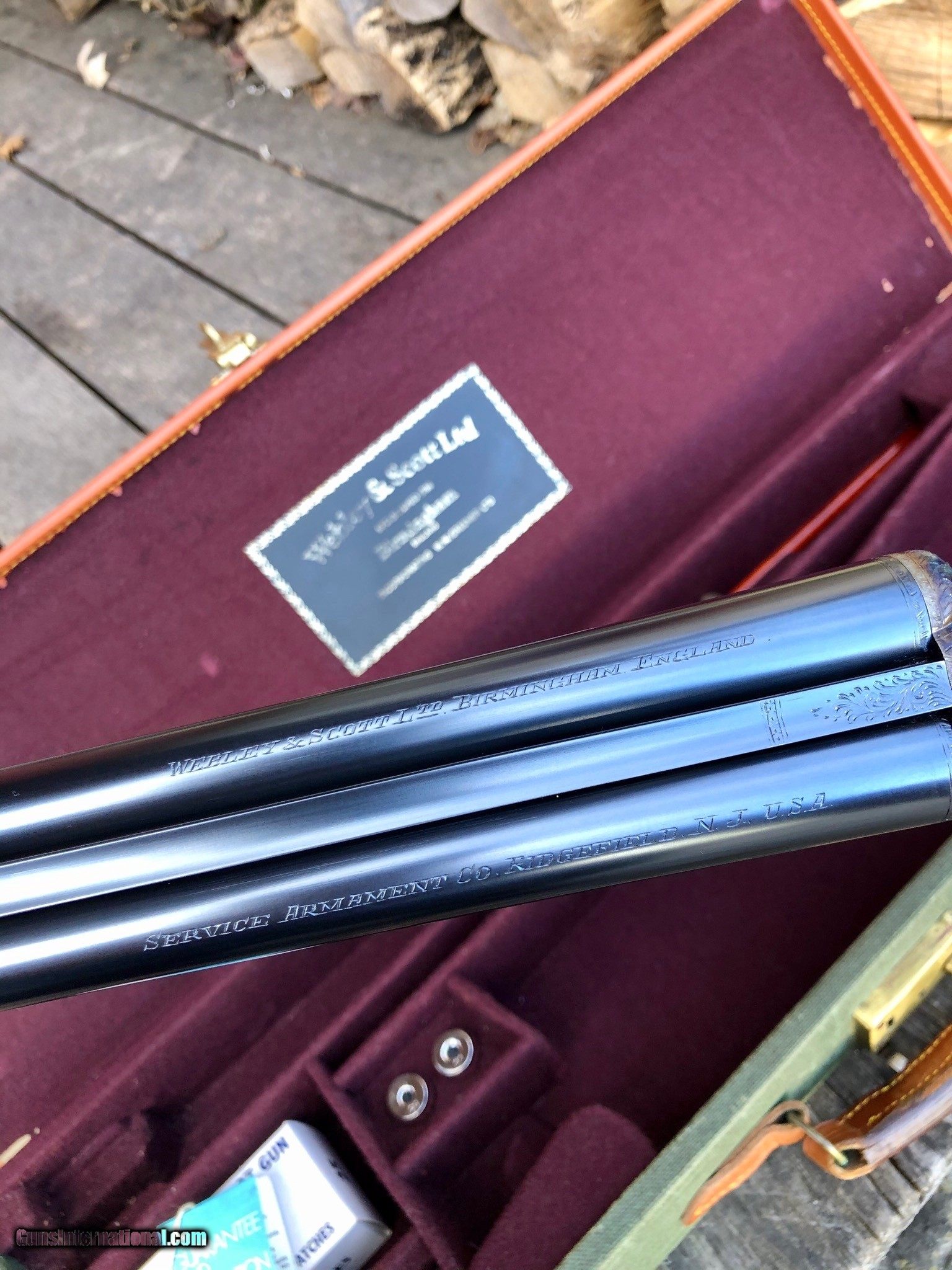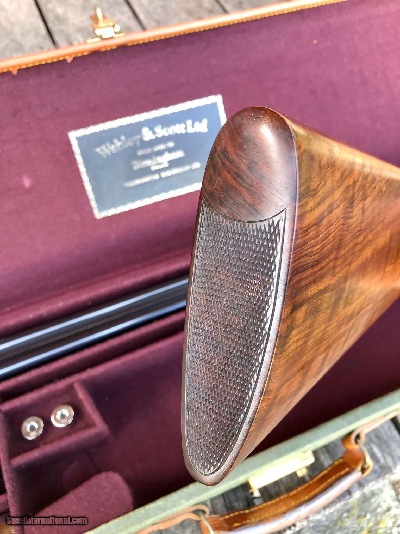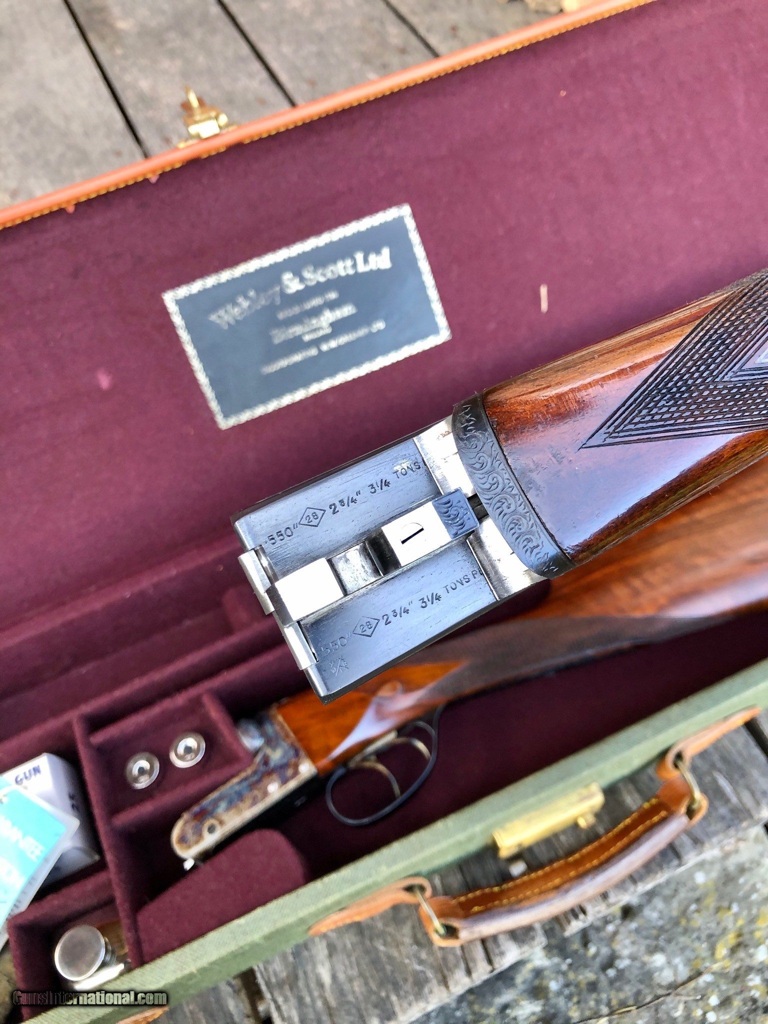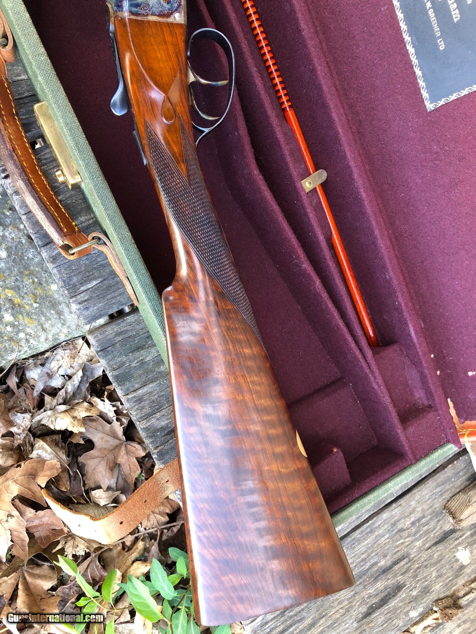 Description: An excellent little Webley & Scott Model 728, a 28 bore double box lock ejector, in the highly desirable Hemingway configuration with 25" barrels choked 3/4 (improved modified) in the left tube and 1/4 (improved cylinder) in the right tube. The gun is ready to go in it's original case complete with trade label and all the original accessories including a pair of snap caps, an oil bottle, a two piece cleaning rod stored under the barrels, a wire brush, a patch swab, a mop, and a box of cleaning patches. Also included is the original hang tag. This particular 728 appears to me to be a little better than usual with highly figured wood and a gold escutcheon on the toe. The Model 728 is a fantastic little English hand made side-by-side gun, made before the days of mass produced CNC machined guns. This gun is gently used - it bagged several quail and a pheasant in its one and only outing this season - but is in excellent condition. The pictures tell the story. I think these guns are a great value and an excellent investment - not bespoke but exhibiting fine English craftsmanship. It's a gun you can be proud of but at a fraction of the cost of a bespoke gun. SOLD Manufacturer: Webley & Scott Model: 728 Serial Number: 728097 Bore: 28 Chambers: 2 3/4” Ejectors: Yes Condition: See photos and description. Metal Condition: See photos and description. Wood Condition: See photos and description. Bore Condition: Excellent Action: Box lock ejector Triggers: Double Gauge Info: 28 Stock: English walnut LOP: 14 3/4” Rib: Game Sights: Bead Choke Left: 3/4 (improved modified) Choke Right: 1/4 (improved cylinder) Extras: See photos and description. Case: Original canvas Proof:Nitro: 3 1/4 ton per square inch |