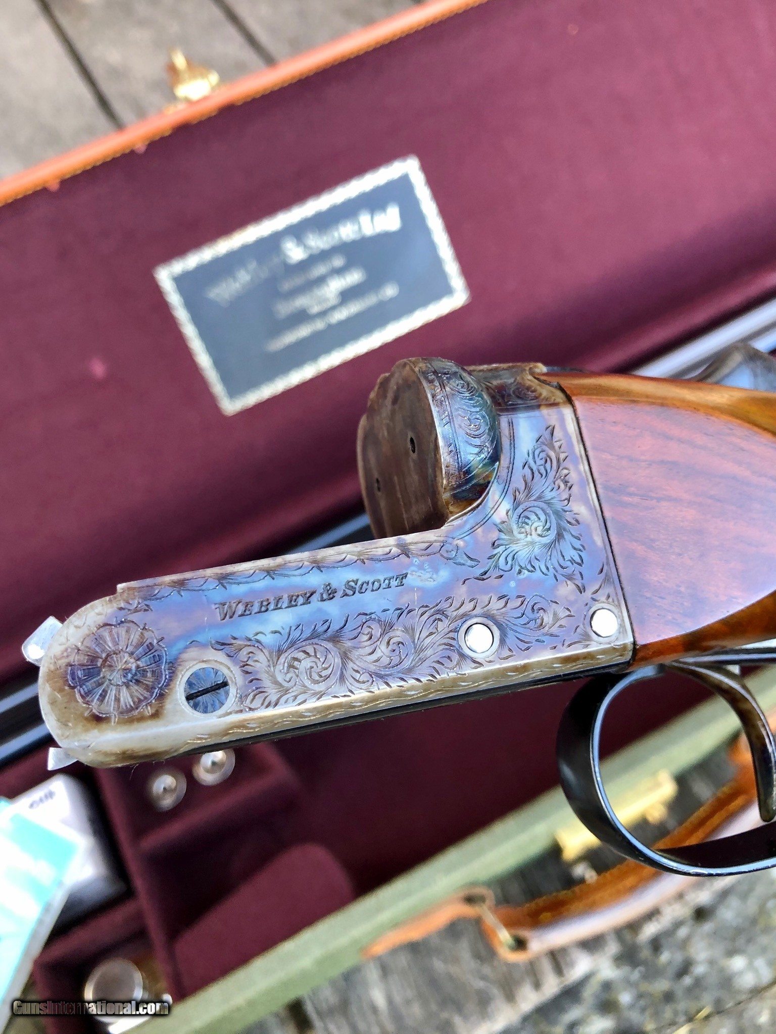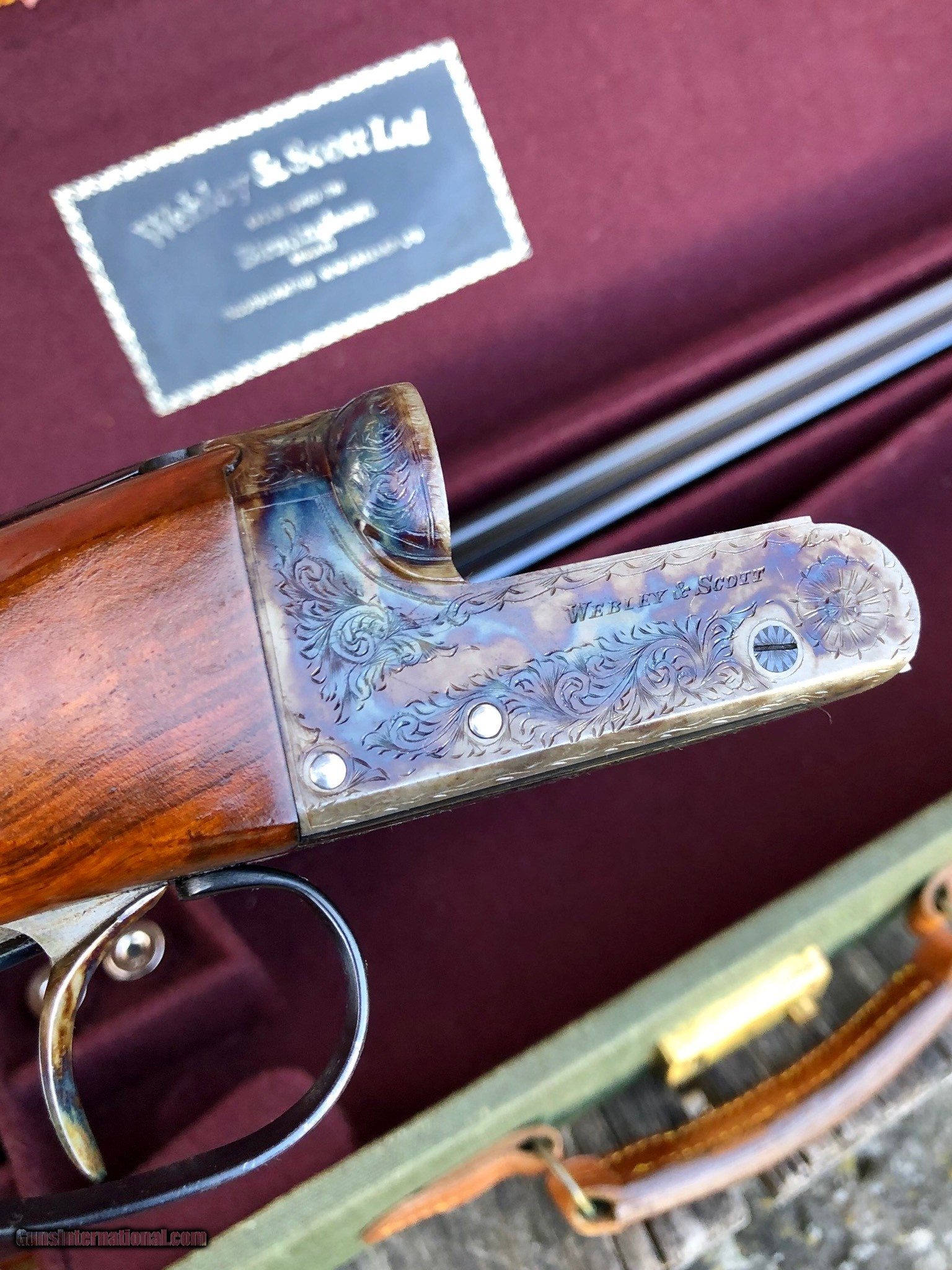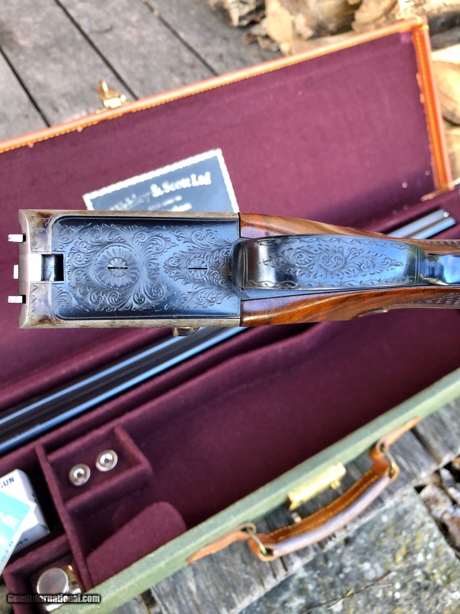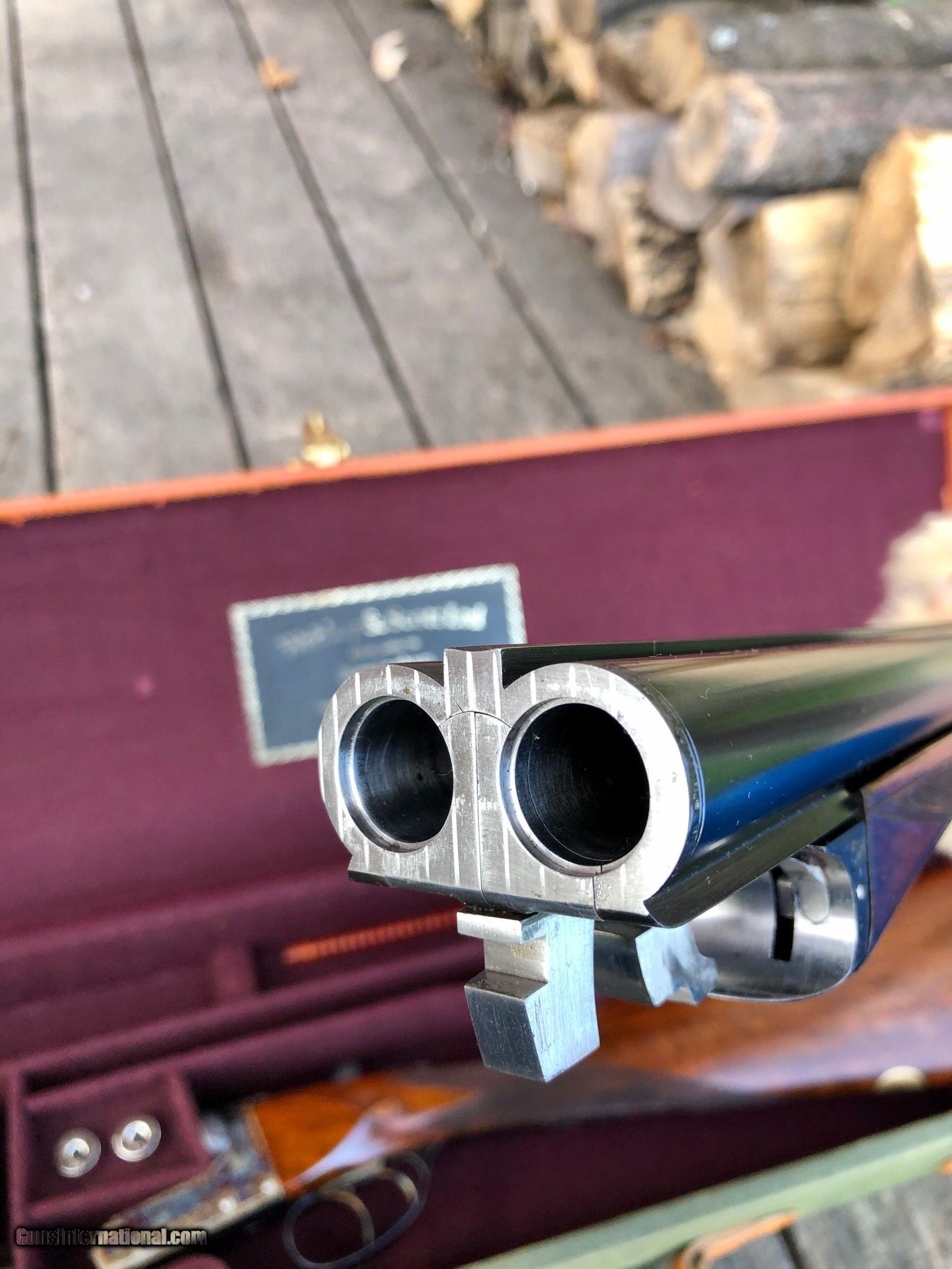 Description: An excellent little Webley & Scott Model 728, a 28 bore double box lock ejector, in the highly desirable Hemingway configuration with 25" barrels choked 3/4 (improved modified) in the left tube and 1/4 (improved cylinder) in the right tube. The gun is ready to go in it's original case complete with trade label and all the original accessories including a pair of snap caps, an oil bottle, a two piece cleaning rod stored under the barrels, a wire brush, a patch swab, a mop, and a box of cleaning patches. Also included is the original hang tag. This particular 728 appears to me to be a little better than usual with highly figured wood and a gold escutcheon on the toe. The Model 728 is a fantastic little English hand made side-by-side gun, made before the days of mass produced CNC machined guns. This gun is gently used - it bagged several quail and a pheasant in its one and only outing this season - but is in excellent condition. The pictures tell the story. I think these guns are a great value and an excellent investment - not bespoke but exhibiting fine English craftsmanship. It's a gun you can be proud of but at a fraction of the cost of a bespoke gun. SOLD Manufacturer: Webley & Scott Model: 728 Serial Number: 728097 Bore: 28 Chambers: 2 3/4” Ejectors: Yes Condition: See photos and description. Metal Condition: See photos and description. Wood Condition: See photos and description. Bore Condition: Excellent Action: Box lock ejector Triggers: Double Gauge Info: 28 Stock: English walnut LOP: 14 3/4” Rib: Game Sights: Bead Choke Left: 3/4 (improved modified) Choke Right: 1/4 (improved cylinder) Extras: See photos and description. Case: Original canvas Proof:Nitro: 3 1/4 ton per square inch |