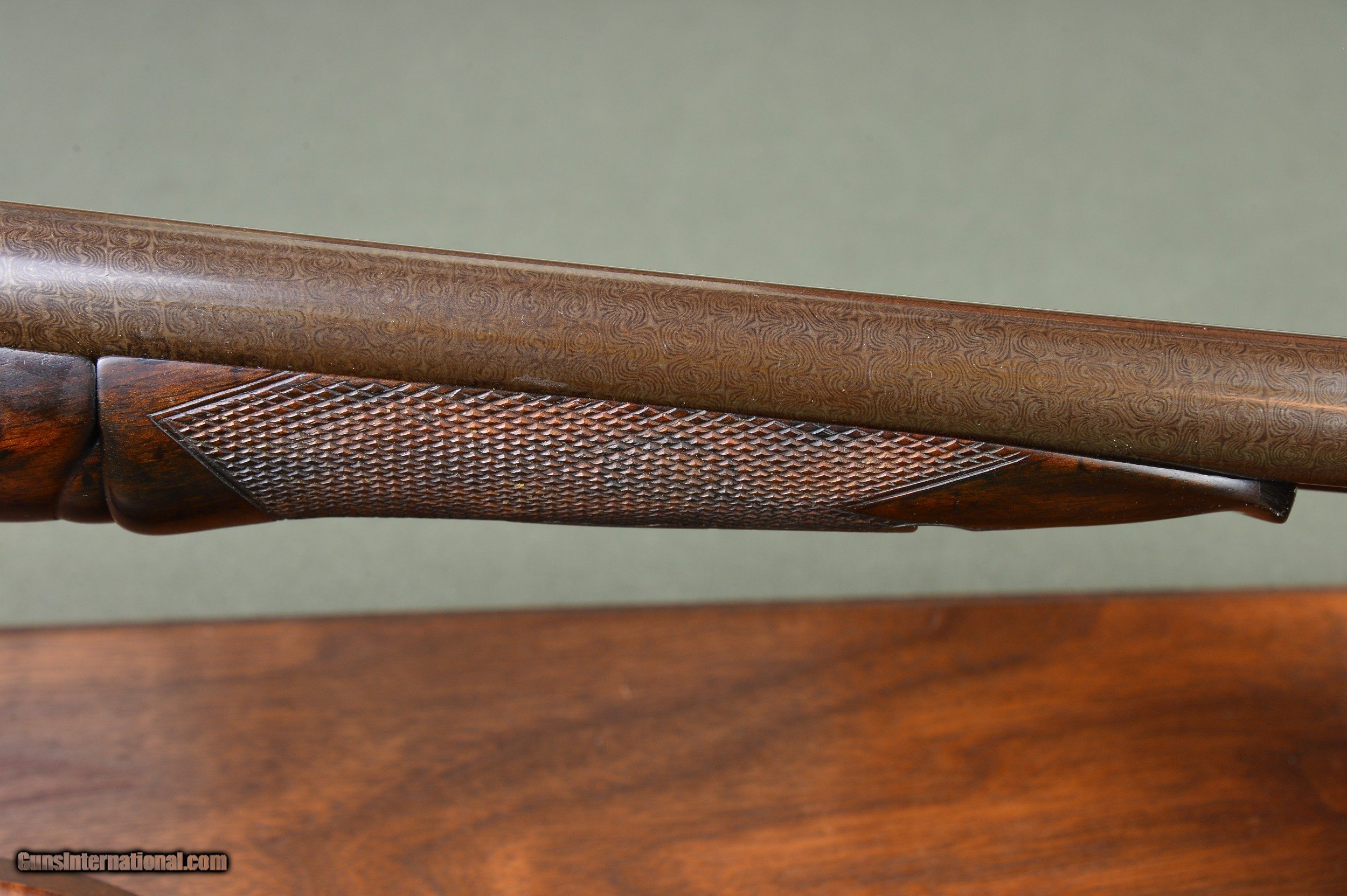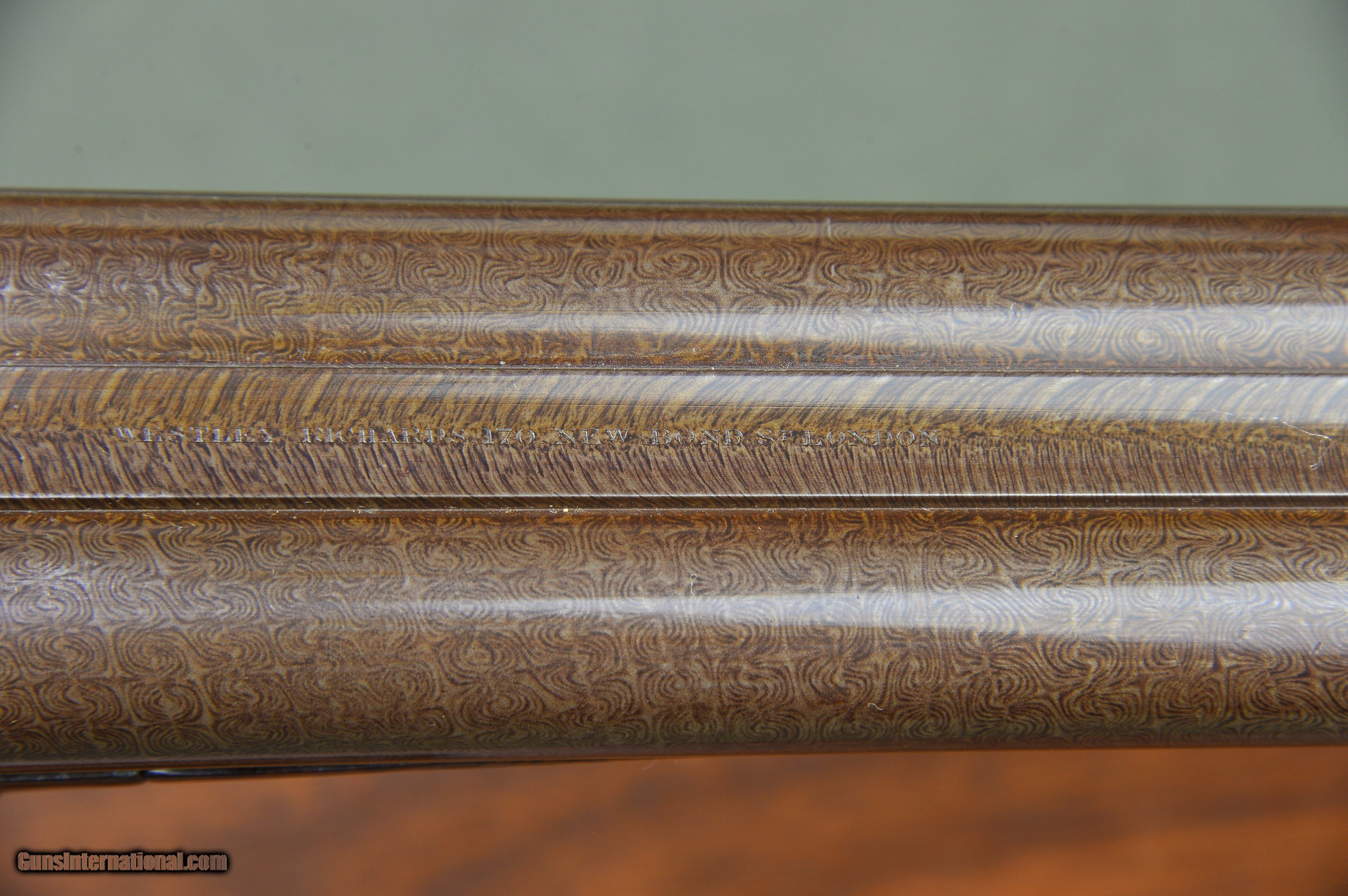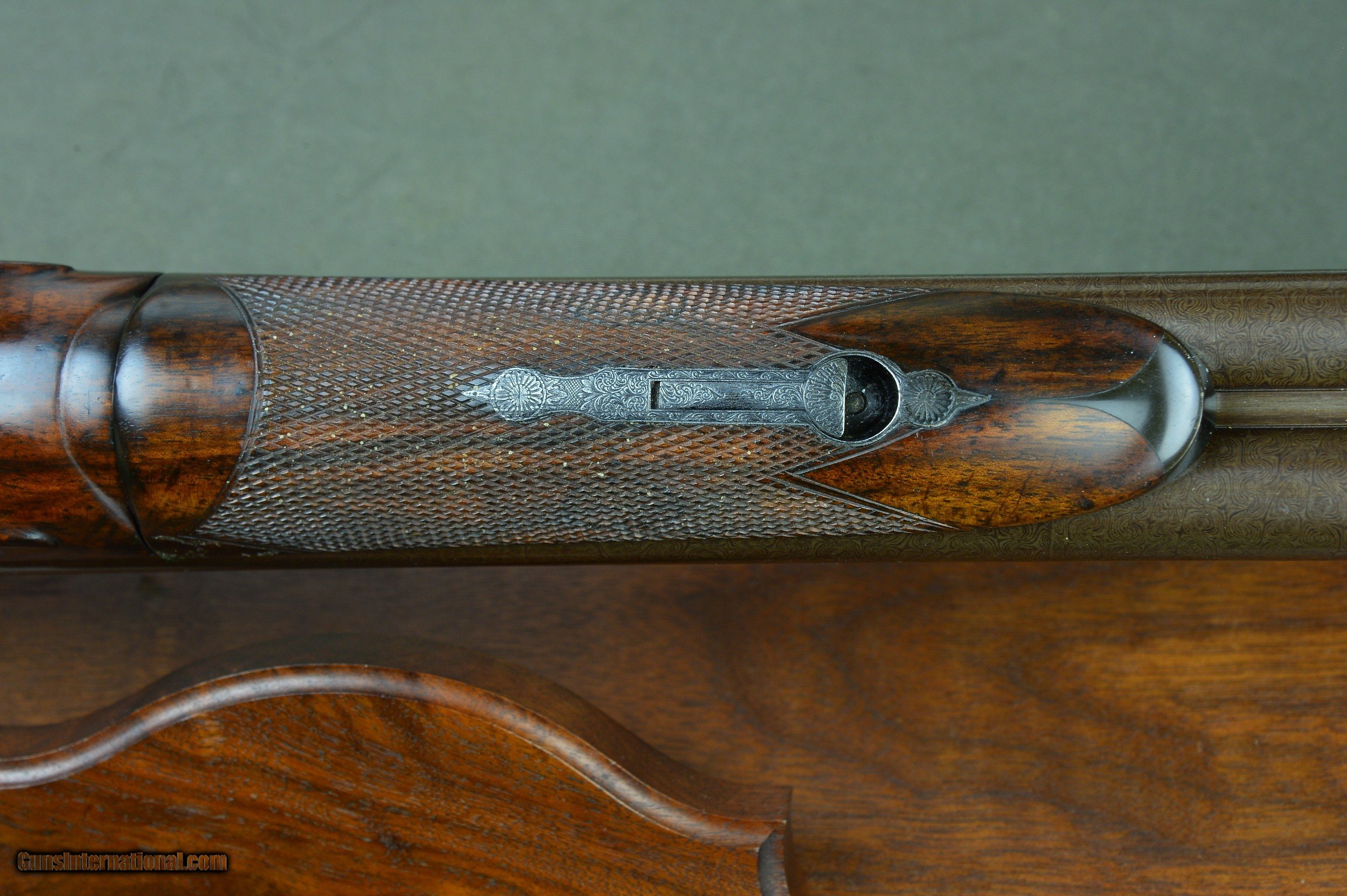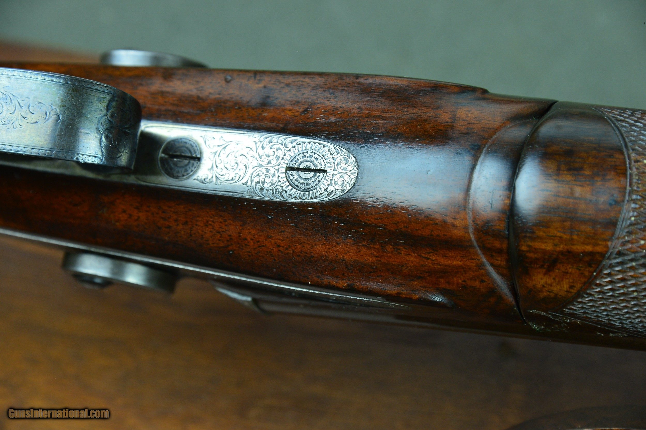 Description: *** SOLD *** This gun, number 12002, was made circa 1872 and represents a beautiful example of the very individual hammerguns that Westley Richards became famous for in the last quarter of the 19th Century. Their trademark style was the use of 'bar-in-wood' stocking combined with a 'crab joint'. Nicely engraved with fluted percussion style fences and partial coverage on action and breech end of barrels. A very individual and highly 'shootable' gun for either game or clays. *** The action is of Westley Richards' patented design and features: Top lever opening, operating the famous Westley Richards patented single bolt, engaging a 'Doll's Head' top extension; Bar-in-wood stock with 'crab joint'; Double triggers; Bar action, rebounding locks; Low level shaped hammers; 'Deeley' forend catch. Gun weighs 6lb 14oz. Toplever engraved ‘WESTLEY RICHARDS PATENT’. *** The highly figured nitro Damascus barrels are 30" in length, chambered for 2 ½ " (65mm) cartridges and are of brazed 'dovetail' lump construction with soft soldered ribs. Top rib is of the smooth, concave, game type. The rib is inscribed “Westley Richards 170 New Bond St. London” and separately “Patent”. The bores are essentially clean but retain a few small vestigial pits. London reproof for 2 ½” nitro powder cartridges. The right barrel has a bore diameter of 0.734 with a constriction of 0.000 for Cylinder choke. Minimum wall thickness is 0.033. The left barrel is bored 0.735 and has a constriction of 0.000 for Cylinder choke. Minimum wall thickness 0.034. Urban legend notwithstanding Cylinder is a very effective choke and can bust clays or fold up upland game very effectively. Ideal for upland game or clays. *** The original straight hand stock and splinter forend are crafted from highly figured walnut and nicely finished with crisp checkering and only a few minor handling marks. The stock has neutral cast, features a vacant, white metal, rectangular oval and is finished with a steel butt plate and engraved screws. It appears to be the original butt plate. It has a 'Deeley' forend catch and the forend features a carved horn tip. Stock dimensions are 14-1/4” by 1-9/16” by 2-1/16”. Neutral cast. *** This is a very handsome and great handling bar-in-wood hammergun from one of Britain’s premier gunmakers. It is in wonderful condition for its age and will be a desirable hammergun for shooter’s and collectors alike. You will be proud to uncase it at the range or carry it for a day afield. *** Please note that the photographs are part of the description. Not for sale where prohibited by state or local laws. Buyer is responsible for all shipping, insurance, and any other related charges. I give a 3-day non-firing inspection period which begins when the firearm arrives at your FFL dealer or is delivered to your designated shipping address if classified as an Antique Firearm. Returns at buyer’s expense. SOLD Antique: Yes |