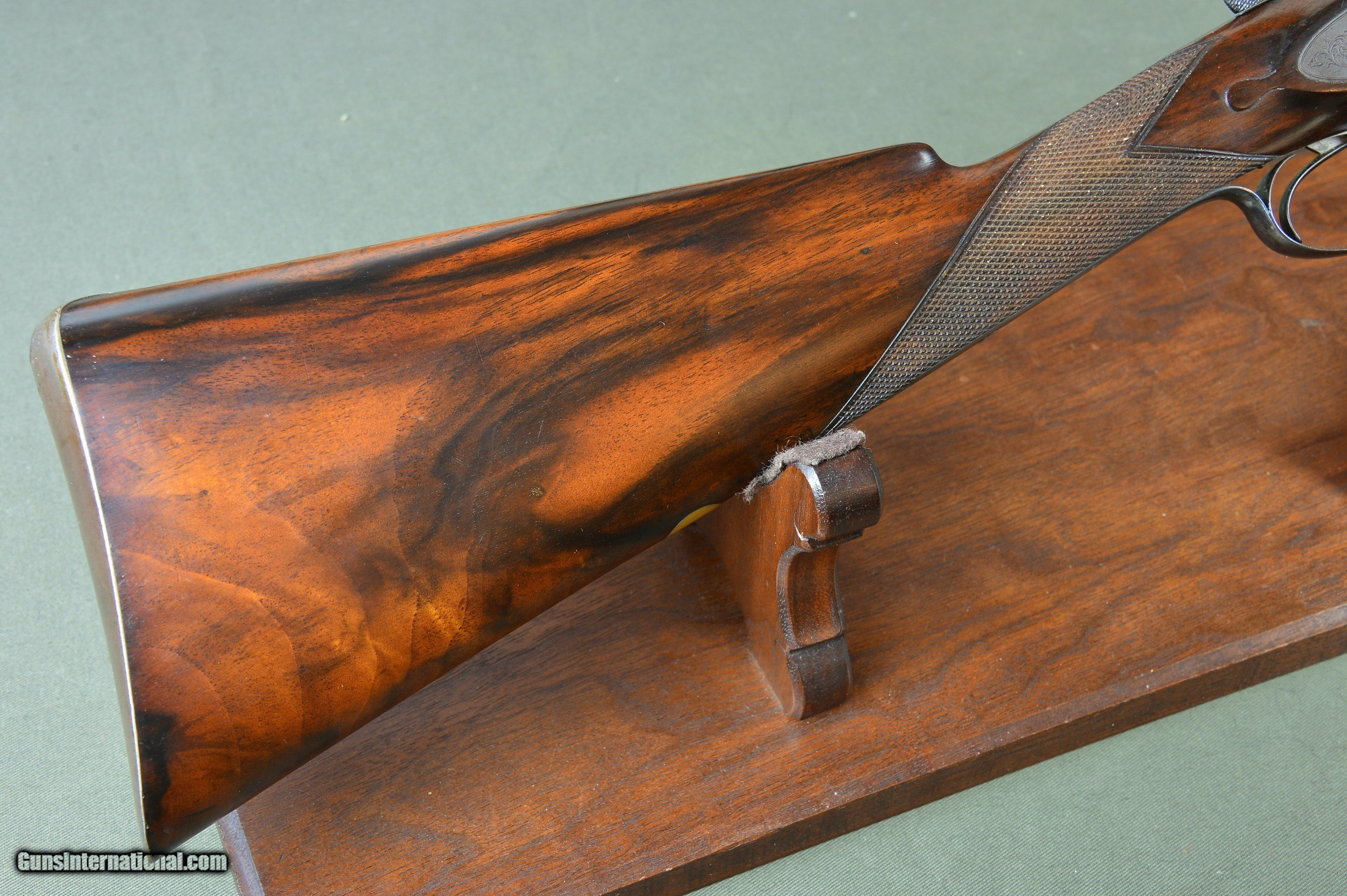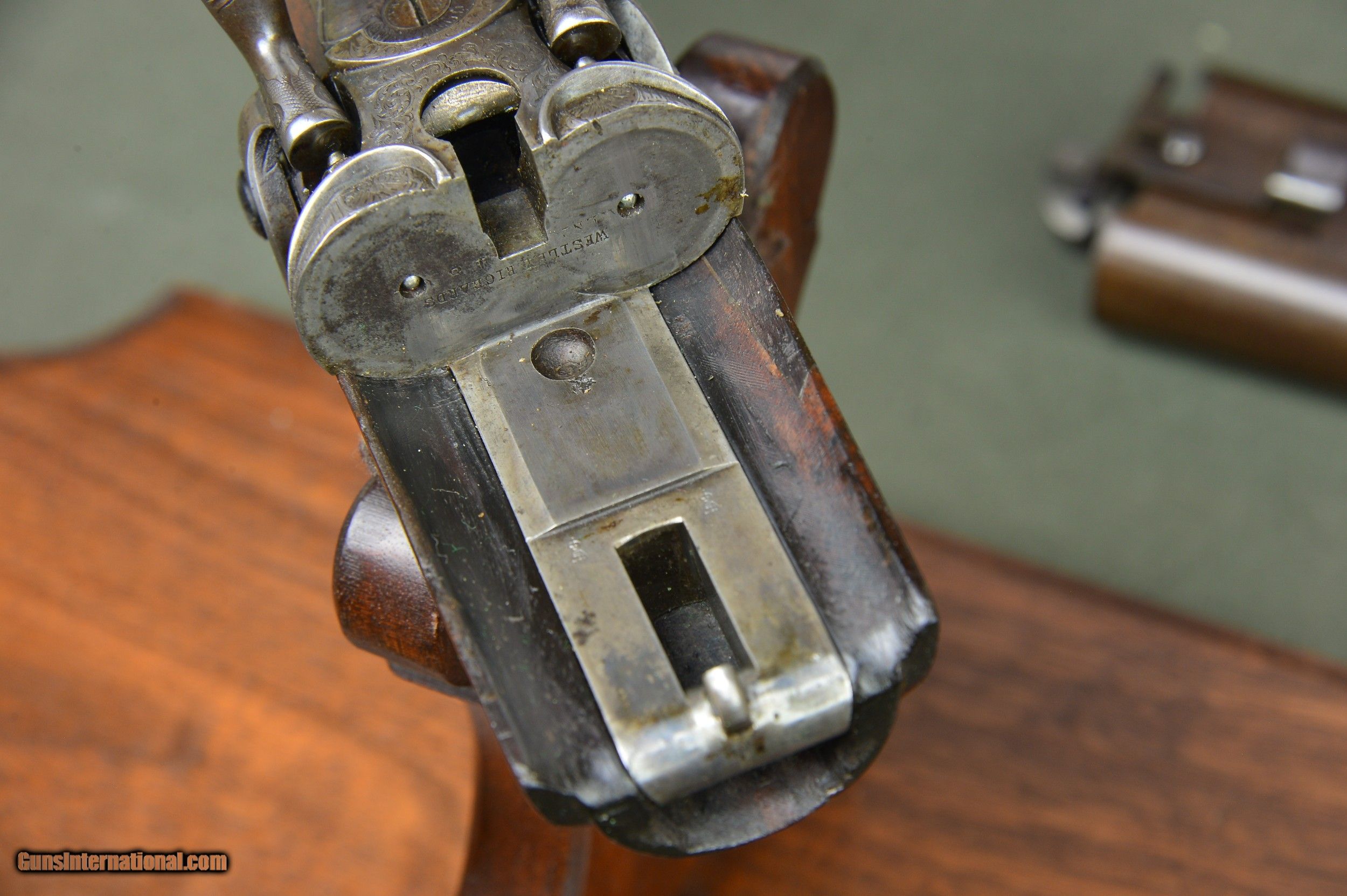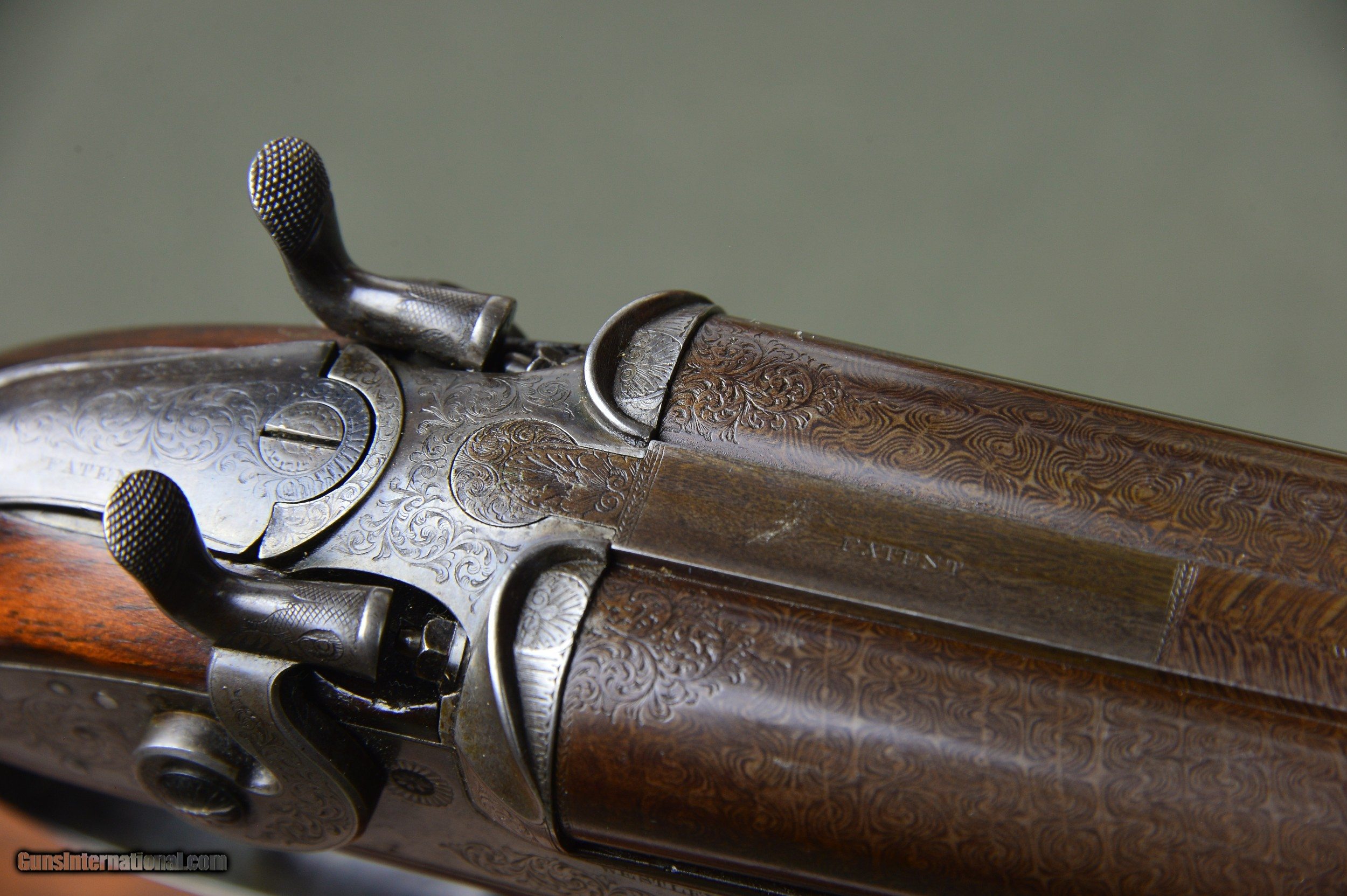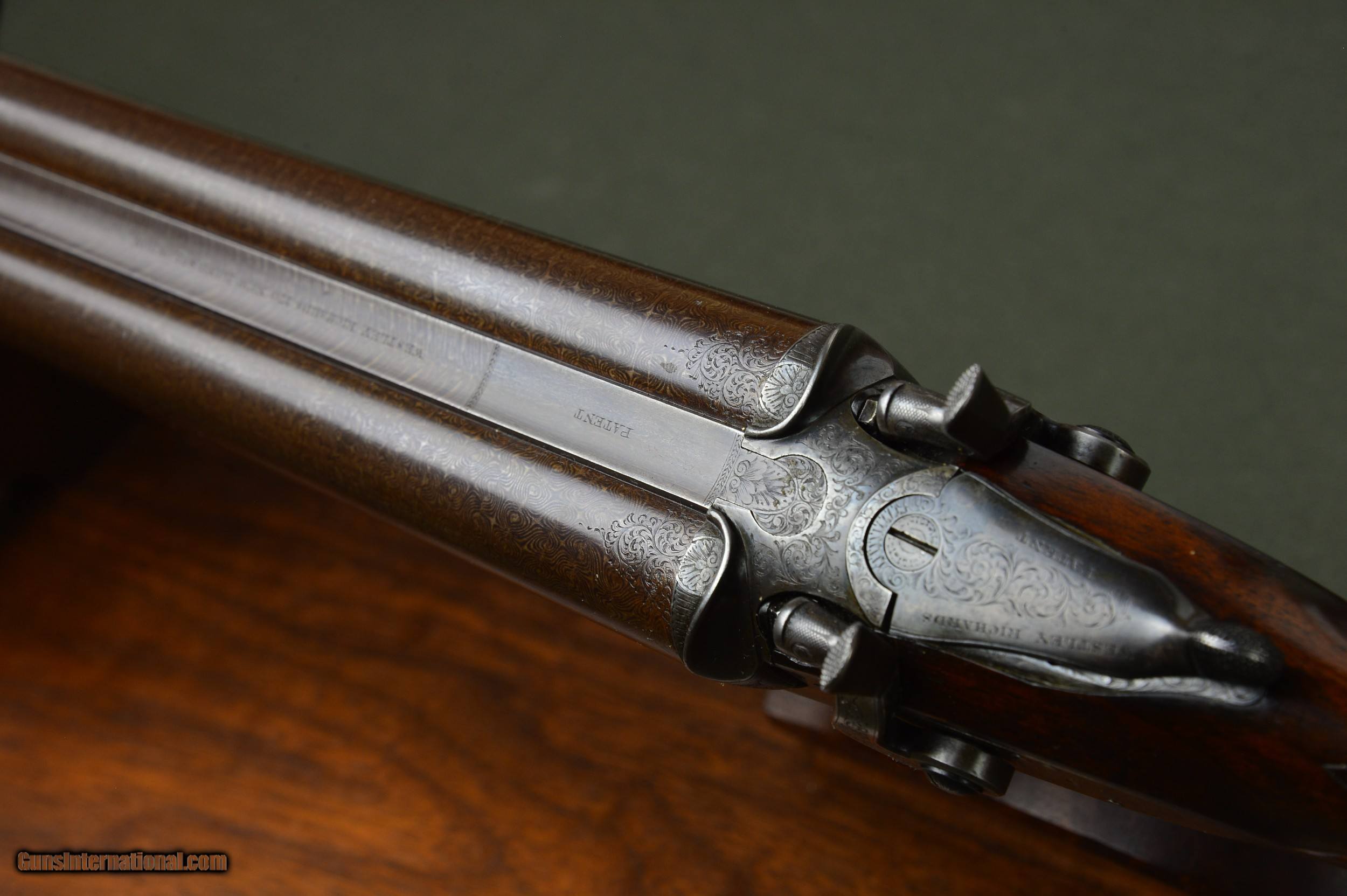 Description: *** SOLD *** This gun, number 12002, was made circa 1872 and represents a beautiful example of the very individual hammerguns that Westley Richards became famous for in the last quarter of the 19th Century. Their trademark style was the use of 'bar-in-wood' stocking combined with a 'crab joint'. Nicely engraved with fluted percussion style fences and partial coverage on action and breech end of barrels. A very individual and highly 'shootable' gun for either game or clays. *** The action is of Westley Richards' patented design and features: Top lever opening, operating the famous Westley Richards patented single bolt, engaging a 'Doll's Head' top extension; Bar-in-wood stock with 'crab joint'; Double triggers; Bar action, rebounding locks; Low level shaped hammers; 'Deeley' forend catch. Gun weighs 6lb 14oz. Toplever engraved ‘WESTLEY RICHARDS PATENT’. *** The highly figured nitro Damascus barrels are 30" in length, chambered for 2 ½ " (65mm) cartridges and are of brazed 'dovetail' lump construction with soft soldered ribs. Top rib is of the smooth, concave, game type. The rib is inscribed “Westley Richards 170 New Bond St. London” and separately “Patent”. The bores are essentially clean but retain a few small vestigial pits. London reproof for 2 ½” nitro powder cartridges. The right barrel has a bore diameter of 0.734 with a constriction of 0.000 for Cylinder choke. Minimum wall thickness is 0.033. The left barrel is bored 0.735 and has a constriction of 0.000 for Cylinder choke. Minimum wall thickness 0.034. Urban legend notwithstanding Cylinder is a very effective choke and can bust clays or fold up upland game very effectively. Ideal for upland game or clays. *** The original straight hand stock and splinter forend are crafted from highly figured walnut and nicely finished with crisp checkering and only a few minor handling marks. The stock has neutral cast, features a vacant, white metal, rectangular oval and is finished with a steel butt plate and engraved screws. It appears to be the original butt plate. It has a 'Deeley' forend catch and the forend features a carved horn tip. Stock dimensions are 14-1/4” by 1-9/16” by 2-1/16”. Neutral cast. *** This is a very handsome and great handling bar-in-wood hammergun from one of Britain’s premier gunmakers. It is in wonderful condition for its age and will be a desirable hammergun for shooter’s and collectors alike. You will be proud to uncase it at the range or carry it for a day afield. *** Please note that the photographs are part of the description. Not for sale where prohibited by state or local laws. Buyer is responsible for all shipping, insurance, and any other related charges. I give a 3-day non-firing inspection period which begins when the firearm arrives at your FFL dealer or is delivered to your designated shipping address if classified as an Antique Firearm. Returns at buyer’s expense. SOLD Antique: Yes |
