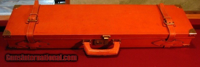 Description: Westley Richards Droplock 12 Gauge $15,950 Westley Richards, London 12 Gauge Droplock with 28" dovetail lump ejector IC/F barrels with concave game rib with silver front bead. Rib extension third bite. Chambers are 2 3/4" and so proved. Bores are excellent measuring .729 right and left. Choked .009 right and .034 left. Wall thickness .031 on the right and .033 on the left. Reciever retains 98% vivid case colors and has full coverage scroll, Acanthus leaf, and game bird engraving with deeply and intricately carved fences. Double triggers. Straight hand stock with vacant stock shield, checkered side panels, and drop points. Splinter forend with Deeley release. 14 3/4" LOP to a checkered butt with engraved heel and toe clips. DAC- 1 5/8" DAH-2 1/8" Cast off 1/4" Stocked in an outstanding piece of European Walnut, near exhibition, with dark marblecake mineral streak lines. This is an outstanding gun that appears to have had a complete London refinish including case colors. It appears like new. It is cased in a modern brass cornered leather trunk case with Westley Richards trade label and Westley Richards snap caps. Outstanding game gun weight at 6lb 7oz It is not likely that you will find a nicer Westley Hand Detachable Droplock unless you order it new from the factory. SOLD |
