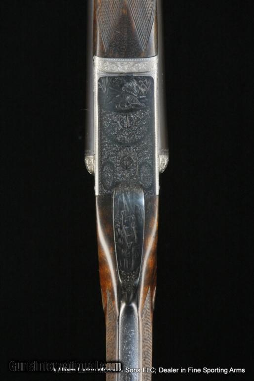 Description: William Ford, SXS, Deluxe BLE two barrel set, 16 GA, 28'' & 28.5", IC-M & M-F, DT, Straight Grip, Splinter Forearm, Smooth Concave Ribs, Fine Scroll & Rosette Engraving with cameo game scenes, Coin Finish Receiver, Autosafety, Checkered Butt, Gold Oval, Very nicely figured wood, Checkered panels, Drop points, Dimensions 1 1/2 x 2 1/8 x 14 1/8 with 1/4 cast off, Weight 5#10oz, 2 3/4" chambers, ID 3770, EXC. Plus Condition SOLD Curio/Relic: Yes |
