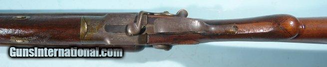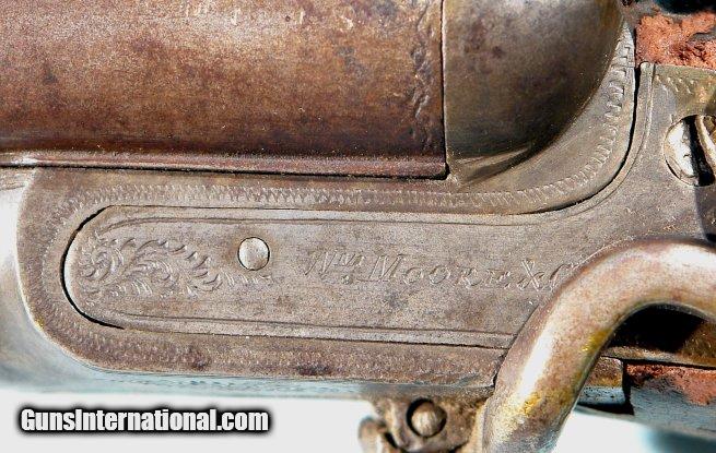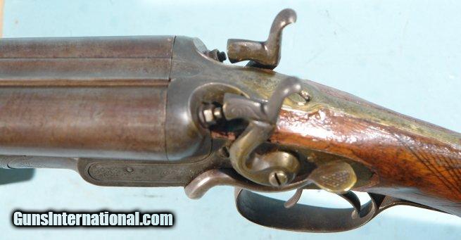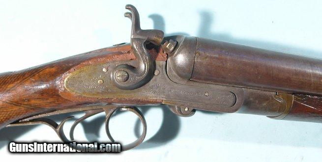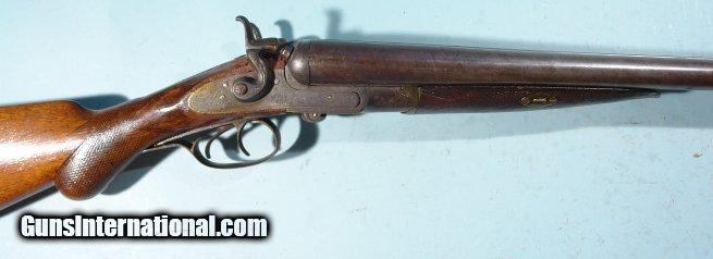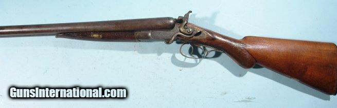 Description: WILLIAM MOORE & CO. (BIRMINGHAM) 12GA. 30" HAMMER SIDE LEVER SHOTGUN. Circa 1870-1880's. Serial number "11XX" as stamped on forend, water table and barrels along with Birmingham proofs. Damascus barrels choked cylinder and improved cylinder. Lugs peened to expand for better fit. Very good bright bores with little to no signs of pitting and thick walls so never opened up. Forend with original color on hardware and unturned screws. Receiver in original condition with just traces of original color. Original hammers with one replaced screw. Sidelever in original condition weith good tension. Lockplate screws buggered. Tang screws buggered with end of lower tang missing. Triggerhuard loose. Space where tang end was filled with wood filler as are some areas about receiver. Brass escutcheon plate un-engraved. Very nice early FN Browning Automatic horn buttplate affixed to where original was. Working order. Solid stock fit regardless of wood filler and NO cracks or hairlines. Not the tightest fit on face but great set of barrels to do with what you will. Would make a nice project gun or part it out. SOLD Antique: Yes |