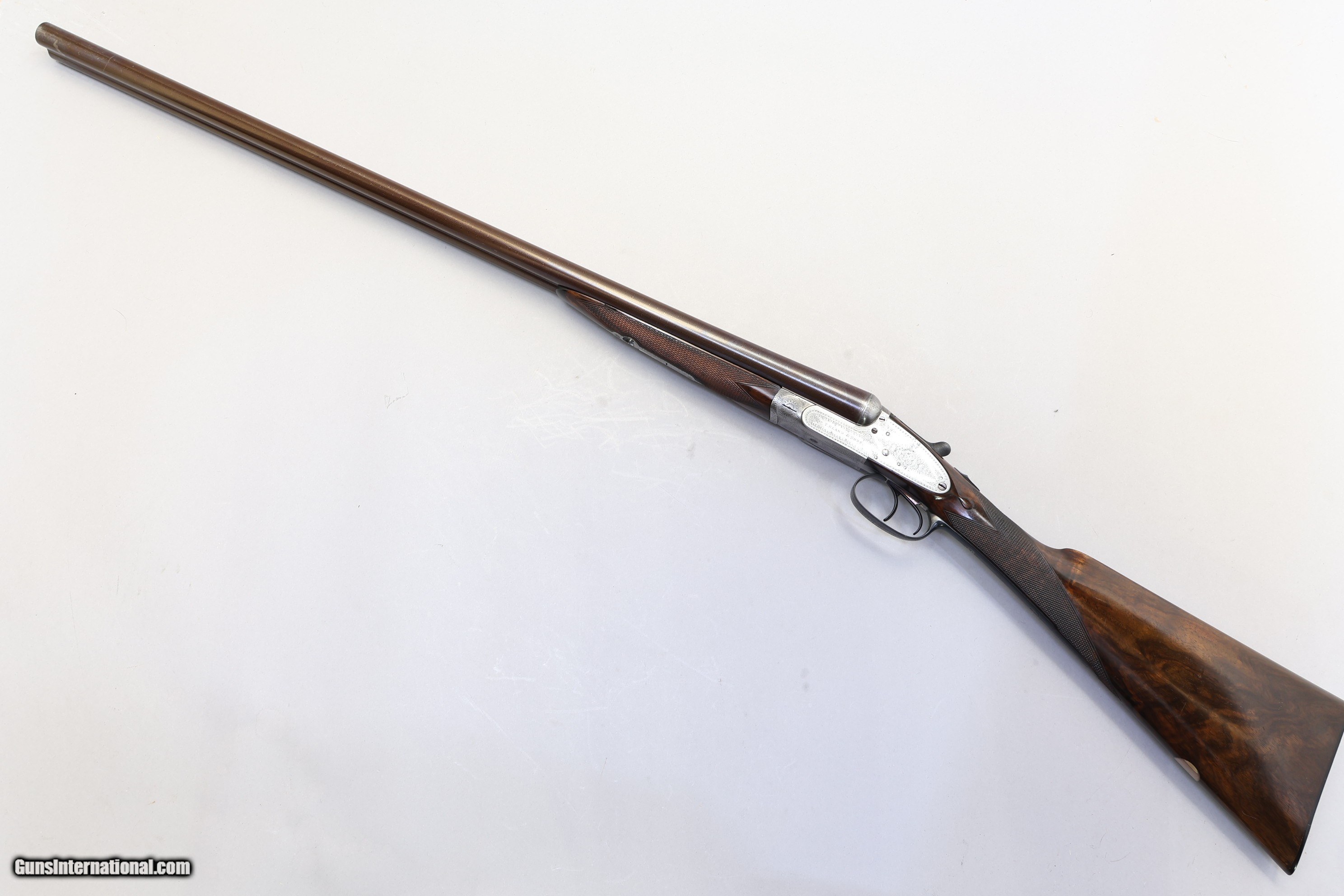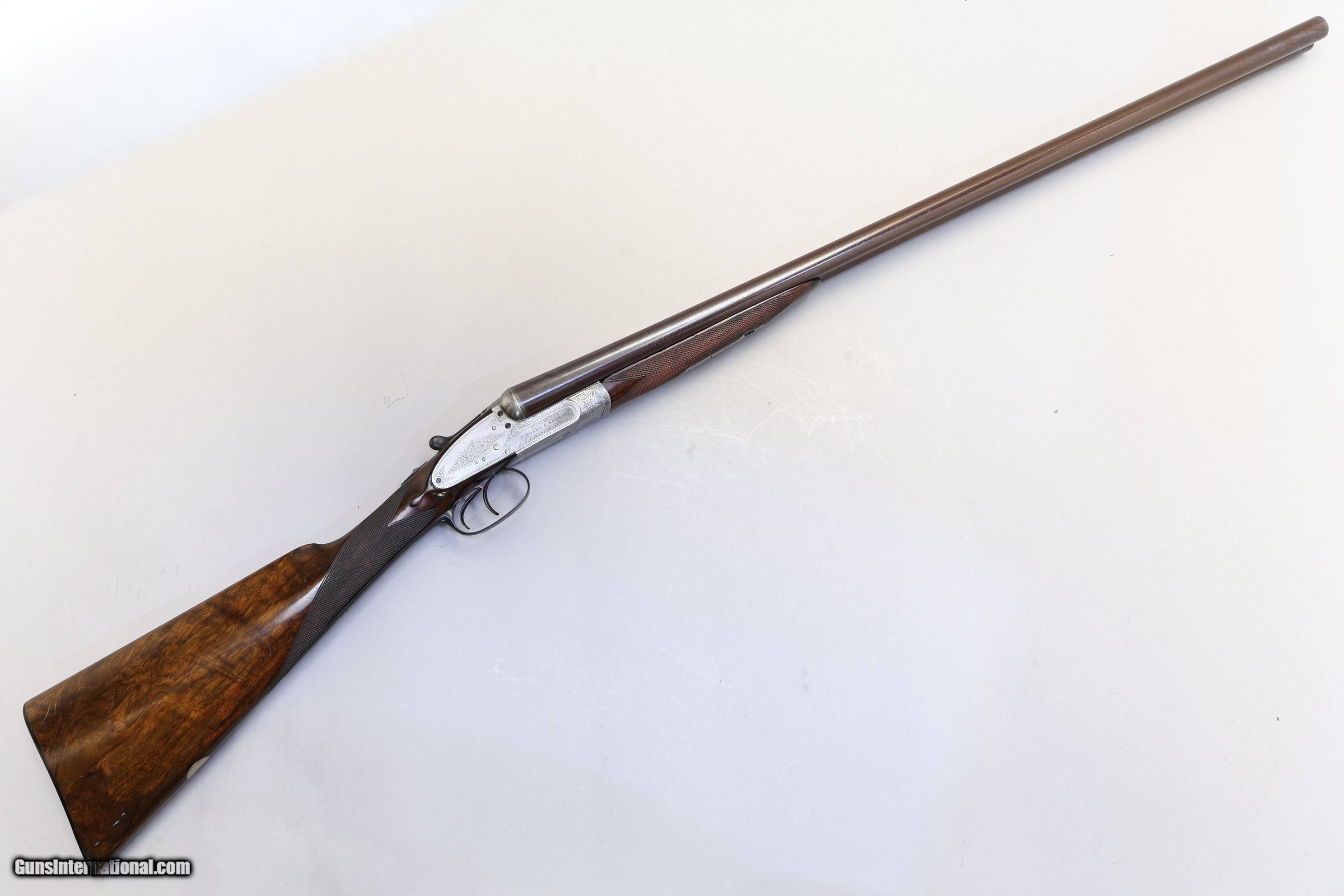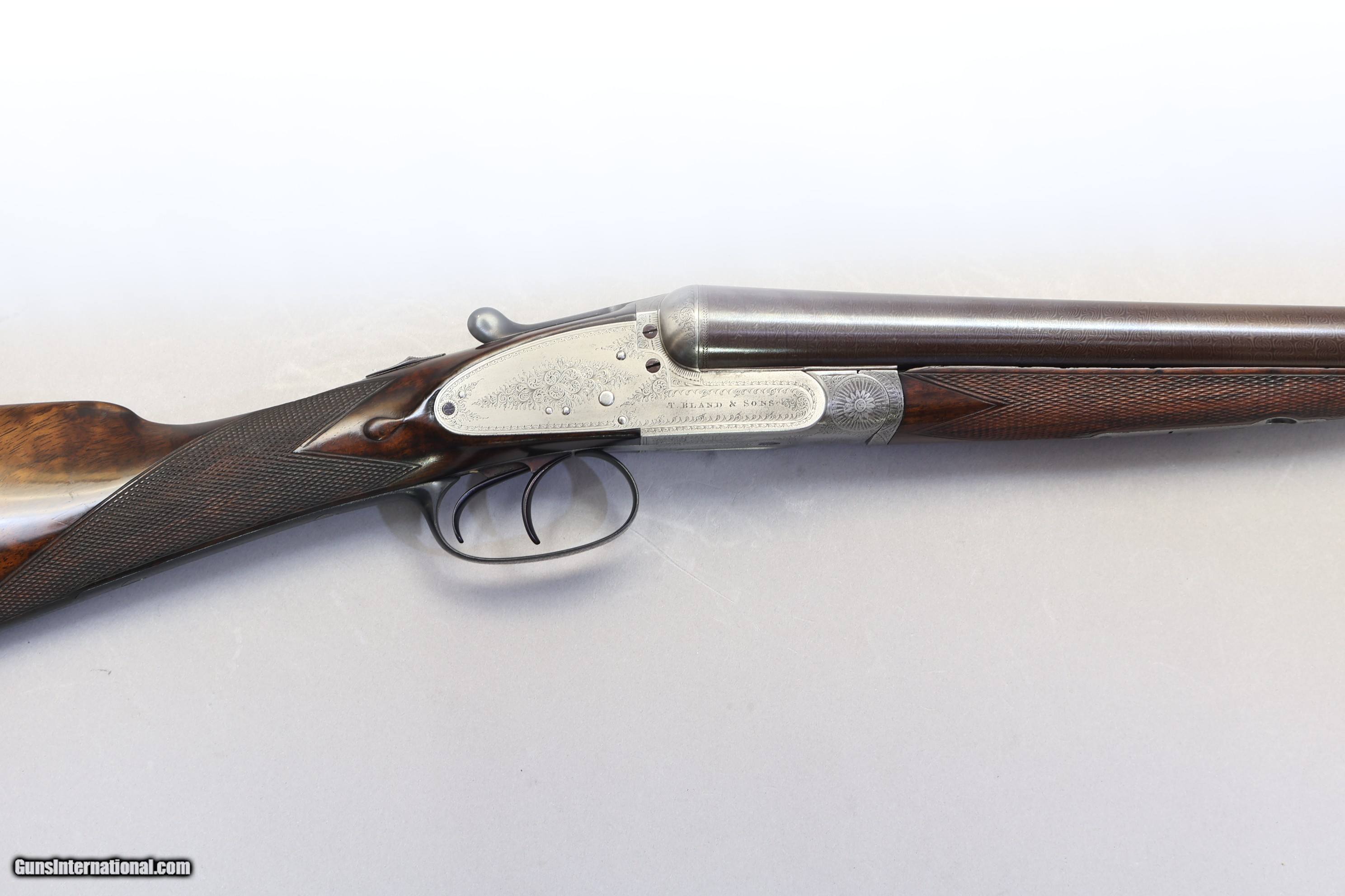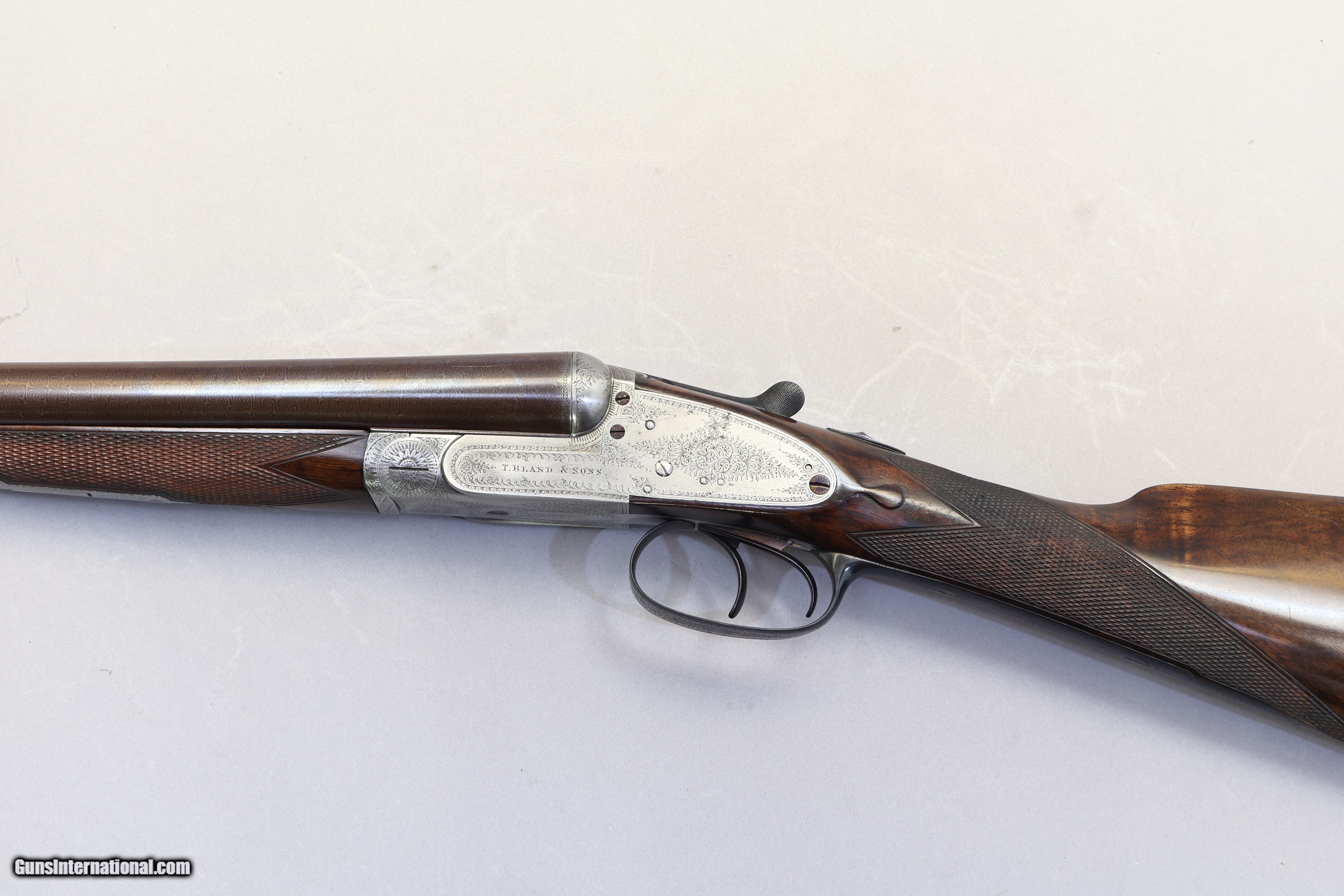 Description: Antique Thomas Bland Sideplate Side by Side, 12 Ga, 30 1/4" Damascus Barrels Antique Thomas Bland Sideplate Side by Side in 12 Ga, a classic British-made field gun built around a sidelock ejector action, featuring 30 1/4" Damascus barrels, 2 1/2" chambers, and a solid rib. It features a Straight English stock and fixed chokes (Left: Full; Right: MOD) for versatile field performance. Gorgeous antique Thomas Bland sideplate side by side for sale. Varnished English walnut wood is in very good condition for its age with only a few surface marks but not diminishing the beauty of the gun in any way. Checkering on stock and fore-end still nice and crisp. Absolutely stunning Damascus barrels with pattern showing through very evidently. Top rib engraving reads "T. Bland & Sons 430 West Strand London". Lovely scroll engraving over receiver and fence. Brass bead sight. Carved wooden butt plate with sharp checkering. Smooth break action. Dating to 1887 in United Kingdom, this Sideplate Side by Side features a Straight English stock with Right-hand cast, LOP 14 1/4", DAC 1 3/4", DAH 2 1/2", and is chambered in 12 Ga. It is licensed for Pre-1899.
