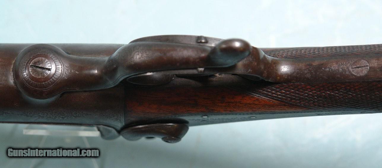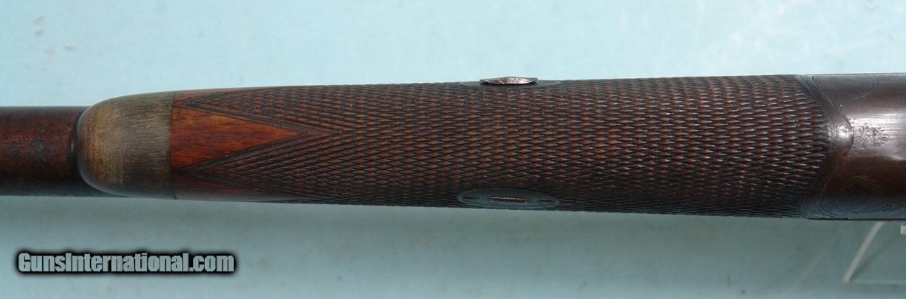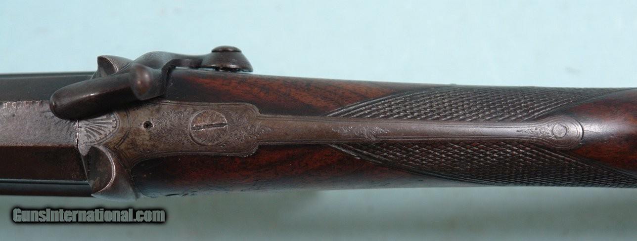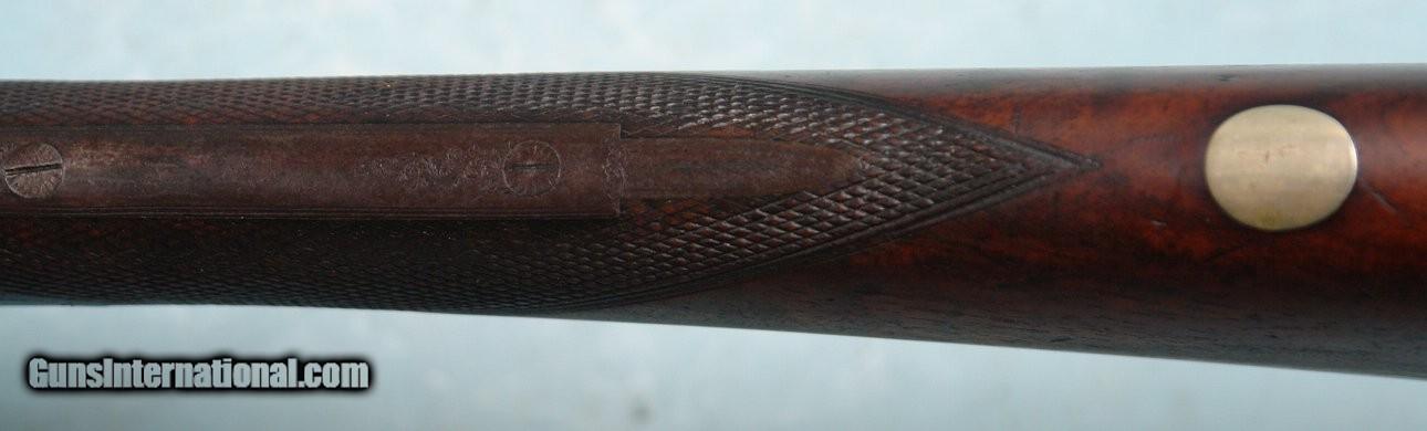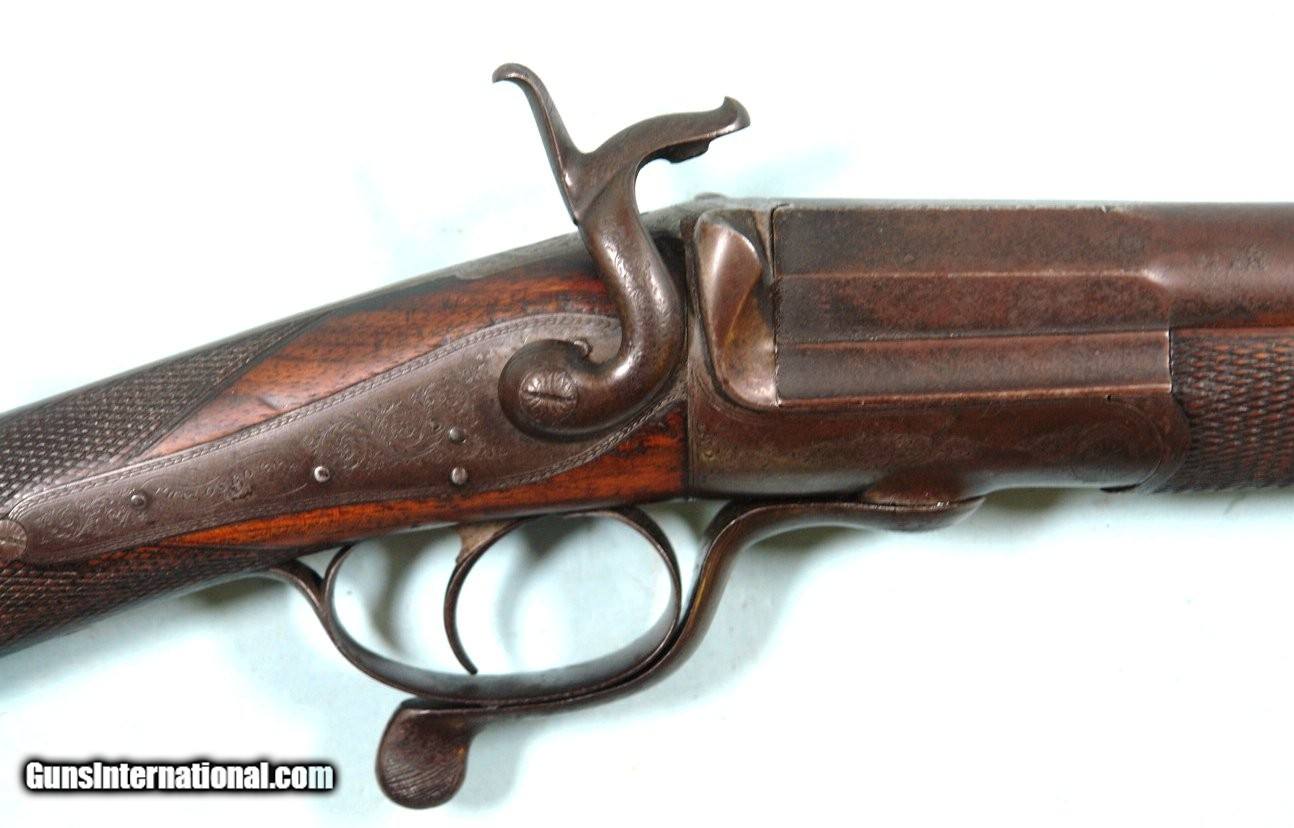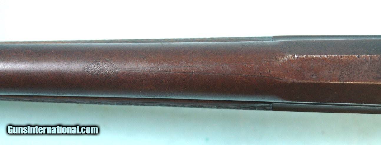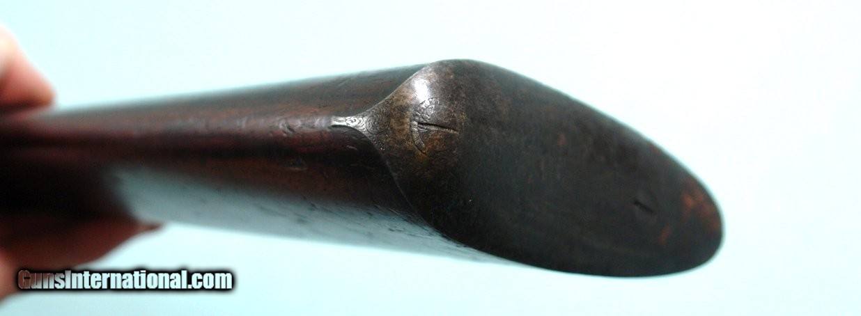 Description: 33120-BRITISH CHARLES OSBORNE BIRMINGHAM SINGLE BARREL HAMMER UNDER LEVER 12 GAUGE PINFIRE SHOTGUN CIRCA 1860’S. 22” Damascus barrel with Birmingham proofs on underside and serial number “13”. Back action lock signed “CHAS. OSBORNE”. Straight grip walnut checkered stock with steel butt plate. Checkered forend with horn forend cap. Scarce British pinfire. Barrel shortened otherwise all original and in very good condition with old original patina mixed with blue and plum brown original finish. Working order and bore with light pitting. Wood with original finish. Scarce. $300. Antique: Yes Shotgun Gauge: 12 Gauge Price: $300.00 Contact Seller |