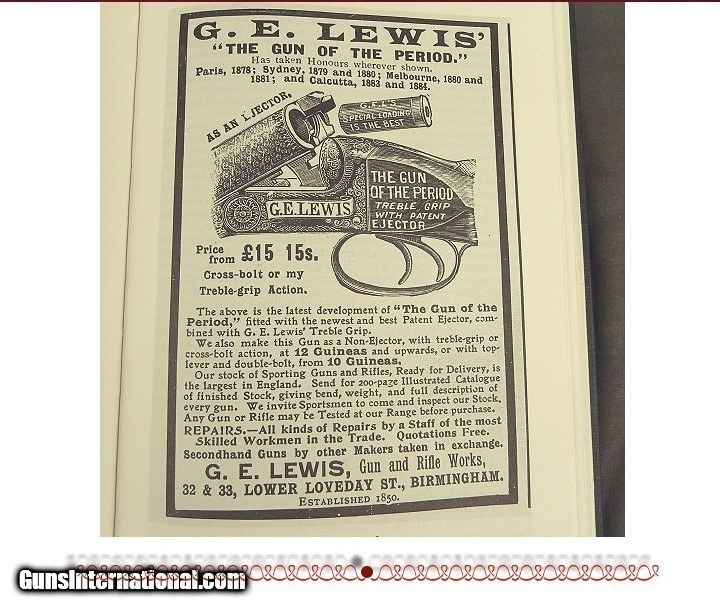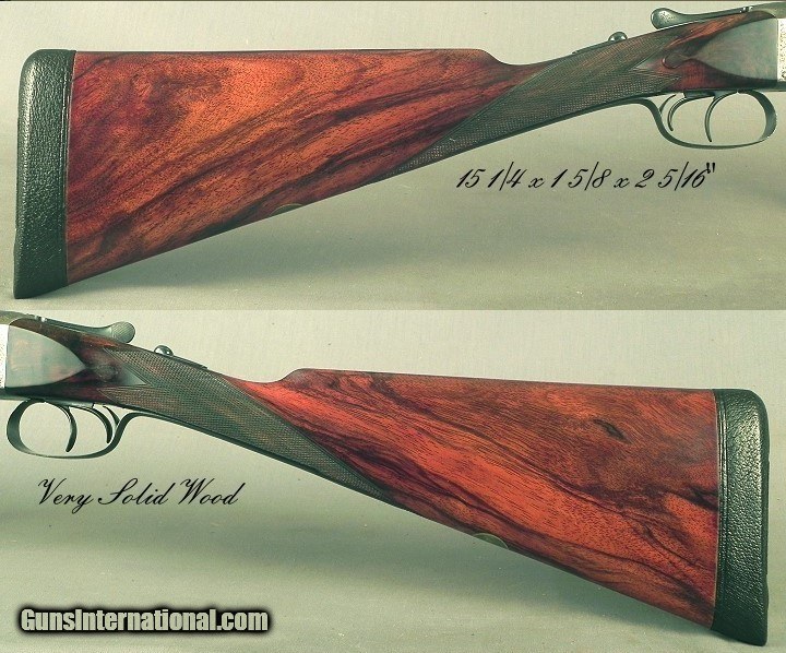 Description: #10911, G. E. (George Edward) Lewis, A 20 Bore Made in 1903 with Nitro Proved Damascus Barrels, The Barrels were Original Nitro Proof in 1903 and then Modern Nitro Proved in London in 2001 to 2 3/4" at 950 BAR, 28" Ejector Damascus Barrels at .673 .018 & .027" (Imp.Mod. & Full), 2 3/4" chambers, Wall Thickness on the Right barrel at .026" and the Left barrel at .030", The 28" barrels have Ejectors with a rib extension plus a third bite (Treble Grip), They are Dovetail Lump Barrels, The versatile Anson & Deeley action, Double triggers, Splinter forend with a Deeley & Edge bottom forend, Straight hand stock at 15 1/4 x 1 5/8 x 2 5/16" over a 1" leather pad with plugs for removal, Cast-Off for the right hand, Excellent Game Gun weight of 5 lbs. 14 oz., Very nice piece of wood, 55% engraving coverage, This piece was completely redone in London, most likely by Ron Solari and then imported to the U. S. by Cyril Adams in Houston. They worked closely together and Cyril brought a lot of English guns to our shores, No case colors remain, Barrel brown at 100%, The wood remains at 98-99%, The checkering is at 100%, The bores have been opened and now remain in absolute excellent condition, The barrels outside are excellent plus, It is tight on the face with excellent bite left. The whole is cased in a leather cornered Canvas trunk with cleaning gear and a trade label. This is an honest and nice handling early Pre-War British boxlock that now is in excellent condition. This piece has a lot of life left in it. The rib is engraved " The Gun Of The Period G. E. Lewis 32 & 33 Lower Loveday St. Birmingham". G. E. Lewis was started in 1850 and was still operating as the G. E. Lewis firm until April of 1996. They had a trademark gun called the "Gun of the Period". Mr. Lewis had 2 sons that later ran the business. They in turn had sons and another George Lewis was appointed a Guardian of the Birmingham Proof House in 1951. In 1988 John Harris, an expert stocker, acquired the business and in 2003 Holts sold the business as a going concern. The firm was again sold at in 2009. From about 1880 to 1914 Lewis made guns were imported into the United States by Von Lengerke & Detmold of New York City. Curio/Relic: Yes Antique: Yes Shotgun Gauge: 20 Gauge Price: $3,950.00 Contact Seller |
