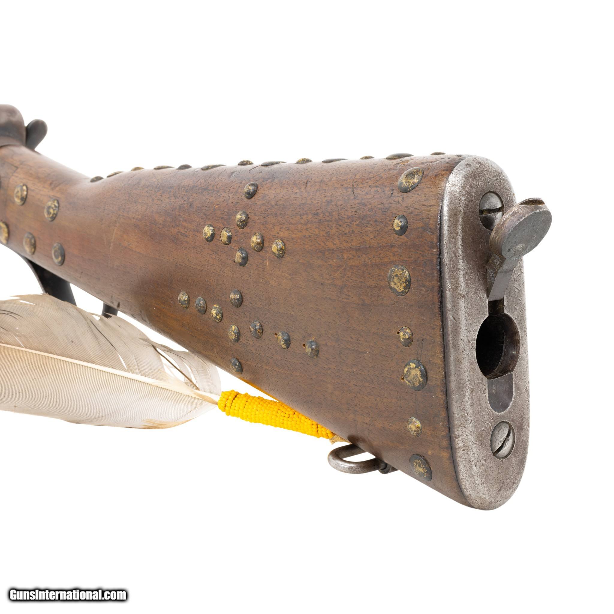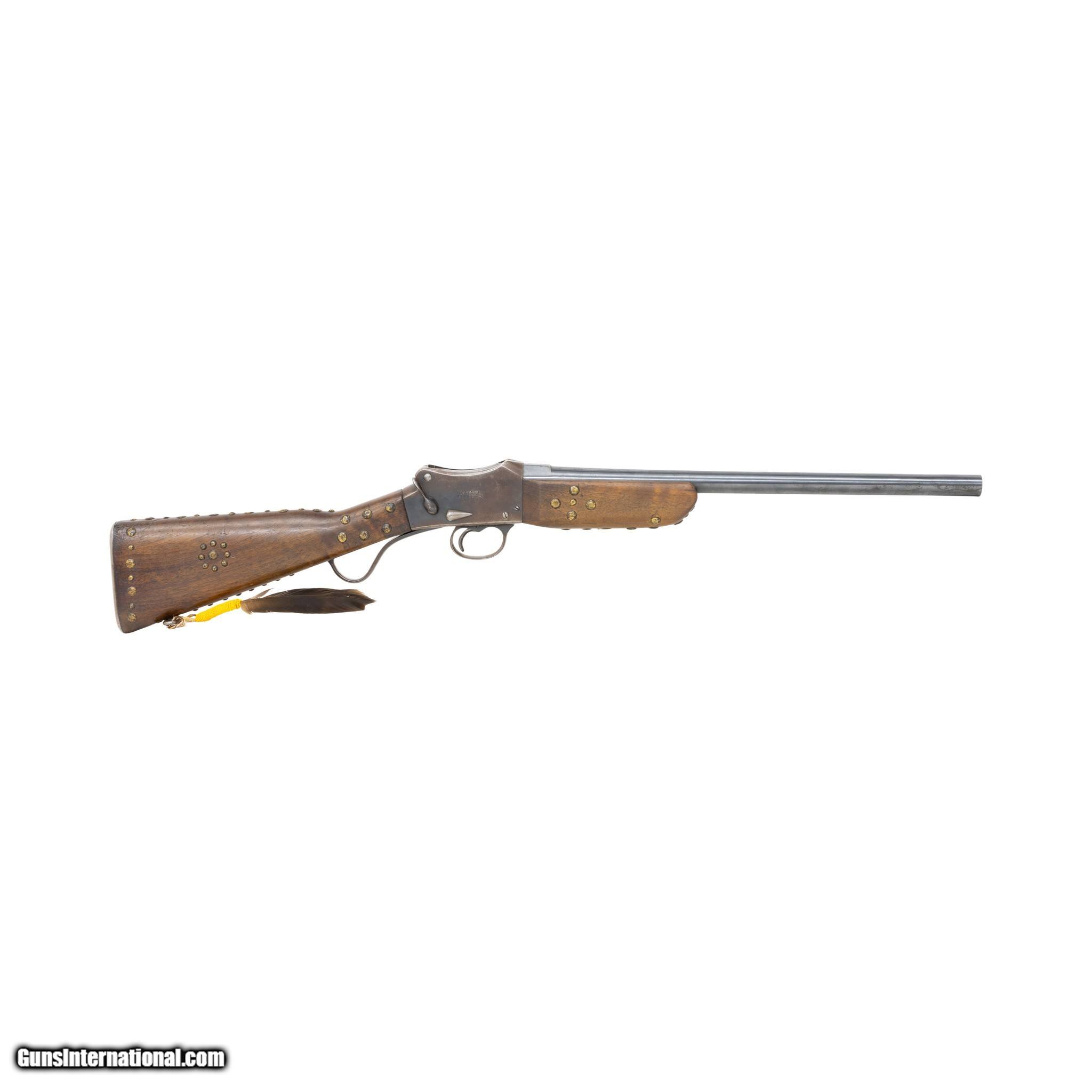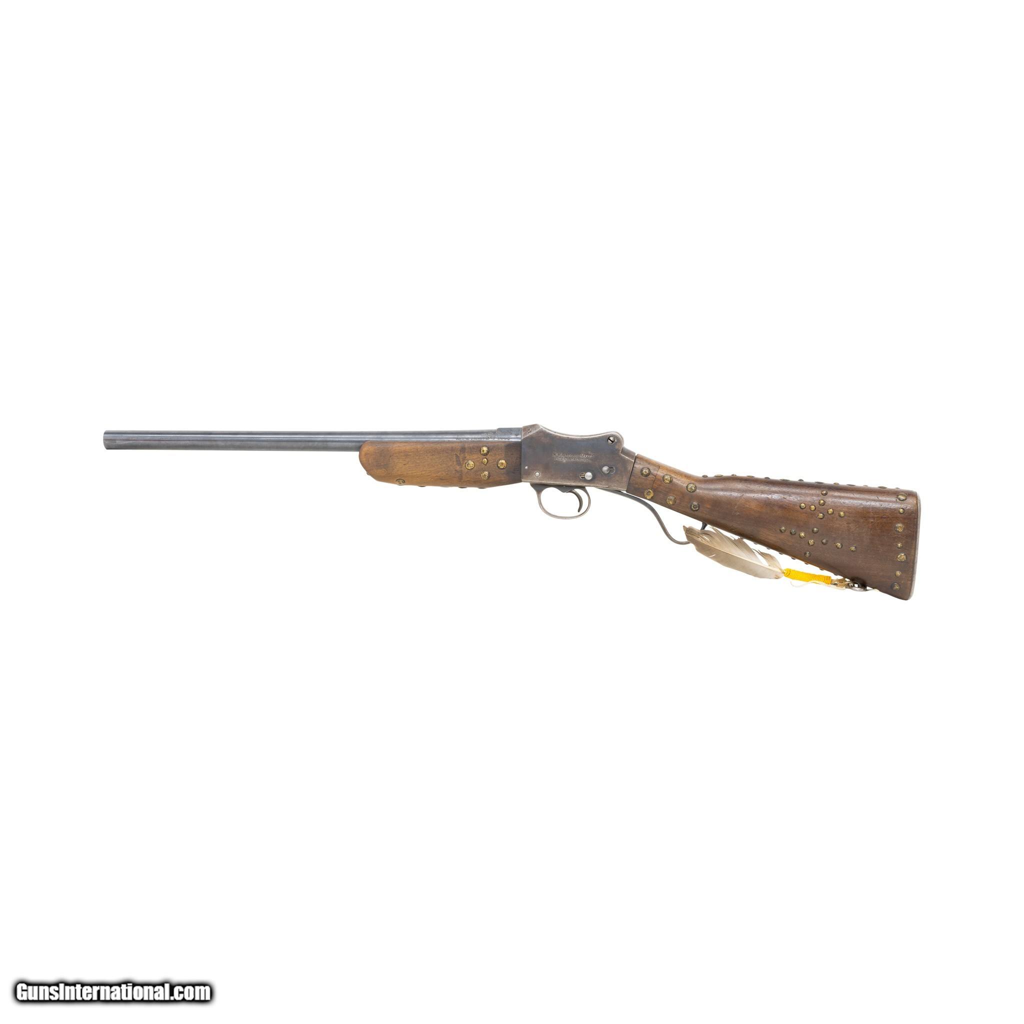 Description: Modified Greener Mark III Police Gun Martini action shotgun. 12 gauge, 18” round to octagon barrel. Barrel stamped Greener Mark III along with standard British proof markings. The shotgun features a wood stock with steel hardware including receiver, trigger guard, hammer, lever, buttstock and single sling mount. The buttstock contains a hinged compartment for ammo or cleaning rod storage. The shotgun is mechanically functioning. The Martini action along with safety levers function accordingly. Cosmetically, the gun is in fair condition. The receiver retains 45% of its original blueing. The barrel retains 95% of the original blueing but appears to have been cut down in length. The forestock has also been modified (originally it would have featured a barrel length full stock.) There is one area near the grip, where the wood has been professionally repaired. The bore has not been visually inspected (requires a borescope.) The police shotgun has been enhanced with a series of brass tacks as well as a beaded feather drop. These are believed to be later additions added to the shotgun to enhance the visual appearance. Most Greener Mark III Police Guns were used to supply the Egyptian Police force. However this particular shotgun is marked as a standard 12 gauge with 2 7/8 ths inch shells. These guns were marketed in the United States for security guards and corrections applications. The Native American adornments seem an odd match and unoriginal to this vintage shotgun. Serial Number W8796 Manufacturer: Greener Model: Mark III Serial Number: W8796 Barrel Length: 18 Price: $500.00 Contact Seller |