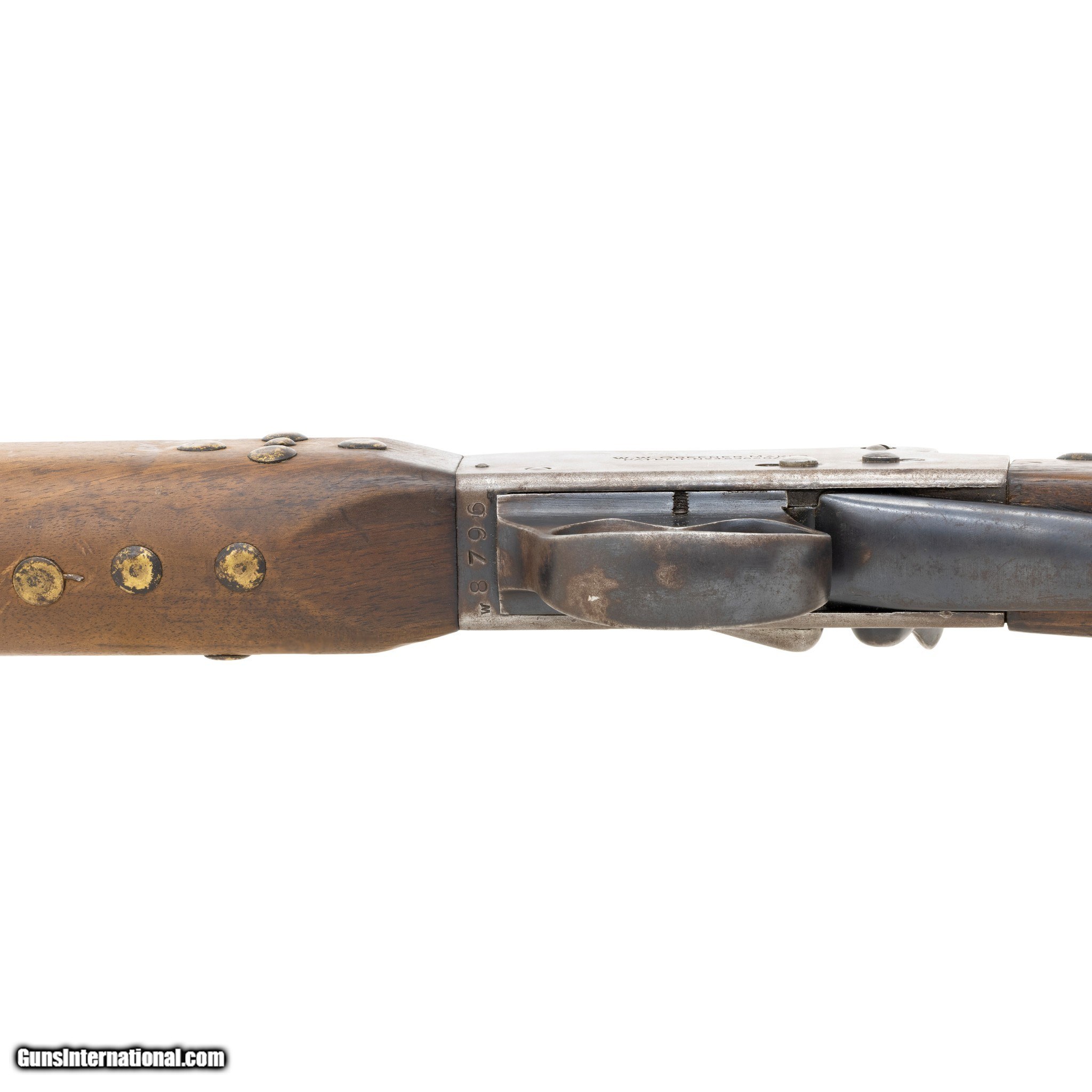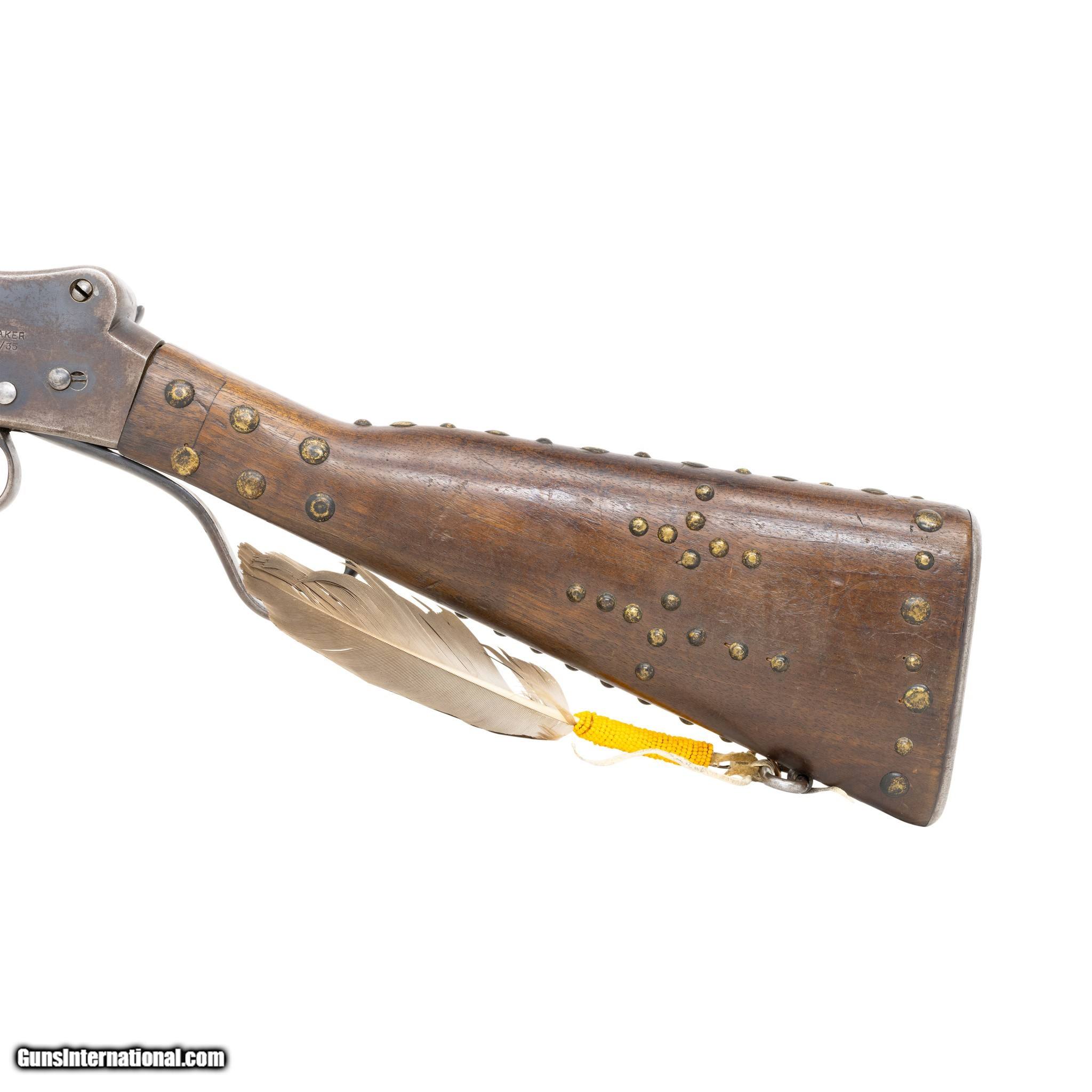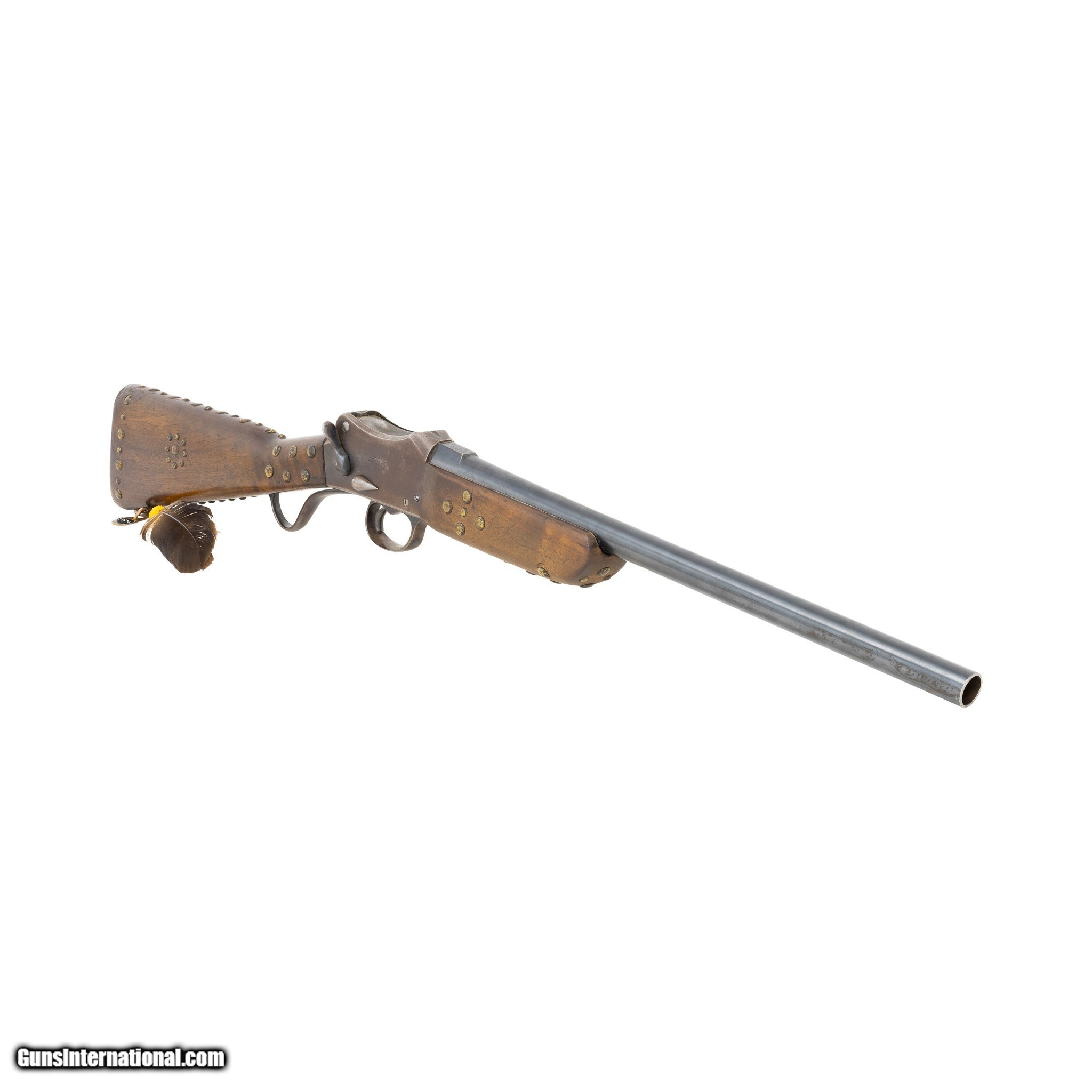 Description: Modified Greener Mark III Police Gun Martini action shotgun. 12 gauge, 18” round to octagon barrel. Barrel stamped Greener Mark III along with standard British proof markings. The shotgun features a wood stock with steel hardware including receiver, trigger guard, hammer, lever, buttstock and single sling mount. The buttstock contains a hinged compartment for ammo or cleaning rod storage. The shotgun is mechanically functioning. The Martini action along with safety levers function accordingly. Cosmetically, the gun is in fair condition. The receiver retains 45% of its original blueing. The barrel retains 95% of the original blueing but appears to have been cut down in length. The forestock has also been modified (originally it would have featured a barrel length full stock.) There is one area near the grip, where the wood has been professionally repaired. The bore has not been visually inspected (requires a borescope.) The police shotgun has been enhanced with a series of brass tacks as well as a beaded feather drop. These are believed to be later additions added to the shotgun to enhance the visual appearance. Most Greener Mark III Police Guns were used to supply the Egyptian Police force. However this particular shotgun is marked as a standard 12 gauge with 2 7/8 ths inch shells. These guns were marketed in the United States for security guards and corrections applications. The Native American adornments seem an odd match and unoriginal to this vintage shotgun. Serial Number W8796 Manufacturer: Greener Model: Mark III Serial Number: W8796 Barrel Length: 18 Price: $500.00 Contact Seller |