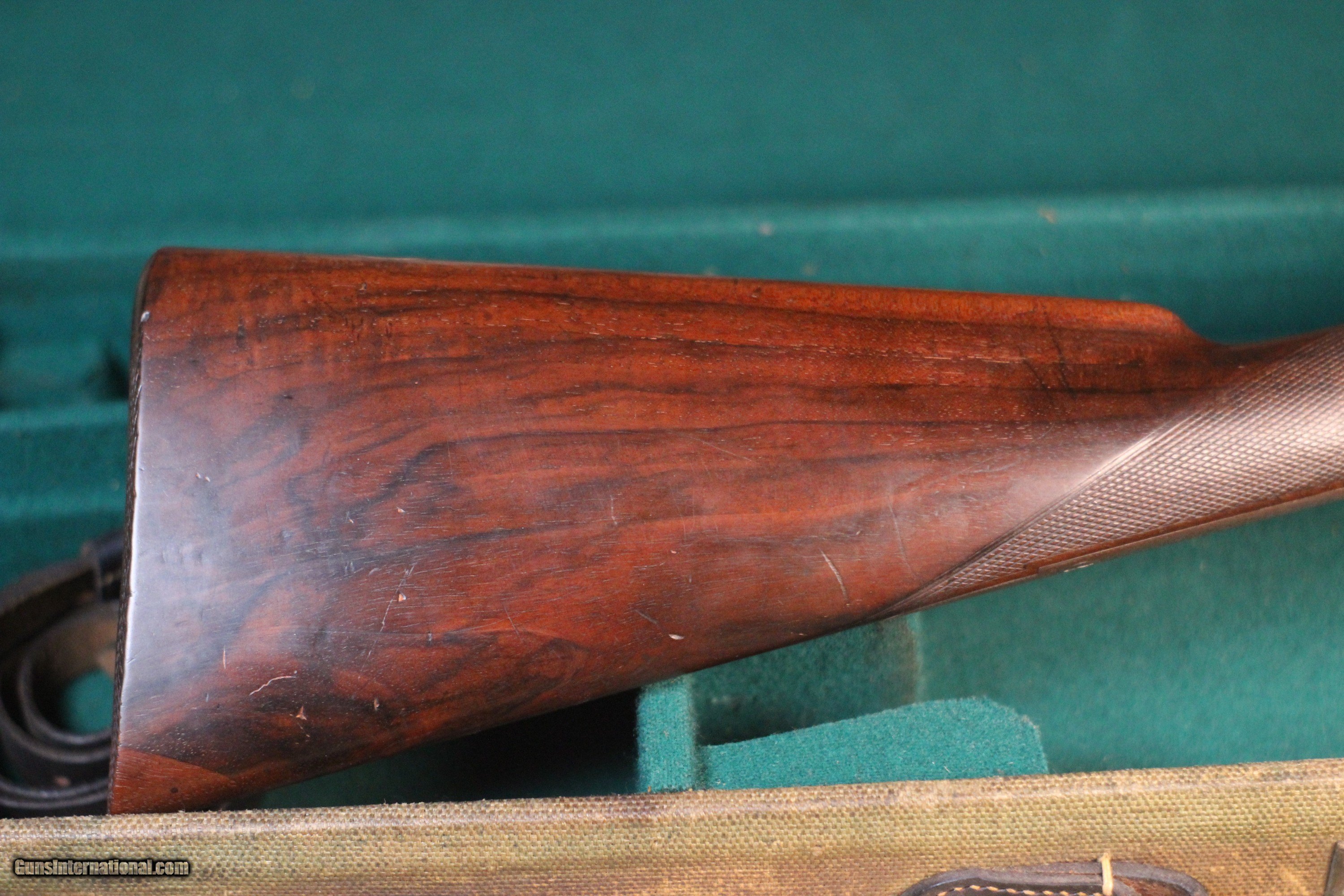 Description: Scott's patent crystal inspection ports 28in Damascus Barrel with Dove tail lump Very good bores with 2 3/4in chambers Right barrel measures .019 wall thinkness 9 inches from muzzle Left barrel measures .024 wall thickness 9 inches from muzzle Barrels retain 80% damascus pattern Action has faded to silver Wood is solid no cracks except chip at forend tip Checkering reasonably shark and all there Right barrel with rivlets from repaired dents 13 7/8 LOP with factory checkered butt Action and side plate beautifully contoured and covered with fine english scroll With original case 2 3/4in chambers Serial 5237 No pitting Collector quality +$50 shipping SOLD Shotgun Gauge: 12 Gauge |
