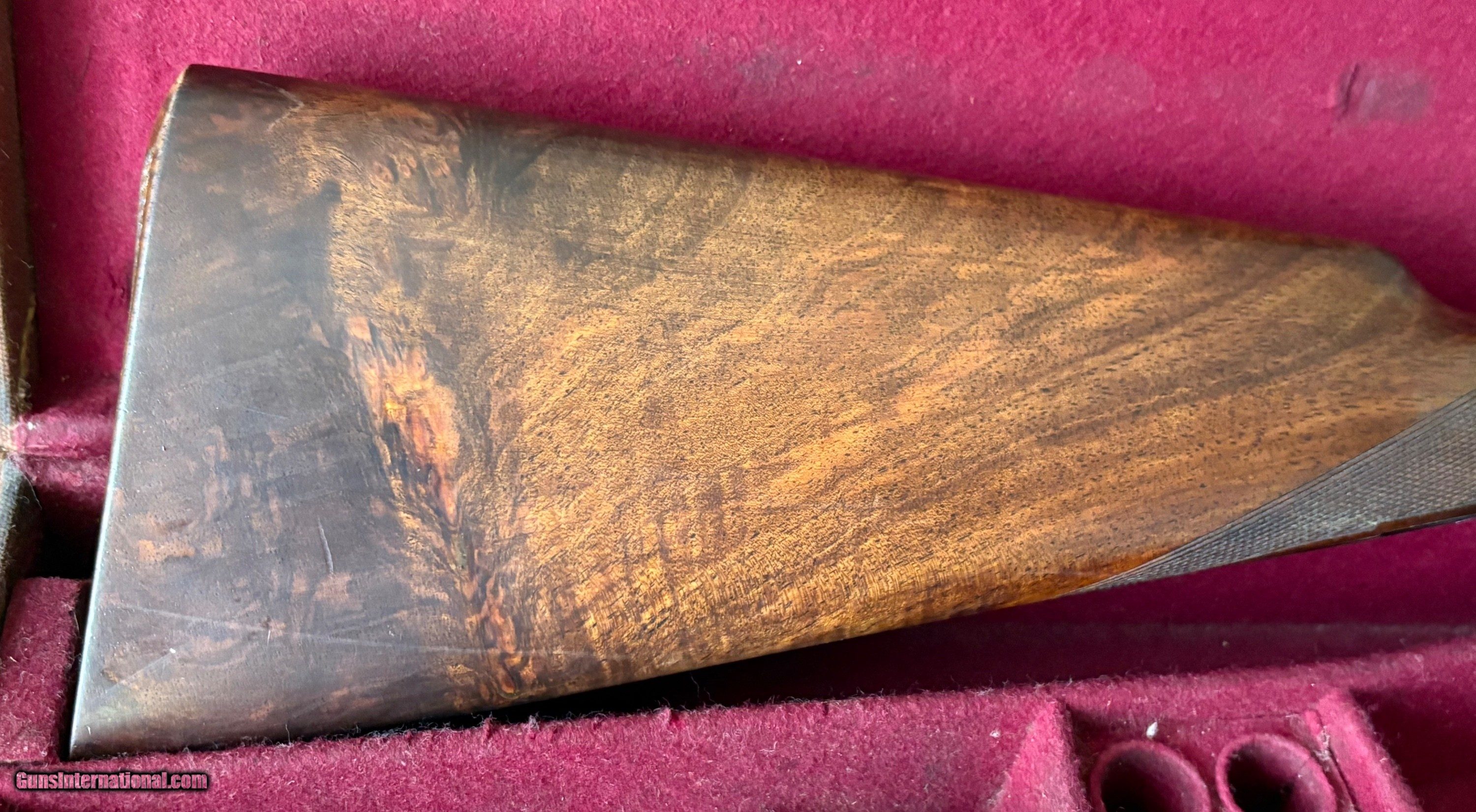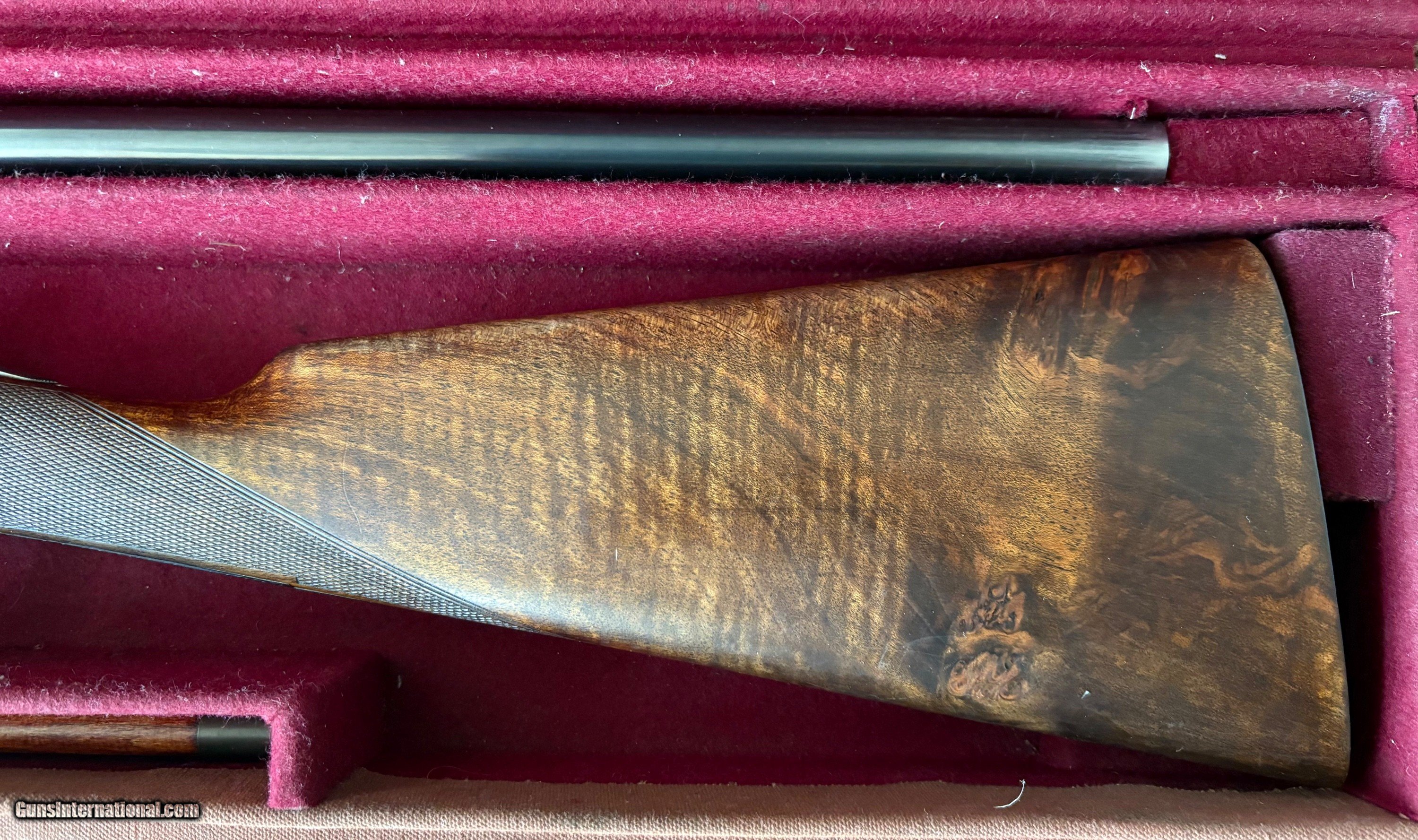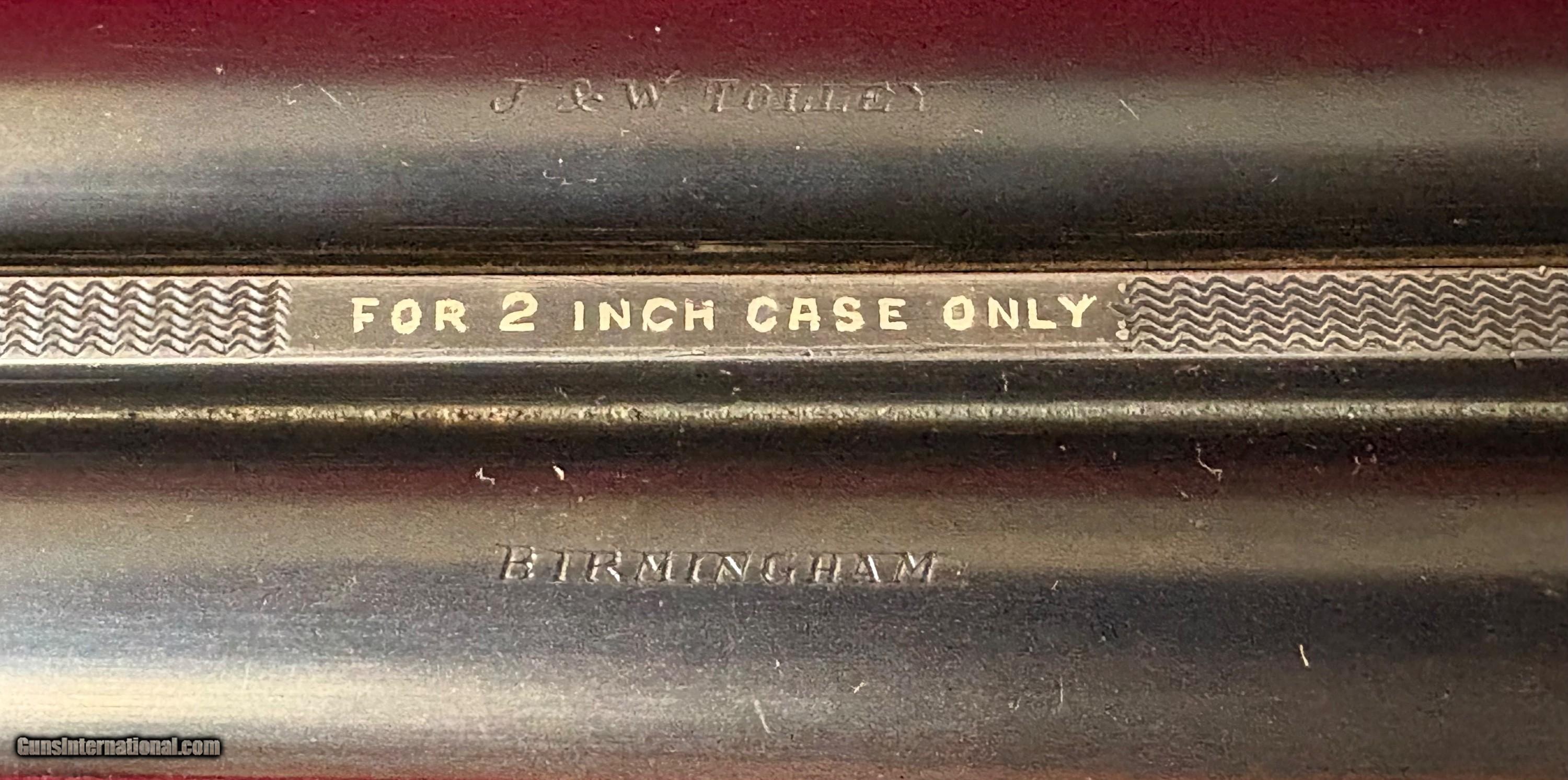 Description: Really nice J&W Tolley 12ga 2” "FOR TWO INCH CASE ONLY" Petite round-top action locks up tight. Engraving sharp. Screws good. Ejectors strong. Nicely figured stock. 14" LOP from rear 15” LOP from front. No cast. 2” DAH. 1.5” DAC 26" barrels Bores are excellent. IC/Full Min wall thickness .023/.024 Nitro proofed. Lightweight only 5.5lbs Includes fitted case. Case is dirty and stained but remains solid and functional. Free Ship CONUS Shotgun Gauge: 12 Gauge Manufacturer: Tolley Model: 2” Barrel Length: 26 Ejectors: Yes Condition: VG Metal Condition: VG Wood Condition: VG Bore Condition: Excellent Weight: 5.5 Case: Yes Proof:Nitro: Yes Price: $2,850.00 Contact Seller |