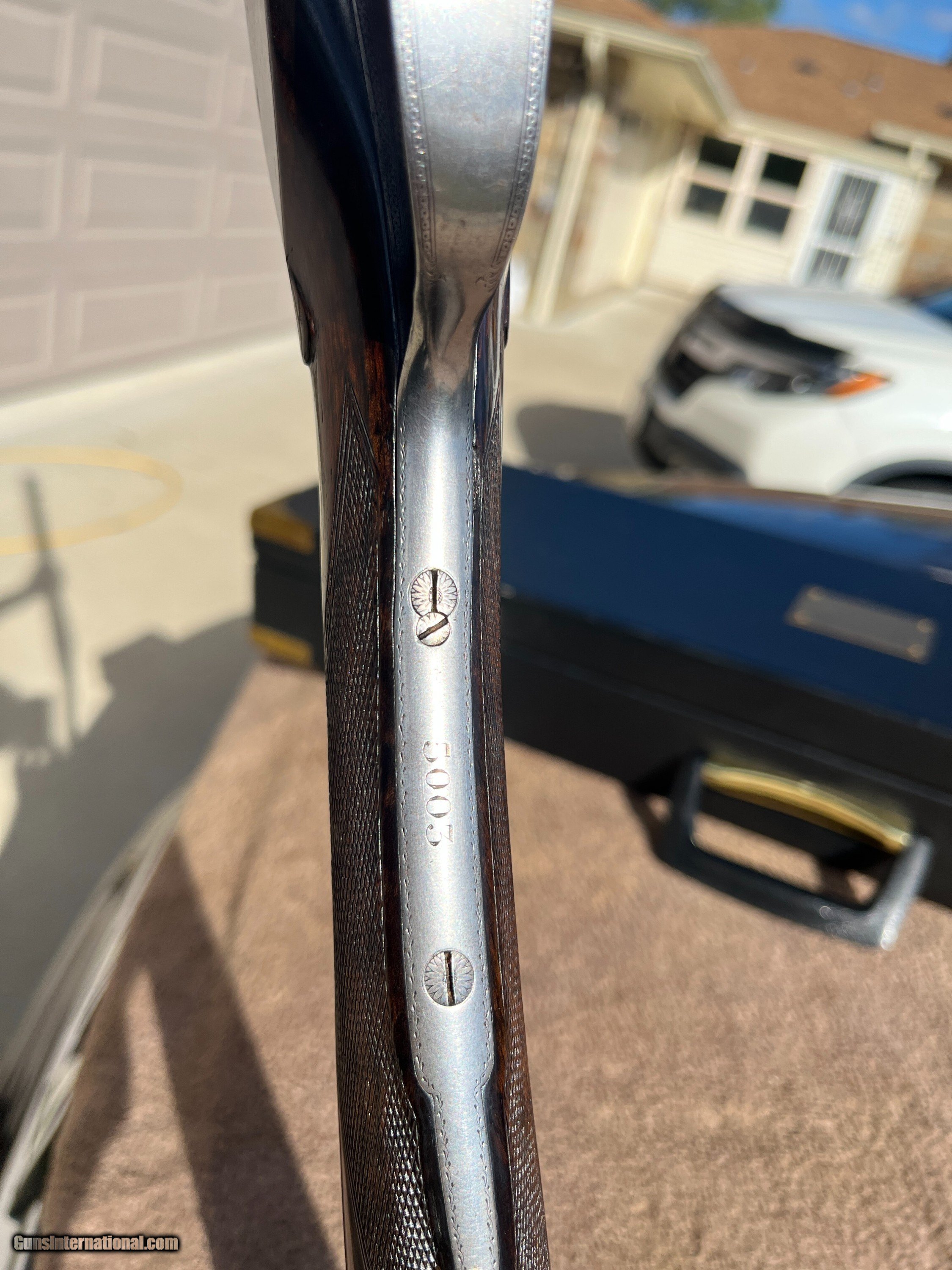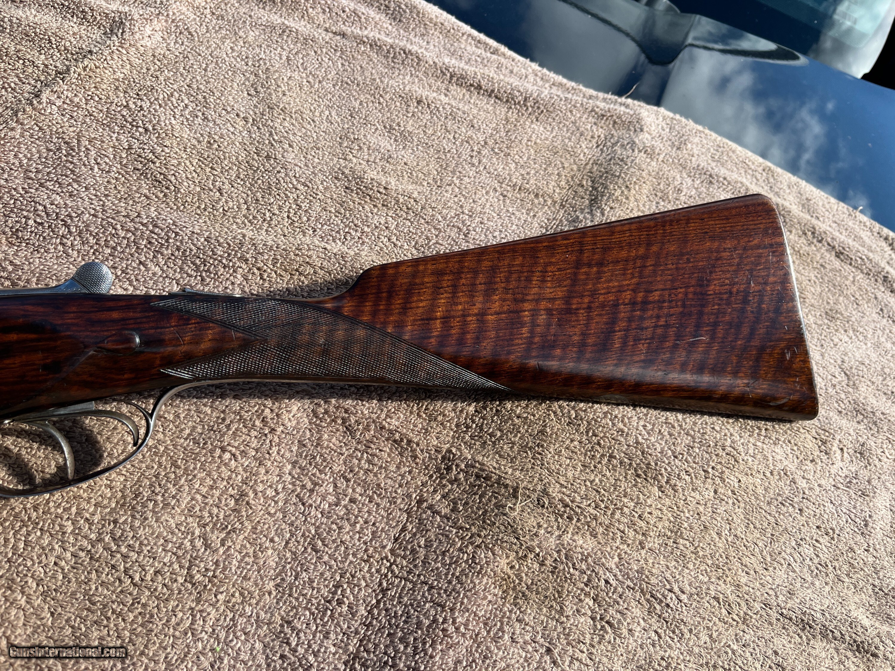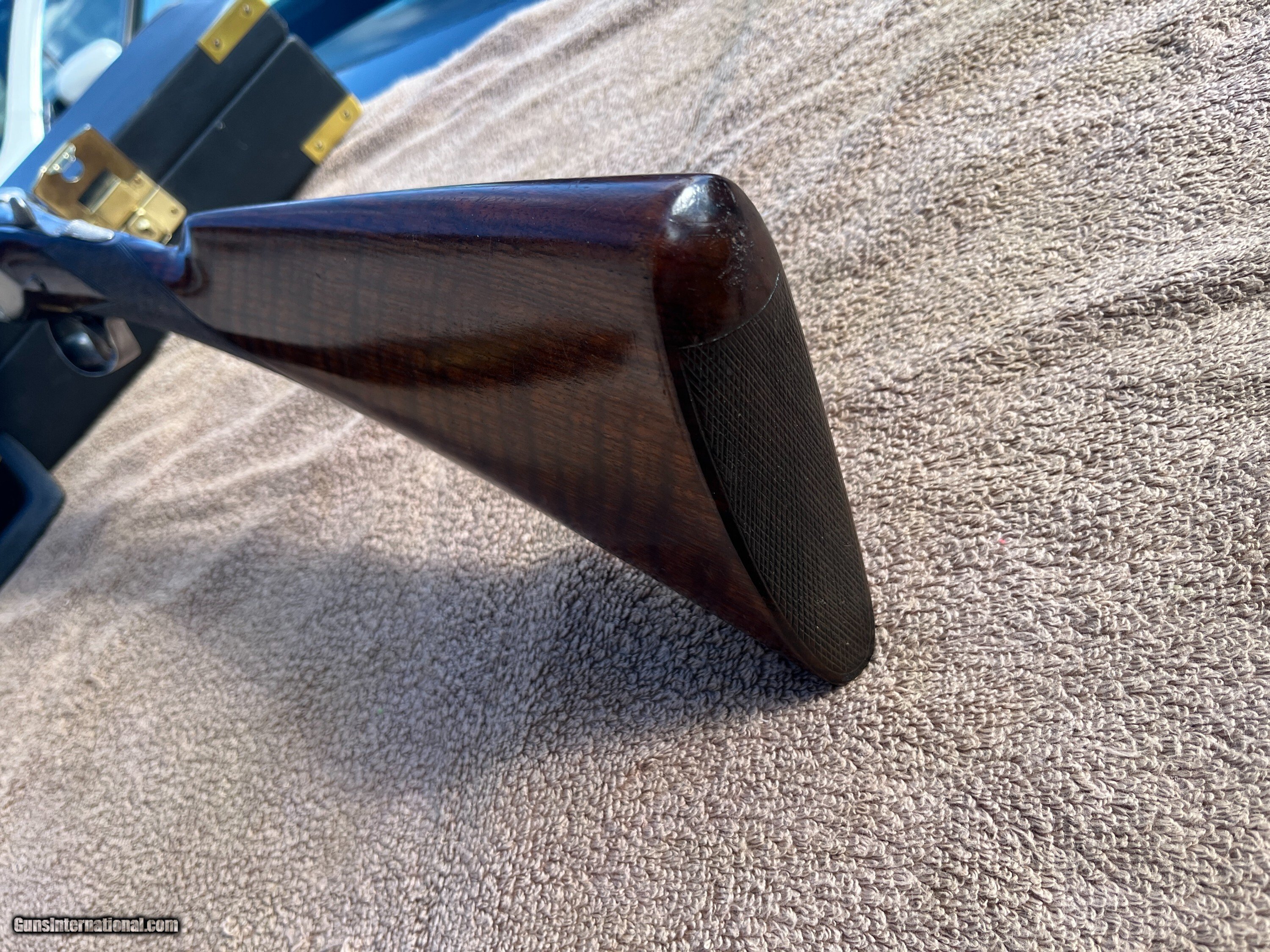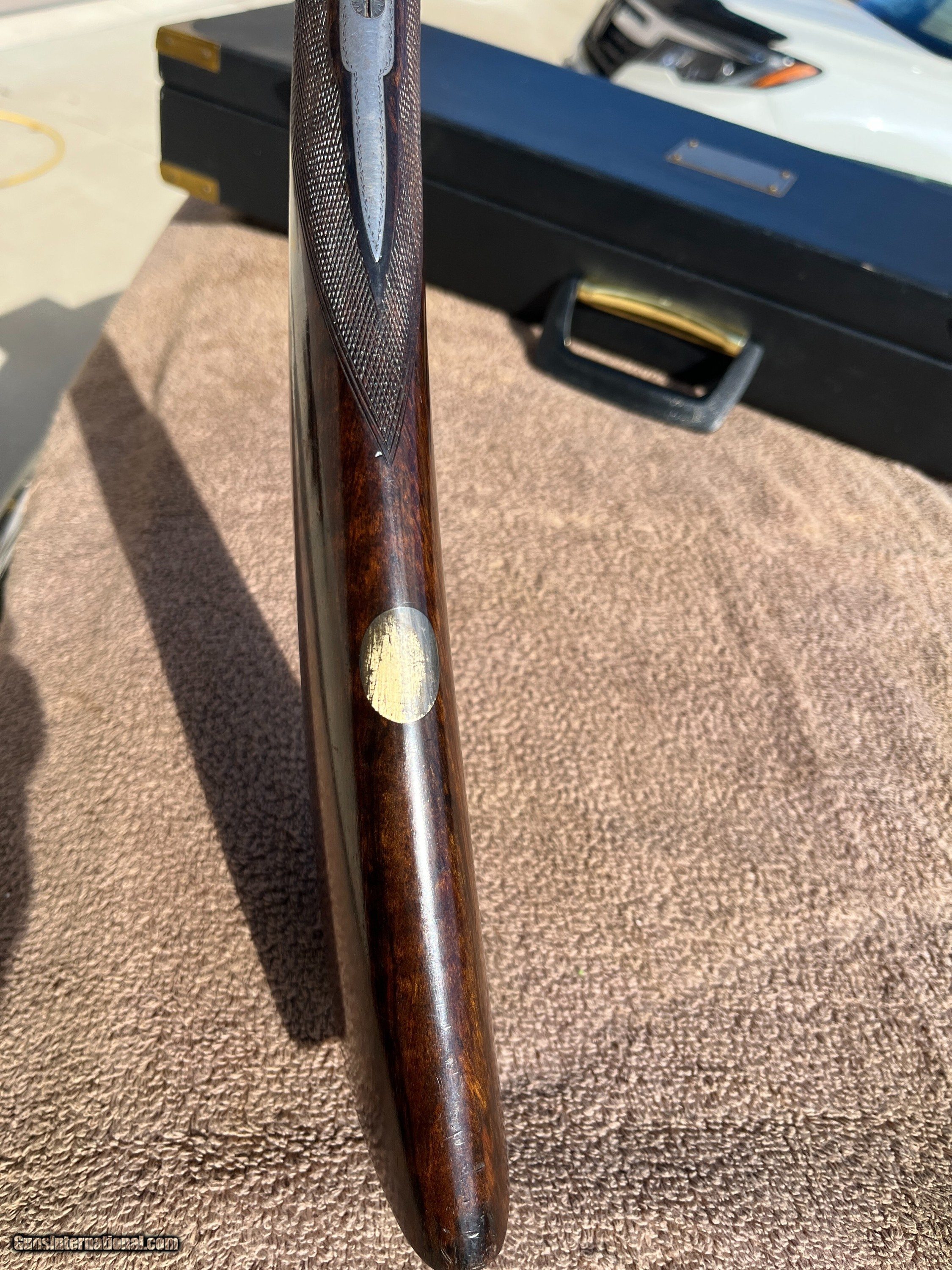 Description: On Consignment. Here is a really sweet English box lock, ejectors with nice wood and all original finishes made in the late 20-s. This is a crossover stocked gun for shooting right hand with both eyes open. Stock has extreme cast off allowing the top rib to center more left allowing for a (Right hand shooter who is left eye dominant.) Uncut 27" Barrels have 90-95% blue and shows one wear spot on the left barrel just above the forend wood about 1 1/4 by 3/8. Looks like some blood from the forward hand that got on the barrel and removed some of the blue, no metal damage. About 70% forplate blue and the rest of the metal is silvery, no rust damage, dents or scratches in metal. Chokes are cly and mod, 2 3/4 chambers, tight on face and ring true. Wood is really nice original finishes, rear factory checkered at 15 1/8 pull over front trigger, 1 3/8 comb, 2" at thee heal. 6lbs-10oz on postal scale! This gun has a three day inspection, buyer pays all shipping and insurance fee's if returned. We ship UPS ground fully insurde to C&R or FFL# only. Can be bought at our store New Middletown Ohio. Note we will be grouse hunting and the shop will be closed Oct-18th through Monday Nov-3rd E-mails may take a day or two for me to respond. Thanks Kenny Price: $2,500.00 Contact Seller |