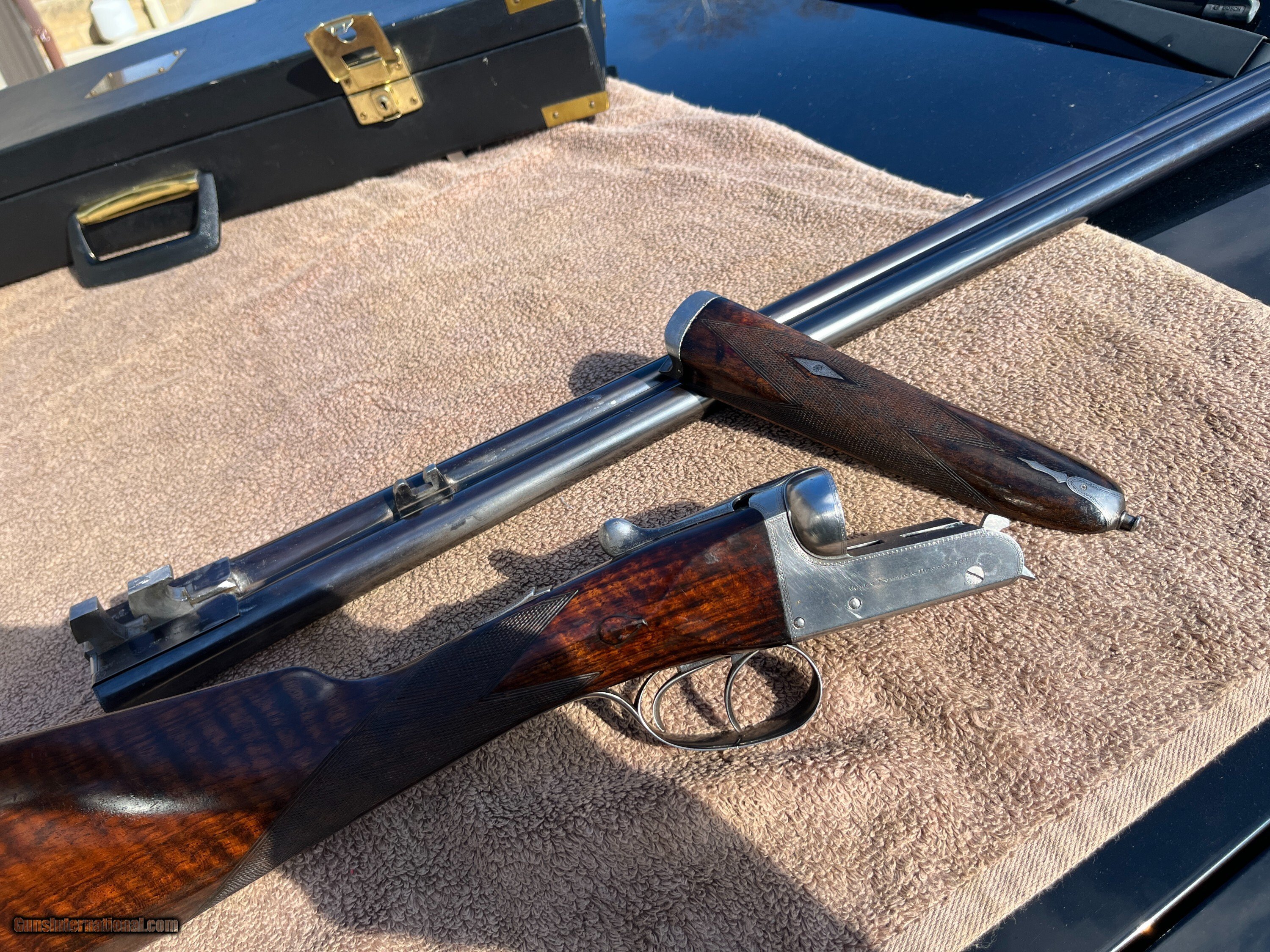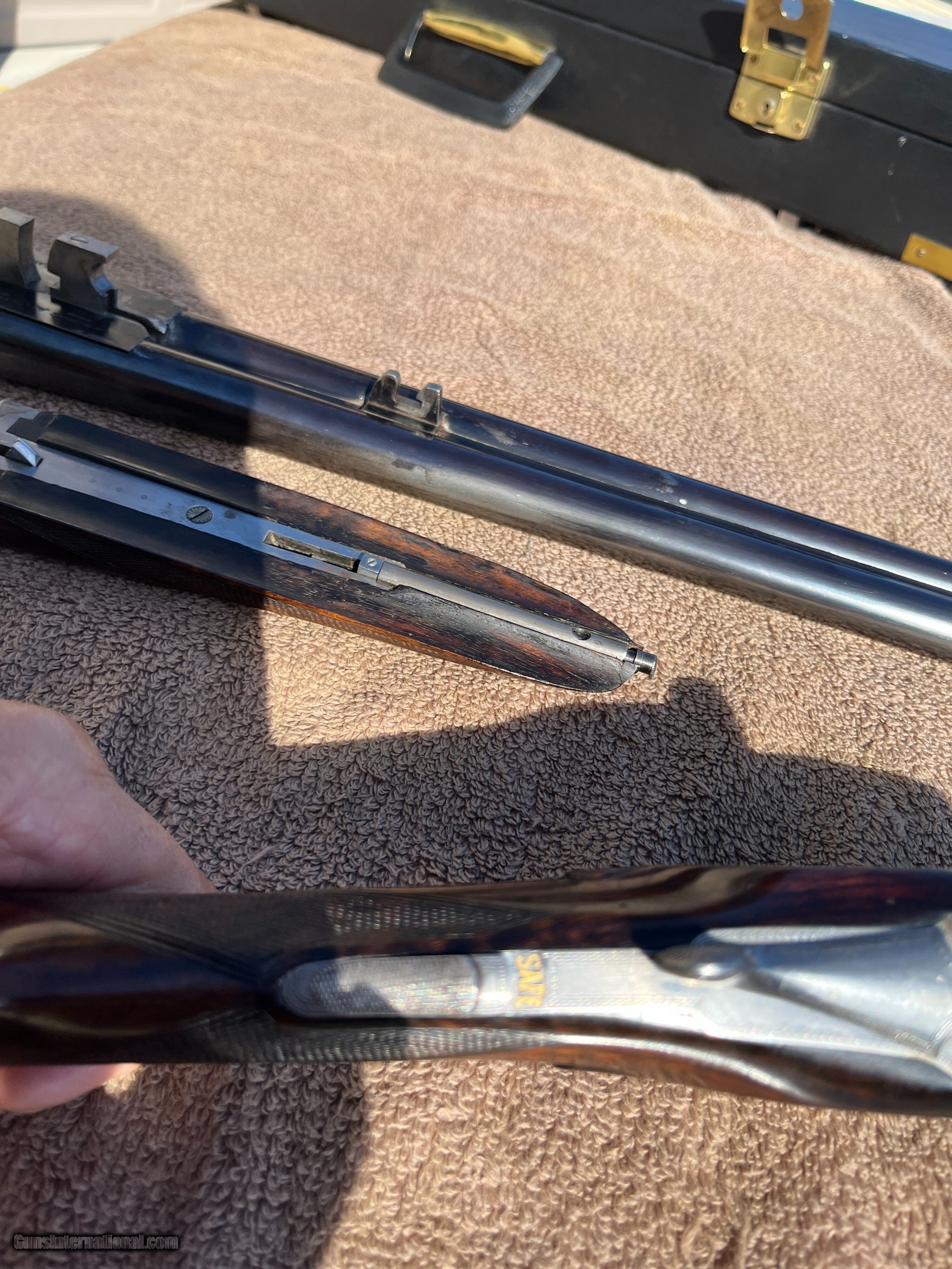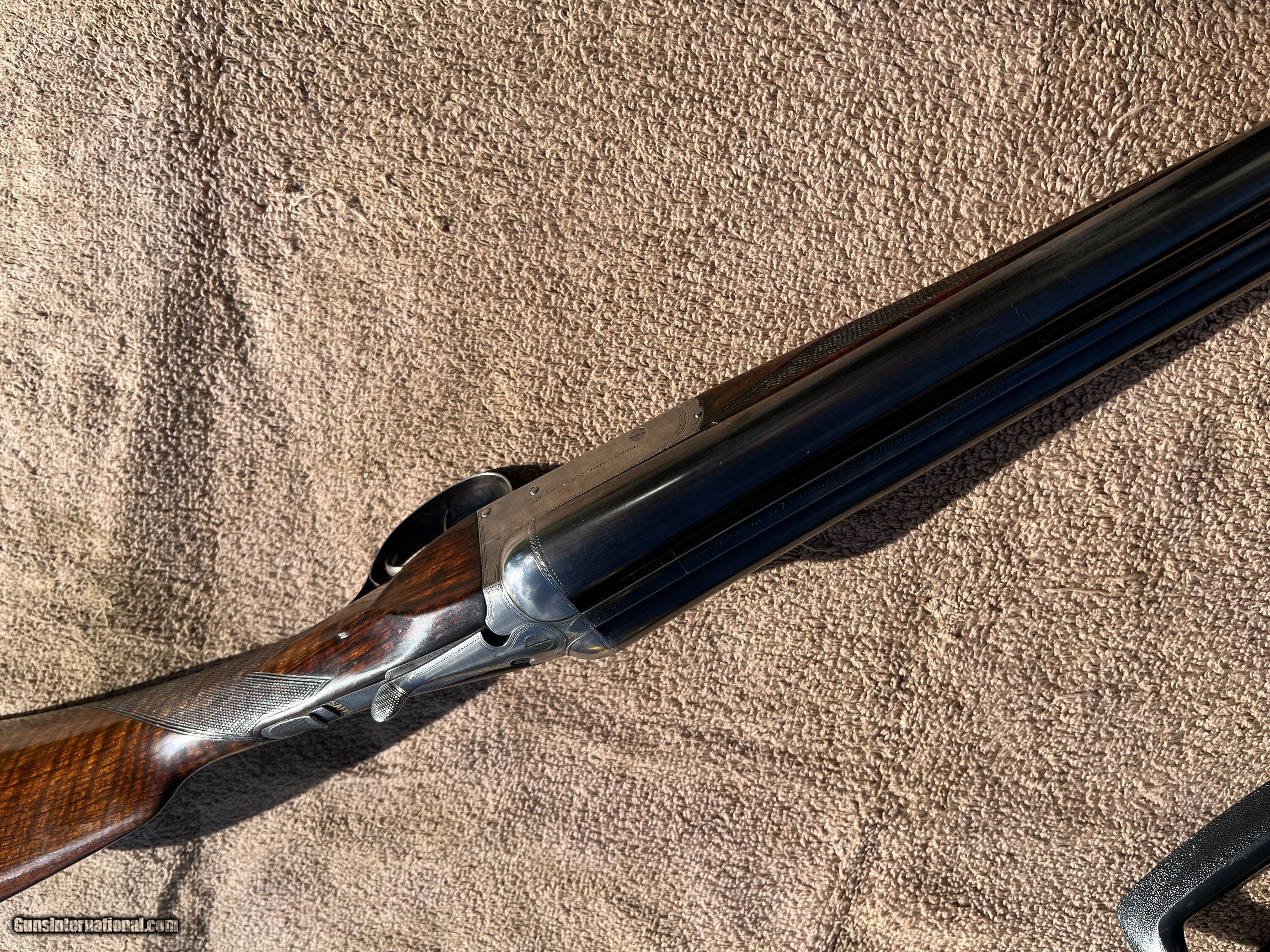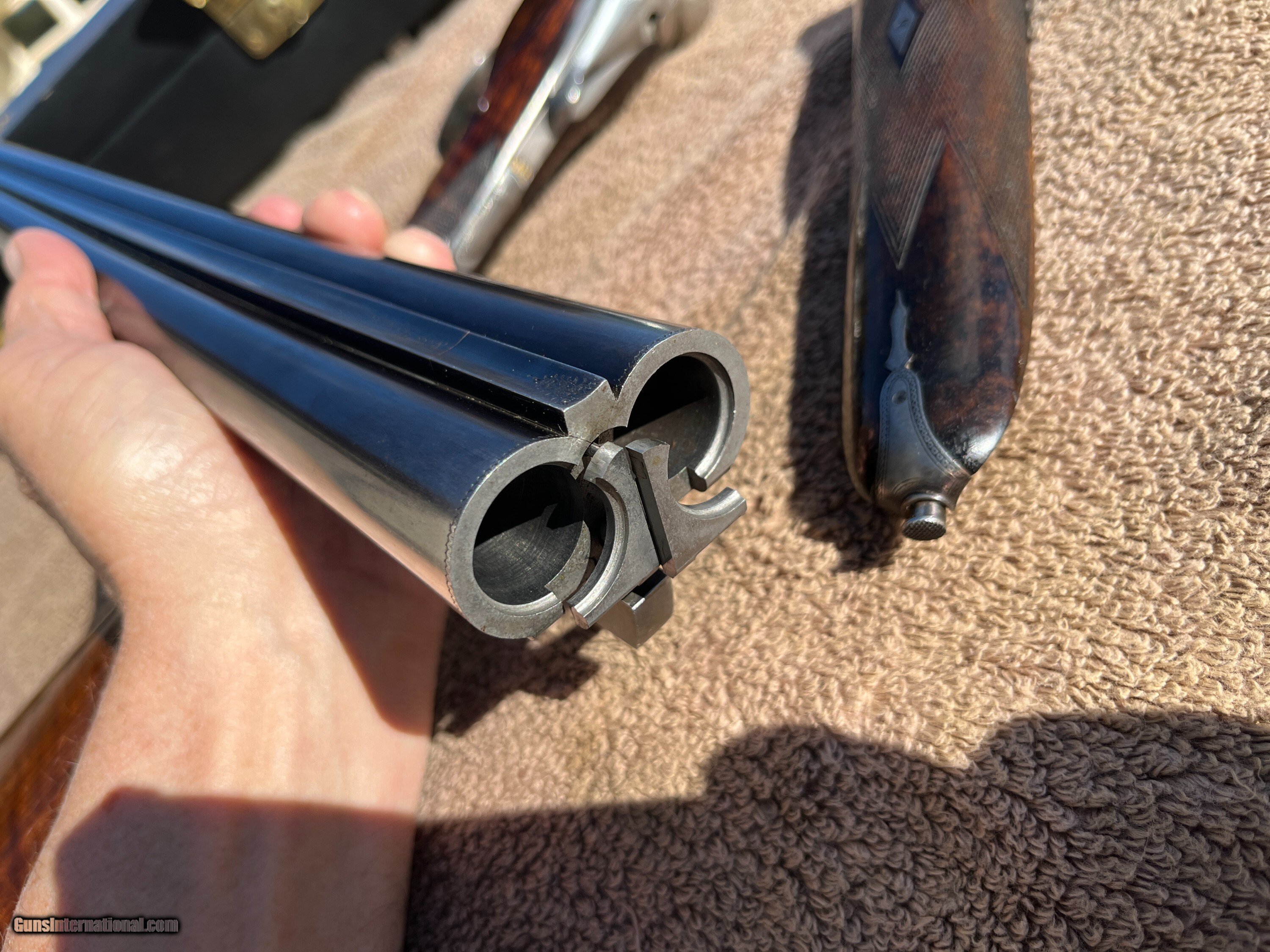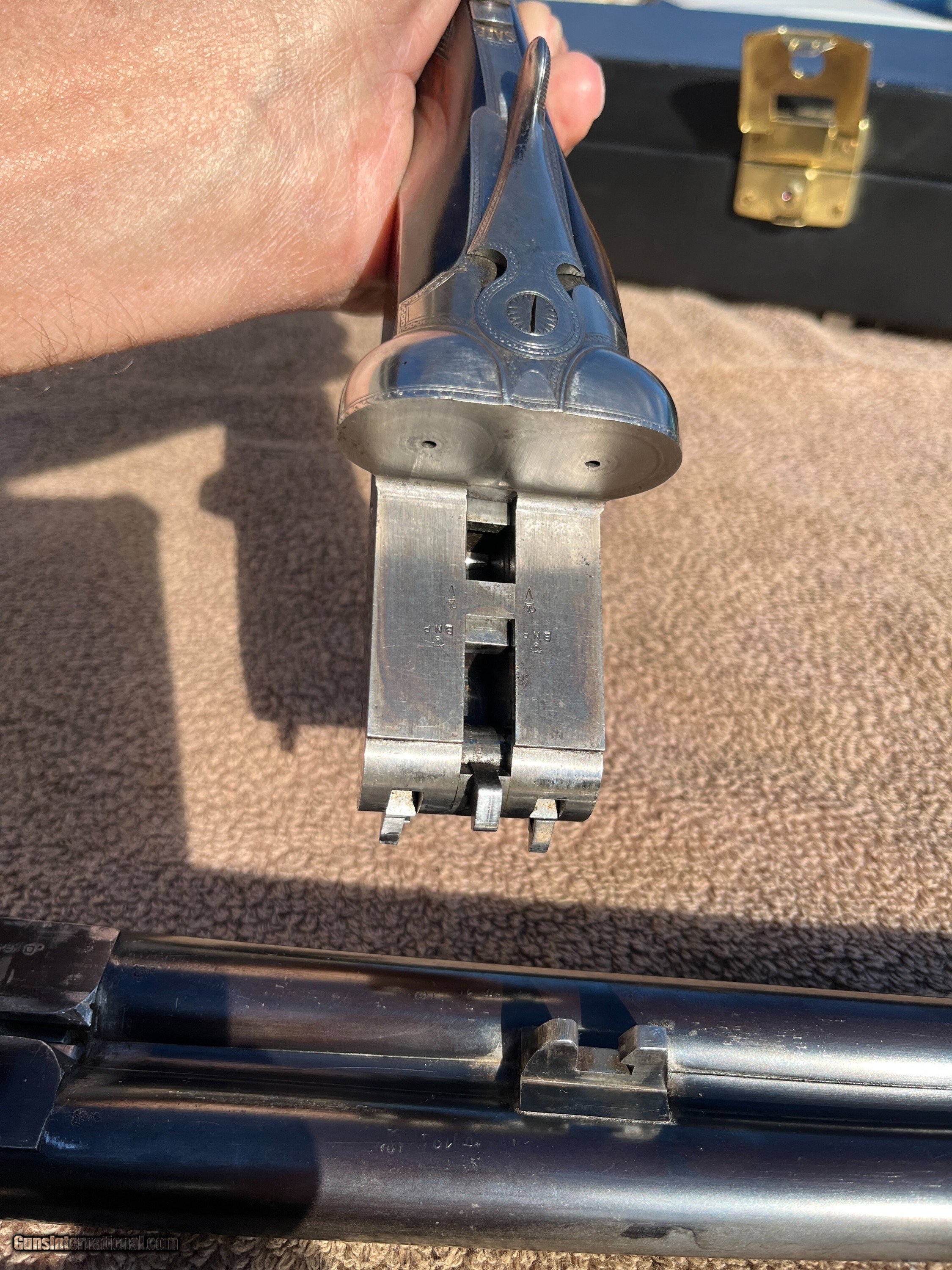 Description: On Consignment. Here is a really sweet English box lock, ejectors with nice wood and all original finishes made in the late 20-s. This is a crossover stocked gun for shooting right hand with both eyes open. Stock has extreme cast off allowing the top rib to center more left allowing for a (Right hand shooter who is left eye dominant.) Uncut 27" Barrels have 90-95% blue and shows one wear spot on the left barrel just above the forend wood about 1 1/4 by 3/8. Looks like some blood from the forward hand that got on the barrel and removed some of the blue, no metal damage. About 70% forplate blue and the rest of the metal is silvery, no rust damage, dents or scratches in metal. Chokes are cly and mod, 2 3/4 chambers, tight on face and ring true. Wood is really nice original finishes, rear factory checkered at 15 1/8 pull over front trigger, 1 3/8 comb, 2" at thee heal. 6lbs-10oz on postal scale! This gun has a three day inspection, buyer pays all shipping and insurance fee's if returned. We ship UPS ground fully insurde to C&R or FFL# only. Can be bought at our store New Middletown Ohio. Note we will be grouse hunting and the shop will be closed Oct-18th through Monday Nov-3rd E-mails may take a day or two for me to respond. Thanks Kenny Price: $2,500.00 Contact Seller |