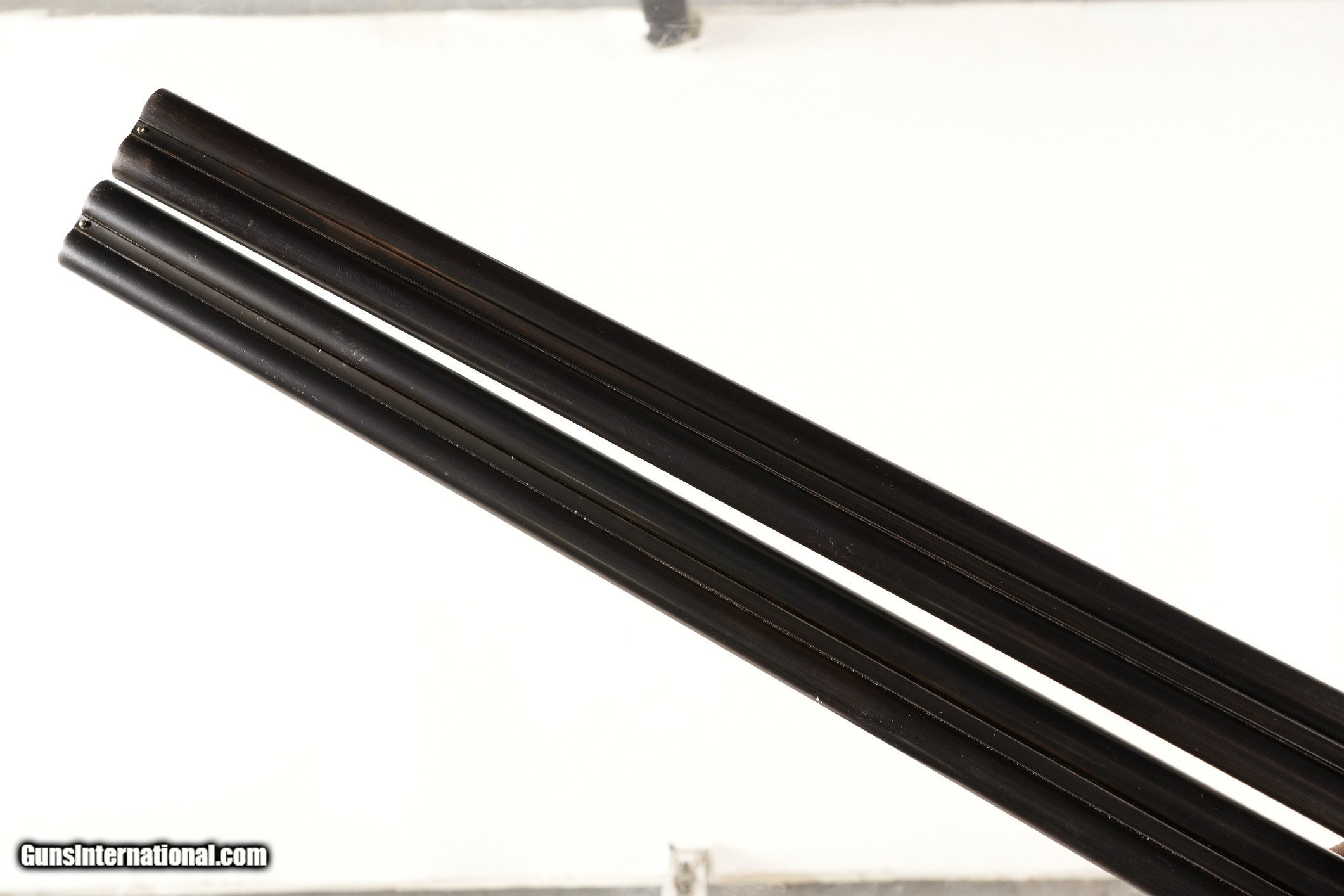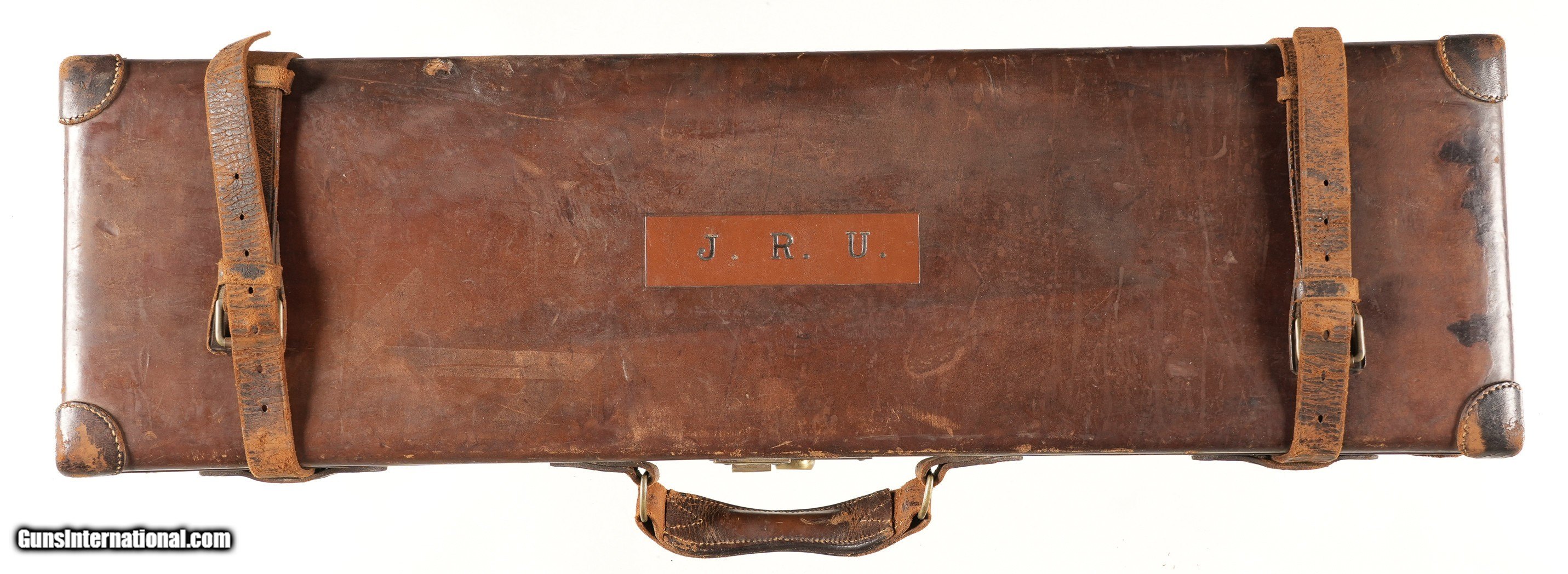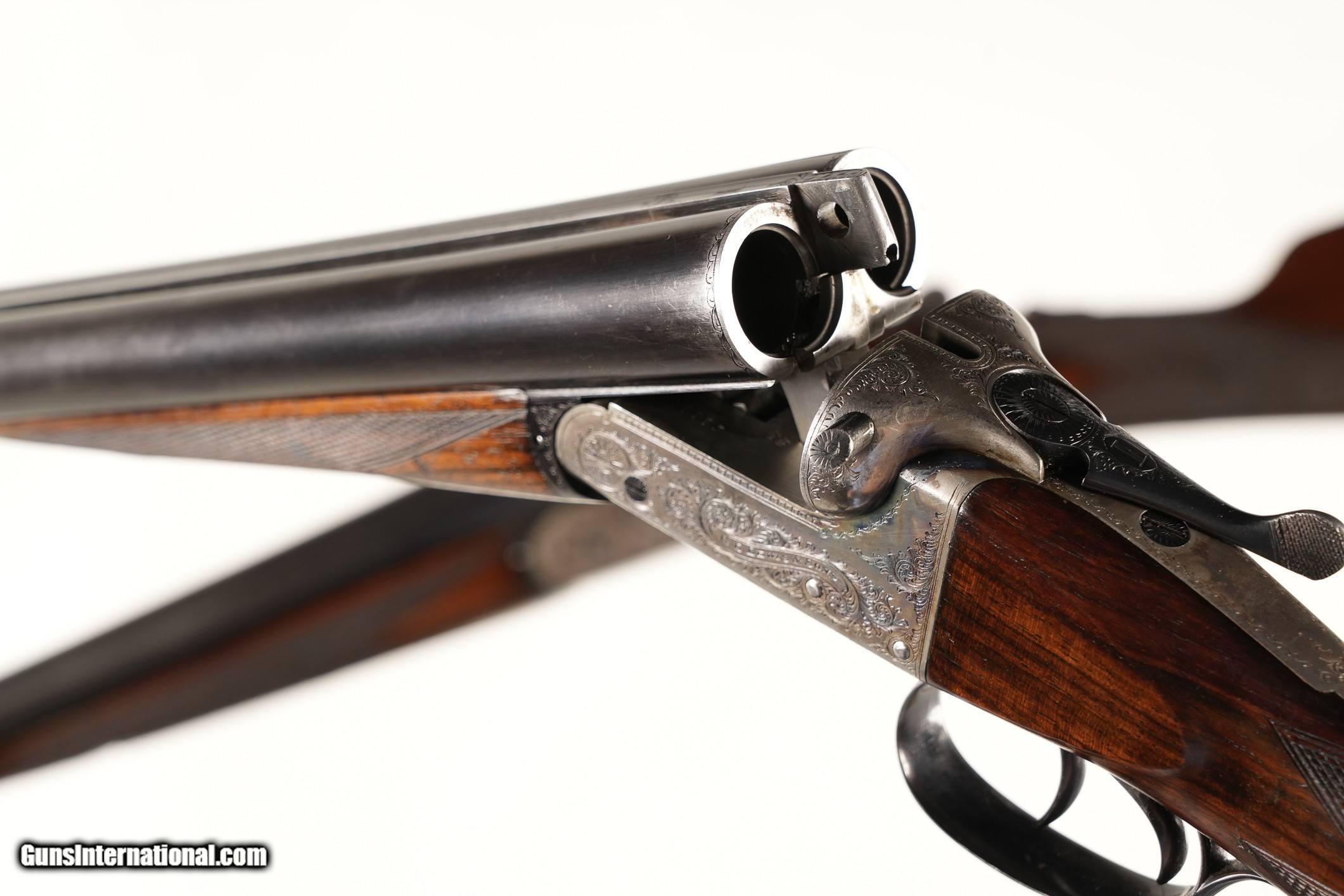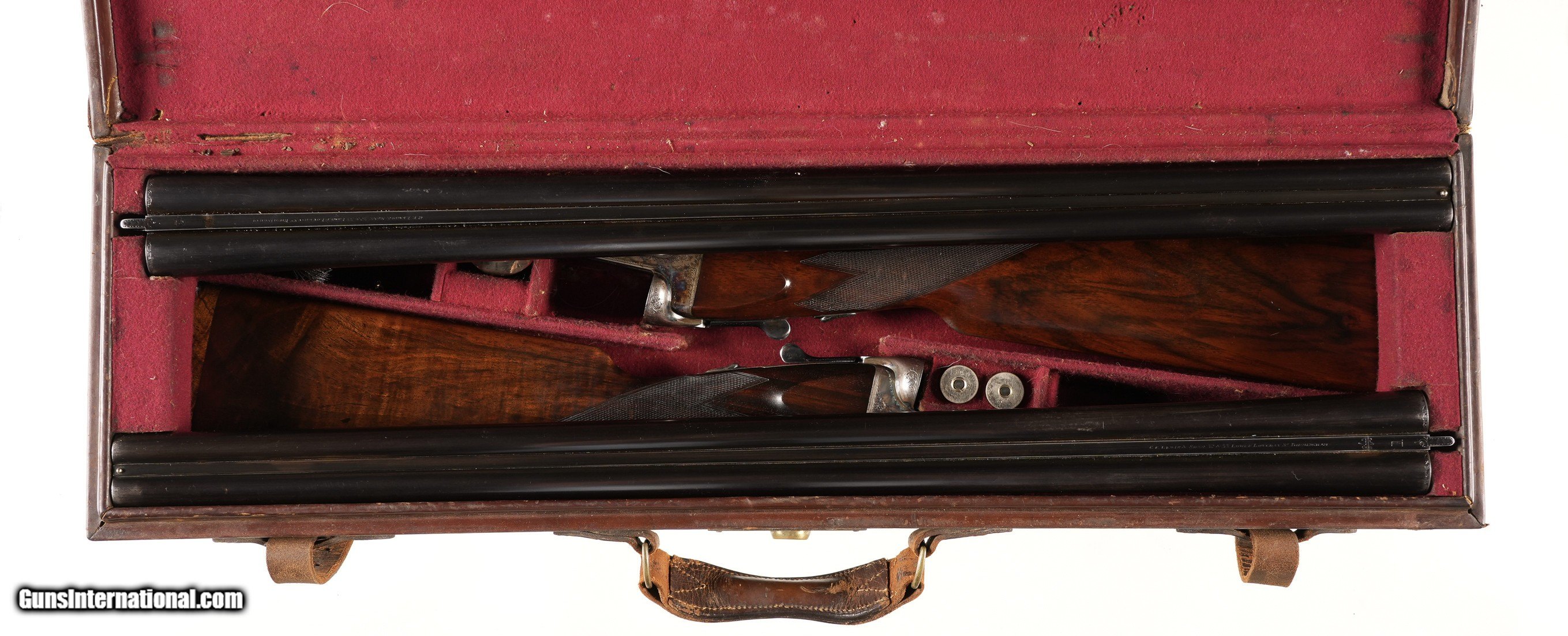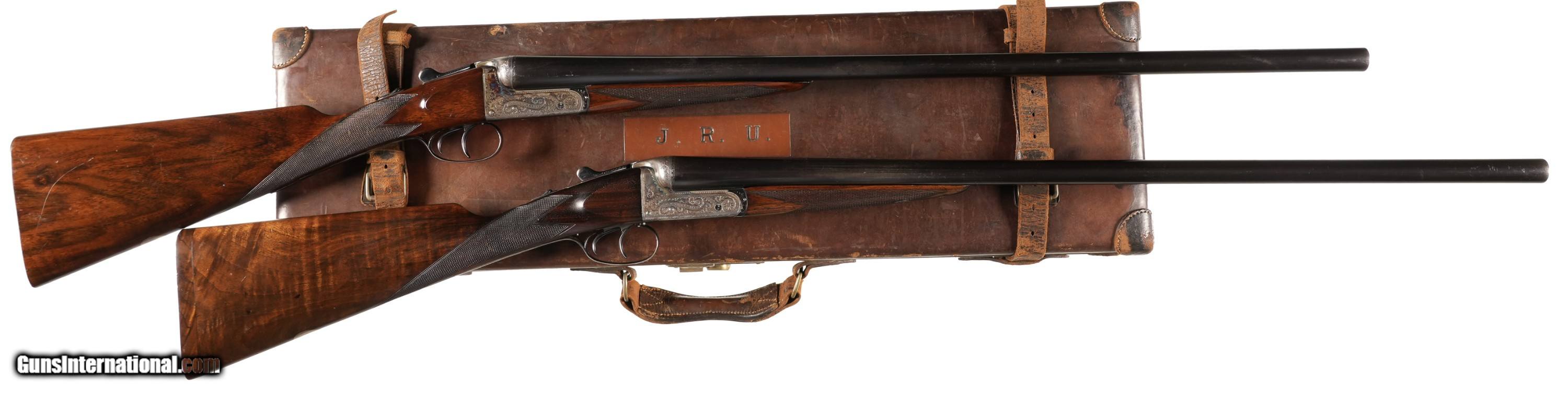 Description: Cased Pair, G. E. Lewis & Sons 12 Bore Box Lock Doubles with 28" Bbl, choked Full & IC / Mod & IC with 2 1/2" chambers, Double triggers with ejectors. Crisply scroll engraved with top levers and breechesnumbered 1&2. 14 7/8" LOP 1 5/8" DAC 2" DAH 6 lbs 9 oz. Oil finished nicely figured walnut stocks with splinter forearms. Most all blue remains on Bbls. and 30% vivid case colors on receivers. Brilliant bright bores. and mechanically fine.Leather double travel case with red wool lined partitions is very fine with a classic used look but still very serviceable. • Free Shipping, No Credit Card Fees. • Lay-a-way available for this firearm. • 1/3 Down, a 1/3 in 30 Days, 1/3 in 60 Days. SOLD Manufacturer: GE Lewis Model: Boxlock Serial Number: 16083/4 Barrel Length: 28 |
