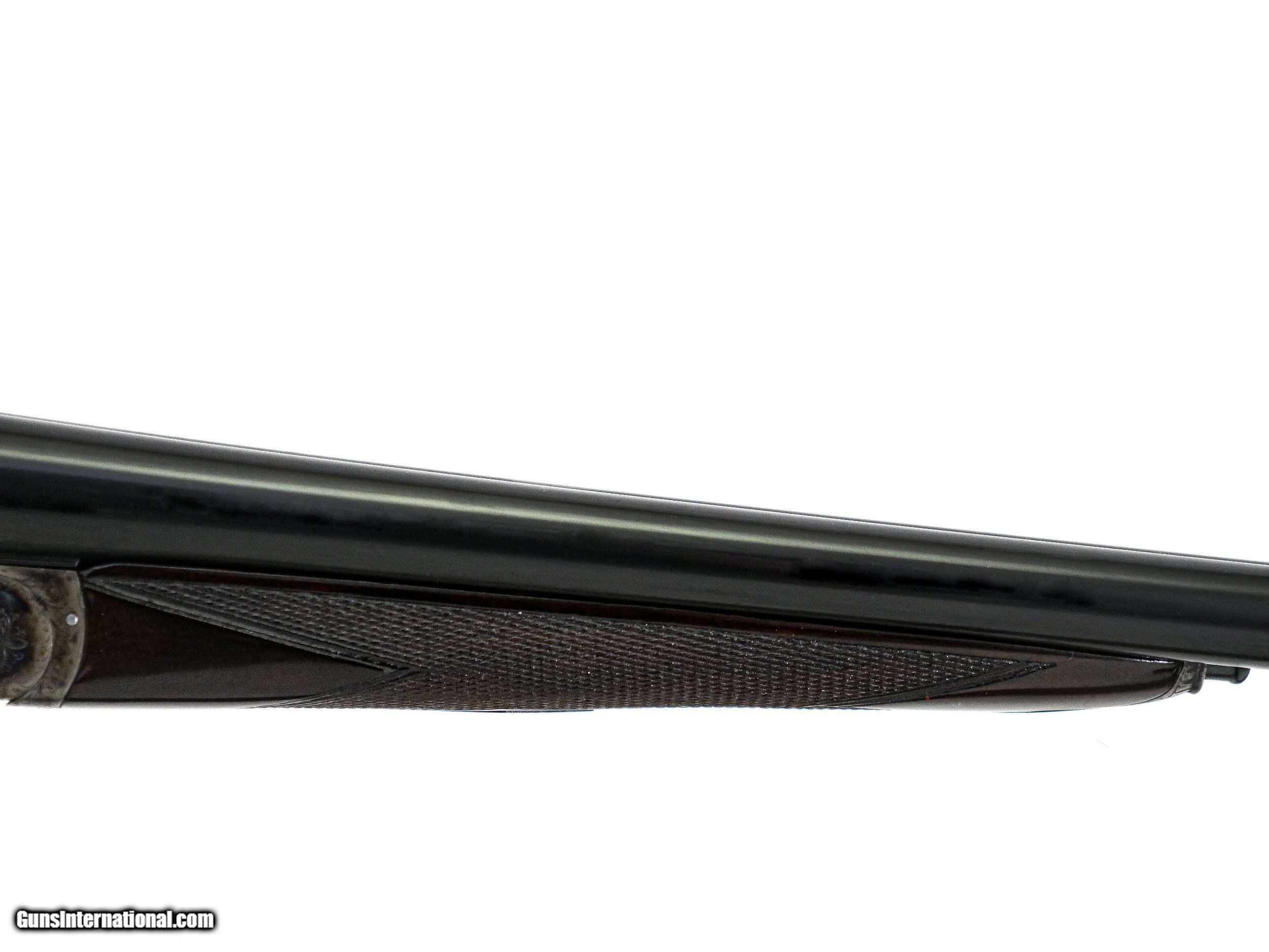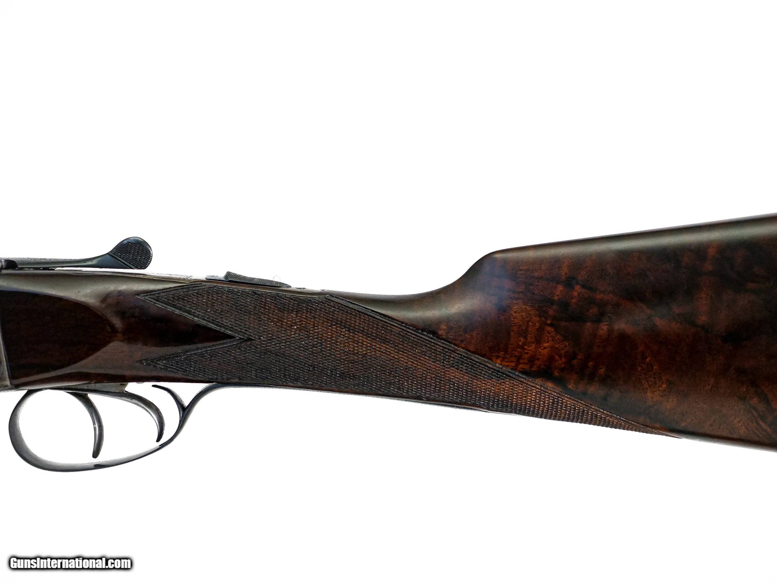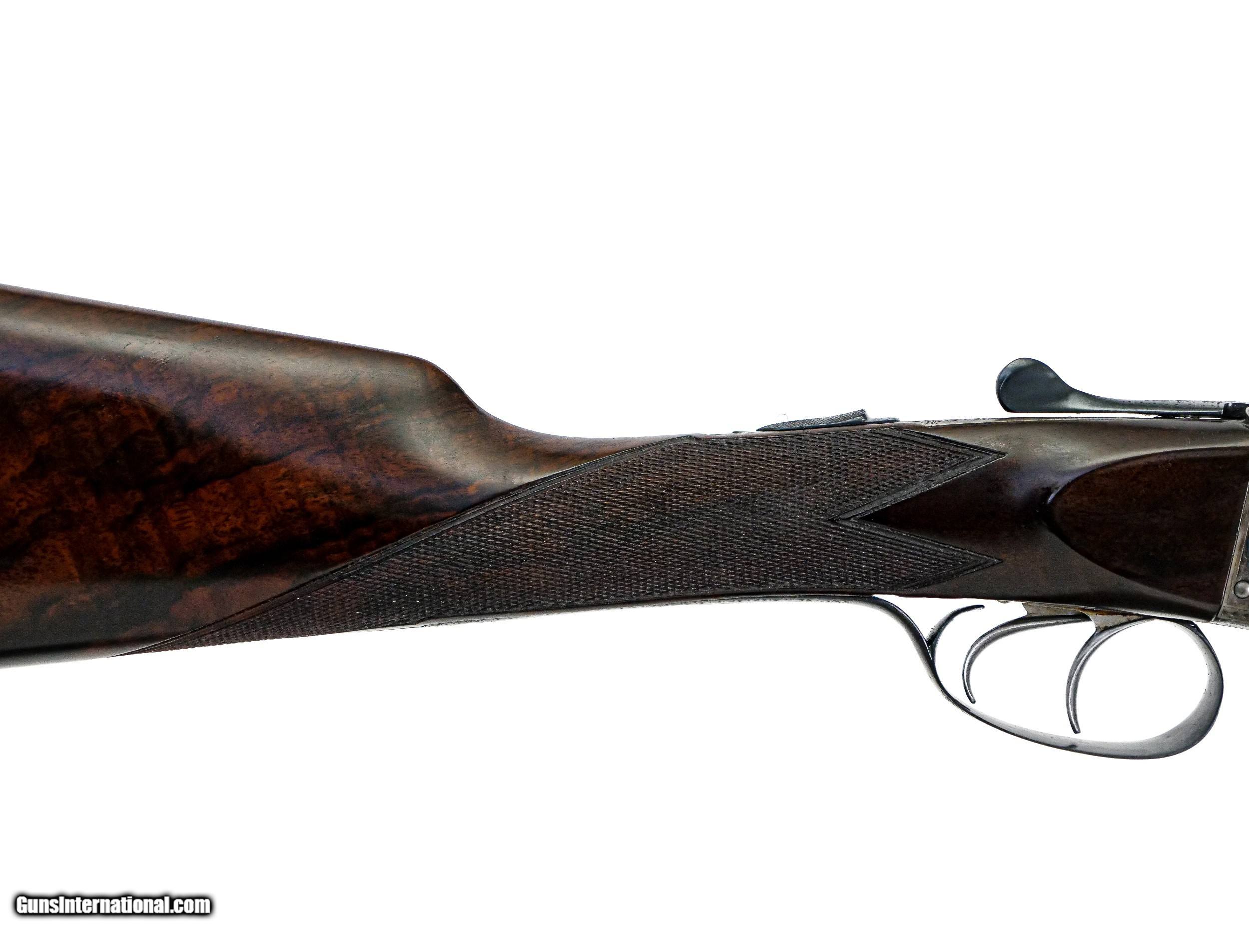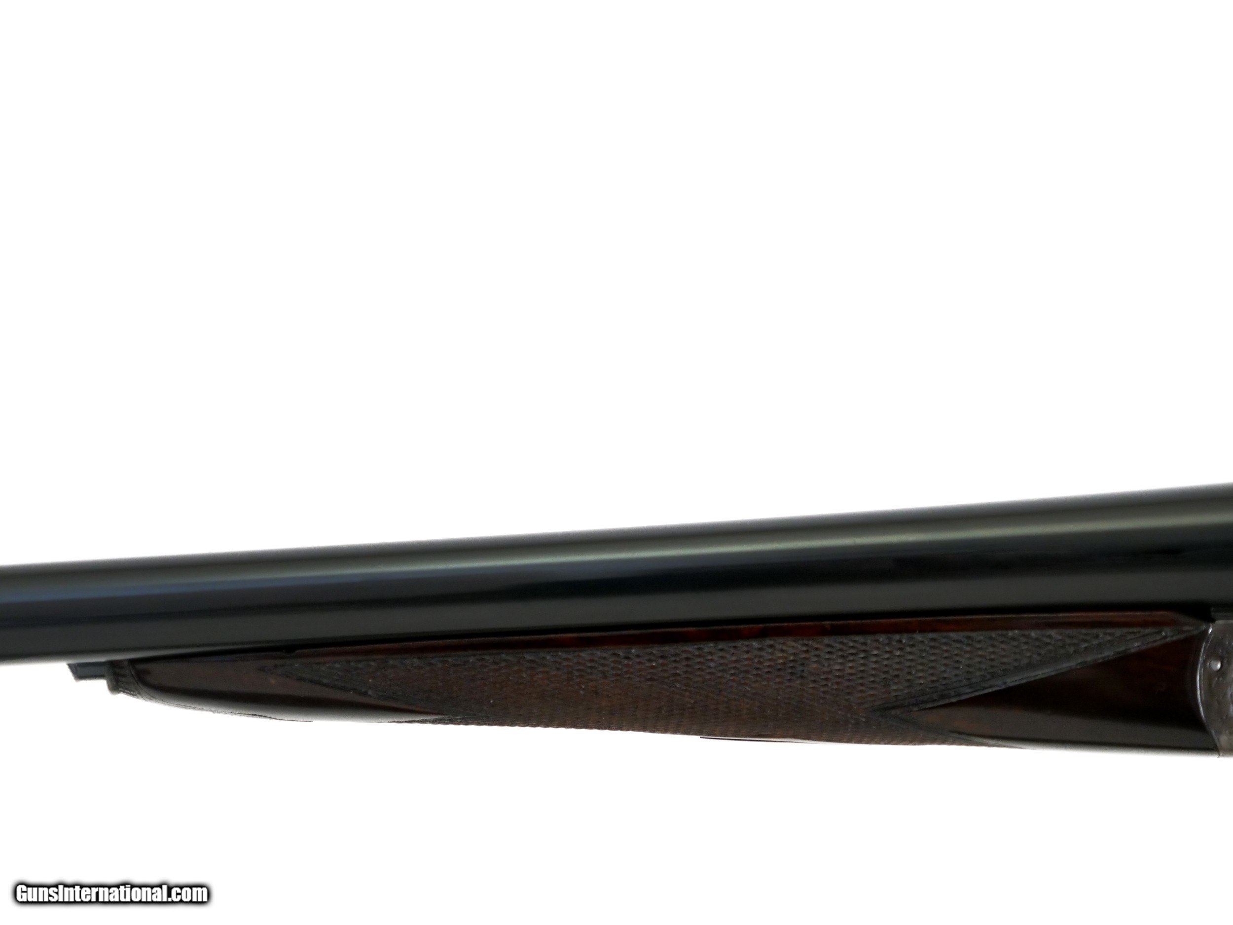 Description: W.R. Leeson - 28ga. 26 ¼” Barrels Choked IC/M. Delightfully figured English walnut straight grip stock, leather covered recoil pad, gold oval, double triggers, automatic ejectors, splinter forend, solid game rib, 99% condition gun with only the slightest of wear on the toe of the leather pad, perfect checkering, perfect bluing, perfect wood and finish, 100% case coloring remaining, dainty at 4 lb., 10 oz. yet perfectly balanced, a lively and exciting gun which is just perfect for upland hunting. Inv: 52132 4 lbs. 10 oz. 14 1/8” X 1 ½” X 2 3/8” $8,999.00 SOLD |