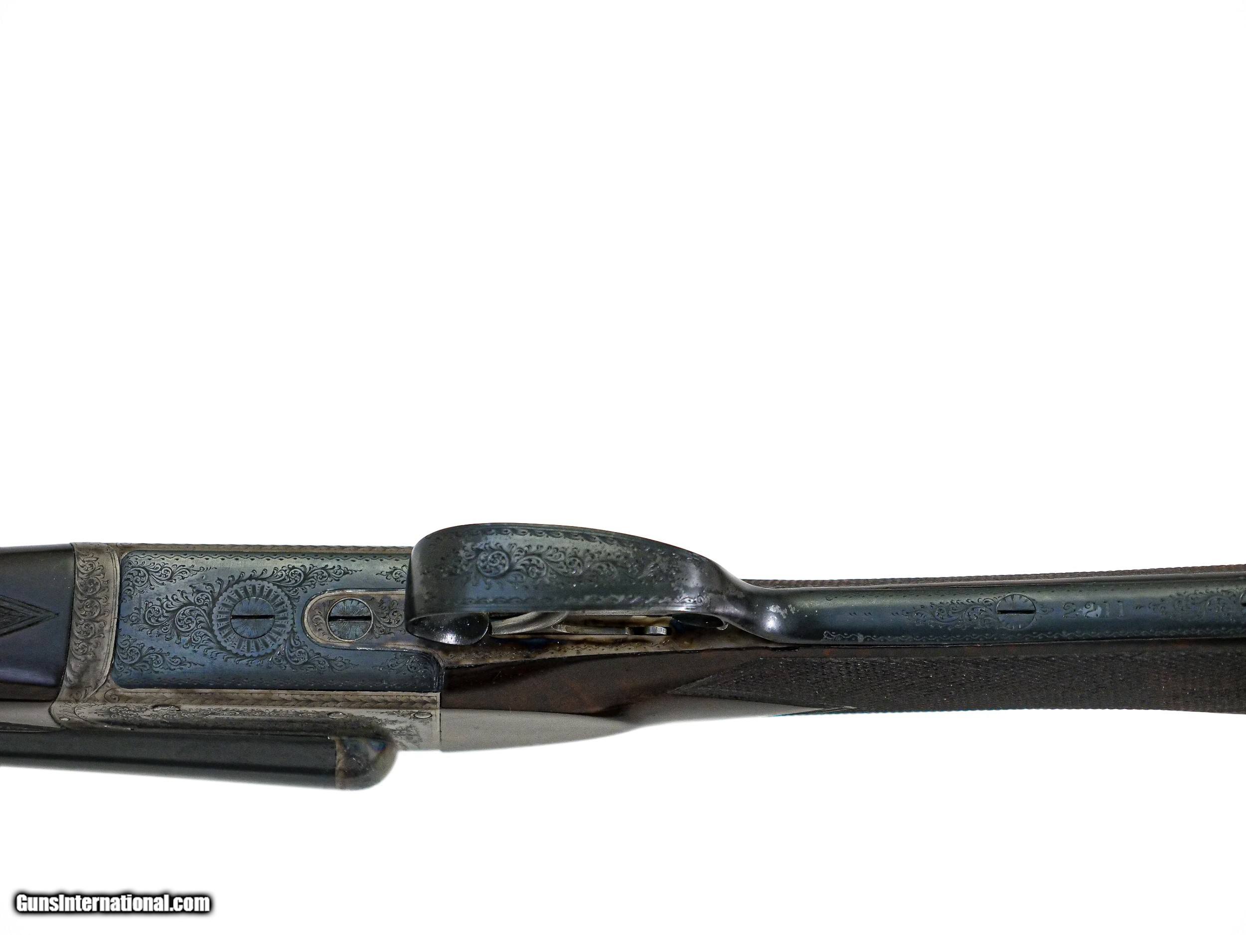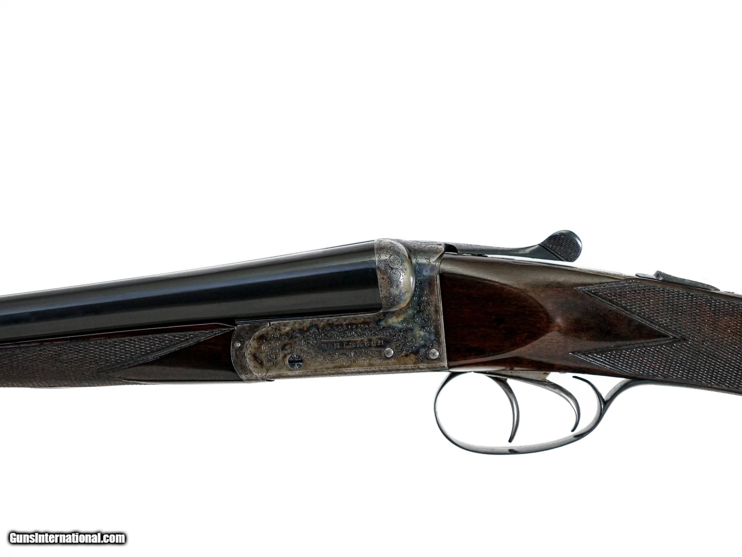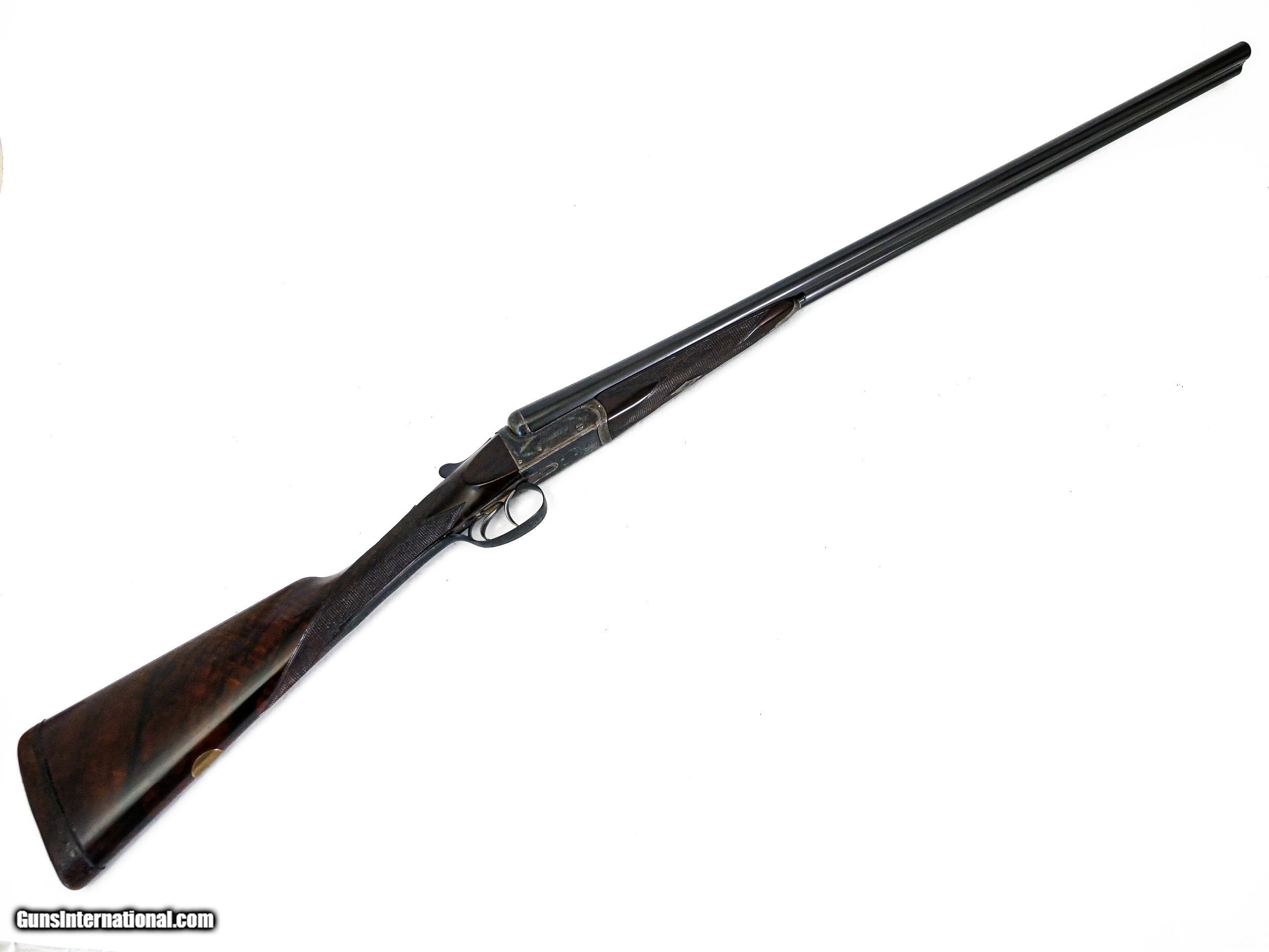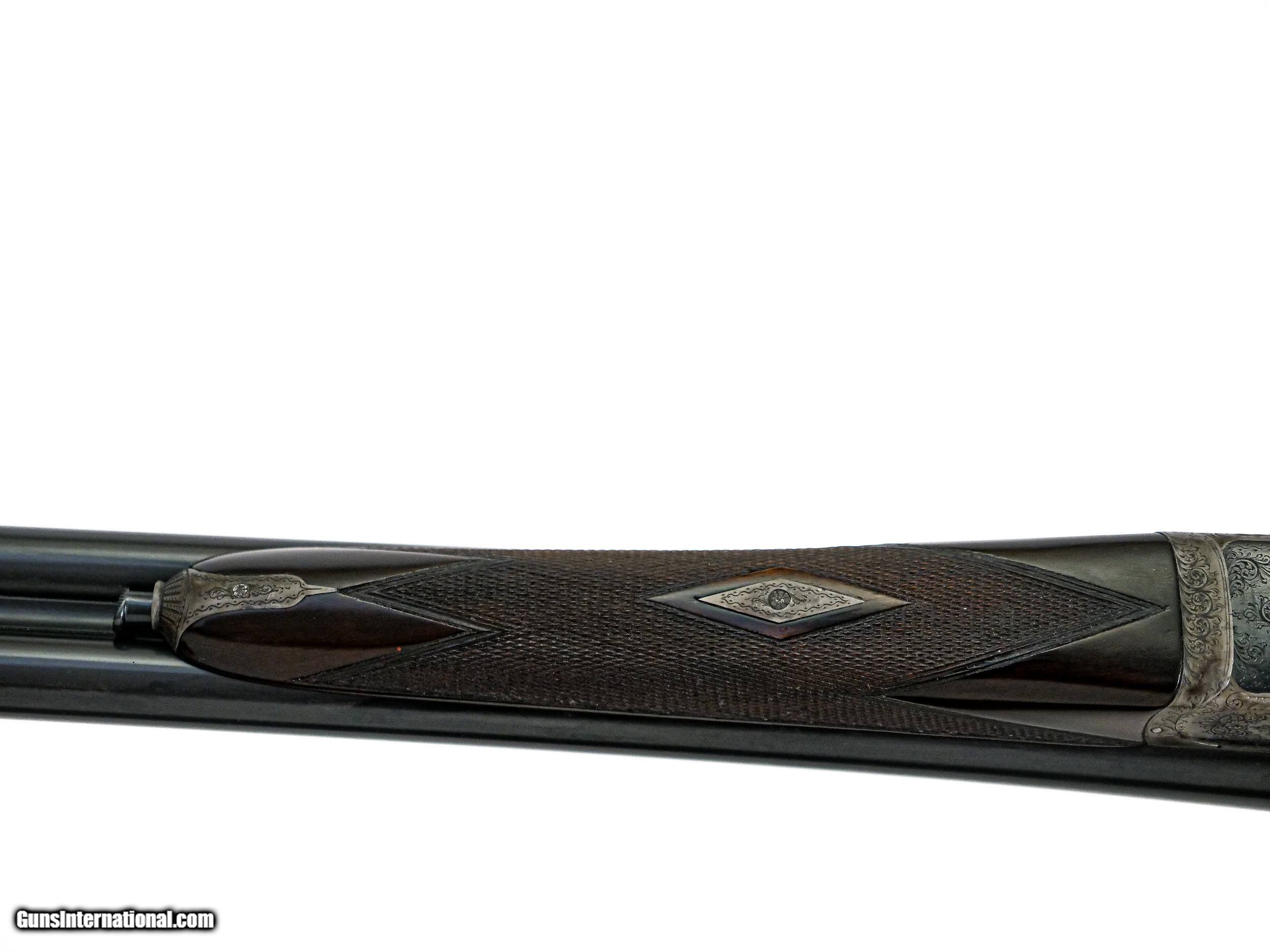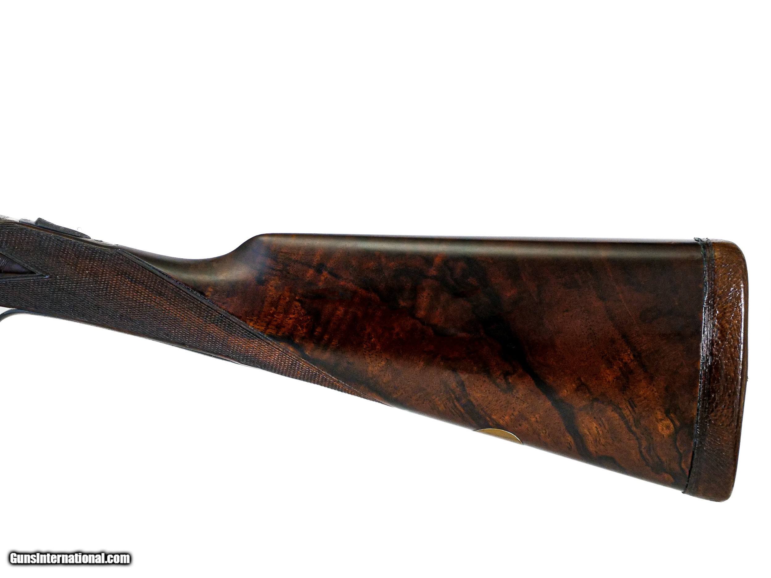 Description: W.R. Leeson - 28ga. 26 ¼” Barrels Choked IC/M. Delightfully figured English walnut straight grip stock, leather covered recoil pad, gold oval, double triggers, automatic ejectors, splinter forend, solid game rib, 99% condition gun with only the slightest of wear on the toe of the leather pad, perfect checkering, perfect bluing, perfect wood and finish, 100% case coloring remaining, dainty at 4 lb., 10 oz. yet perfectly balanced, a lively and exciting gun which is just perfect for upland hunting. Inv: 52132 4 lbs. 10 oz. 14 1/8” X 1 ½” X 2 3/8” $8,999.00 SOLD |