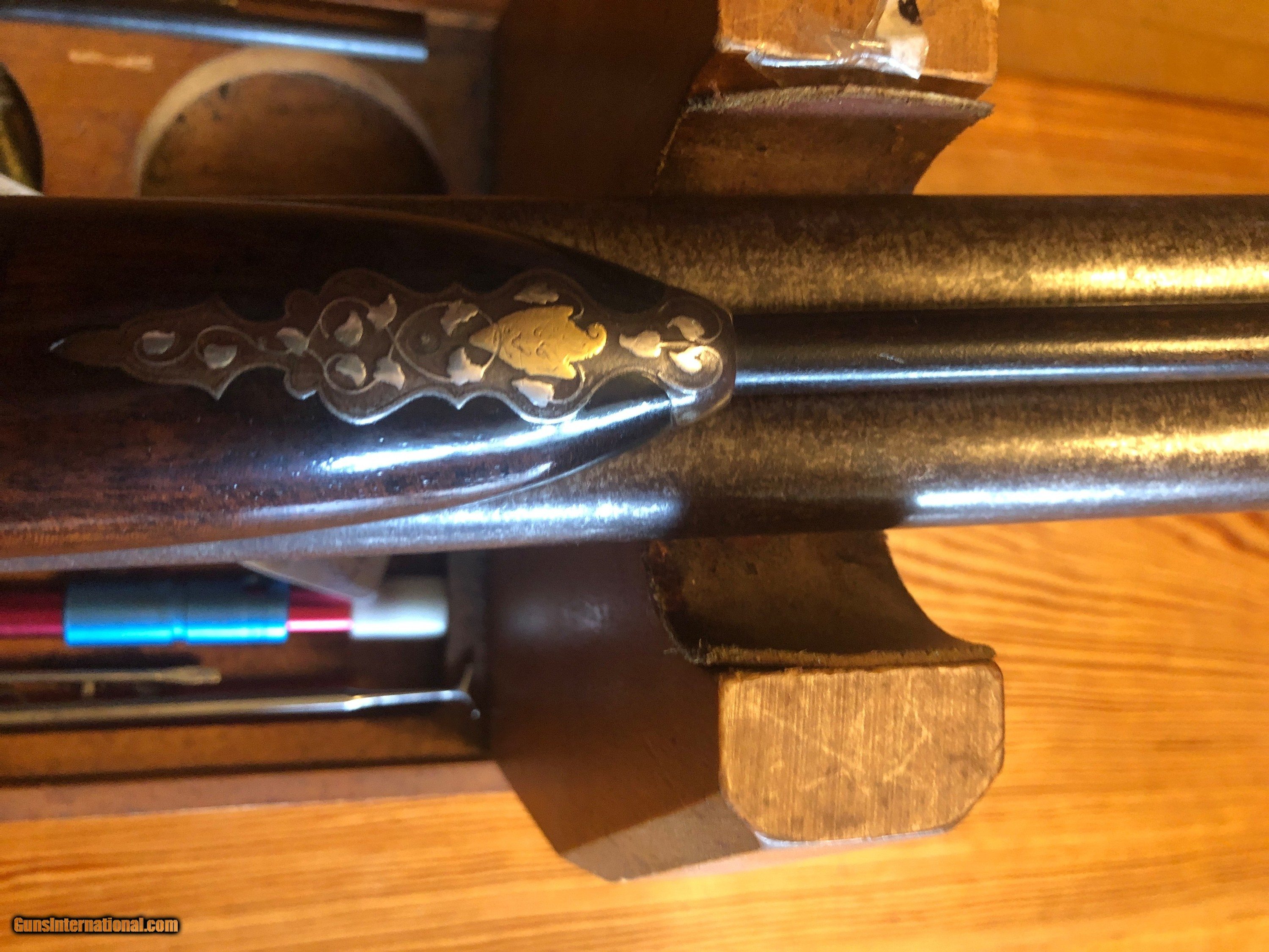 Description: Percussion Engraved and inlaid silver and gold 12 Ga shotgun. Wood is highly figured. Damascus barrels,original ramrod. One hammer has been replaced. Circa 1840-70? The gun has no markings except I found a stamped number 5. Barrel is typical some pitting in both barrels but not bad at all. SOLD Curio/Relic: Yes Antique: Yes Shotgun Gauge: 12 Gauge Manufacturer: European Barrel Length: 30” Condition: Very good Metal Condition: Very good Wood Condition: Excellent Bore Condition: Light pitting in areas Barrels: 30” Barrel Type: SxS Triggers: 2 LOP: R-13”. L-14” Rib: Solid Finish: ? Sights: Bead Manufacture Date: ? Choke Left: Cyl Choke Right: Cyl Engraving: Gold and Silver Item Location: St. Petersburg Proof:Black: Yes |