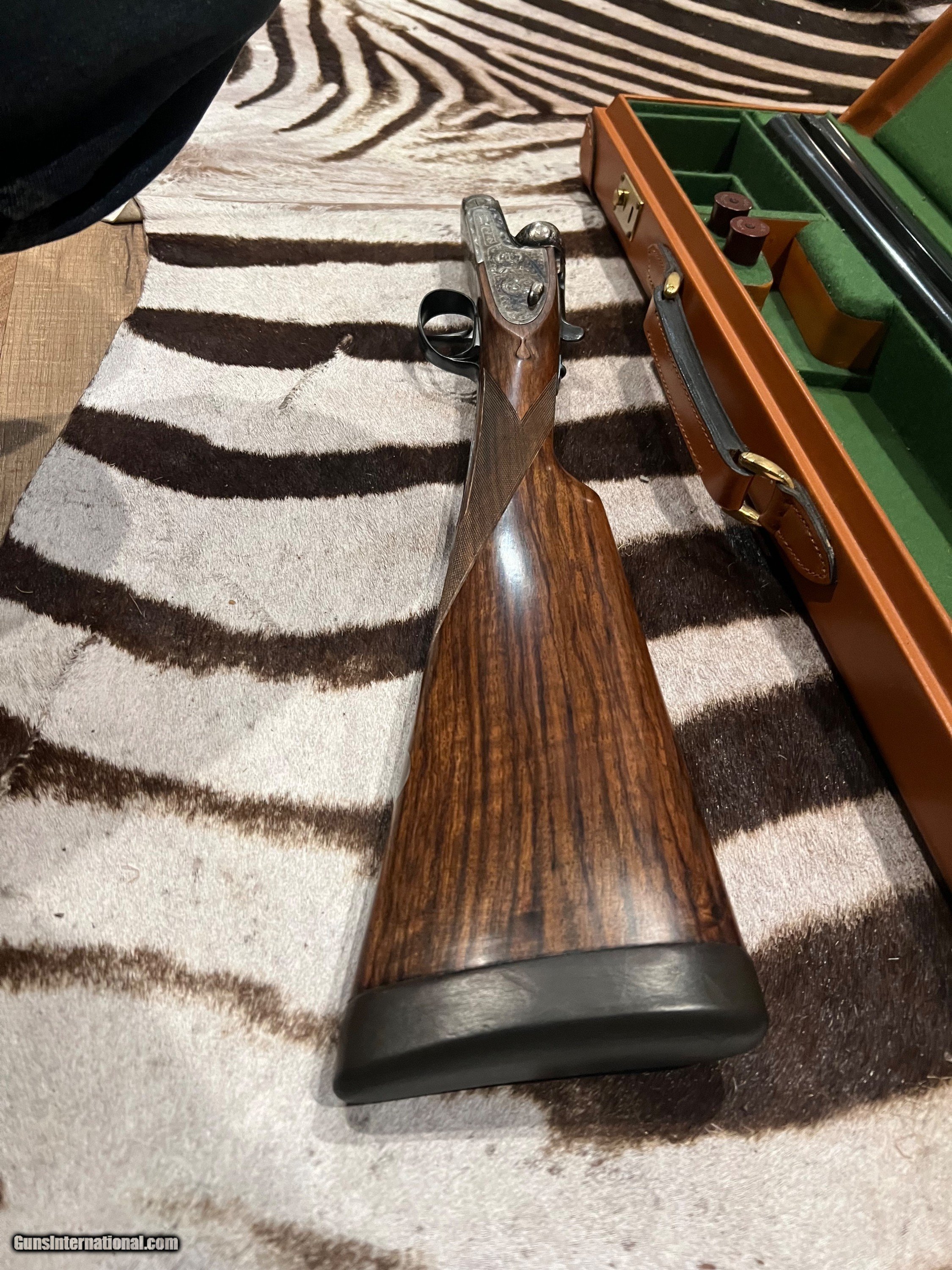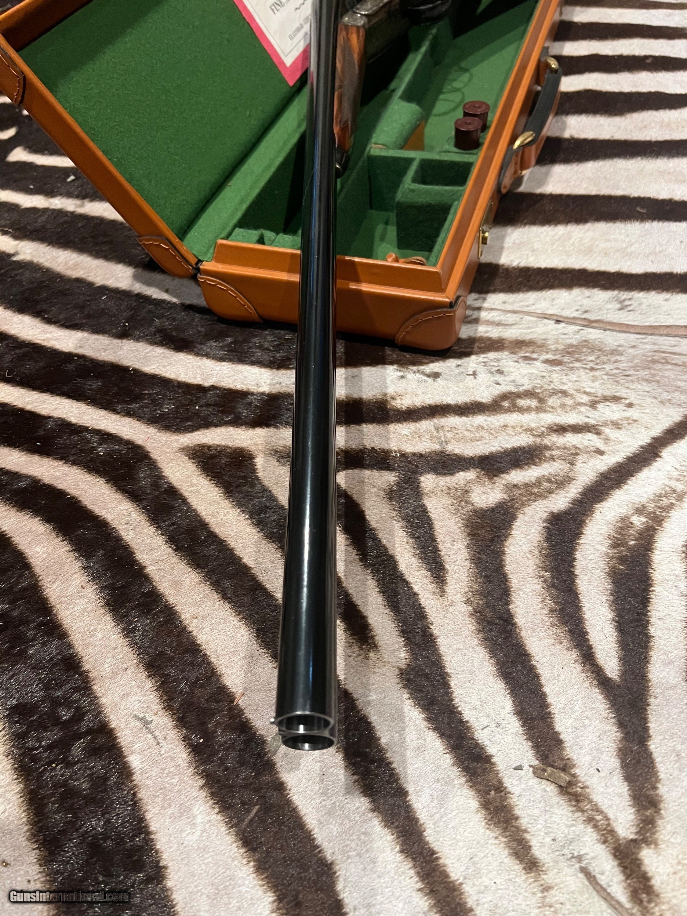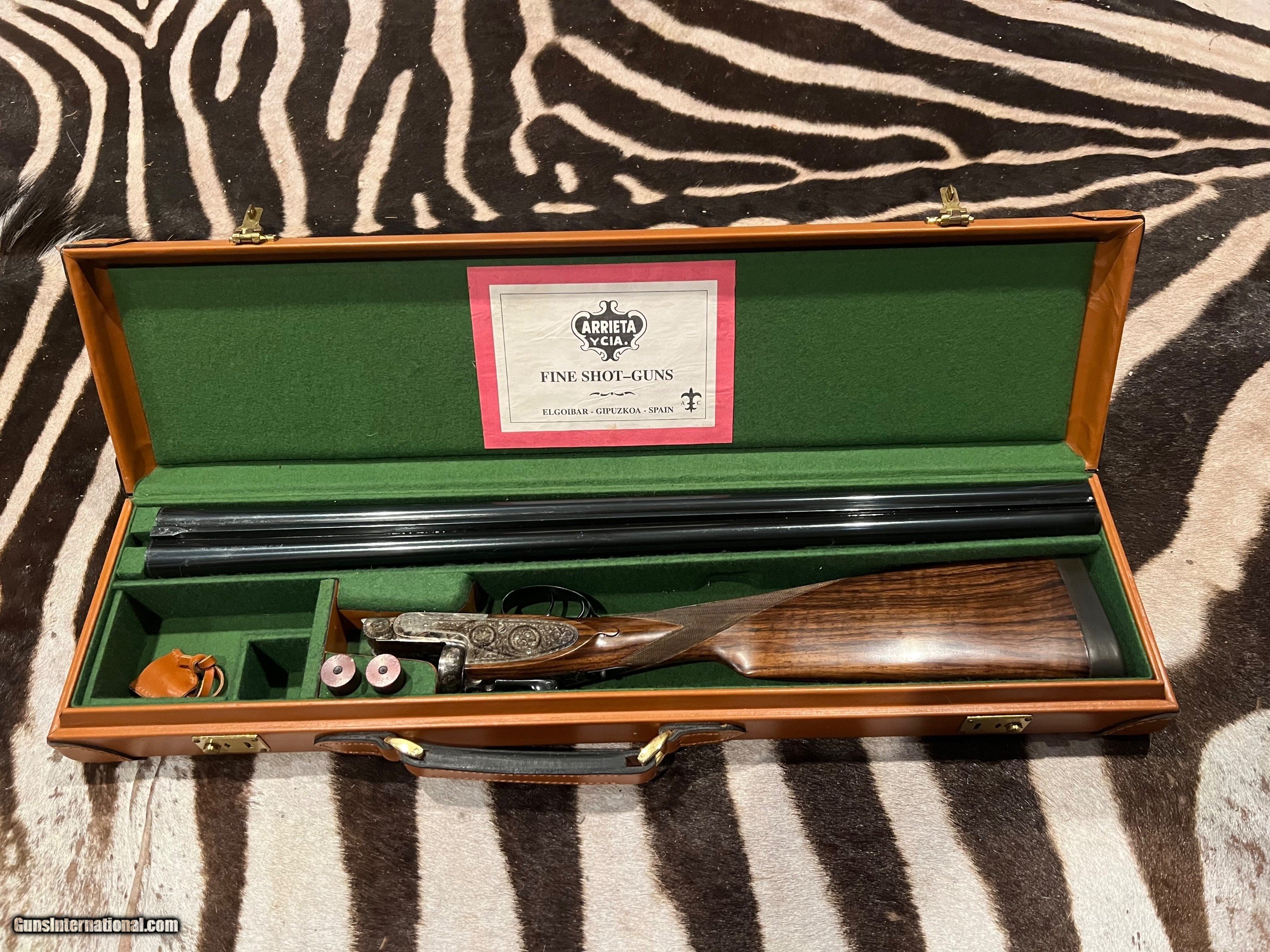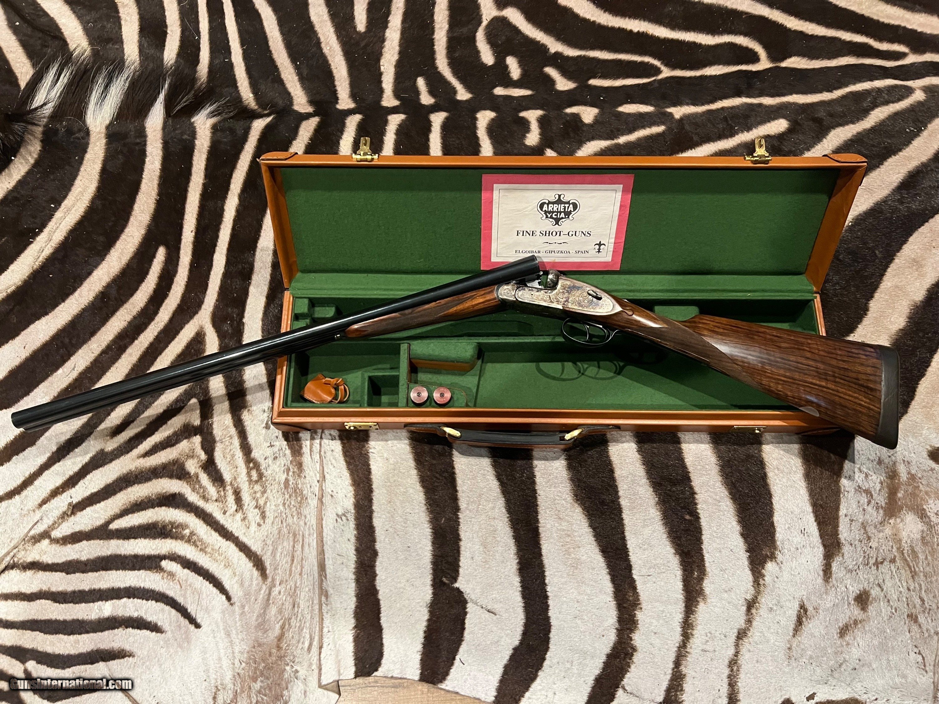 Description: Arrieta model 578 ejector Hand detachable side lock with H&H style cocking indicators, 12 gauge 26" chopper lumps barrels with Churchill style rib choked 0.15 left 0.10 right spectacular fine scroll engravings and case coloring, double trigger with front articulated, beautiful European walnut level four stock with original leather recoil pad. Stock dimensions are DC 1-1/2" DH 1-7/8" LOP 15" from front trigger, very slight right hand cast almost neutral, the weight is 6 pounds 8 ounces. The gun is in pristine condition metal and wood with almost no sign of use in the original leather case. Overall a beautiful side by side from this renowned Basque gun maker with all the features of a much more expensive English gun. For additional questions or to purchase call/text 512-595-1248 Quality trades like Krieghoff Perazzi and English sporting rifles welcomed Shotgun Gauge: 12 Gauge Manufacturer: Arrieta Model: 803 Barrel Length: 26” Ejectors: Yes Condition: 100% Bore Condition: 100% Barrel Type: Chopper Lumps Triggers: Double with articulated front Stock: European walnut Stock Comb: 1-1/2” Stock Heel: 1-7/8” Fore End: Splinter type Butt Pad: Original leather LOP: 15” from front trigger Rib: Churchill type Finish: Case color Weight: 6 pounds 8 ounces Sights: Silver front bead Chokes: Fixed Choke Left: 0.25 Choke Right: 0.10 Engraving: Fine scroll Case: Origin leather Item Location: North Carolina Price: $6,500.00 Contact Seller |