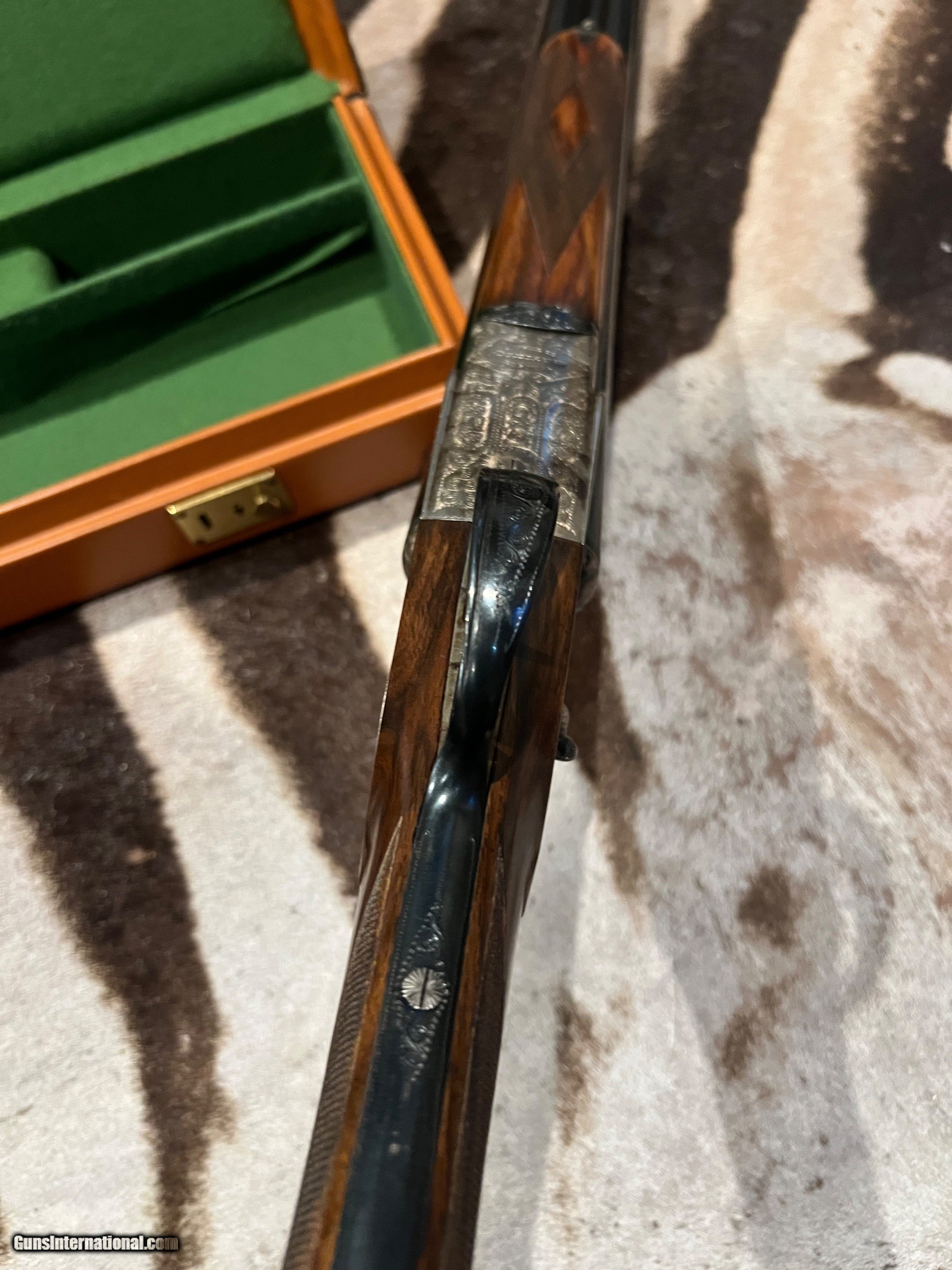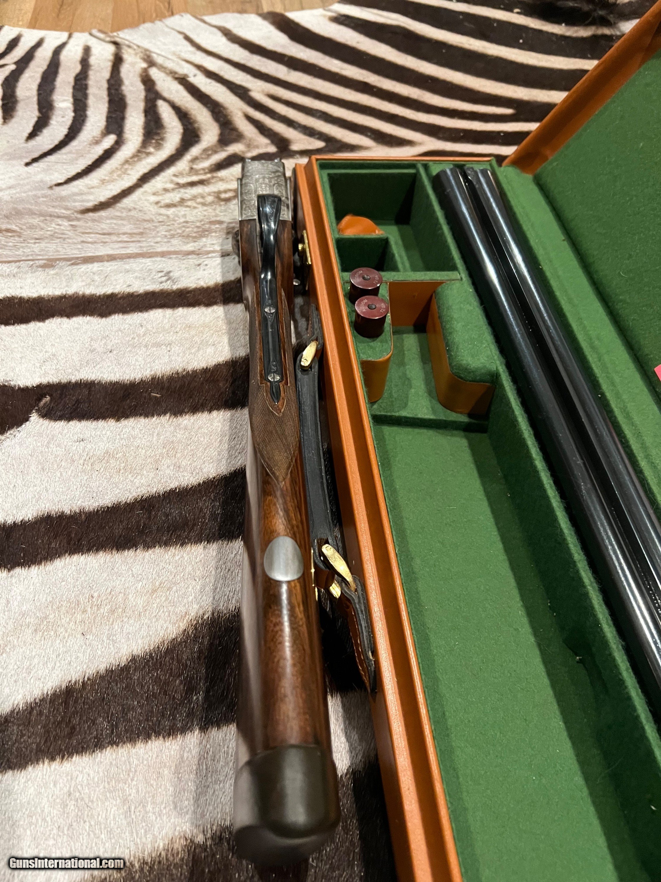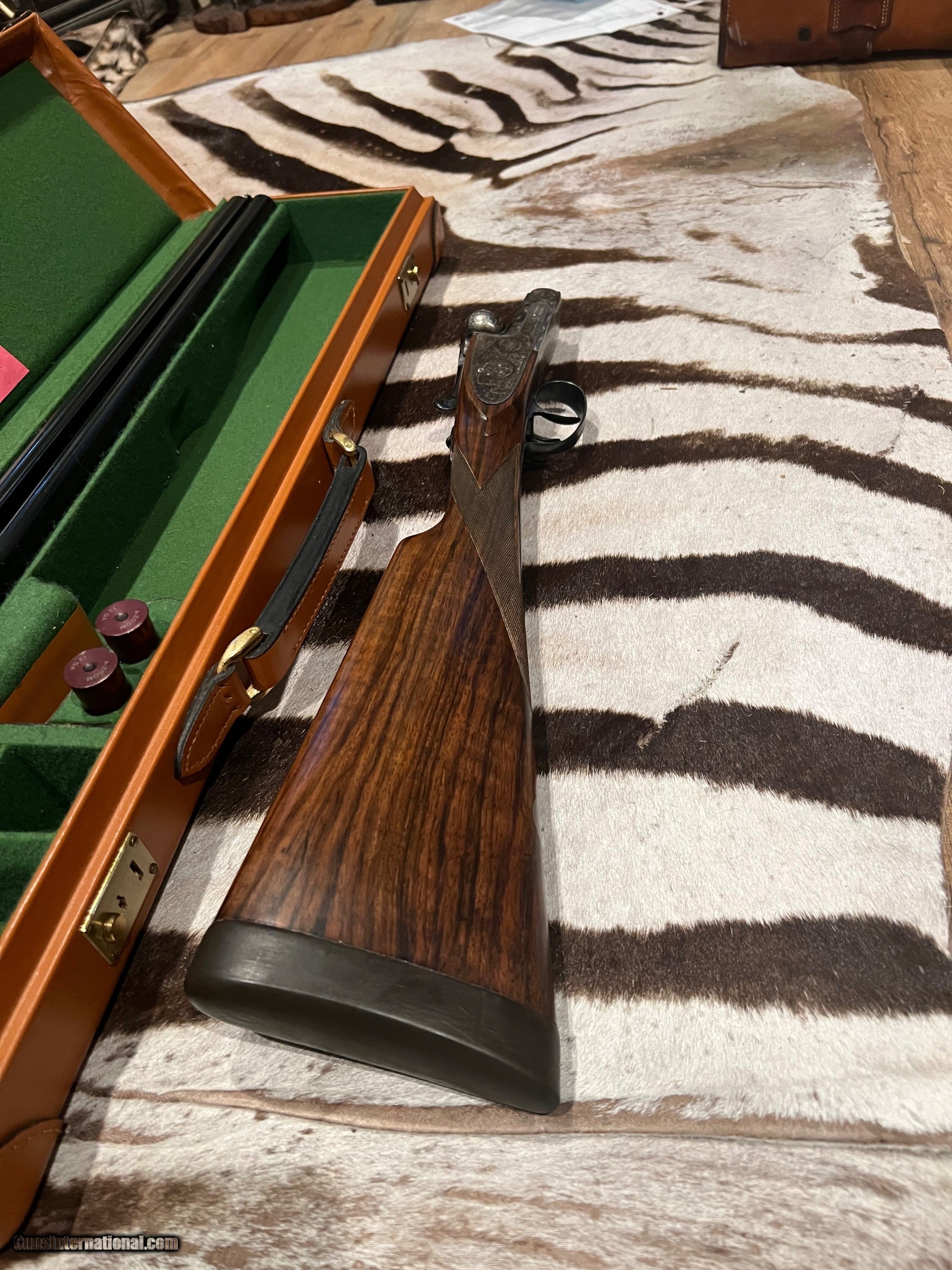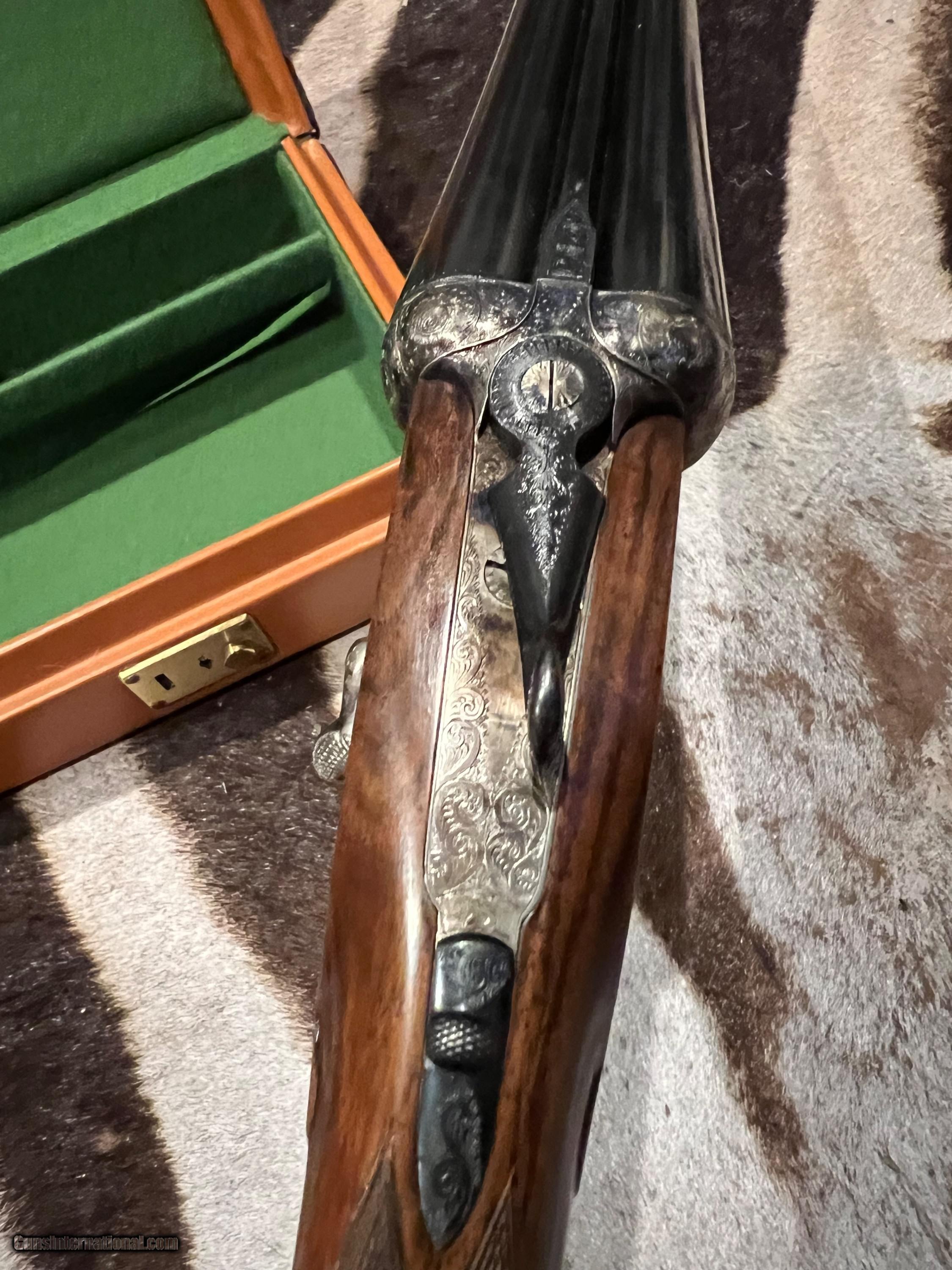 Description: Arrieta model 578 ejector Hand detachable side lock with H&H style cocking indicators, 12 gauge 26" chopper lumps barrels with Churchill style rib choked 0.15 left 0.10 right spectacular fine scroll engravings and case coloring, double trigger with front articulated, beautiful European walnut level four stock with original leather recoil pad. Stock dimensions are DC 1-1/2" DH 1-7/8" LOP 15" from front trigger, very slight right hand cast almost neutral, the weight is 6 pounds 8 ounces. The gun is in pristine condition metal and wood with almost no sign of use in the original leather case. Overall a beautiful side by side from this renowned Basque gun maker with all the features of a much more expensive English gun. For additional questions or to purchase call/text 512-595-1248 Quality trades like Krieghoff Perazzi and English sporting rifles welcomed Shotgun Gauge: 12 Gauge Manufacturer: Arrieta Model: 803 Barrel Length: 26” Ejectors: Yes Condition: 100% Bore Condition: 100% Barrel Type: Chopper Lumps Triggers: Double with articulated front Stock: European walnut Stock Comb: 1-1/2” Stock Heel: 1-7/8” Fore End: Splinter type Butt Pad: Original leather LOP: 15” from front trigger Rib: Churchill type Finish: Case color Weight: 6 pounds 8 ounces Sights: Silver front bead Chokes: Fixed Choke Left: 0.25 Choke Right: 0.10 Engraving: Fine scroll Case: Origin leather Item Location: North Carolina Price: $6,500.00 Contact Seller |