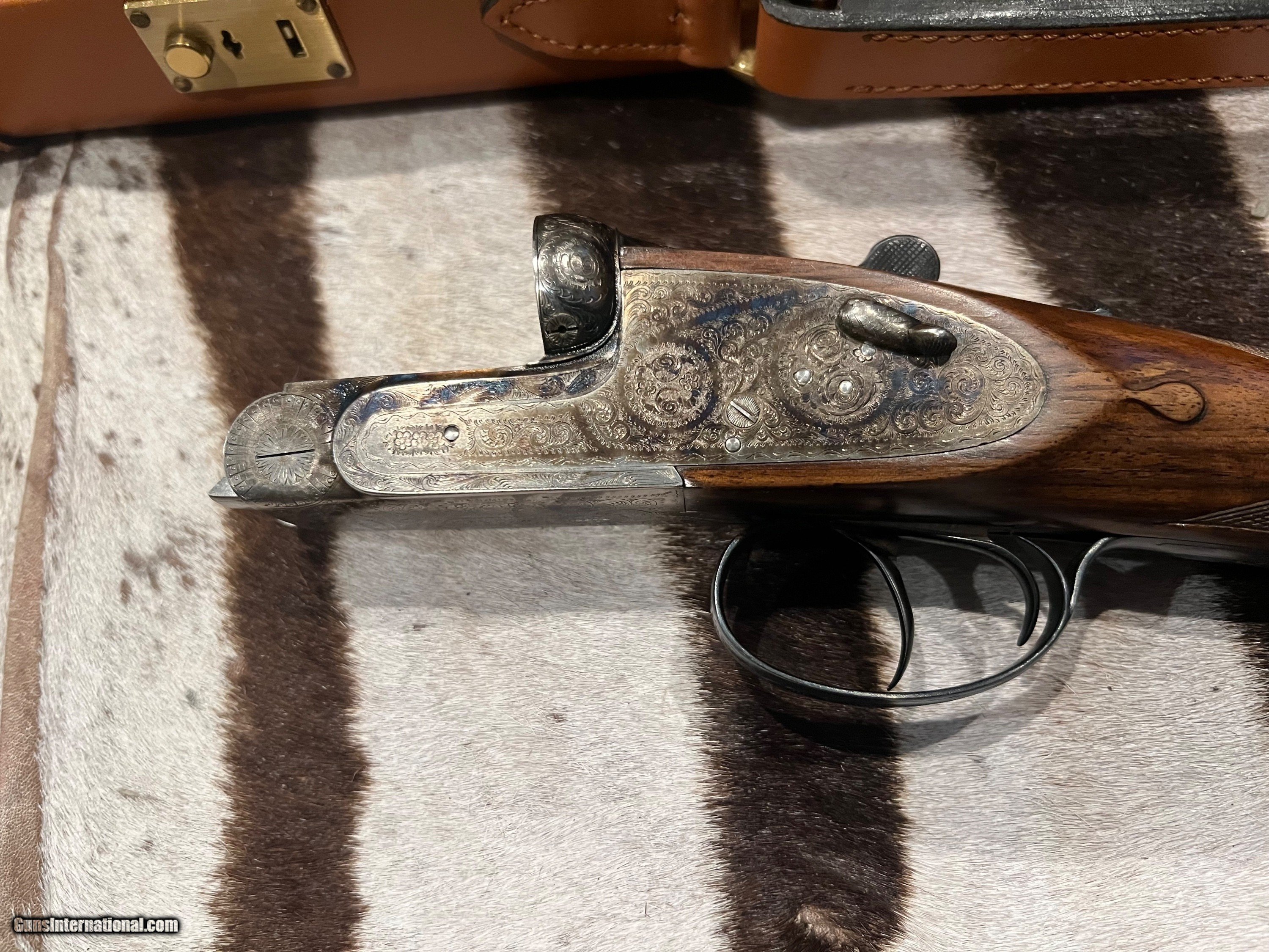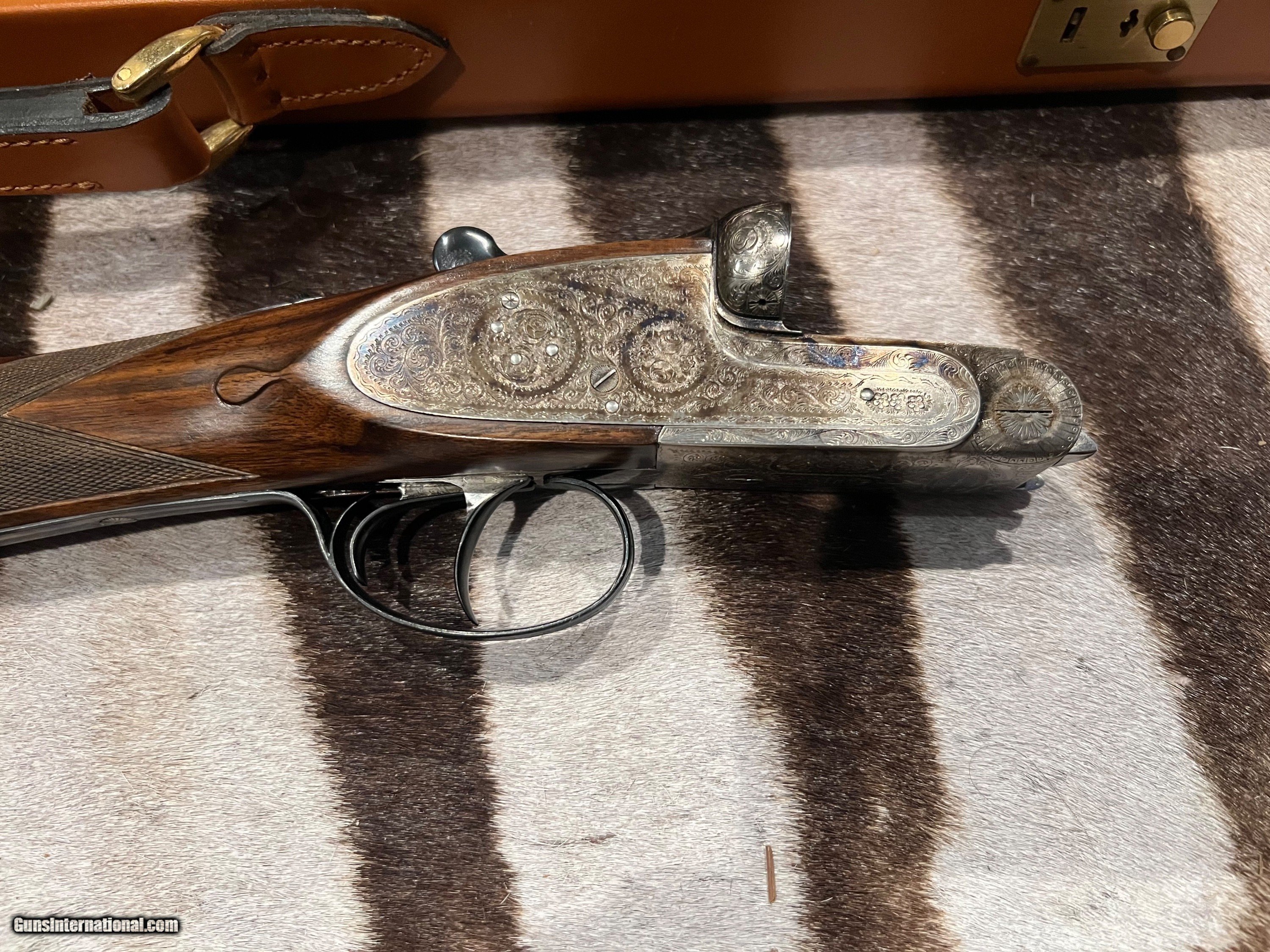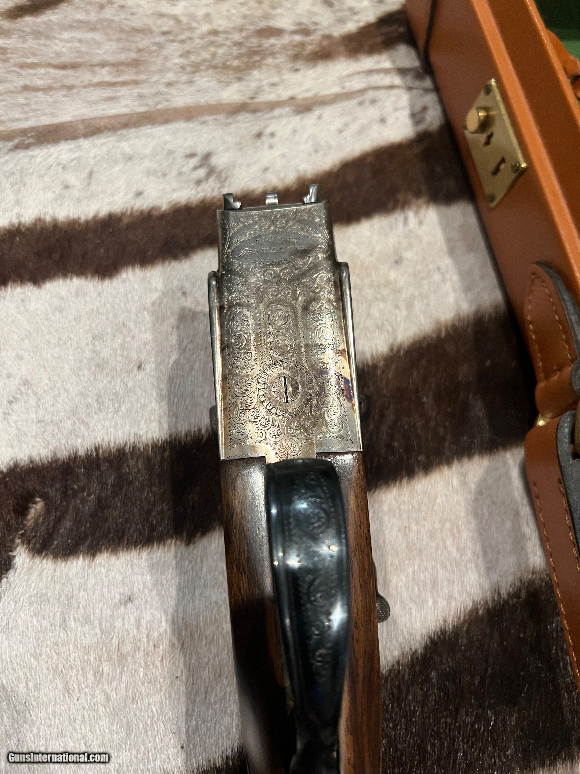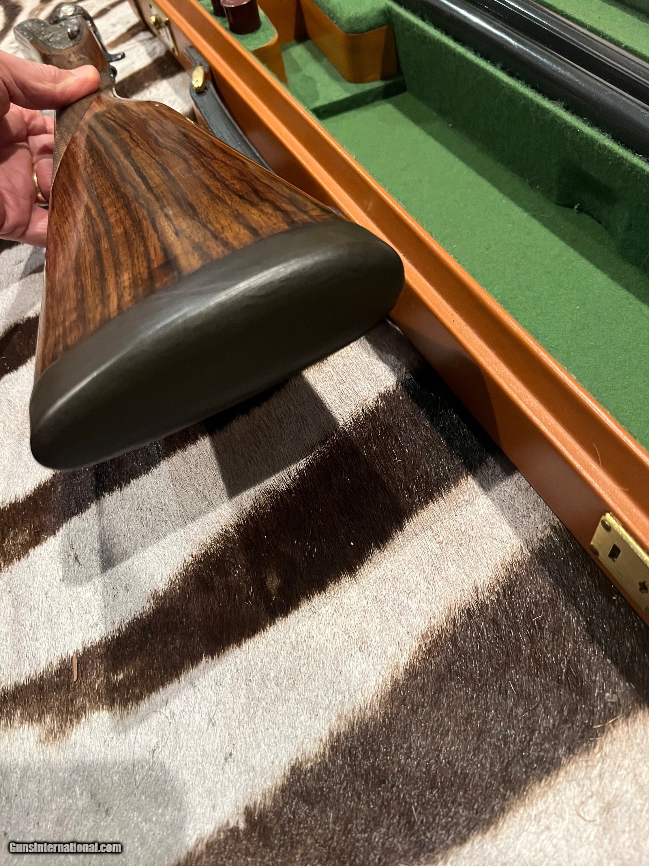Description: Arrieta model 578 ejector Hand detachable side lock with H&H style cocking indicators, 12 gauge 26" chopper lumps barrels with Churchill style rib choked 0.15 left 0.10 right spectacular fine scroll engravings and case coloring, double trigger with front articulated, beautiful European walnut level four stock with original leather recoil pad. Stock dimensions are DC 1-1/2" DH 1-7/8" LOP 15" from front trigger, very slight right hand cast almost neutral, the weight is 6 pounds 8 ounces. The gun is in pristine condition metal and wood with almost no sign of use in the original leather case. Overall a beautiful side by side from this renowned Basque gun maker with all the features of a much more expensive English gun. For additional questions or to purchase call/text 512-595-1248 Quality trades like Krieghoff Perazzi and English sporting rifles welcomed Shotgun Gauge: 12 Gauge Manufacturer: Arrieta Model: 803 Barrel Length: 26” Ejectors: Yes Condition: 100% Bore Condition: 100% Barrel Type: Chopper Lumps Triggers: Double with articulated front Stock: European walnut Stock Comb: 1-1/2” Stock Heel: 1-7/8” Fore End: Splinter type Butt Pad: Original leather LOP: 15” from front trigger Rib: Churchill type Finish: Case color Weight: 6 pounds 8 ounces Sights: Silver front bead Chokes: Fixed Choke Left: 0.25 Choke Right: 0.10 Engraving: Fine scroll Case: Origin leather Item Location: North Carolina Price: $6,500.00 Contact Seller |