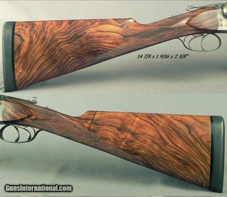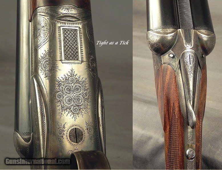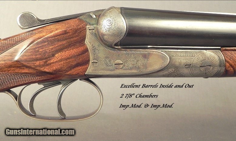 Description: #1668, Charles Daly Prussian 10 Bore Made by Lindner (Heinrich August Lindner) in 1914 as a Model 185, Anson and Deeley Designed Action, 30" Ejector Dovetail Lump Krupp Fluid Steel Barrels with Rib Extension Hidden Cross Bolt at .768 .034 & .035" (Imp.Mod. & Imp.Mod.), 2 7/8" Chambers, The forcing cones perfectly opened by a professional, Wall thickness on the right barrel at .044" & .047" on the left, Correct bores at proof with the proper Untersuchungsstempel inspection mark along with the second proof for threefold the normal charge that is marked on both barrels, Both barrels with the proper Lindner stamp, Side clip action body, Intercepting safety sears, Double triggers, Cocking indicators, Scalloped action back, Carved frame and carved standing breech, Auto safety, Splinter forend with a Deeley & Edge release, Straight hand stock at 14 7/8 x 1 9/16 x 2 3/8" over a 1" pad, Excellent wood with great black/brown contrast that remains as stout as the day it was inletted, Proper 10 Bore weight at 9 lbs. 4 oz., 65% coverage of typical Germanic scroll, It retains an honest and original case color of 40% and the breech face has 70% original colors left, There is no primer burn at the striker holes, The barrels superbly re-blacked and remain now at 97%, The stock has been professionally re-oiled with the wood still slightly proud of the metal and it now is 98%, The checkering is 100%, A very stout set of barrels inside and out that are near 100%, The striking on the outside of the barrels is near perfect and they ring with a nice chime. This is a very nice representative 10 Bore Ejector Lindner Daly. In 1865 Charles Daly formed the famous sporting goods business named Schoverling & Daly in New York City and later became Schoverling, Daly & Gales in 1873. For many years they sold only the finest quality sporting arms. Then in 1910 Henry Modell bought the firm and sold it to the Walzer Family in the 1920's, they owned Sloan's Sporting Goods in Ridgefield, Conn. but kept Charles Daly & Co. in New York. In 1976, Sloan's sold the Charles Daly trademark to Outdoor Sports Headquarters Inc. in Dayton, Ohio. This turn of the century piece most likely was a Schoverling, Daly & Gales import, and it has lived a very sheltered life on these shores and remains a very nice example of early 1900's quality. Linder made quality guns to about 1916 and it is believed no more of his guns were made after WWI. This Lindner Daly was about $200 retail at the time it was imported. SOLD Curio/Relic: Yes Shotgun Gauge: 10 Gauge |