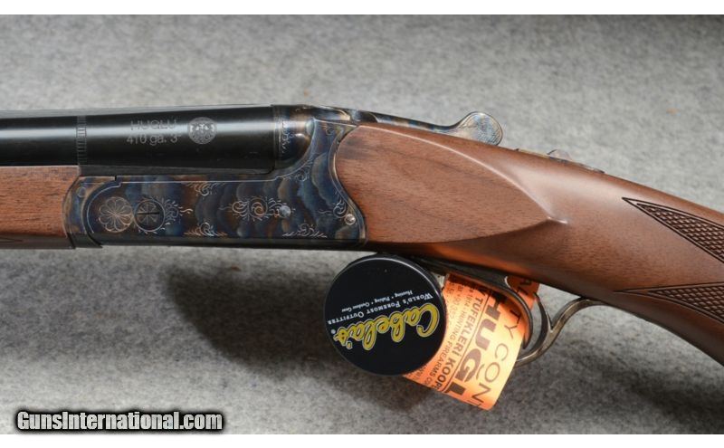 Description: SOLD Caliber Info: .410 Bore Chambers: 3 Inch Metal Condition: ANIB Wood Condition: ANIB Bore Condition: ANIB Barrels: 28 inch Triggers: Double triggers Stock: Checkered walnut, flat knob pistol grip Stock Dimensions: 14-3/4 inch LOP to front trigger Fore End: Matching checkered walnut with Schnabel. Butt Pad: Rubber pad Weight: 5 lb - 10 oz Sights: Gold bead Chokes: Fixed Improved Cylinder and Modified Extras: Case, manual Item Location: Rogers,, MN |