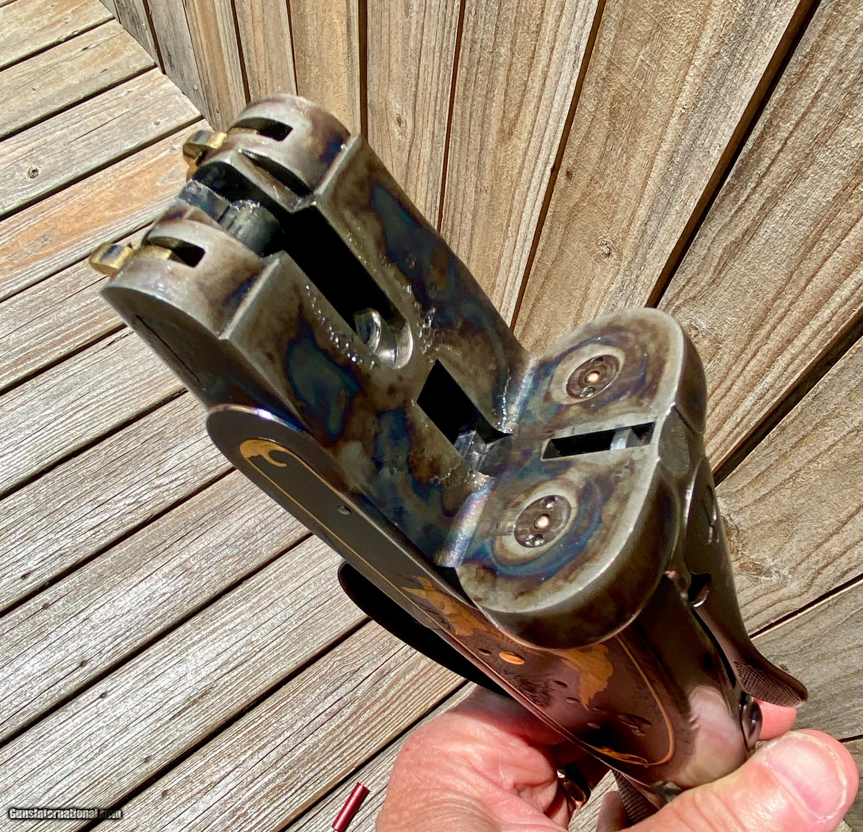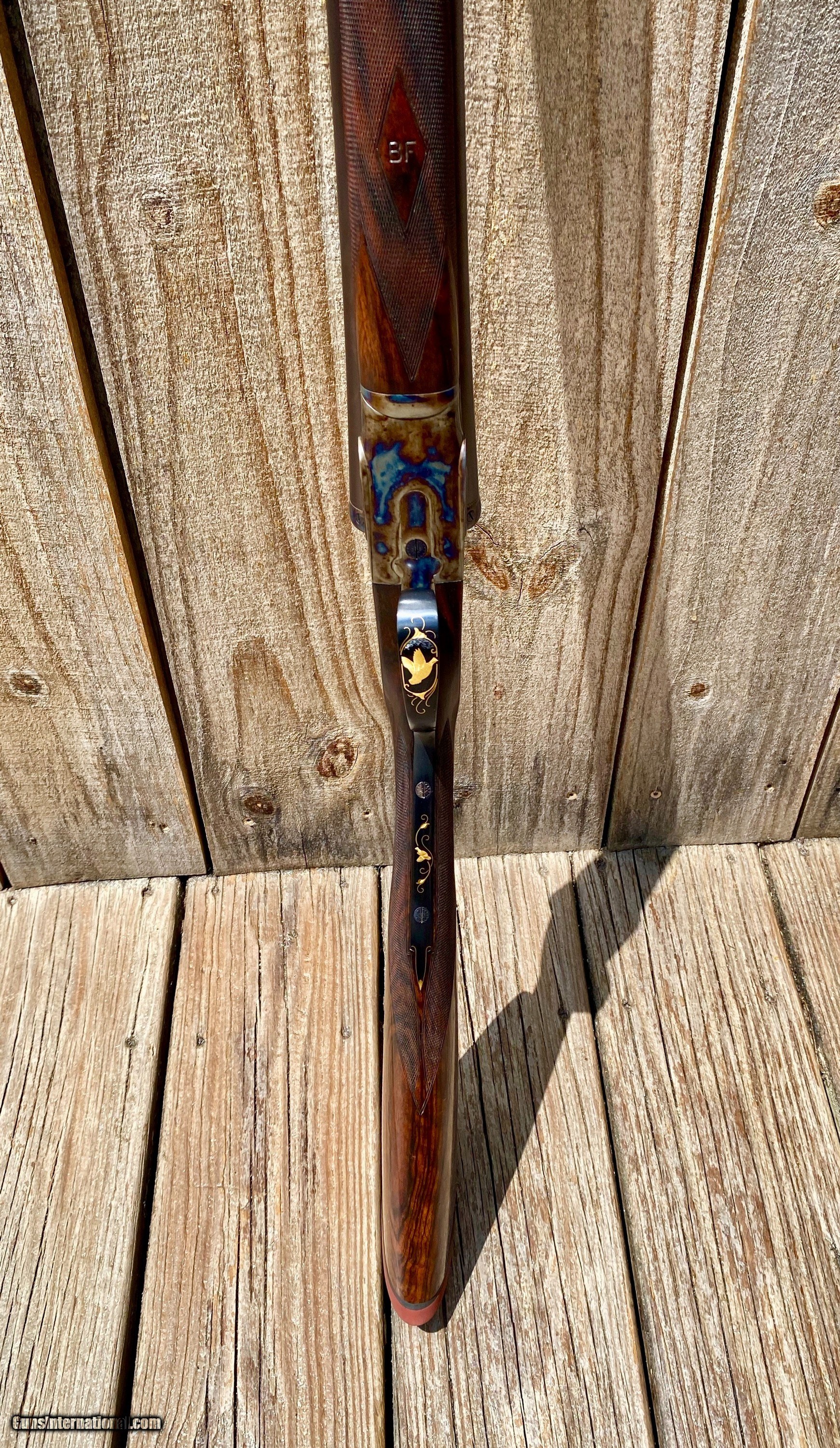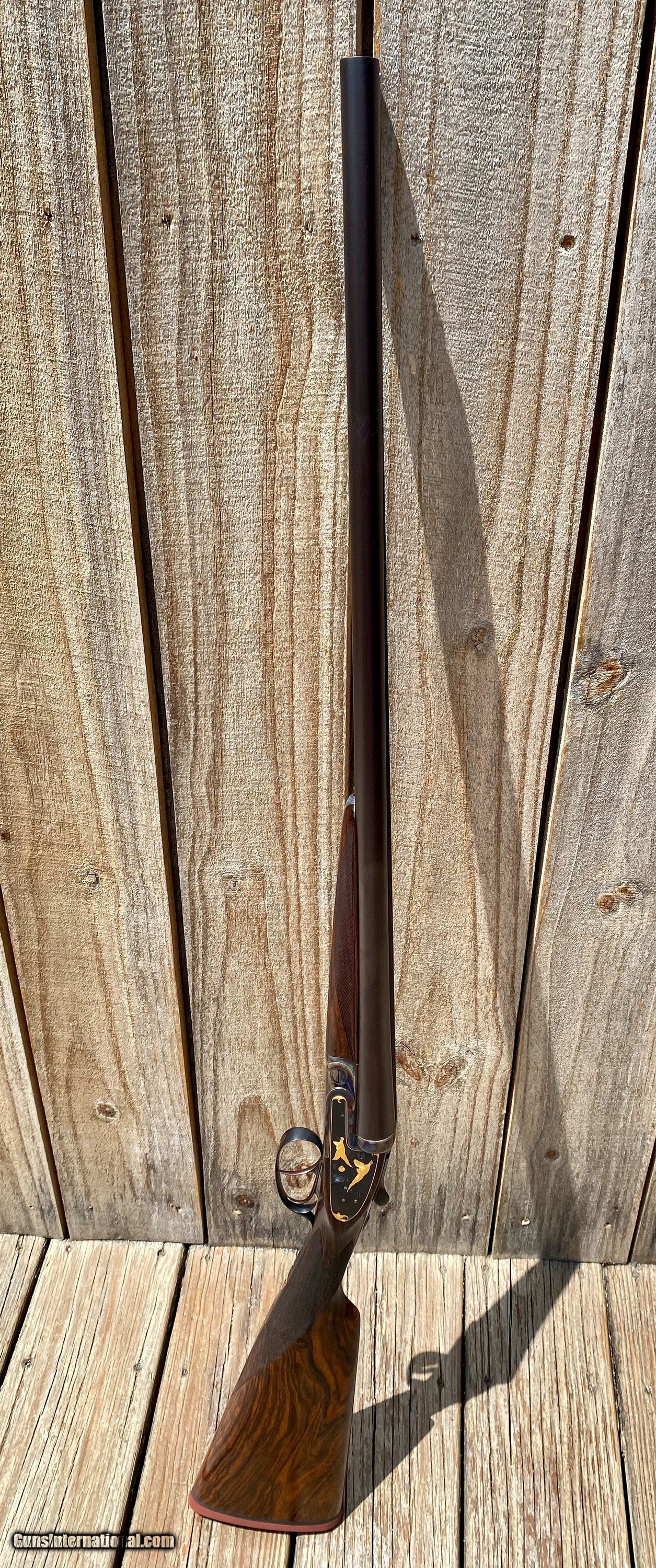 Description: THIS IS A SUPER NICE EROUPEAN TRUE SIDELOCK SXS. I CAN NOT FIND A MAKERS NAME SO NOT SURE WHO MADE IT SORRY. IT HAS BEEN REDONE MANY YEARS AGO BY TURNBULL BUT THE STOCK WAS LEFT ALONE. ALL THE INTERNALS WHERE ALSO GOLD PLATED AS IT WAS ORIGANLY. THE CHOKES IN THE 26 AND 1/2" 12 GA. BARRELS ARE CLY. AND CLY. I AM UNSURE IF THEY WERE CUT YOU BE THE JUDGE. IT CURRENTLY HAS BRILEY ULTRA LIGHT 28GA TUBES WITH CHANGABLE CHOKES THAT WERE MADE AND FITTED TO THIS GUN BY BRILEY. IT HAS EJECTORS AND FRONT HINGED TRIGGER. TAPERED RIB AND HAS GOLD 3 ON FOREND AND TOP LEVER. THE DETAIL ON THE INLAYED BIRDS IS OUTSTANDING AS WELL AS THE INLAY LINE WORK. THE STOCK LOP IS 14 3/4 FROM THE 1/2INCH PAD AND 13 3/4 FROM THE REAR TRIGGER. THE DROP OF THE COMB FRONT IS 1 1/2" AND REAR IS 2" THE GUNS WIEGHS 6 AND 3/4POUNDS WITH THE TUBE INSTALLED. I HAD THIS LOOKED OVER BY LOCAL SMITH ANS SAID EVERYTHING IS WORKING FINE AND IS A VERY HIGH QUALTY 7 PIN SIDE LOCKS PLEASE CHECK OUT THE PHOTOS ON THIS BEAUTIFUL SXS. THIS WAS A FAMLIY GUN AND I HAVE NO USE FOR IT SO I DECIDED TO SELL. DONT MISS THIS LOVELY SXS. ASKING PRICE 4595.00 PLUS SHIPPING AND INS TO YOUR FFL. ***NO CALIFORNIA SALES***. SOLD Shotgun Gauge: 28 Gauge |
