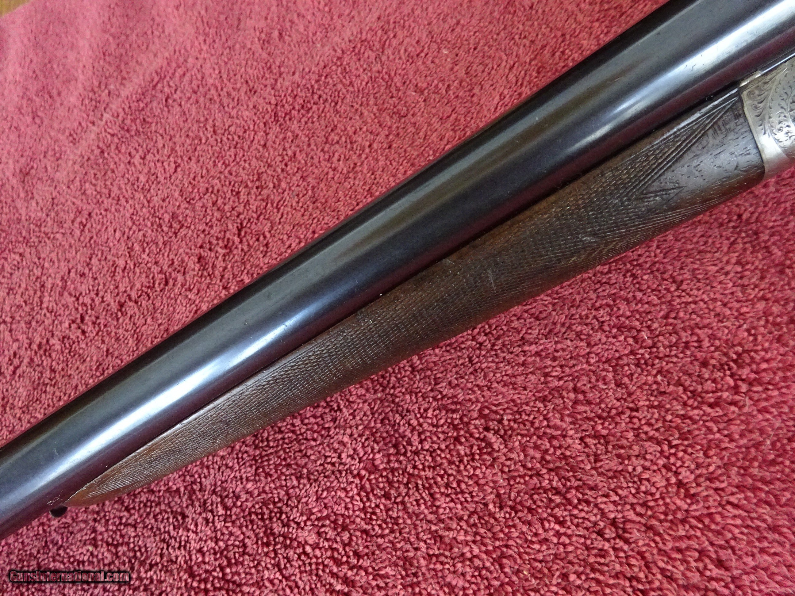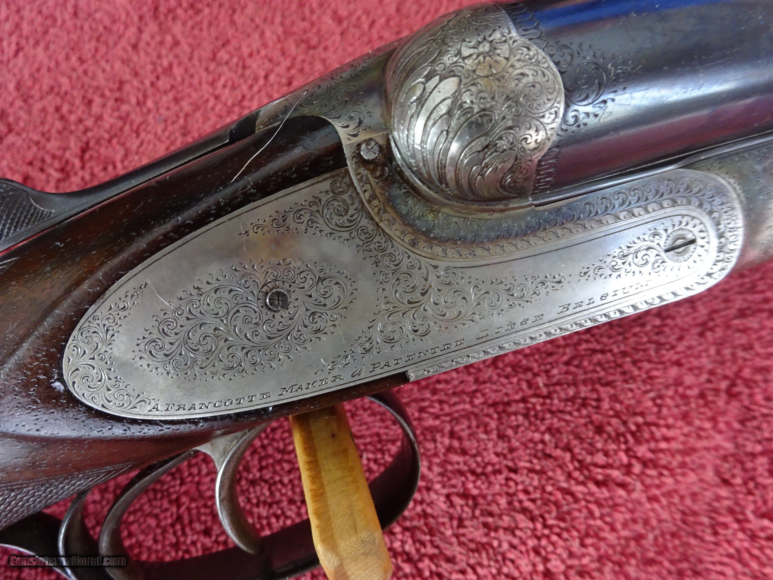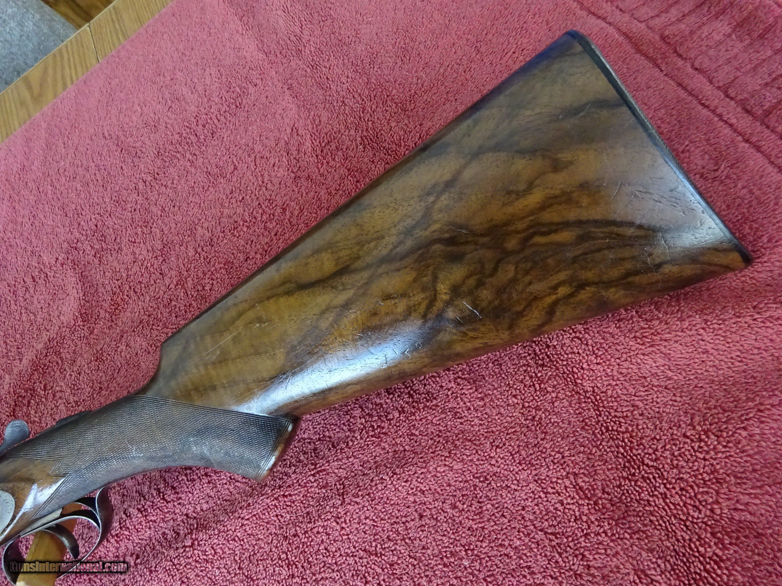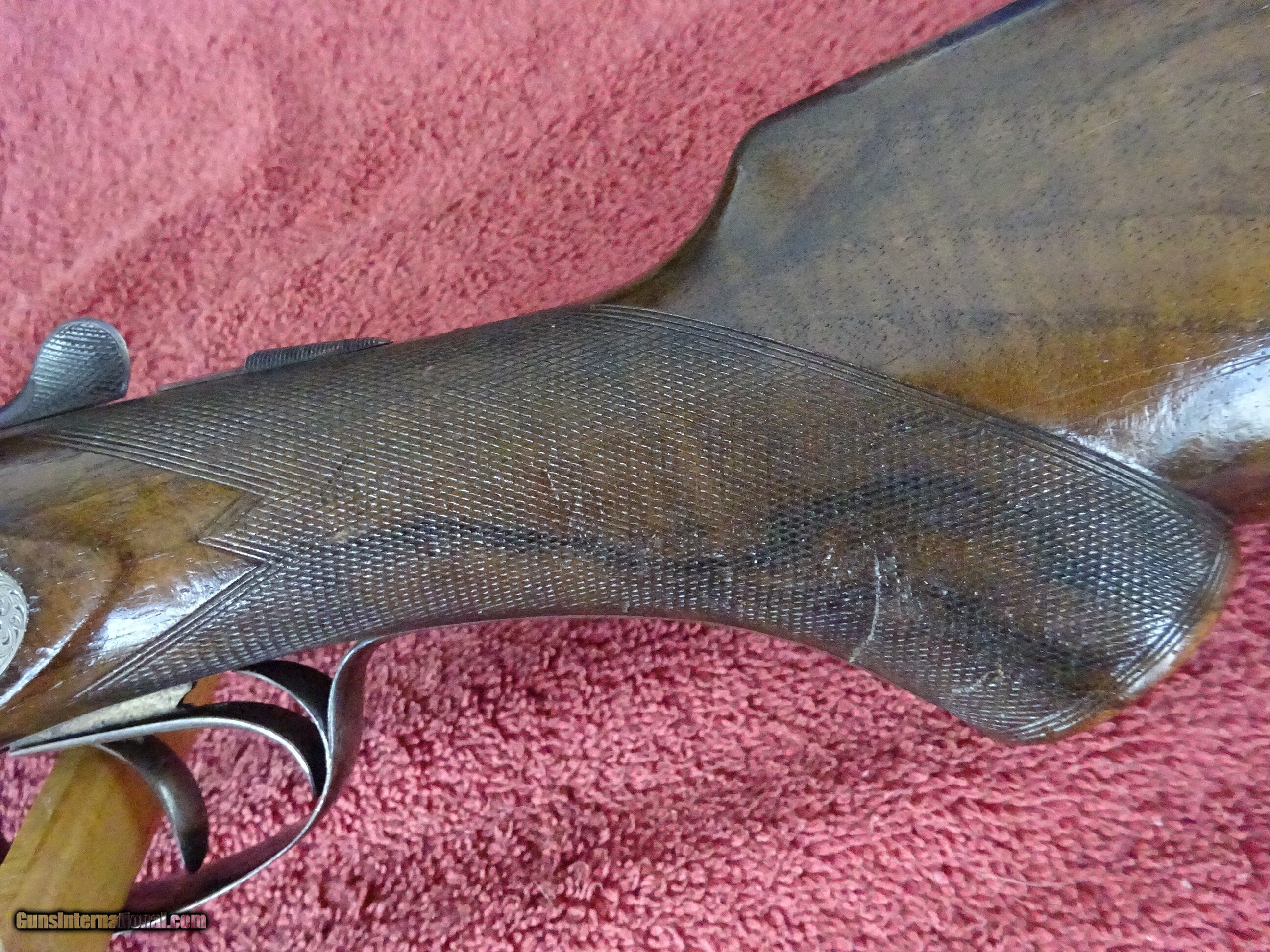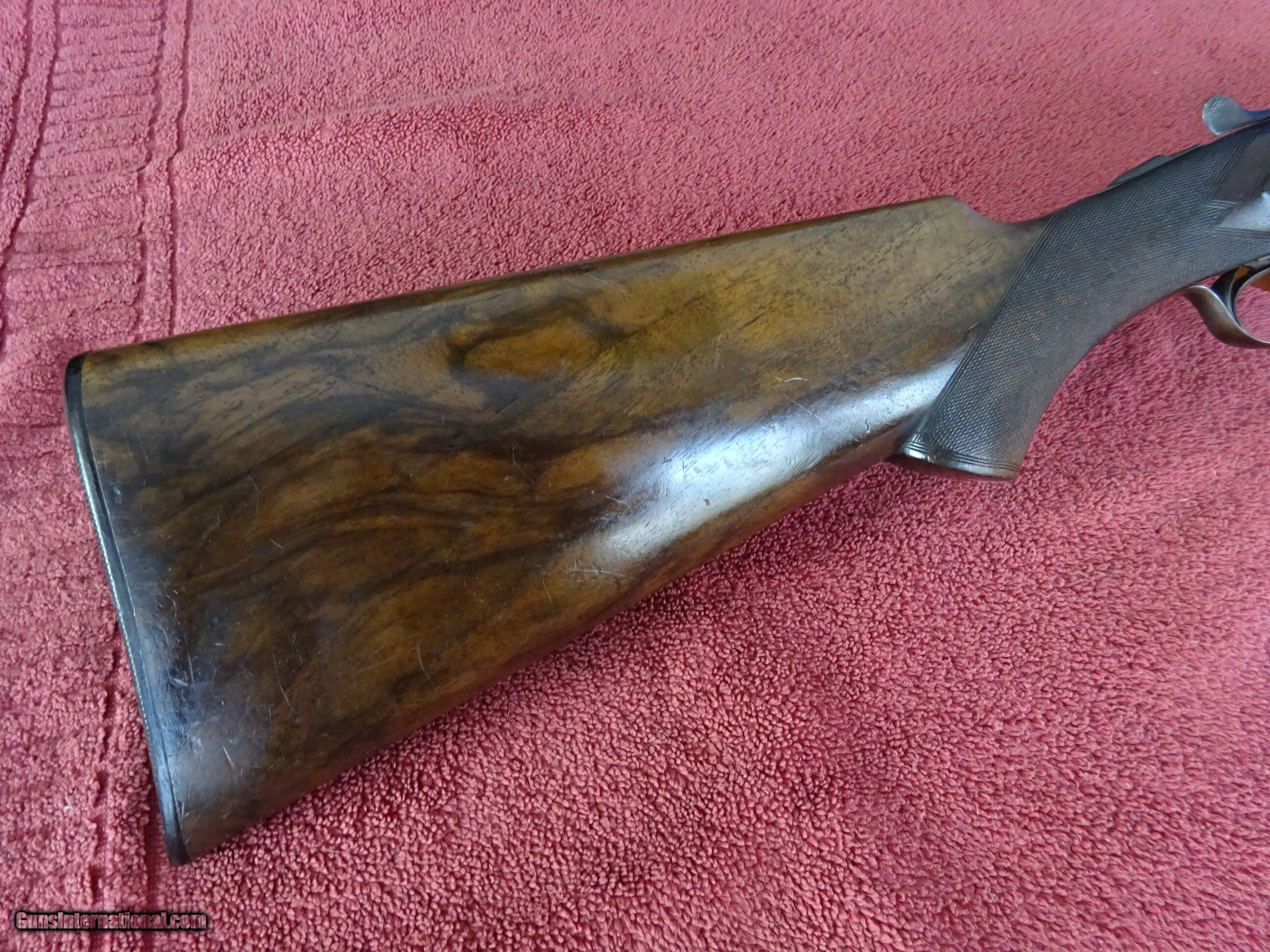 Description: FRANCOTTE GRADE 20, 12 GAUGE, 26" BARRELS, IMCYL. (.008) AND IM. MODIFIED (.028), 2 5/8" CHAMBERS, SINGLE BEAD SIGHT, AUTOMATIC EJECTORS. AUTO SAFETY, EXCELLENT BRIGHT BLUE, MIRROR PERFECT BORES, MATTED CONCAVE RIB WITH GOLD INLAY BAR AT THE ENGRAVED RIB EXTENSION. SIDELOCK FRAME WITH SOME VIVID CASE COLOR, NICELY ENGRAVED WITH VERY FINE SCROLL WORK AND INTRICATE BORDERS. FENCES ARE NICELY CARVED WITH LEAF AND SCROLL PATTERN. BOTH LOCKS ARE MARKED "FRANCOTTE MAKER & PATENTEE LIEGE BELGIUM", "S" SAFETY GOLD INLAY, TOP LEVER TO THE RIGHT, TIGHT ON FACE. PISTOL GRIP STOCK, SPLINTER FOREARM, EXTREMELY FINE CHECKERING. BEAUTIFULLY FIGURED EUROPEAN WALNUT WITH BOLD BLACK STREAKS. HORN BUTTPLATE, ENGRAVED SCREWS, 1 1/4" X 1 7/8" X 14 1/4", 6 POUNDS 3 OUNCES. ONLY FLAW IS A SLIVER OF WOOD MISSING FROM THE RIGHT FRONT OF THE FOREARM. VERY HIGH QUALITY EUROPEAN DOUBLE, PROBABLY PRE-WWII PRODUCTION. ALL ORIGINAL CONDITION. $2350.00 + $70.00 Insured shipping to an FFL address. Layaway is available. See all Pats gun listings on this site! We also have hundreds of ORIGINAL gun company advertising & memorabilia pieces available for sale on our site SPORTINGCOLLECTIBLES. We have no reprints or reproductions. Email for more information. If you need to call, morning or evening is best, and please note the Seller's Inventory number. Curio/Relic: Yes Price: $2,350.00 Shipping: $70.00 Contact Seller |