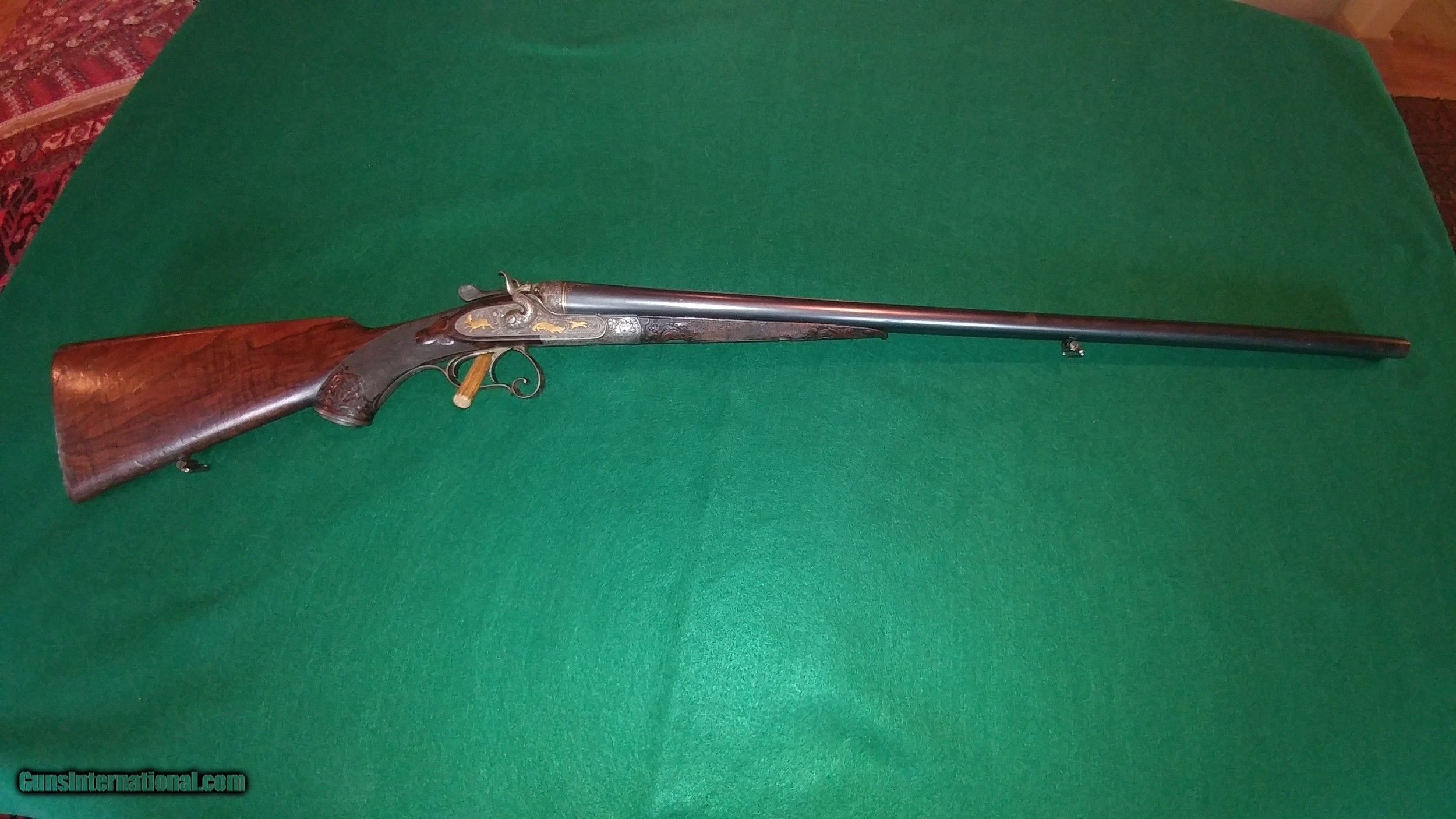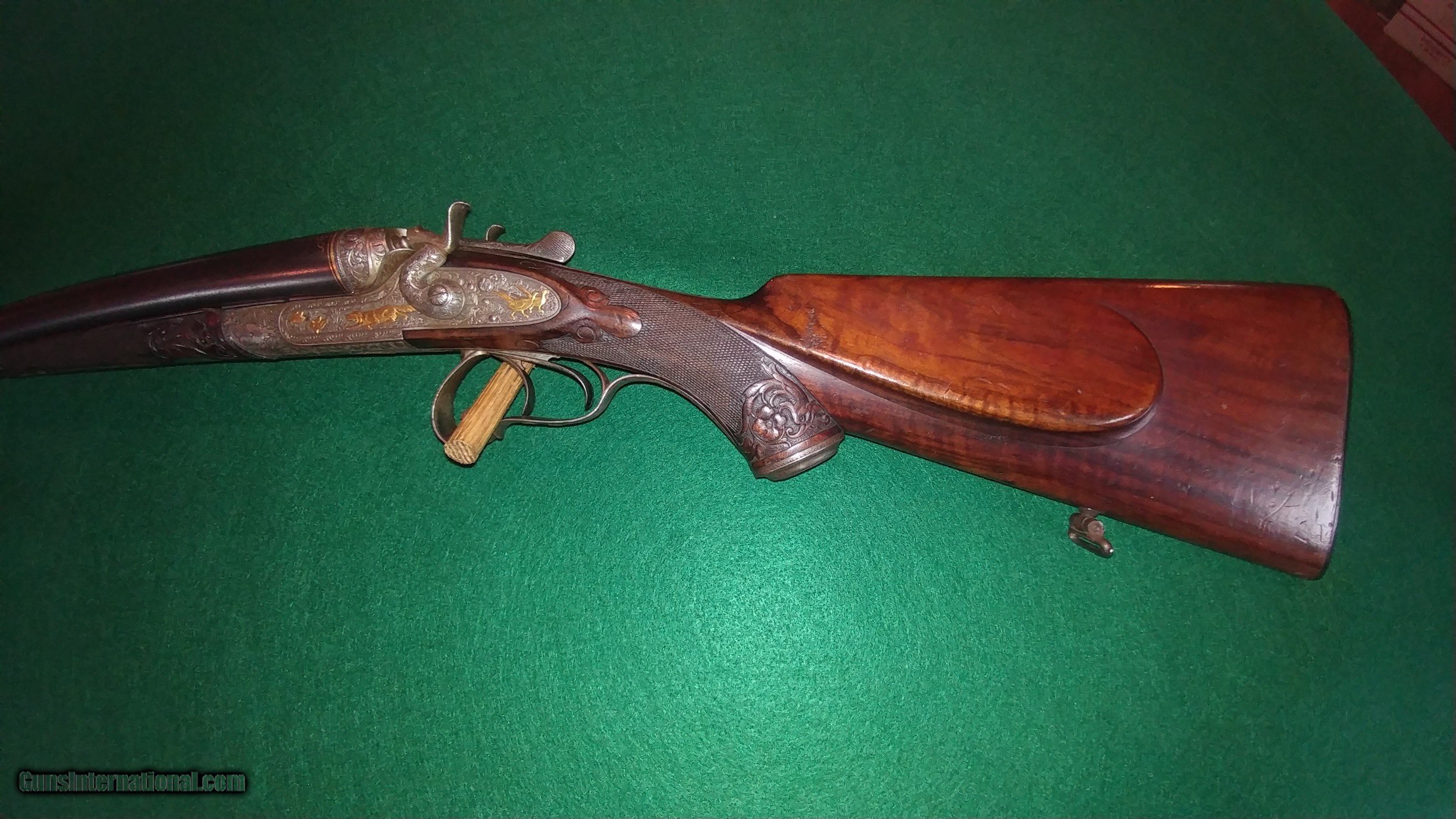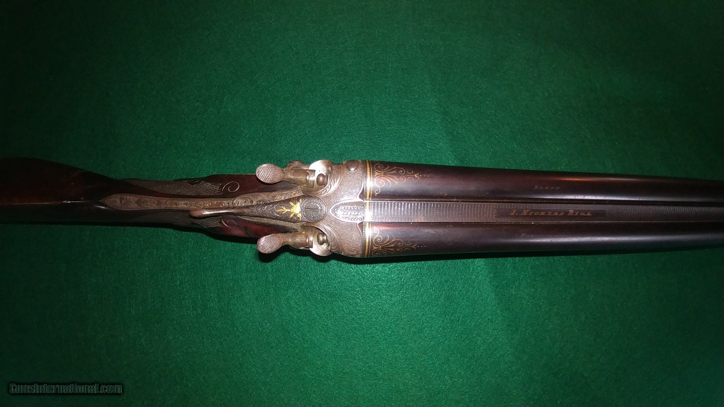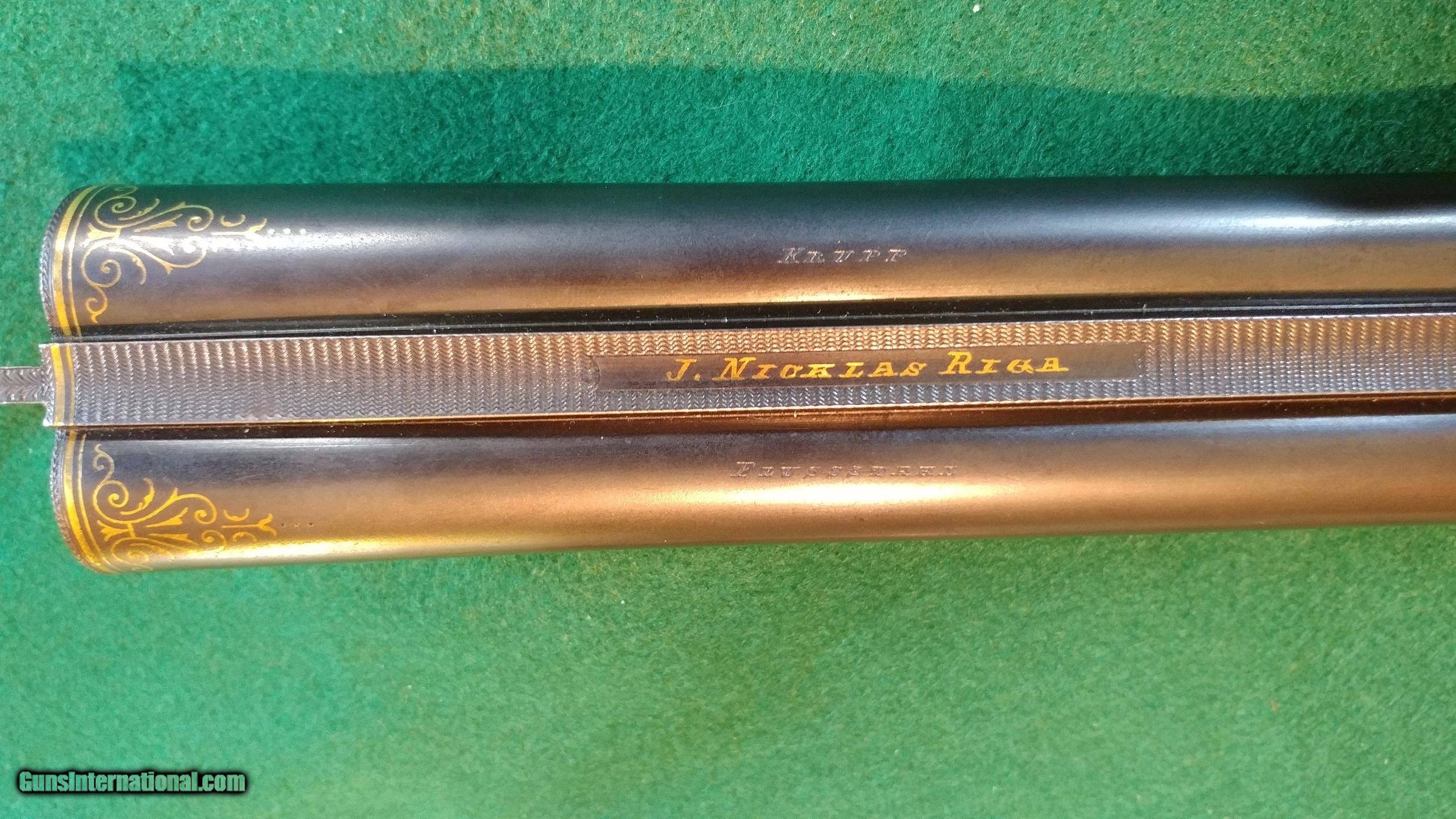 Description: J.Nicklas of Riga, Latvia, maker: ornate engraved, gold-inlayed and carved hammer 12ga double; SN2650. Johann Nicklas was a German-born gunsmith who established a business in Old Riga in 1875 (Old Riga was destroyed during WWII). He made beautiful guns in the German-best tradition under his name and guns that were signed by him for the famous German maker J.P. Sauer and Sohn. This 12 ga. is representative of his best work and includes deep full-coverage engraving with gold inlays and nicely figured carved wood. The 30" barrels, which are also gold-inlaid, are marked Krupp Flussstahl (mild steel) with 90%+ of the original and exceptional quality rust blue. They are choked 0.707"R (modified) and 0.692"L (full) and chambers are 2.5". There is minor shallow pitting in the bores but they are shiny and smooth for the most part and still robust with wall thicknesses at the mauzzle of 0.048R and 0.050L. The barrels and the action exhibit German proof marks. Other features include triple lock-up, which is vault-tight with Greener-style cross-bolt, sidelocks with fine lockwork and rebounding hammers, pistol grip with intricately engraved steel grip-cap, checkered horn buttplate, 14" pull and 1.5" drop at the heel. The top of the heel has a scrape and the buttplate has two drops of paint and is locally rough along its right side (see photos). The gun is in fine condition overall and representative of the best in the Germanic gunmaking traditions of the time. It is remarkably light weight and handles like an upland game gun. Antique, $50 shipping. SALE PENDING SOLD Antique: Yes Shotgun Gauge: 12 Gauge |