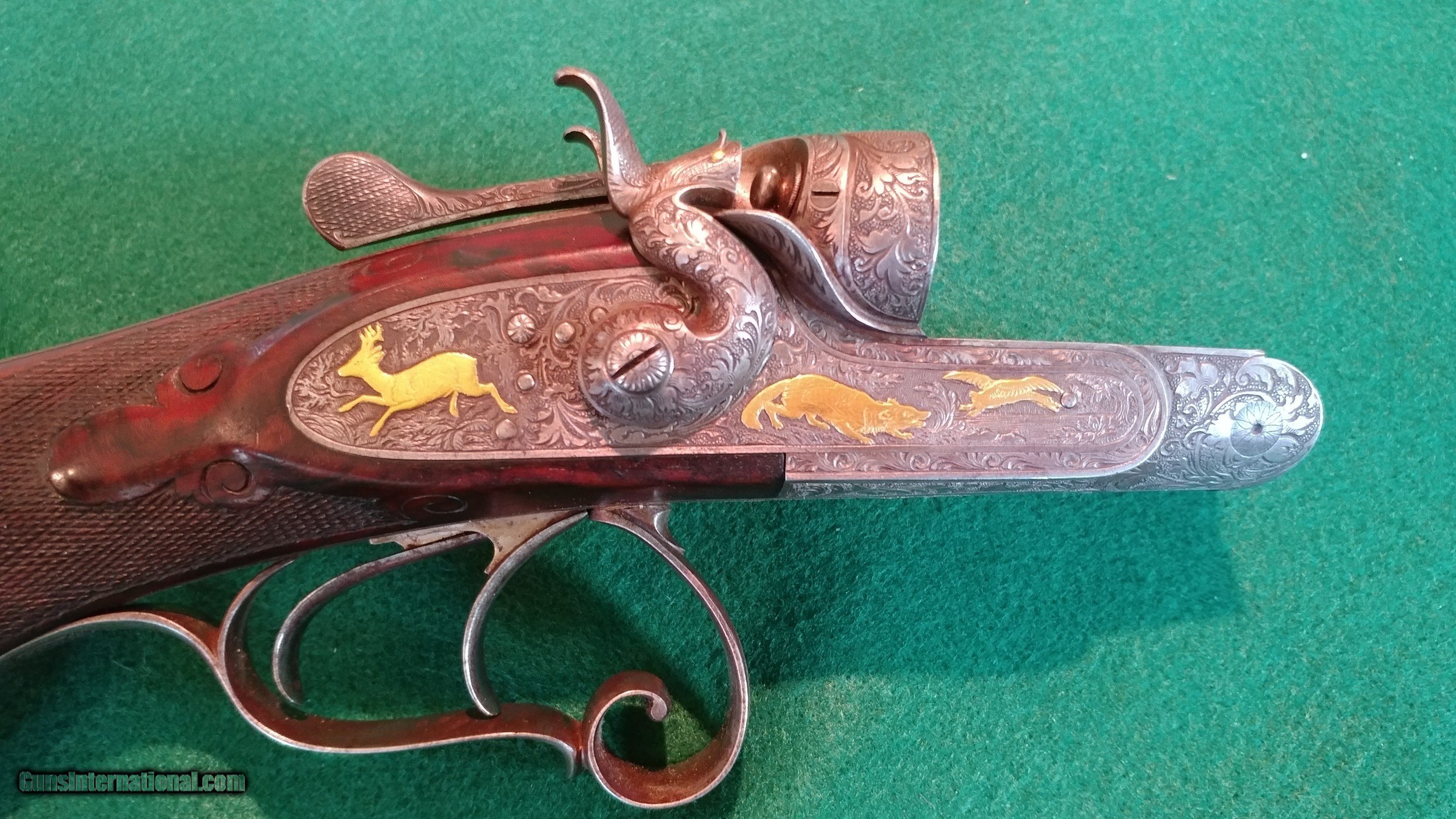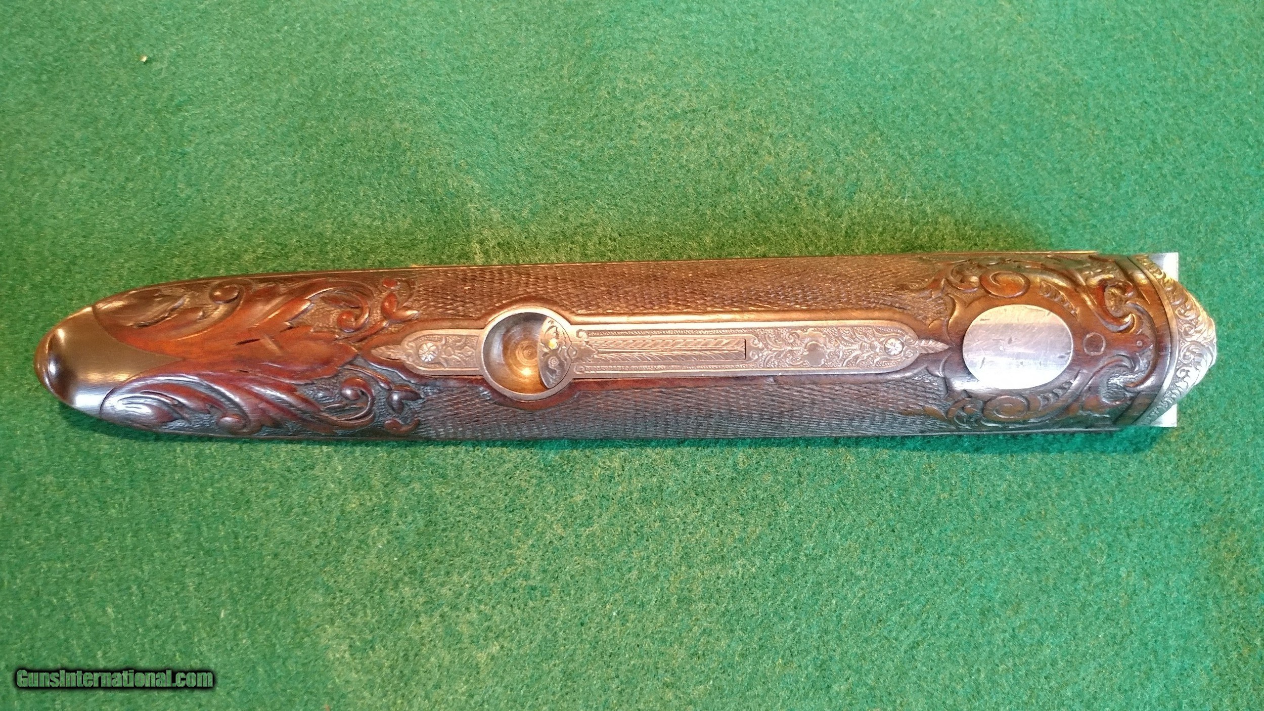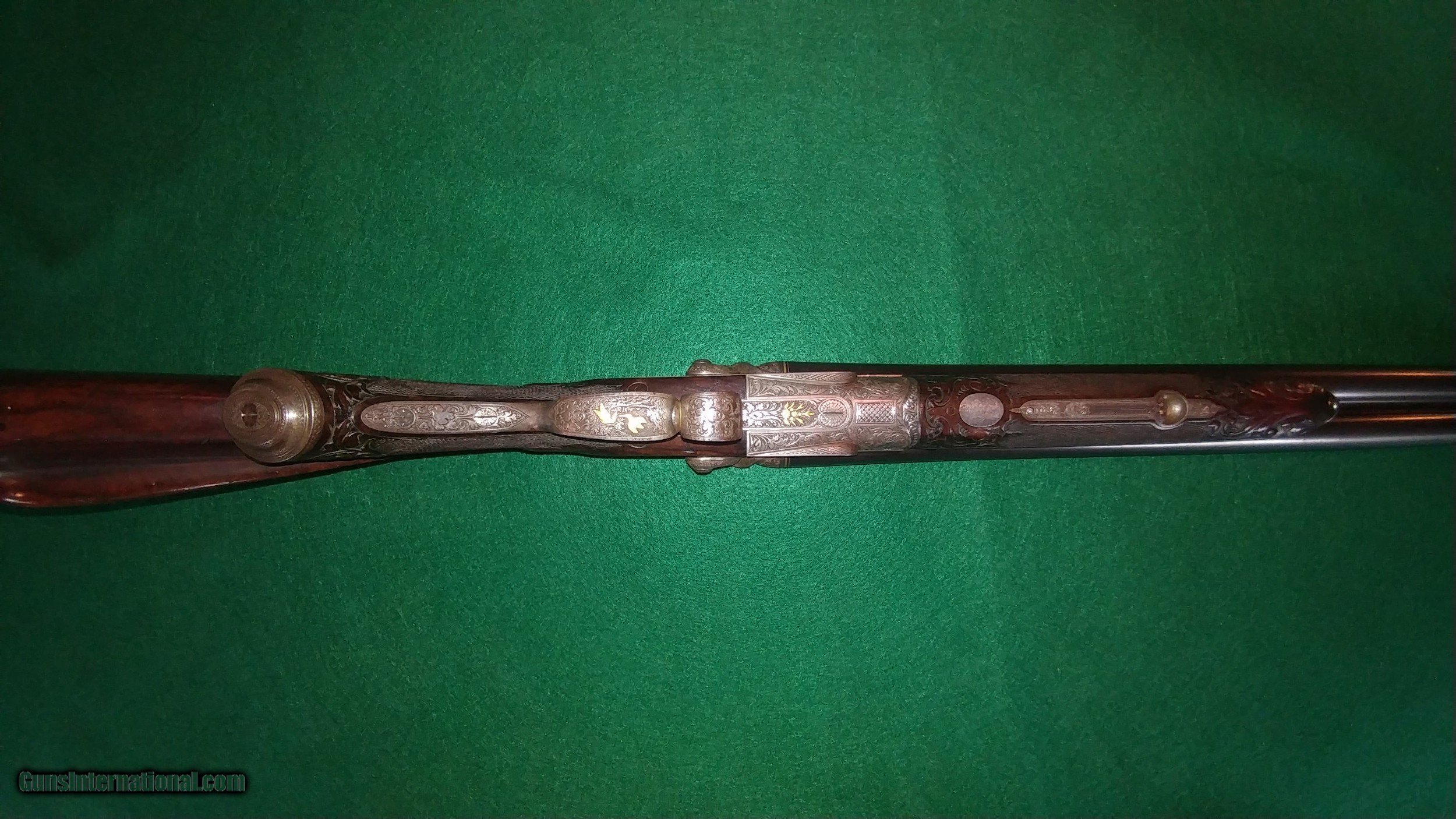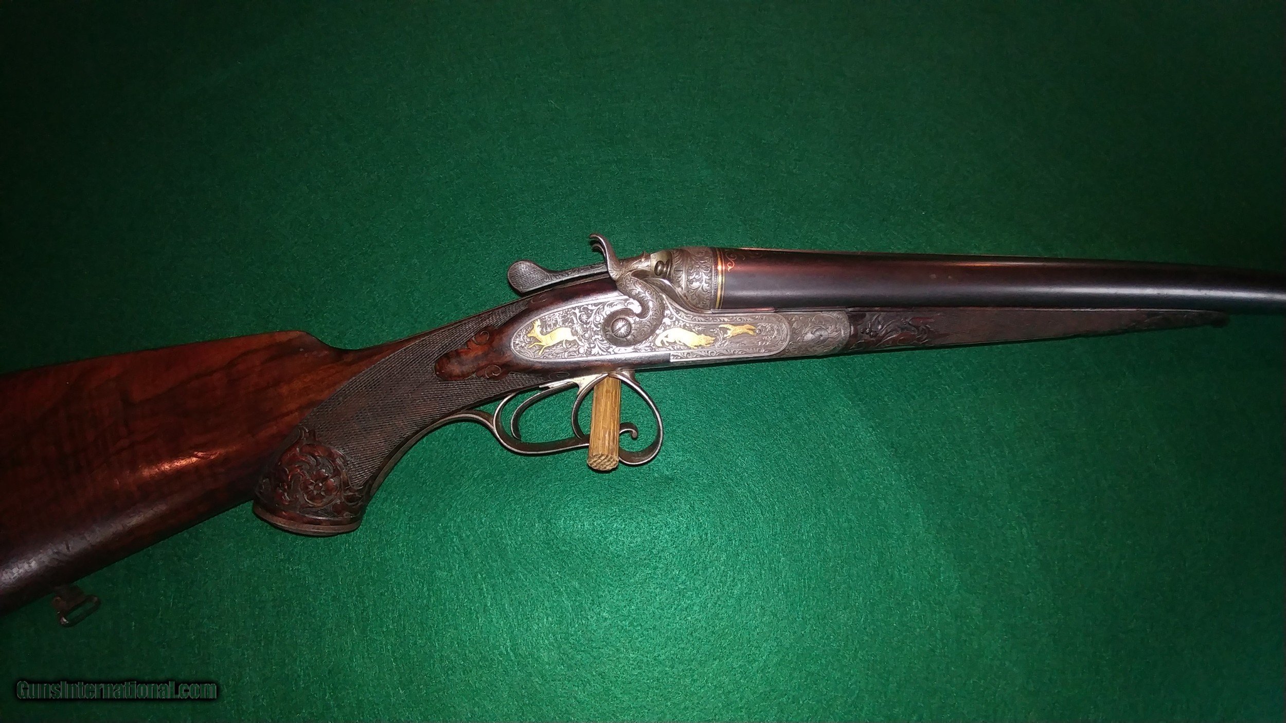 Description: J.Nicklas of Riga, Latvia, maker: ornate engraved, gold-inlayed and carved hammer 12ga double; SN2650. Johann Nicklas was a German-born gunsmith who established a business in Old Riga in 1875 (Old Riga was destroyed during WWII). He made beautiful guns in the German-best tradition under his name and guns that were signed by him for the famous German maker J.P. Sauer and Sohn. This 12 ga. is representative of his best work and includes deep full-coverage engraving with gold inlays and nicely figured carved wood. The 30" barrels, which are also gold-inlaid, are marked Krupp Flussstahl (mild steel) with 90%+ of the original and exceptional quality rust blue. They are choked 0.707"R (modified) and 0.692"L (full) and chambers are 2.5". There is minor shallow pitting in the bores but they are shiny and smooth for the most part and still robust with wall thicknesses at the mauzzle of 0.048R and 0.050L. The barrels and the action exhibit German proof marks. Other features include triple lock-up, which is vault-tight with Greener-style cross-bolt, sidelocks with fine lockwork and rebounding hammers, pistol grip with intricately engraved steel grip-cap, checkered horn buttplate, 14" pull and 1.5" drop at the heel. The top of the heel has a scrape and the buttplate has two drops of paint and is locally rough along its right side (see photos). The gun is in fine condition overall and representative of the best in the Germanic gunmaking traditions of the time. It is remarkably light weight and handles like an upland game gun. Antique, $50 shipping. SALE PENDING SOLD Antique: Yes Shotgun Gauge: 12 Gauge |
