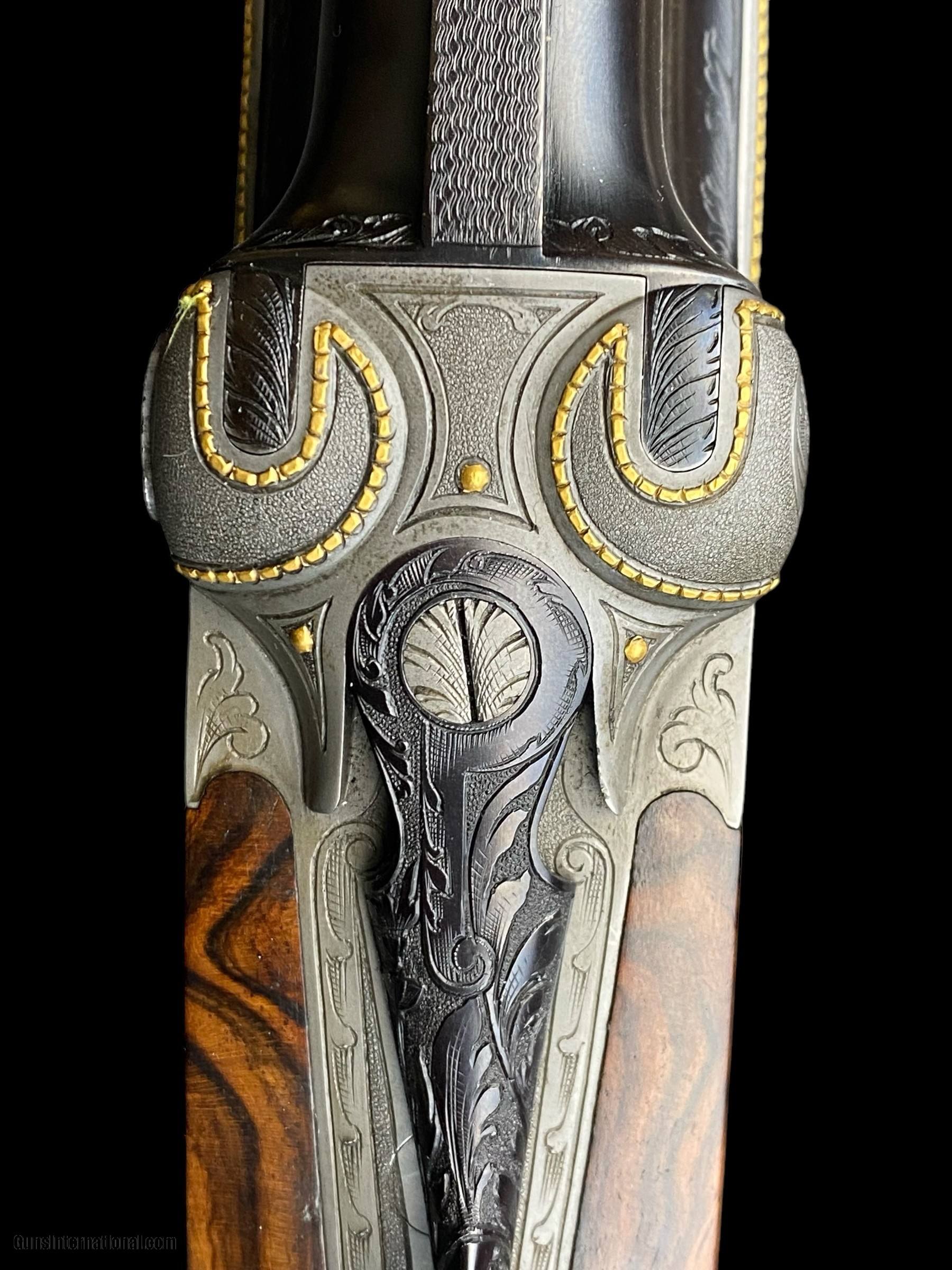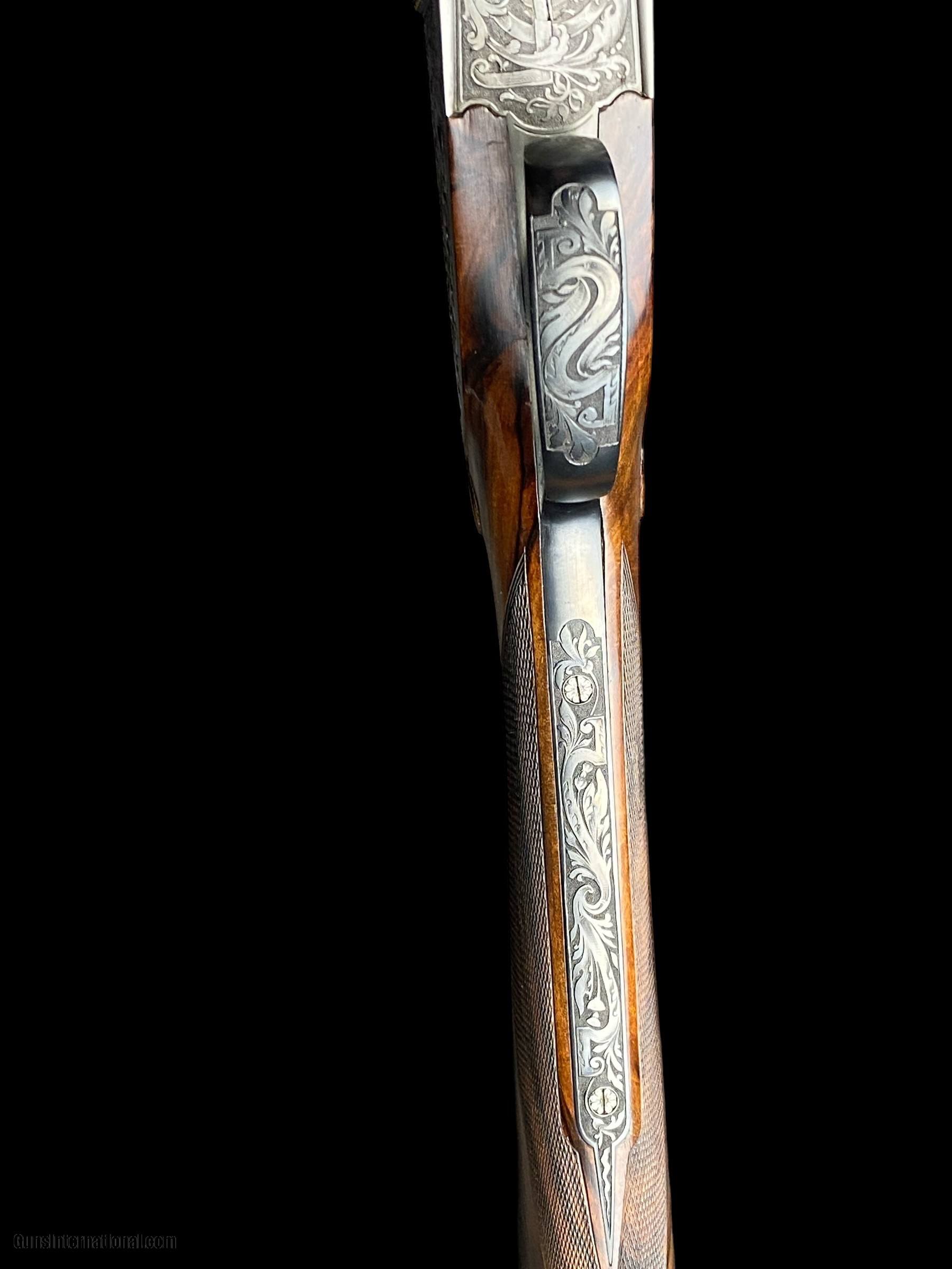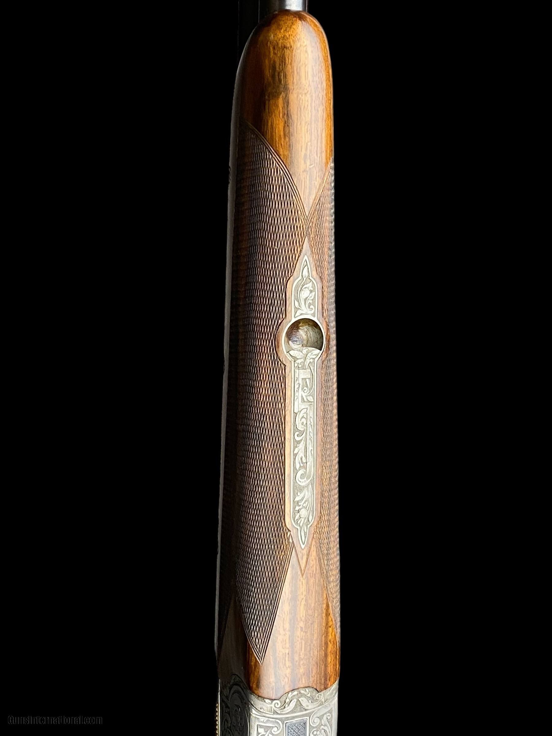Description: JOH. OUTSCHAR - FERLACH, AUSTRIA MODEL: DELUXE OVER UNDER SPORTING SIDELOCK GAME GUN SN: 2339 20GA - 76MM / 3" CHAMBERS 28 1/2" BOHLER STEEL BARRELS W/ VENT RID AND SINGLE FRONT BEAD CHOKES: .008 / .021 (IC/MOD) EJECTORS FULL SIDELOCK ACTION W/ DOUBLE KIRSTEN CROSSBOLTS AND DOUBLE UNDERBITES MASTERFULLY HAND-ENGRAVED W/ FLOWING VINE AND CELTIC STYLING - GOLD DOT EDGE ACCENTS. LONG BOTTOM TANG DOUBLE GOLD TRIGGERS W/ HINGED FRONT TRIGGER EXHIBITION GRADE TURKISH WALNUT STRAIGHT GRIP STOCK W/ CHECKERED BUTT THREE-PIECE FOREND DIMS: LOP: 14 7/8", DAC: 1 1/2", DAH" 2 1/2" WEIGHT: 7LBS 2 OZ. CONDITION: GUN IS IN AS-NEW CONDITION WITH ALL ORIGINAL FINISHED REMAINING. BEAUTIFUL GUN. GENTLEMEN, THIS IS A TRULY FINE 20GA GAME GUN MADE BY A VERY RESPECTED FERLACH MAKER AND QUALITY LIKE MERKEL, HEYM, FANZOJ, HAUPTMANN, SCHEIRING, KRIEGHOFF, AND SAUER. STUNNING FINISHED AND BALANCE. REPLACEMENT COST FOR THIS GUN WOULD BE WELL OVER $50k. YOU WILL BE PLEASED WITH THIS FINE FIREARM. PLEASE CALL NOW! FFL REQUIRED FLAT $50 S/H/I CARD FEE APPLIES SOLD Shotgun Gauge: 20 Gauge Manufacturer: OUTSCHAR Model: DELUXE O/U Barrel Length: 28.5 Chambers: 3 Ejectors: YES Condition: AS-NEW Metal Condition: AS-NEW Wood Condition: AS-NEW Bore Condition: AS-NEW Action: SLE Triggers: DOUBLE |