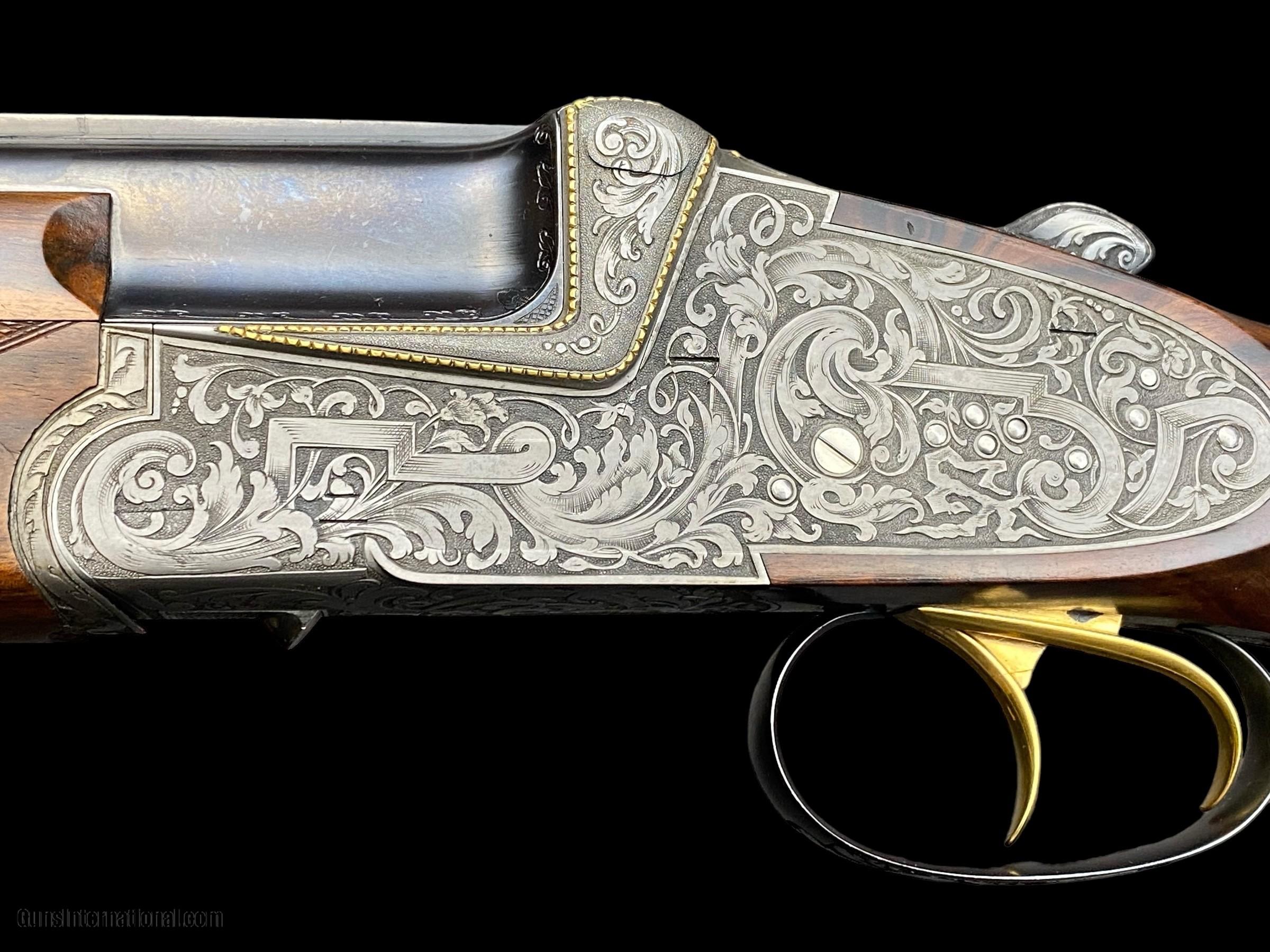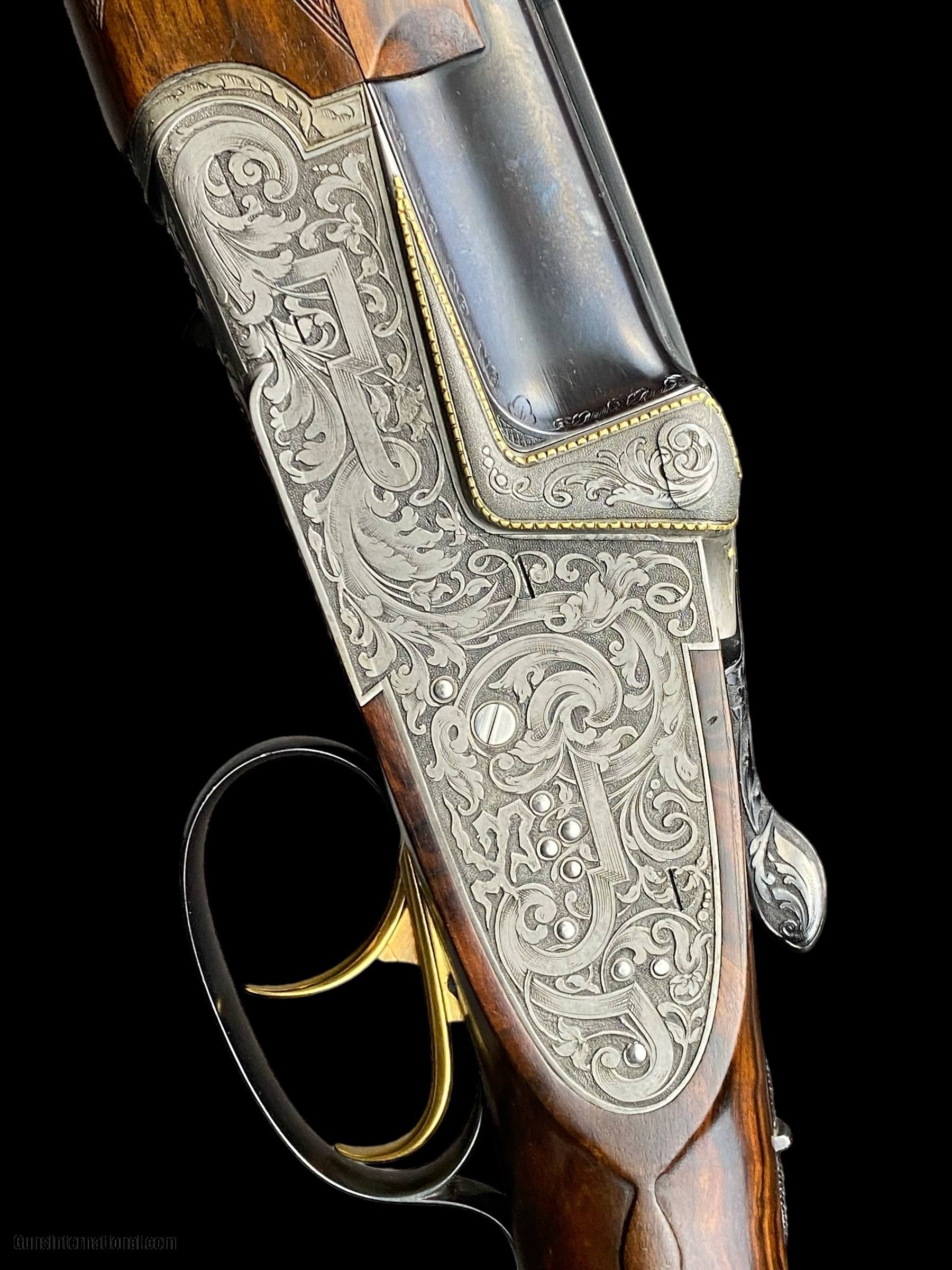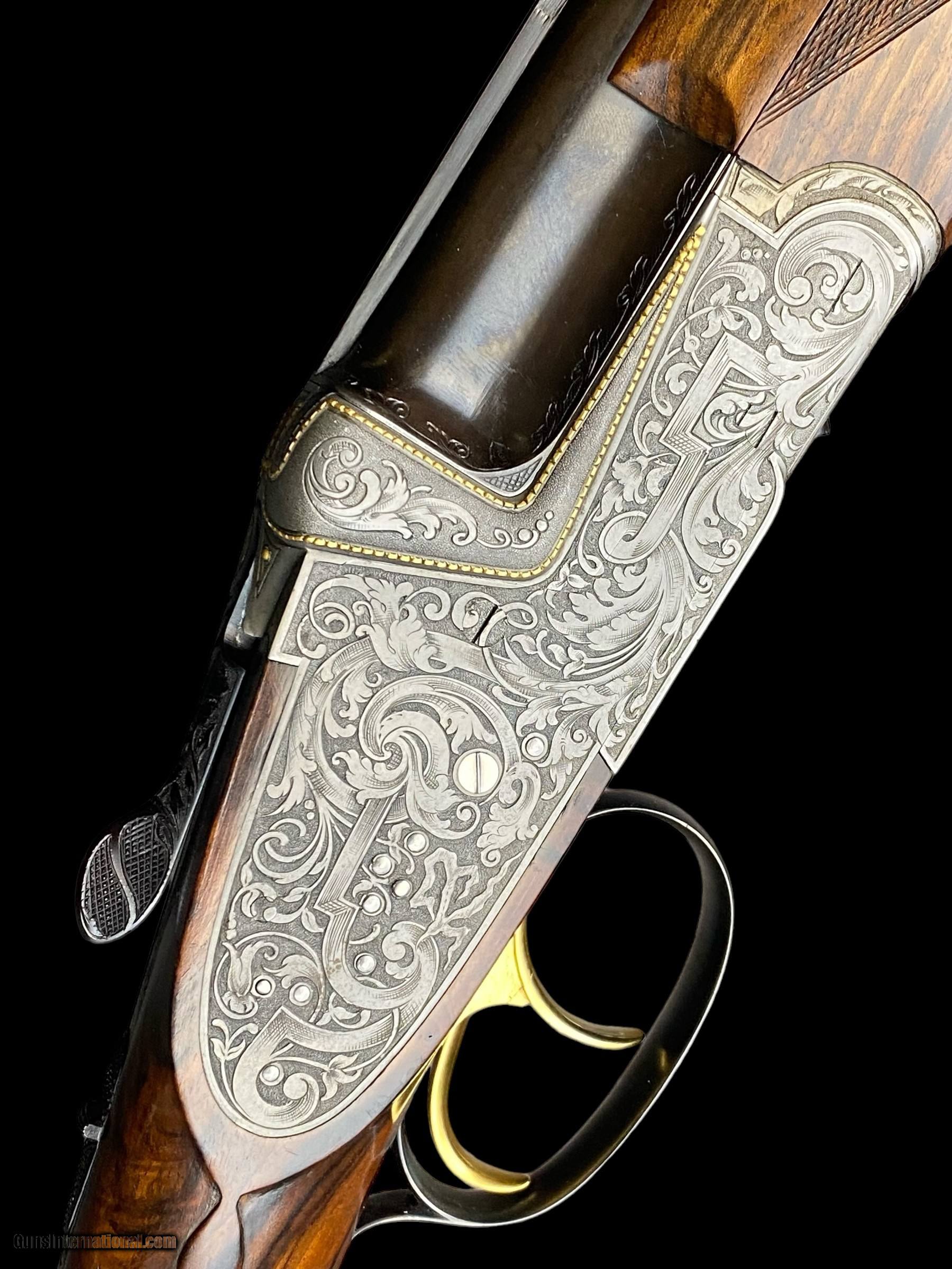 Description: JOH. OUTSCHAR - FERLACH, AUSTRIA MODEL: DELUXE OVER UNDER SPORTING SIDELOCK GAME GUN SN: 2339 20GA - 76MM / 3" CHAMBERS 28 1/2" BOHLER STEEL BARRELS W/ VENT RID AND SINGLE FRONT BEAD CHOKES: .008 / .021 (IC/MOD) EJECTORS FULL SIDELOCK ACTION W/ DOUBLE KIRSTEN CROSSBOLTS AND DOUBLE UNDERBITES MASTERFULLY HAND-ENGRAVED W/ FLOWING VINE AND CELTIC STYLING - GOLD DOT EDGE ACCENTS. LONG BOTTOM TANG DOUBLE GOLD TRIGGERS W/ HINGED FRONT TRIGGER EXHIBITION GRADE TURKISH WALNUT STRAIGHT GRIP STOCK W/ CHECKERED BUTT THREE-PIECE FOREND DIMS: LOP: 14 7/8", DAC: 1 1/2", DAH" 2 1/2" WEIGHT: 7LBS 2 OZ. CONDITION: GUN IS IN AS-NEW CONDITION WITH ALL ORIGINAL FINISHED REMAINING. BEAUTIFUL GUN. GENTLEMEN, THIS IS A TRULY FINE 20GA GAME GUN MADE BY A VERY RESPECTED FERLACH MAKER AND QUALITY LIKE MERKEL, HEYM, FANZOJ, HAUPTMANN, SCHEIRING, KRIEGHOFF, AND SAUER. STUNNING FINISHED AND BALANCE. REPLACEMENT COST FOR THIS GUN WOULD BE WELL OVER $50k. YOU WILL BE PLEASED WITH THIS FINE FIREARM. PLEASE CALL NOW! FFL REQUIRED FLAT $50 S/H/I CARD FEE APPLIES SOLD Shotgun Gauge: 20 Gauge Manufacturer: OUTSCHAR Model: DELUXE O/U Barrel Length: 28.5 Chambers: 3 Ejectors: YES Condition: AS-NEW Metal Condition: AS-NEW Wood Condition: AS-NEW Bore Condition: AS-NEW Action: SLE Triggers: DOUBLE |
