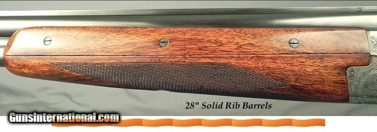 Description: #39177, Gebruder Merkel, Suhl: A 16 Bore Classic and Proper Period Suhl Made Gebruder Merkel O/U Model 201E Boxlock Ejector that was made in 1954, 28" Solid Rib Ejector Bohler Steel barrels at .667 .007 & .021" (Imp. Cyl. & Imp. Mod.), Original 2 3/4" chambers, Bolstered frame, Scalloped frame, Double triggers with the front articulated, 3 piece game forend, Pistol grip stock at 14 3/16 x 1 5/8 x 2 3/4" over a later Merkel buttplate with the Merkel name, Cast-Off for the right hand, 6 lbs. 4 oz., Sling eye on the barrel and the buttstock sling eye removed, No cheekpiece, 80% coverage of scroll and game scene engraving, Fairly nice wood, Both the forend and buttstock match well, Horn grip cap, The original barrel blue remains at 90%, The trigger guard & tang blue is 80%, The original frame finish remains at 96-97%, The striker holes are perfect, The stock finish is at 90-92%, The checkering is at 97%, It has 2 retainer screws on key screws, The barrels inside & out remain excellent plus and almost look like they did in 1954. A very solid and original gun in every respect and will last a lifetime of upland shooting. It has great weight; super stock dimensions and is a very good value for the money from the great era of everything Suhl, Germany. SOLD Curio/Relic: Yes |