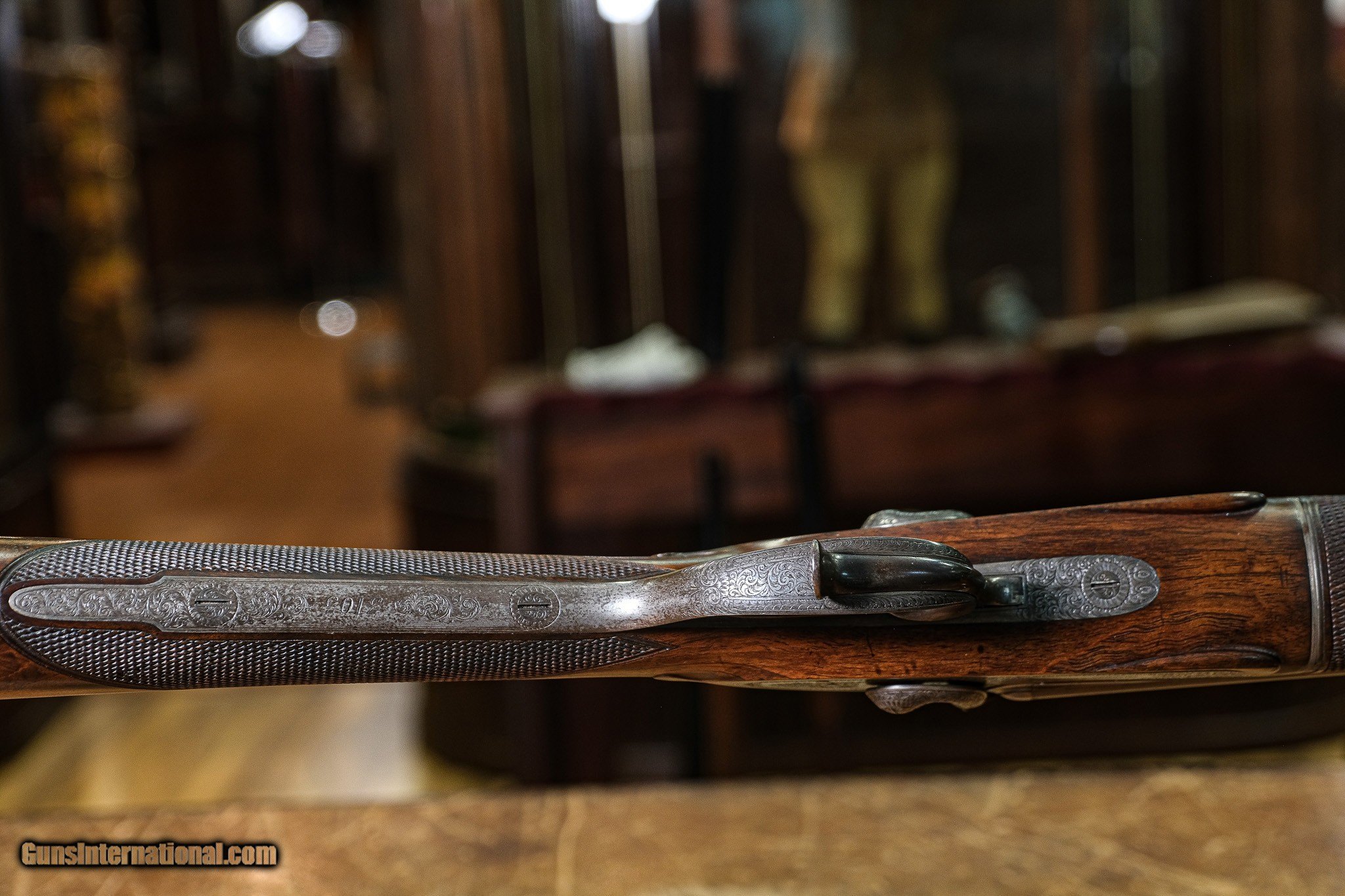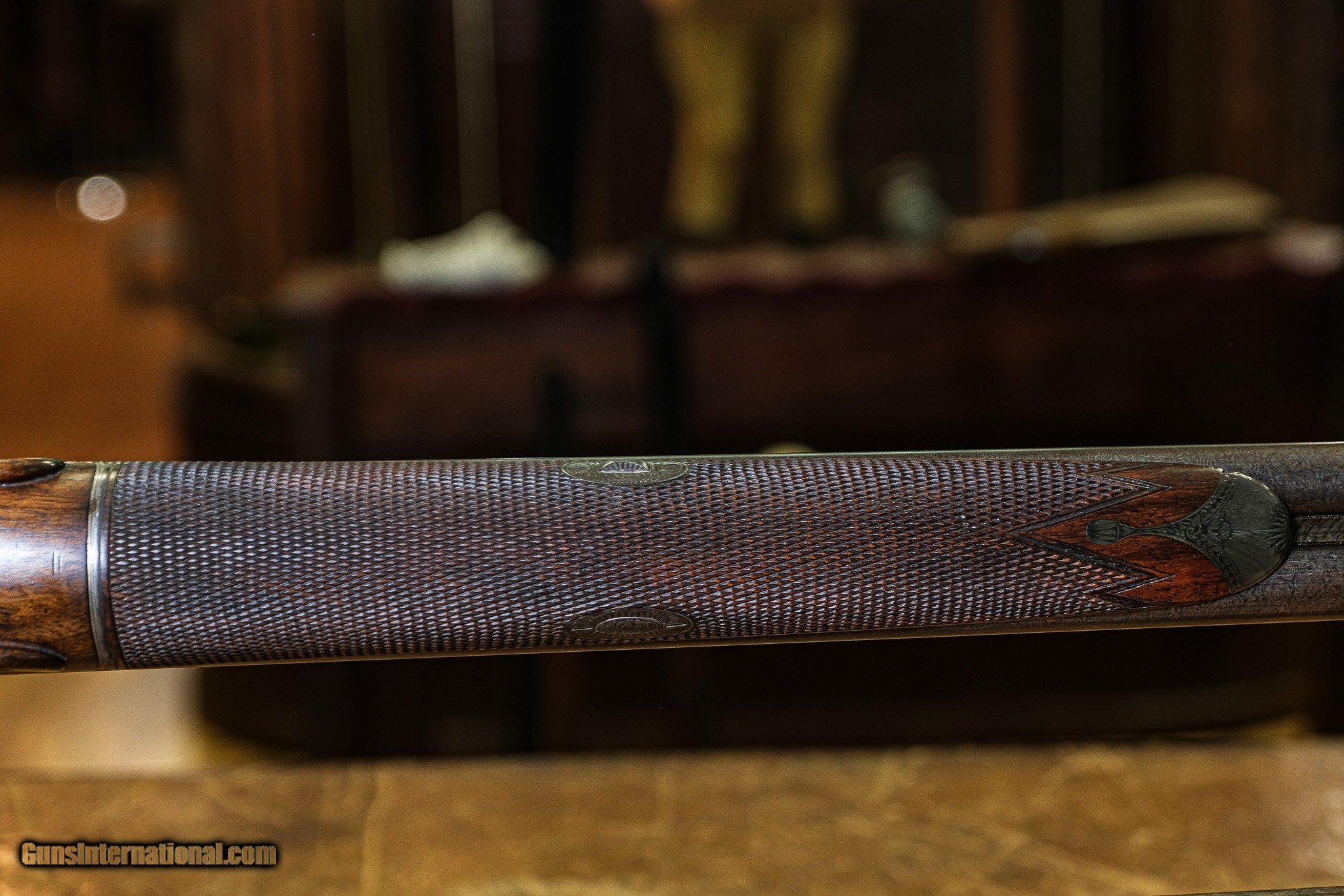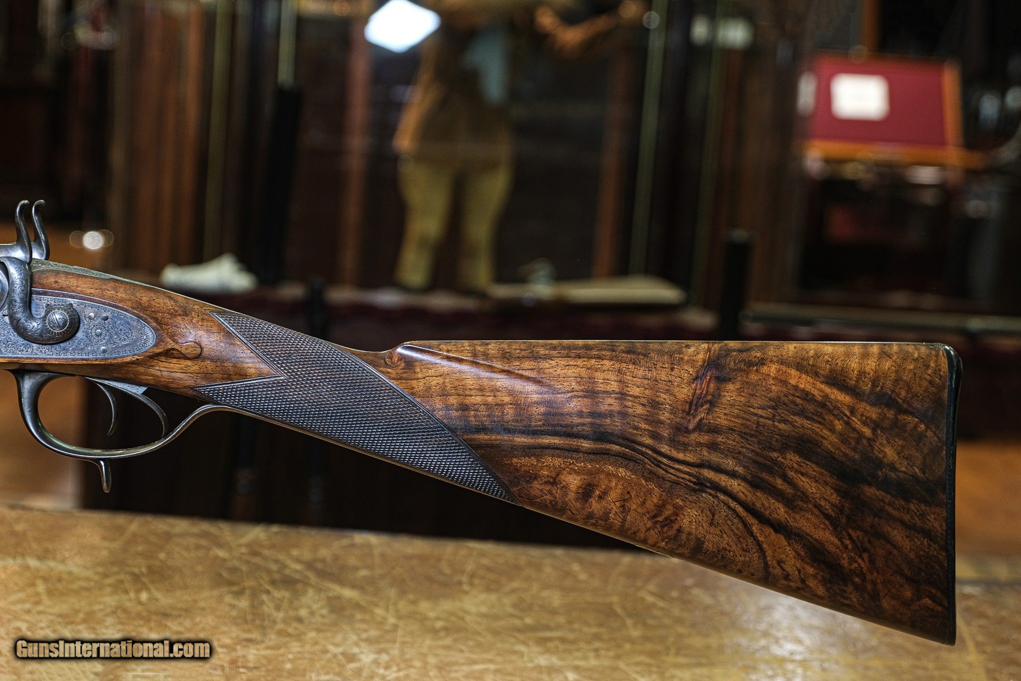 Description: Wiggan & Elliott - Pinfire Underlever, SxS, Elliott's Patent To The Royal Family & Pacha of Egypt, 26ga. 30" Damascus Barrels. Pinfire 26 bore gun underlever, bar in wood, straight grip, metal butt plate, gold escutcheon with Latin phrase. Gun has on the lock plates 100% of case color, 100% of Damascus barrel finish, long tang trigger guard perfect checkering, perfect wood with some handling marks. Very highly figured wood, drop point stock, double trigger. This is petite, tiny gun with perfect screws. It has never been disassembled, 100% original. Comes from one of the most famous collectors with the United States. A true work of art. The engraving on this is of unimaginable quality. Inv: ANTIQUE-3 5 lbs. 10 oz. 14 3/4" LOP $4,250.00 SOLD |