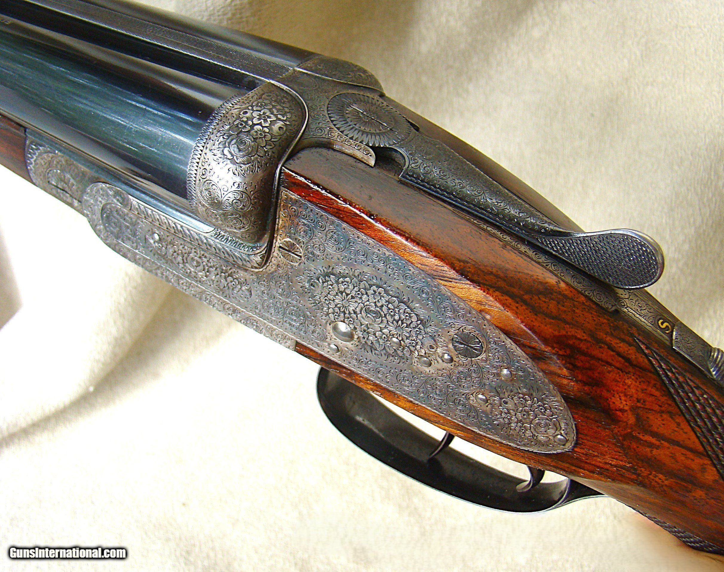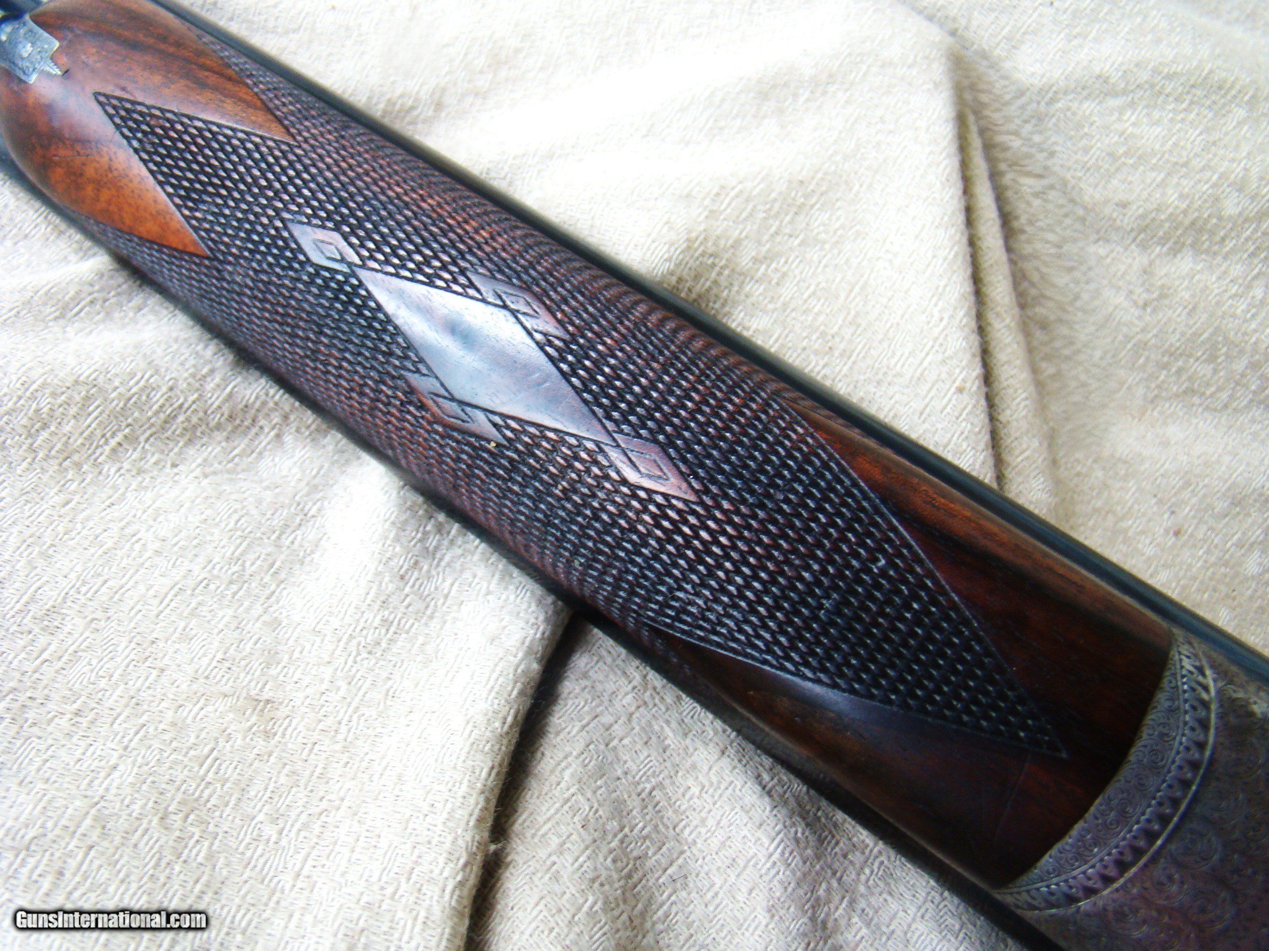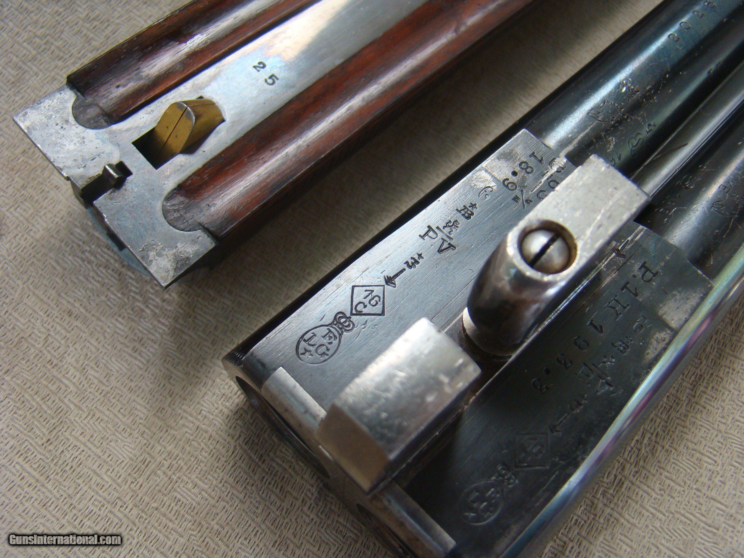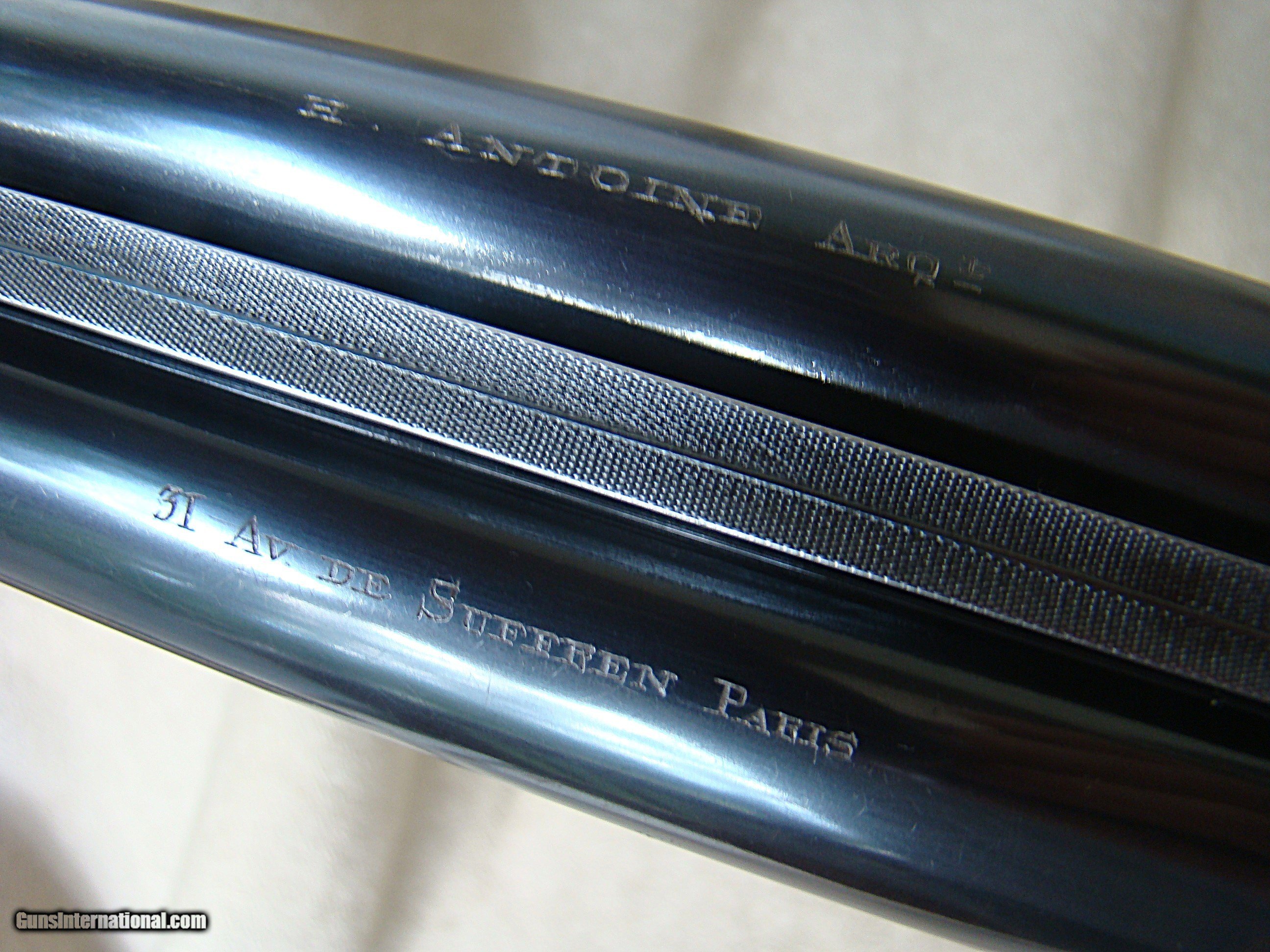 Description: Highly finished 16 ga. sidelock, 25-3/4" barrels with a distinctive engine turned game rib choked full and full (.027/.027), 2-1/2" chambers. This circa 1924 beauty is marked "H. Antoine Arq 31 Av de Suffren Paris". The bolstered sidelock action retains pleasing case colors and is completely engraved in fine scroll and semi-relief floral bouquets. Liege proofed and high-end finished for the Paris market. Auto ejectors, articulated front trigger, non auto safe. As the shown in the photos, note the the bushed firing pins, gold washed internals, and a radiused front locking lug similar to a Purdey. All the attributes of of a very BEST gun. Virtually all the high polish blue finish remains intact. Highly figured French walnut stock features bold black ribbons throughout and measures 1-3/8" comb, 2-1/4" heel, 14" LOP over a rock hard crushed pad. Cast off about 3/8". Weighs 6 lbs., 6 oz. The stock has some small marks but would clean up to look fabulous with a leather pad. Hubert Antoine was described as Arquebusier "Arms de Grand Luxe" and this is a superb example. Price: $7,495.00 Contact Seller |