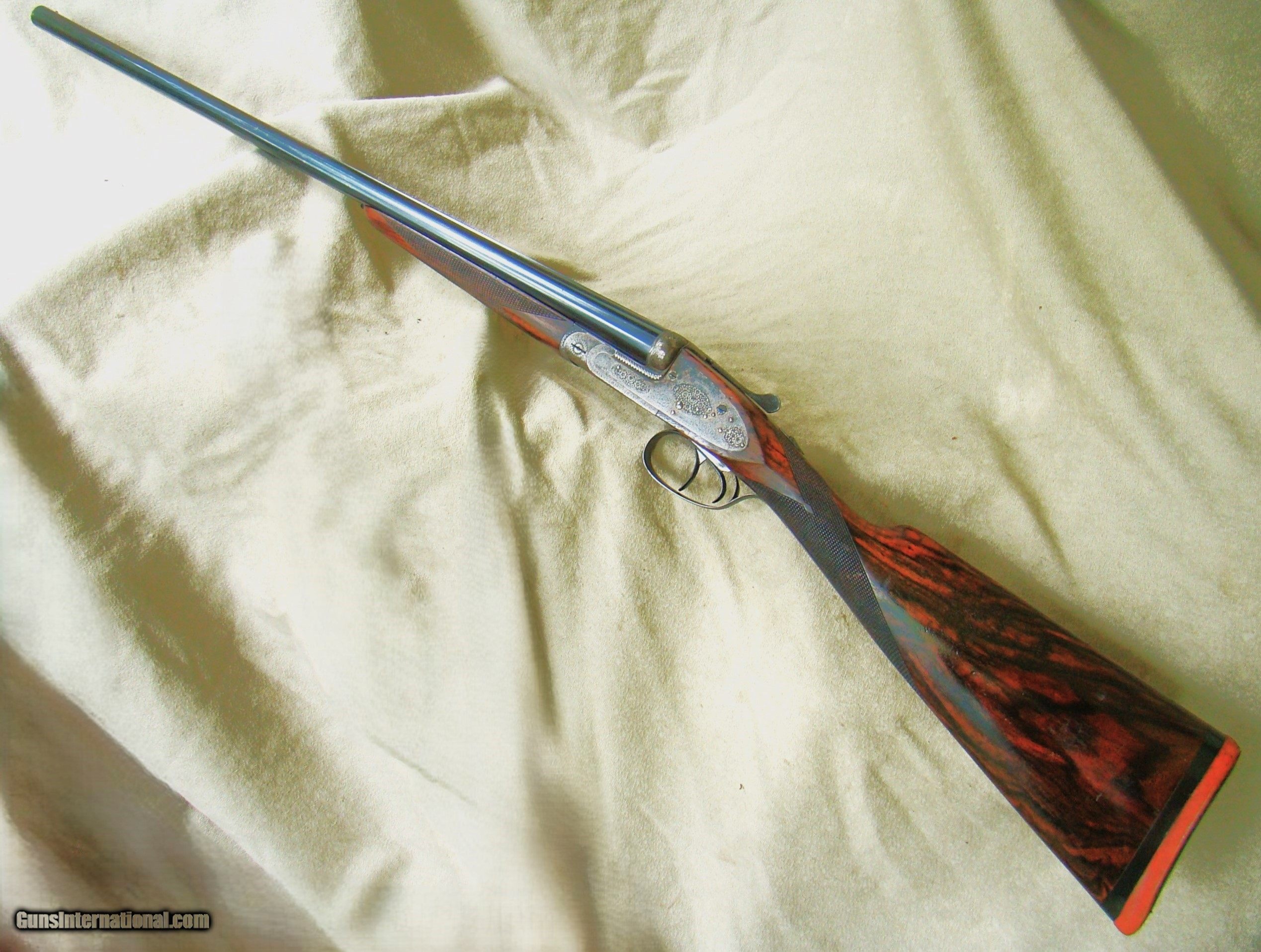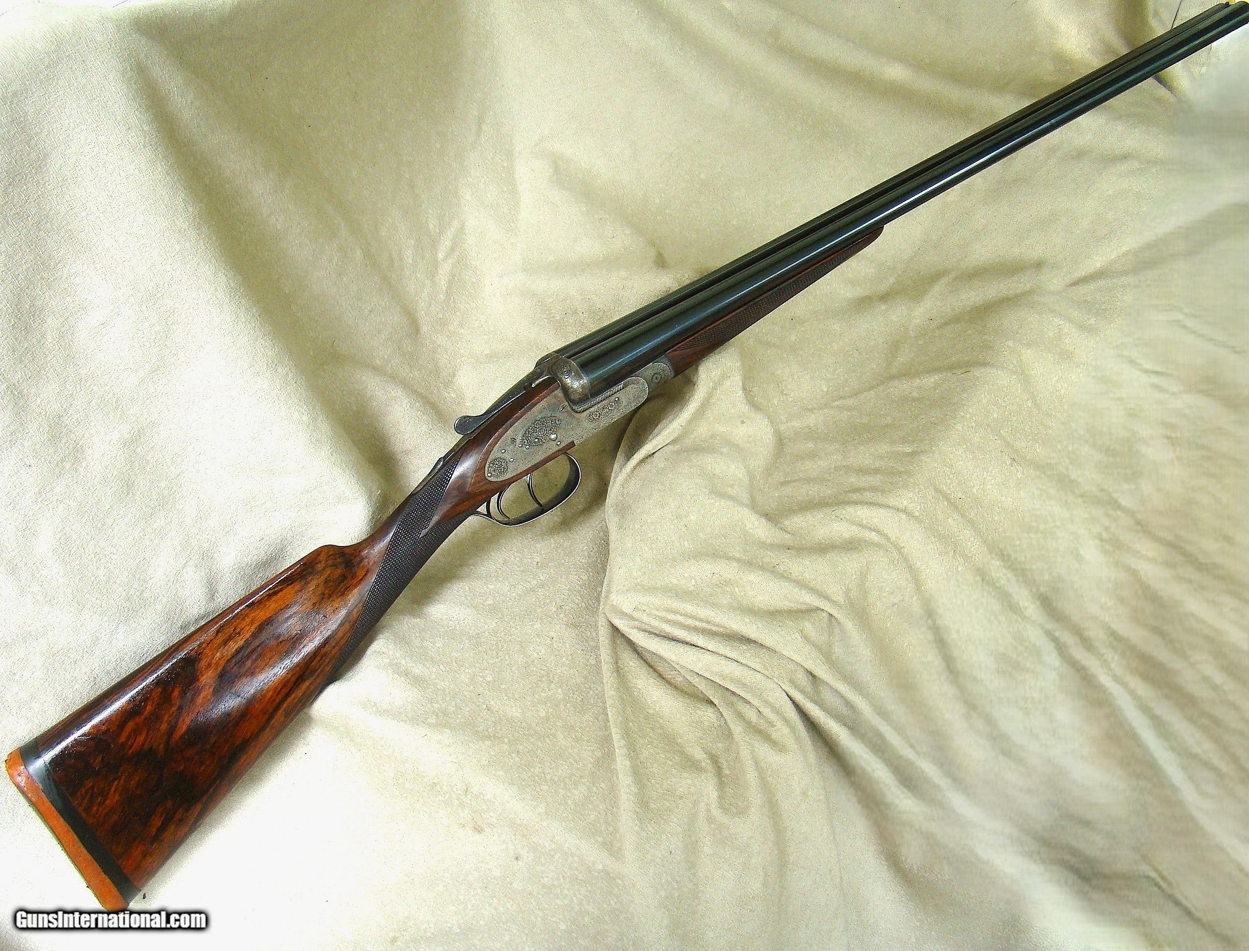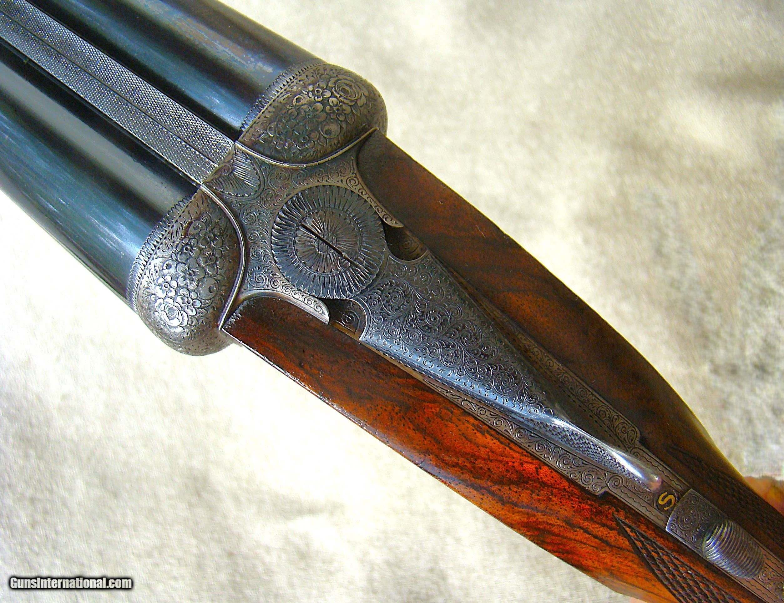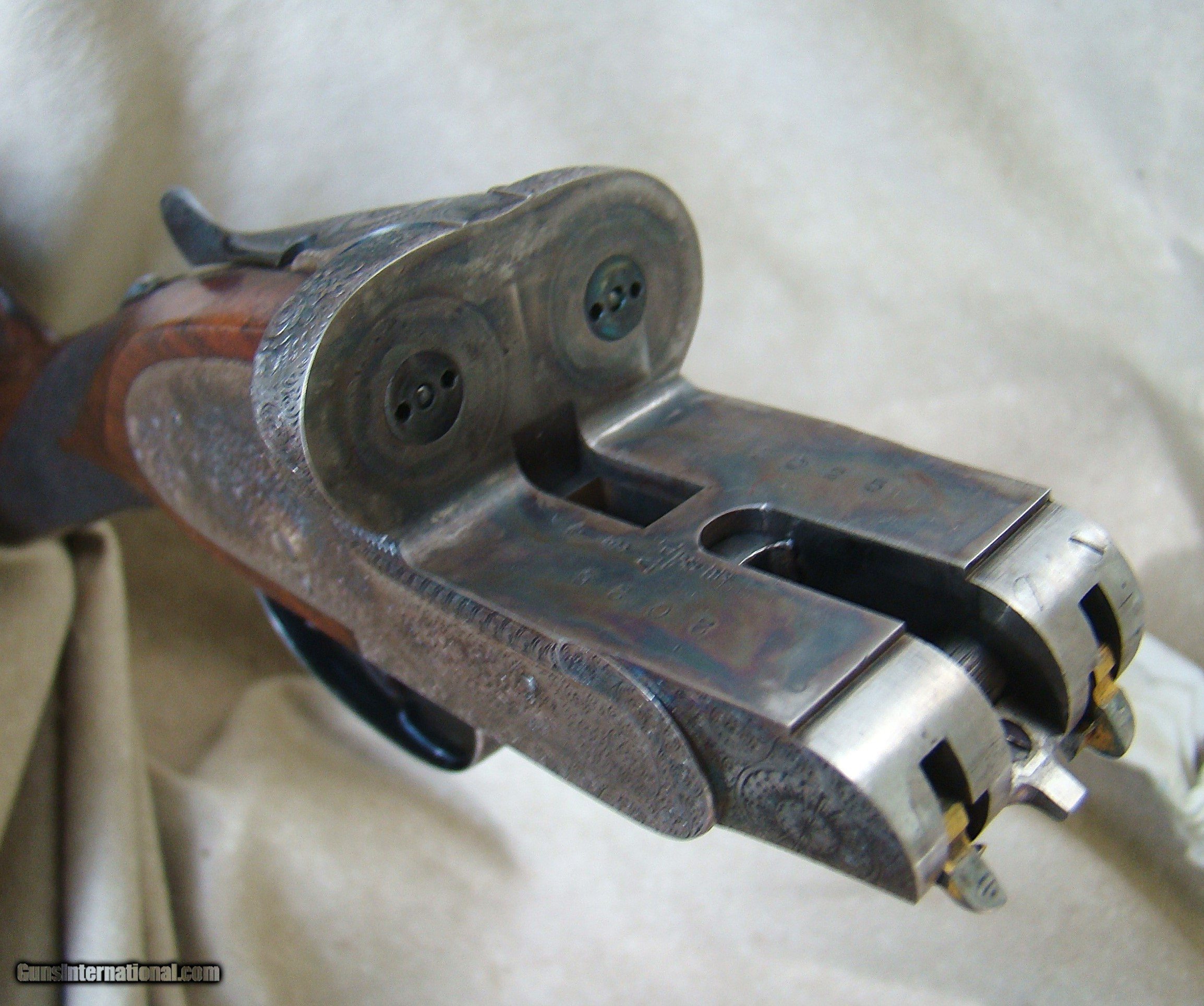 Description: Highly finished 16 ga. sidelock, 25-3/4" barrels with a distinctive engine turned game rib choked full and full (.027/.027), 2-1/2" chambers. This circa 1924 beauty is marked "H. Antoine Arq 31 Av de Suffren Paris". The bolstered sidelock action retains pleasing case colors and is completely engraved in fine scroll and semi-relief floral bouquets. Liege proofed and high-end finished for the Paris market. Auto ejectors, articulated front trigger, non auto safe. As the shown in the photos, note the the bushed firing pins, gold washed internals, and a radiused front locking lug similar to a Purdey. All the attributes of of a very BEST gun. Virtually all the high polish blue finish remains intact. Highly figured French walnut stock features bold black ribbons throughout and measures 1-3/8" comb, 2-1/4" heel, 14" LOP over a rock hard crushed pad. Cast off about 3/8". Weighs 6 lbs., 6 oz. The stock has some small marks but would clean up to look fabulous with a leather pad. Hubert Antoine was described as Arquebusier "Arms de Grand Luxe" and this is a superb example. Price: $7,495.00 Contact Seller |