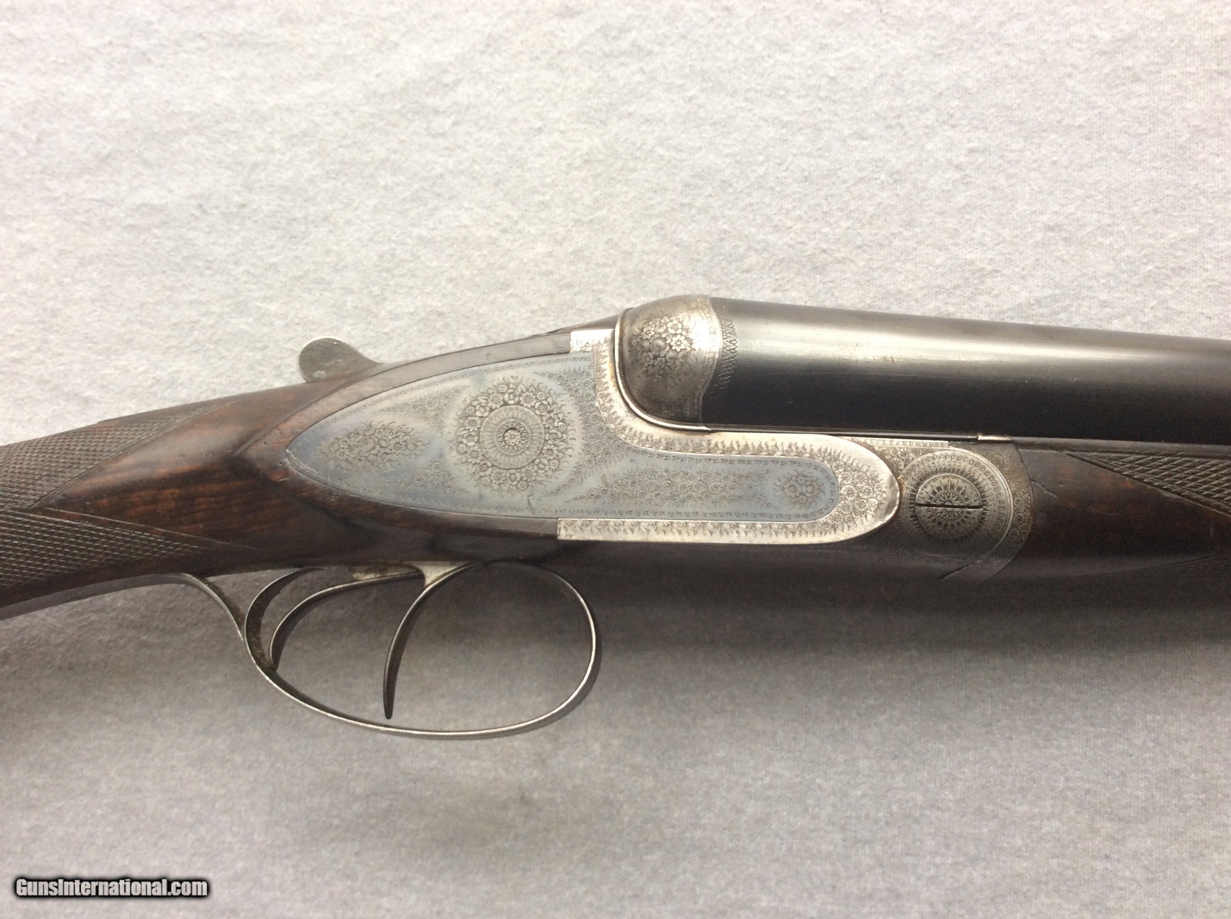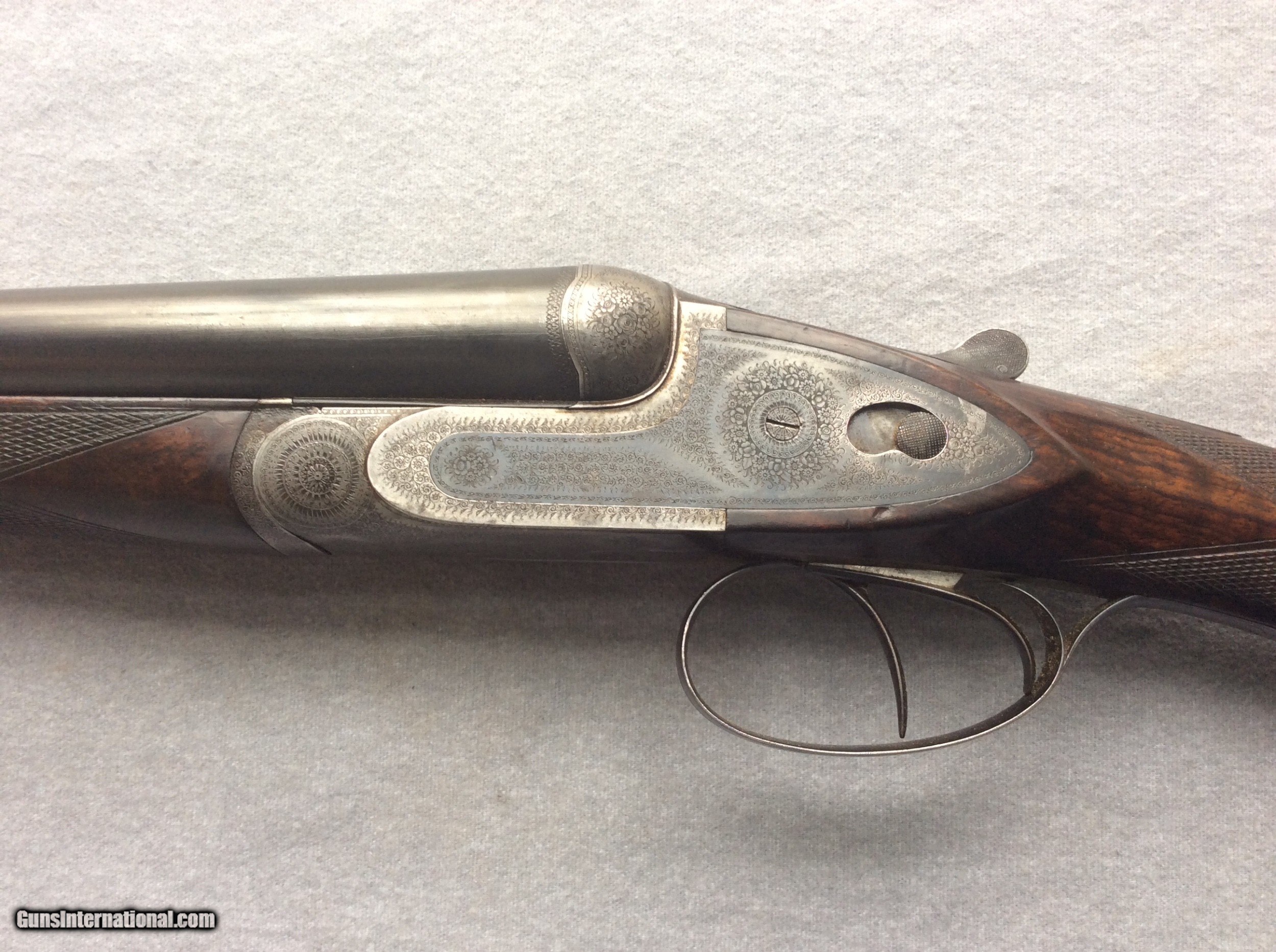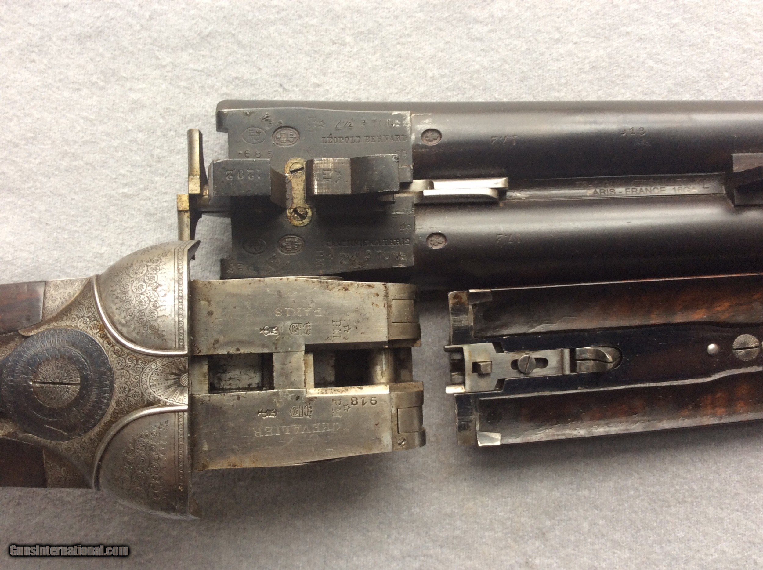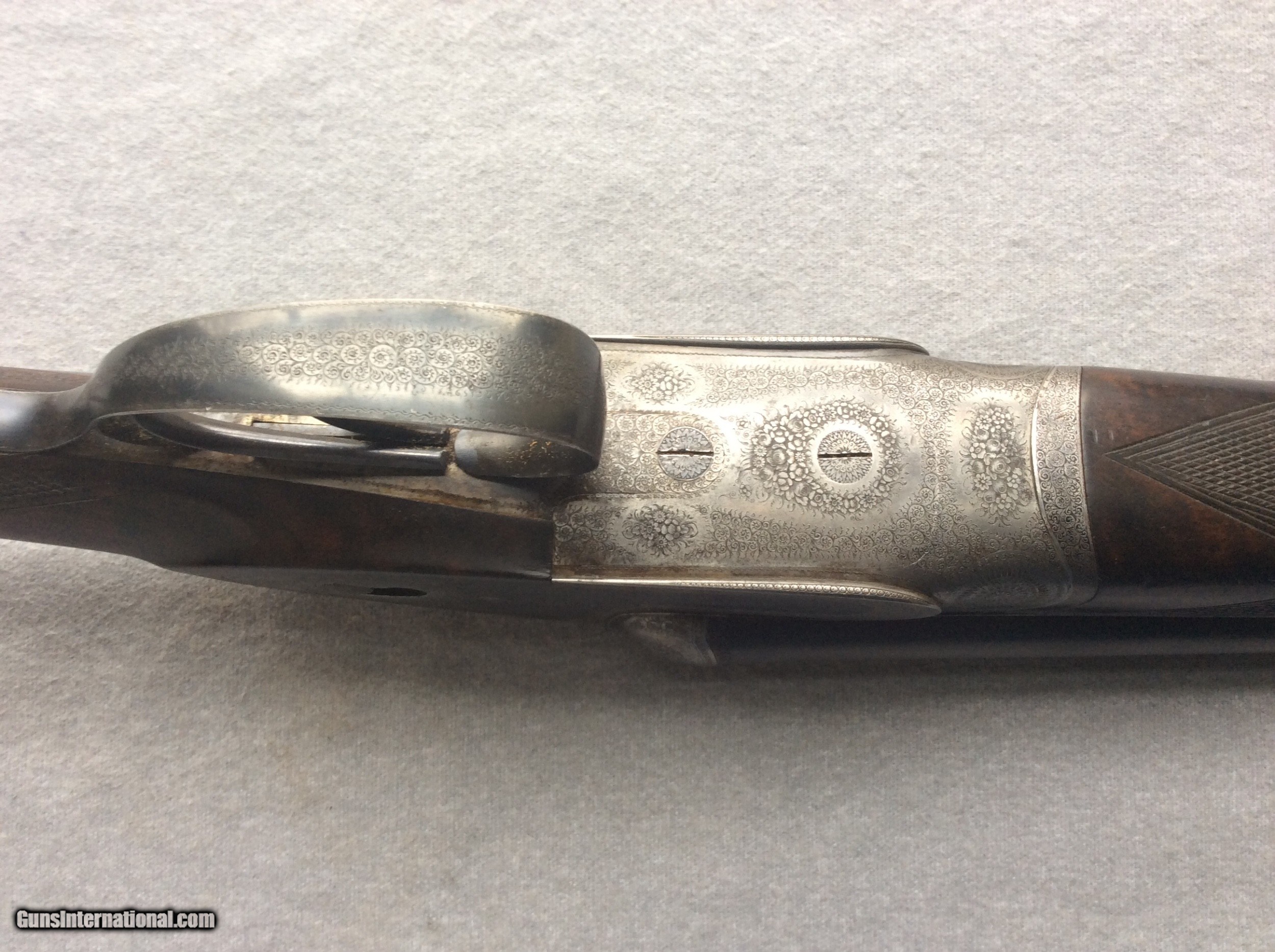 Description: Very unique side plated French Chevalier. Overall in very good condition. Barrels and bores are excellent and ejectors are timed and strong. Original case color still visible on side plates. Wood has very nice figure and has no cracks. The engraving is well executed with 100% coverage. A beautiful double, easy to carry all day. SOLD Shotgun Gauge: 16 Gauge Manufacturer: Chevalier Barrel Length: 29.5 Chambers: 2.5 Ejectors: yes Condition: very good Triggers: 2 Stock Comb: 1 1/2” Stock Heel: 2 1/4” LOP: 14.5 Weight: 6-6oz Choke Left: IMP / CYL Choke Right: SKEET |