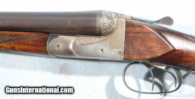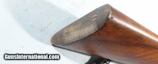 Description: FRENCH ST. ETIENNE GUILD BOXLOCK 12 GAUGE SIDE X SIDE SHOTGUN CIRCA 1920’S. 27 ½’ barrels choked Full and Full with 2 ½” chambers and St. Etienne . Floral engraved frame with side clips. Double triggers, extractors and non-automatic safety. Fancy diamond checkered semi-pistol grip stock (14” pull, 1 ½”, 2 ¾” drop). Serrated horn butt plate. Matching forend. Sling swivels and sling. Excellent overall with 90-95% original blue. French coin finished frame with most of the original polish. Wood with the lightly worn original finish. Tight and in good working order. Good, bright bores with some light pitting just in front of the chambers. SOLD Curio/Relic: Yes |