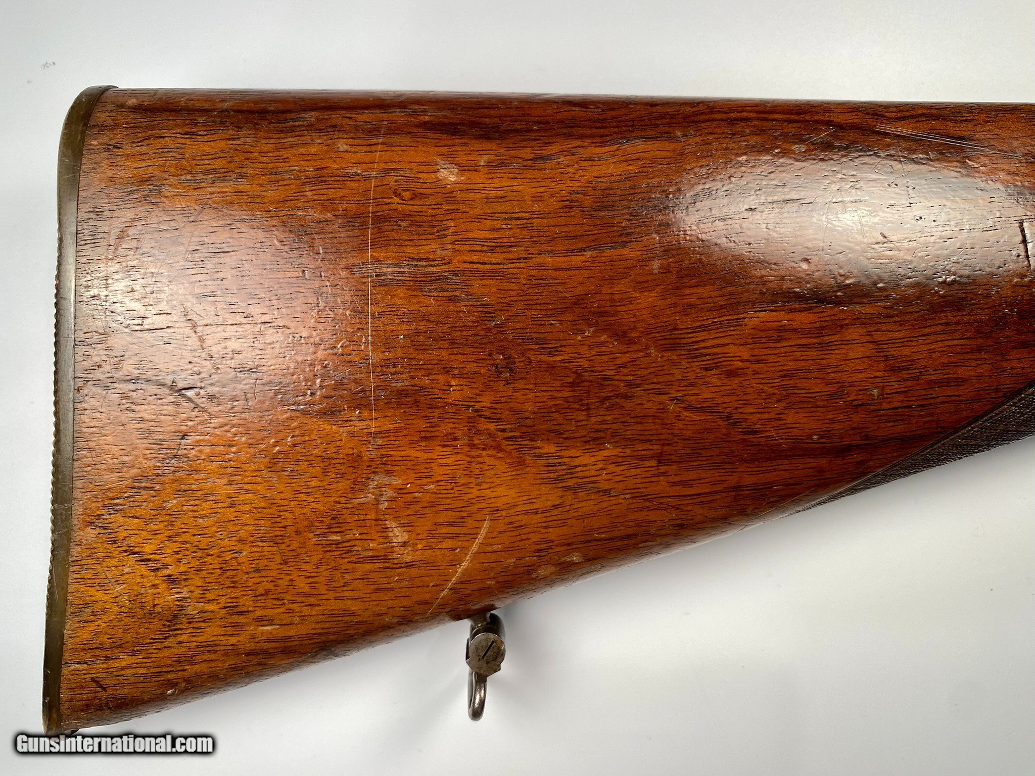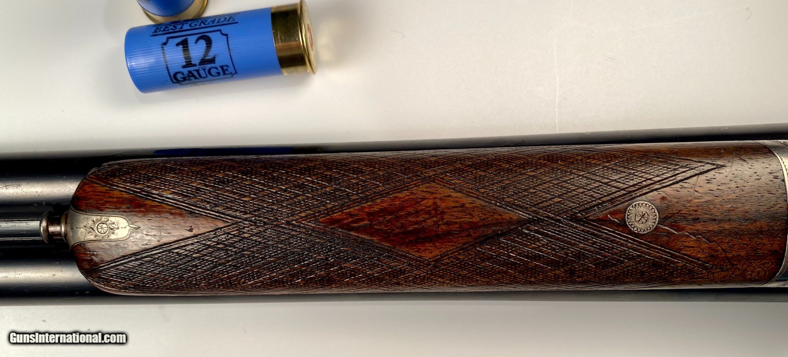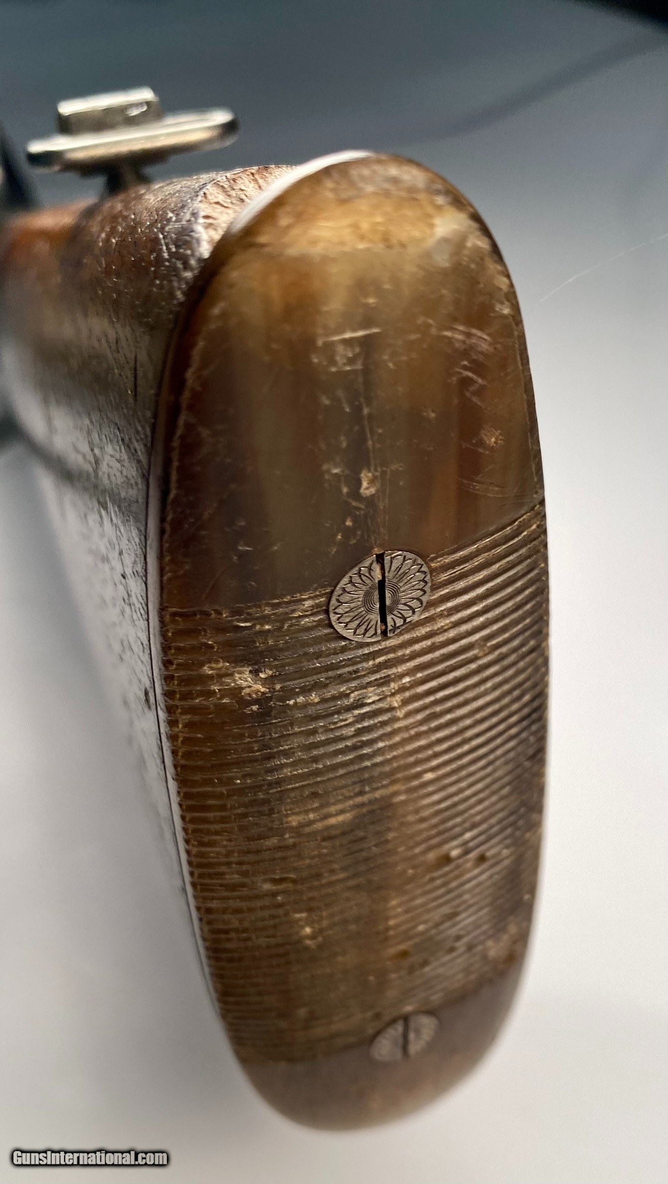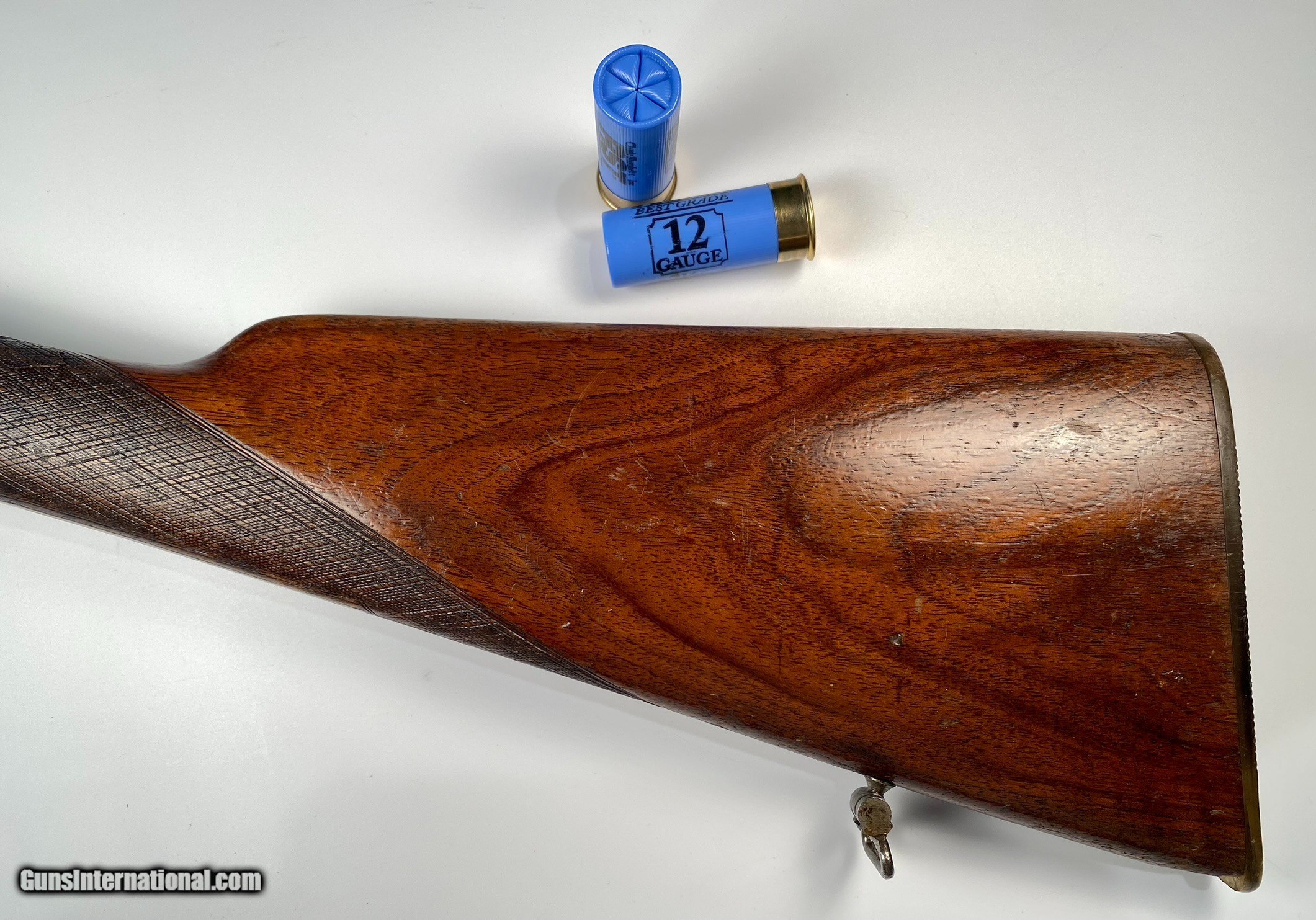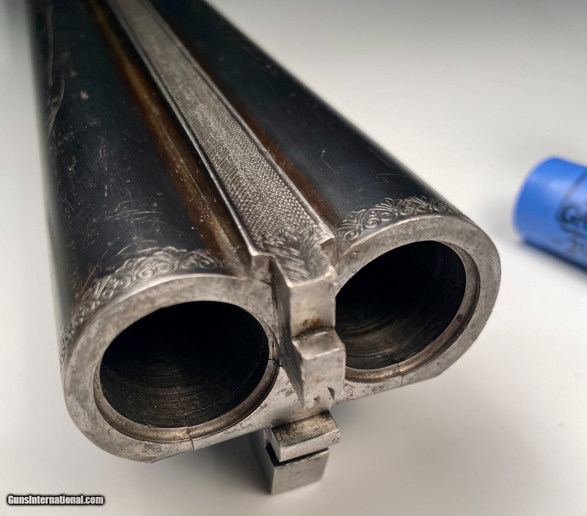 Description: On offer today we have a nice hand engraved, signed by A. Rousfon, french sideplated boxlock 12 gauge shotgun. It is a decent shape and could be absolutely beautiful with some TLC. I know very little about French guns and so will leave it to you to research. Gun lock up tight with lever to the right. Tight on face without the forearm installed. Barrel Wall Thickness: RH: 9" from breach .042 9" from muzzle .033 LH: 9" from breach .045 9" from muzzle .037 Happy to provide any additional photos or information I can. Just ask. More images at wickhamandbest.kom SOLD Curio/Relic: Yes Shotgun Gauge: 12 Gauge Manufacturer: French - Unknown Serial Number: 4739 Barrel Length: 27 5/8 Chambers: 2 1/2 Ejectors: Extractors Condition: Good Metal Condition: Good but worn Wood Condition: Needs work - Chipped Toe Bore Condition: Good - No pitting or frosting Action: Side Plate Box Lock Triggers: Double Stock: English Straight Stock Comb: 1 1/2 Stock Heel: 2 1/2 Stock Cast: 1/4" OFF (for RH shooting) Fore End: Splinter Butt Pad: Horn Rib: Flat filed game rib Weight: 6lbs 9.5ozs Sights: Single Brass Bead Choke Left: .034 (Full) Choke Right: .021 (Mod) Engraving: Hand Engraved - Signed |