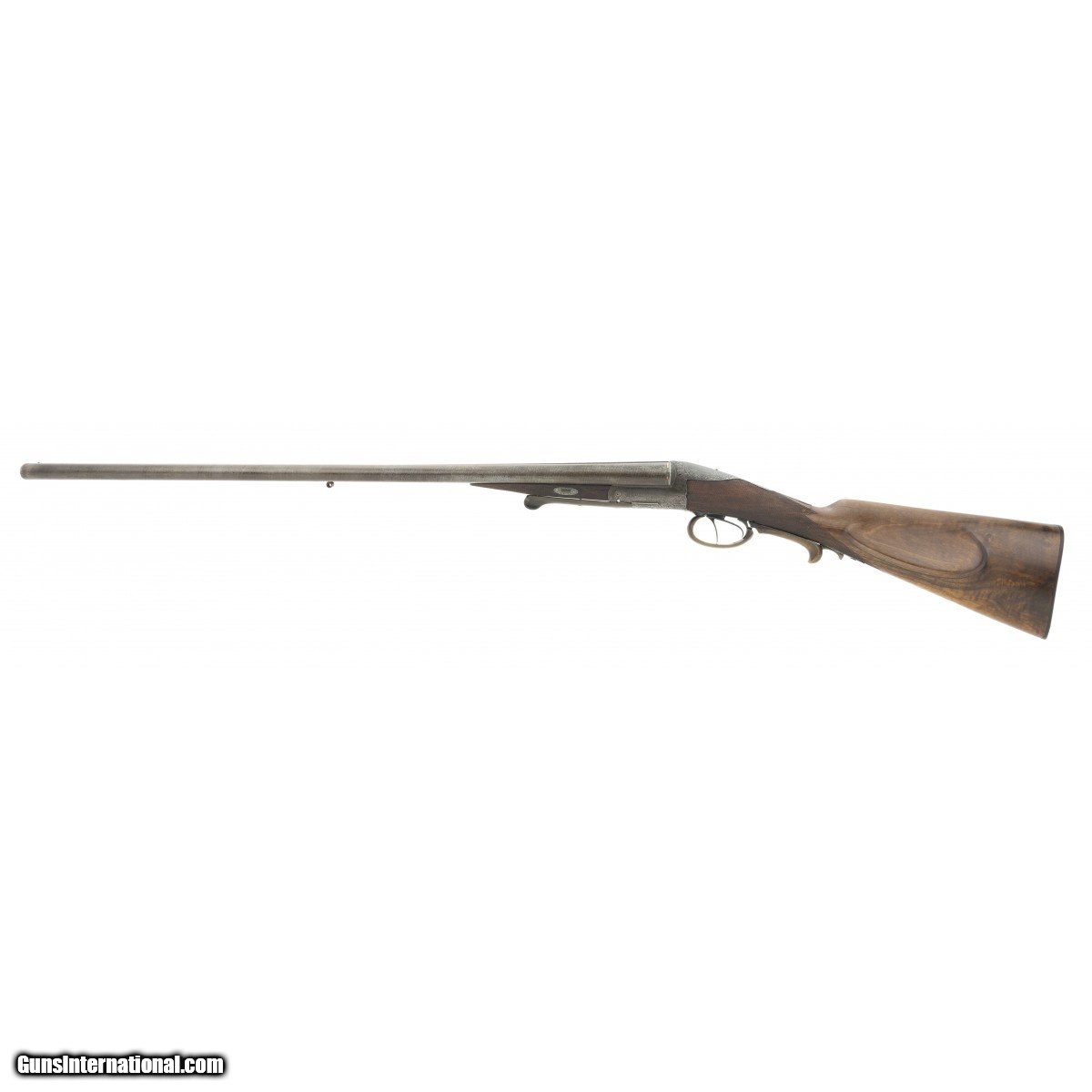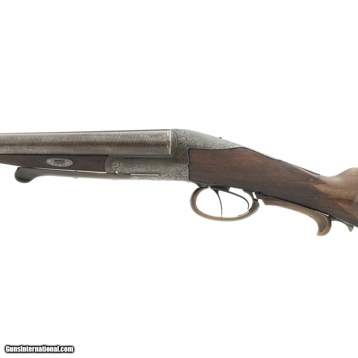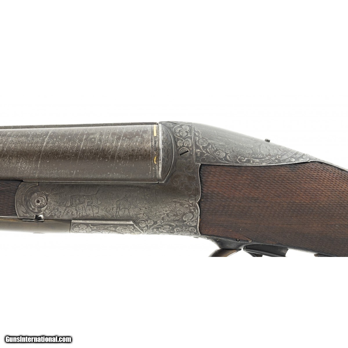 Description: "Interesting double circa 1880’s-1890’s, with 31" Damascus barrels, grip safety and engraved receiver. Both sides of receiver have game scenes and tang is engraved with a scene of Hubertus, the patron saint of hunters. Stock has several repaired cracks at the wrist. Bores are excellent. Tang has cocking indicators. Makers name on rib is in gold, but indecipherable. An attractive old double. SOLD Antique: Yes |