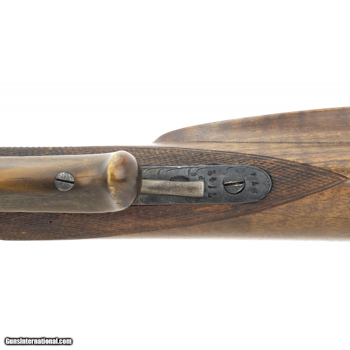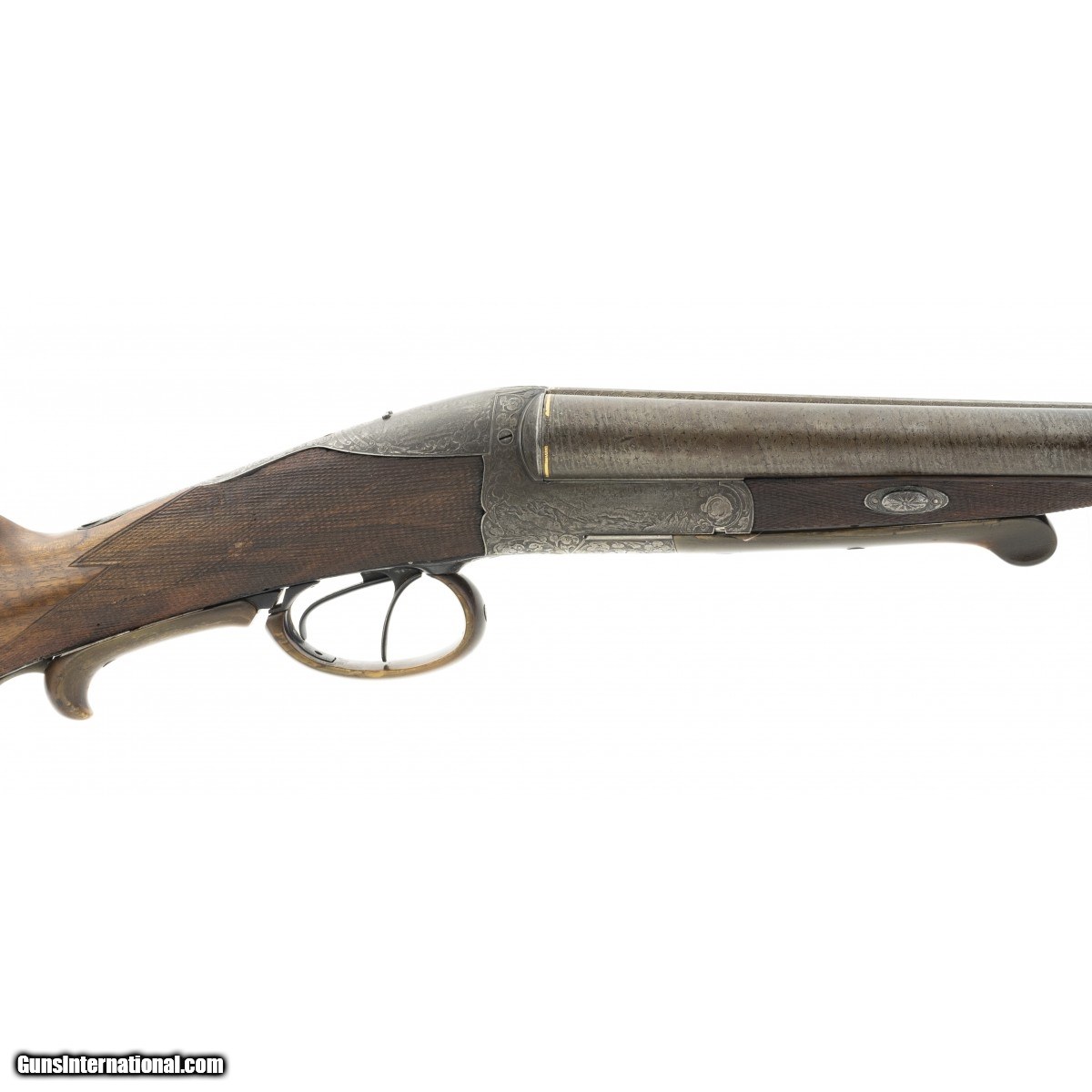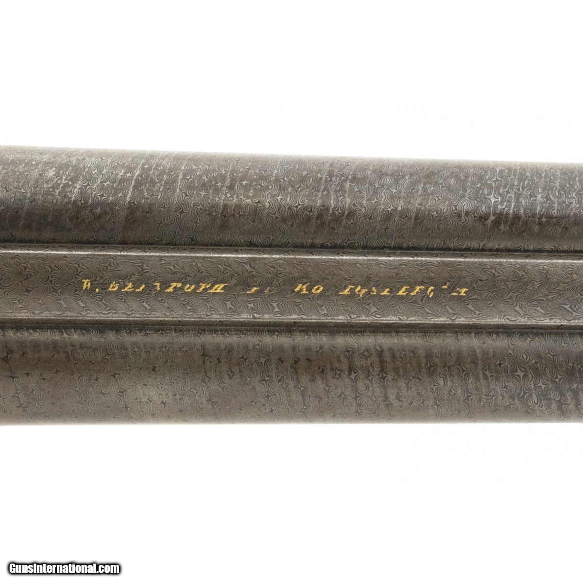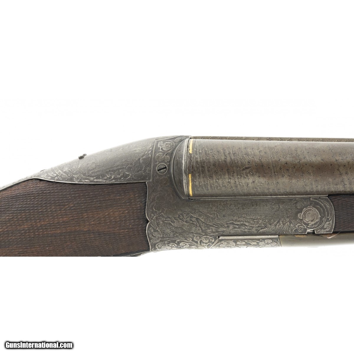 Description: "Interesting double circa 1880’s-1890’s, with 31" Damascus barrels, grip safety and engraved receiver. Both sides of receiver have game scenes and tang is engraved with a scene of Hubertus, the patron saint of hunters. Stock has several repaired cracks at the wrist. Bores are excellent. Tang has cocking indicators. Makers name on rib is in gold, but indecipherable. An attractive old double. SOLD Antique: Yes |