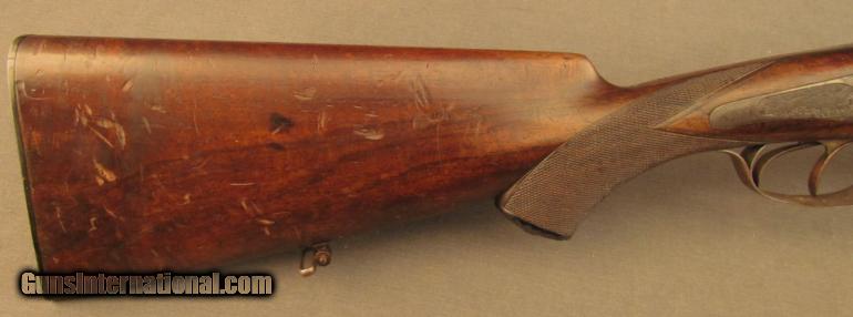 Description: Serial #1411, 16 Bore (2 5/8”), 30 11/16” barrels with good-very good bores that have some shallow dents and minor spots of dark freckling along their lengths. This is a nicely made gun that has blue mixing with a pleasant plum-brown “tiger-stripe” along their length down to the platinum bands at the breech which has some moderate surface scratches along the top of the left barrel where it meets the standing breech. The retailer name is marked along the matted rib: “H. ALBRECHT – EICHENBERG”. The back-action locks and frame are decorated with game vignettes depicting a hare, two grouse, a pointer, and a duck set against ivy scrollwork and geometric designs while the top tang retains some of the original bright color case-hardening. The remainder of the frame ranges from bright gray to freckled plum-brown, most noticeably on the trigger guard bow. The wedge-fastened walnut forend has an added varnish with several chips and blemishes along the outside edge and some further handling marks and bruises in the buttstock which has a rounded, continental cheek-piece. The large horn under-lever is intact and still locks firmly. This is an attractive German hammer gun with lots of condition and would make a very nice accent piece or decorator. Antique SOLD Antique: Yes Manufacturer: Albrecht Model: Double Serial Number: 1411 Caliber Info: 16ga Gauge Info: 16ga |