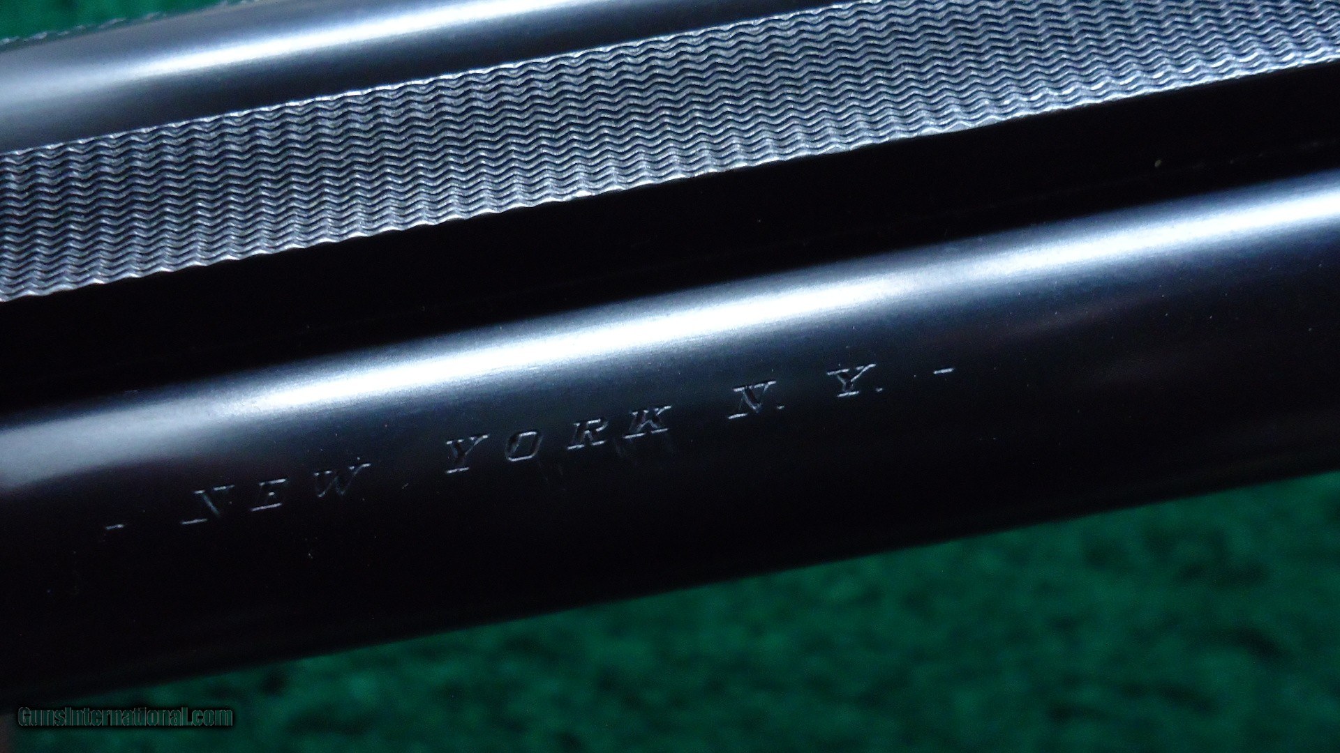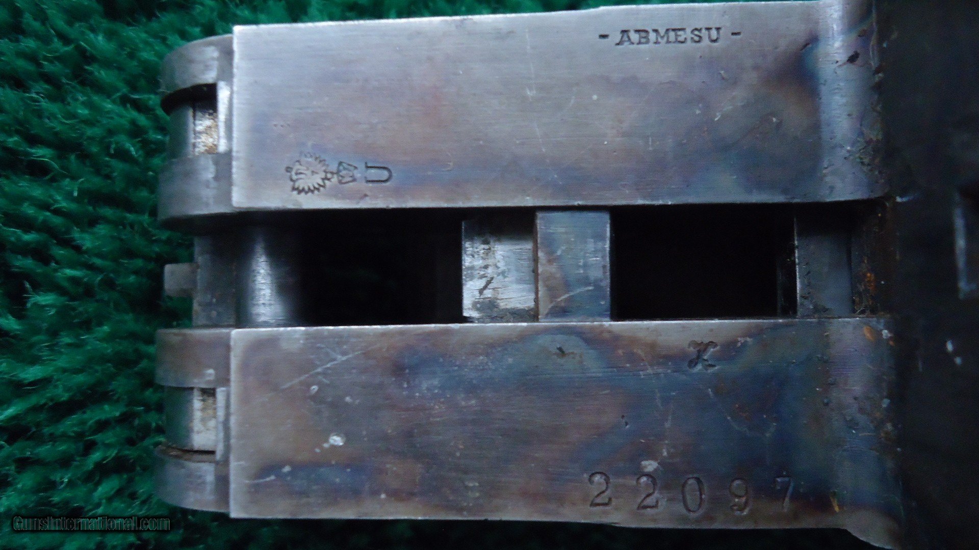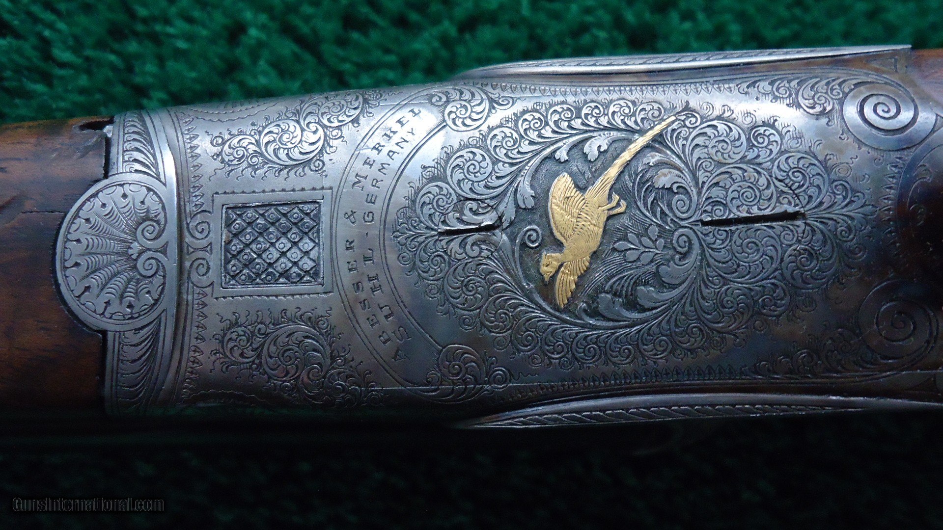 Description: Marked Abesser & Merkel on the bottom of the receiver. On top of the frame is "Superior-Grade" in laid in gold. Gun is very high quality craftsmanship featuring side clips, automatic ejectors, 28 inch barrels, excellent bores and choked improved cylinder and light modified. Wood is excellent with splinter style forearm and skip-line checkering. Double triggers. 14-1/8 inch LOP. DAC 1-3/8 inches and DAH 2-5/8 inches. Receiver is highly engraved with game birds on each side, a gold inlaid pheasant on the belly and delicate tight scrolls throughout. Top opening lever retains most all of the blue. The receiver has about 75% thinning case colors. Wood has most all of the oil finish remaining. Trigger guard is well engraved and retains about 90% of blue. Barrels retain about 95% blue with some beautiful relief engraved oak acorns on the sides of the barrel and scallop shells on the doll's head. On top of the barrel is marked "Roechling Electro Steel". Correct checkered hard rubber buttplate. This is a high quality shotgun that weighs less than 6 pounds. Leroy Merz Antique Firearms specializes in antique and vintage Winchesters and other fine American firearms. Since 1965 Mr. Merz has taken part in the world of firearms and has been a contributor to many well known reference books. We have hundreds of additional guns in every price range at our home online. Search for Merz Antiques in google. SOLD Curio/Relic: Yes Shotgun Gauge: 12 Gauge |